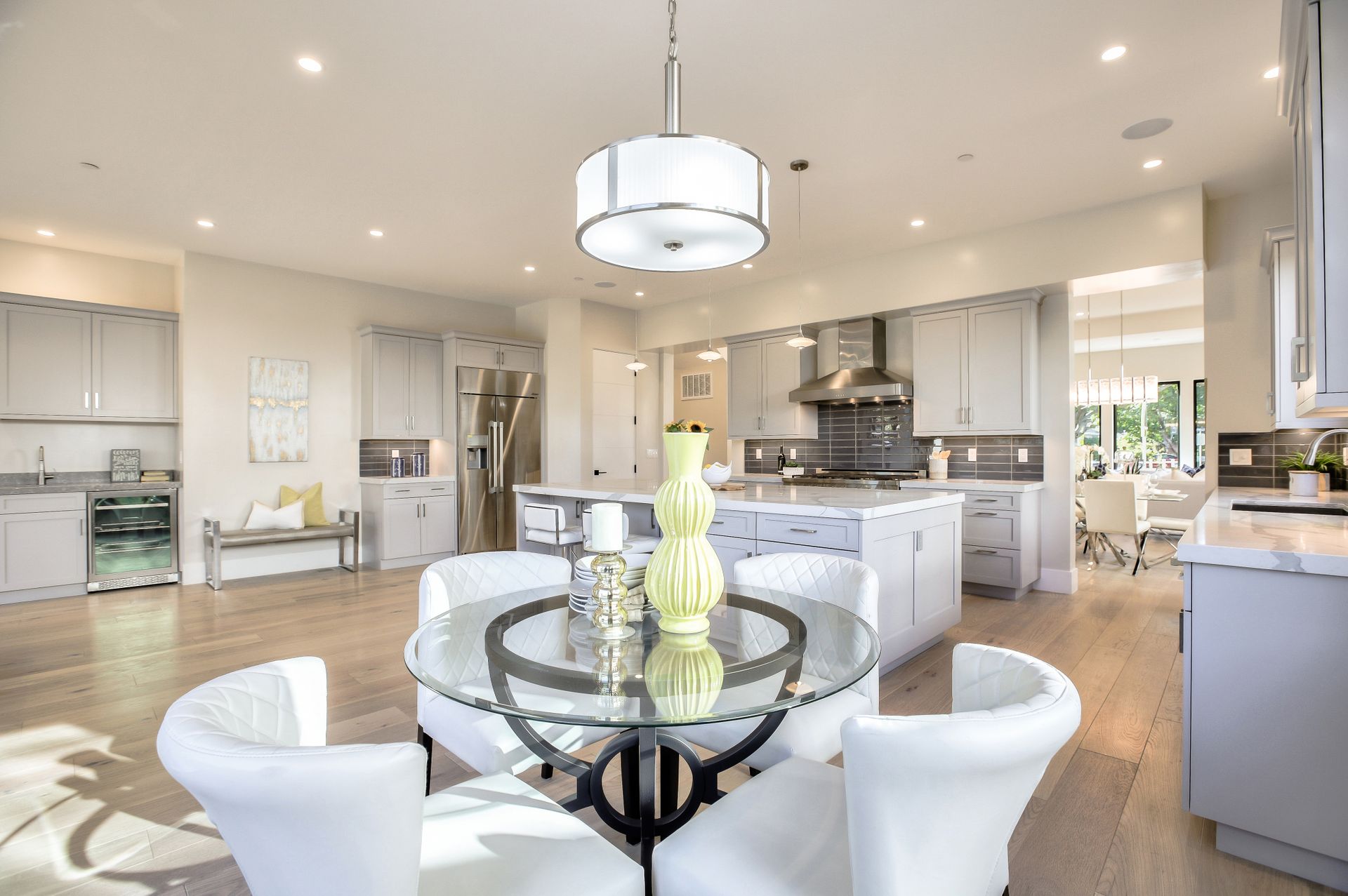 A large living room with a fireplace and the adjoining dining room lead into the gourmet kitchen with an over-sized island, stainless steel appliances, a six-burner gas stove, a walk-in pantry and an eat-in nook. The kitchen is open to the family room, which has a linear fireplace and a refreshment center. Both the kitchen and family room have huge sliding glass door access to a large, raised, wrap around patio and a beautifully landscaped backyard for great entertaining. Inside and out, this is California living at its best.