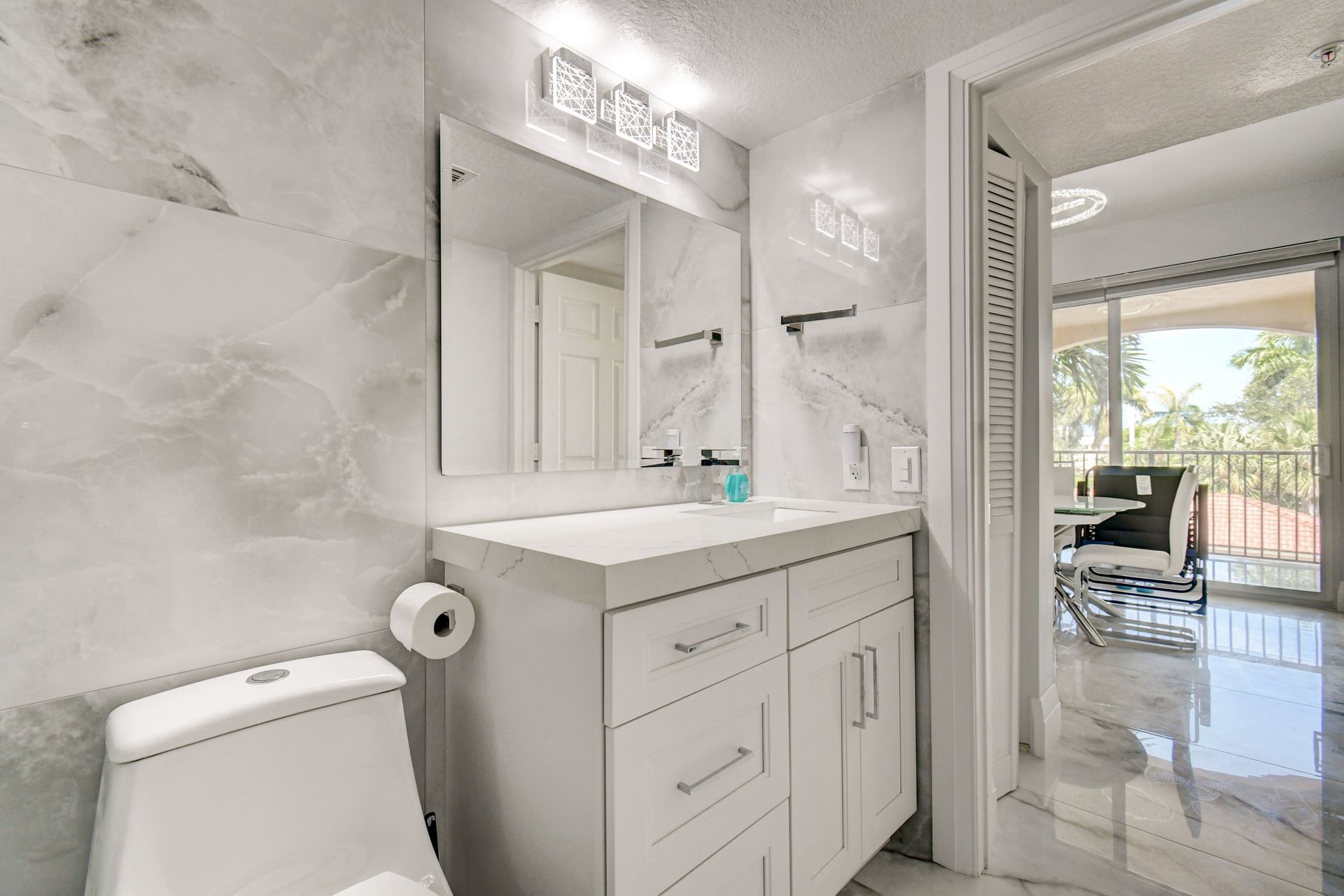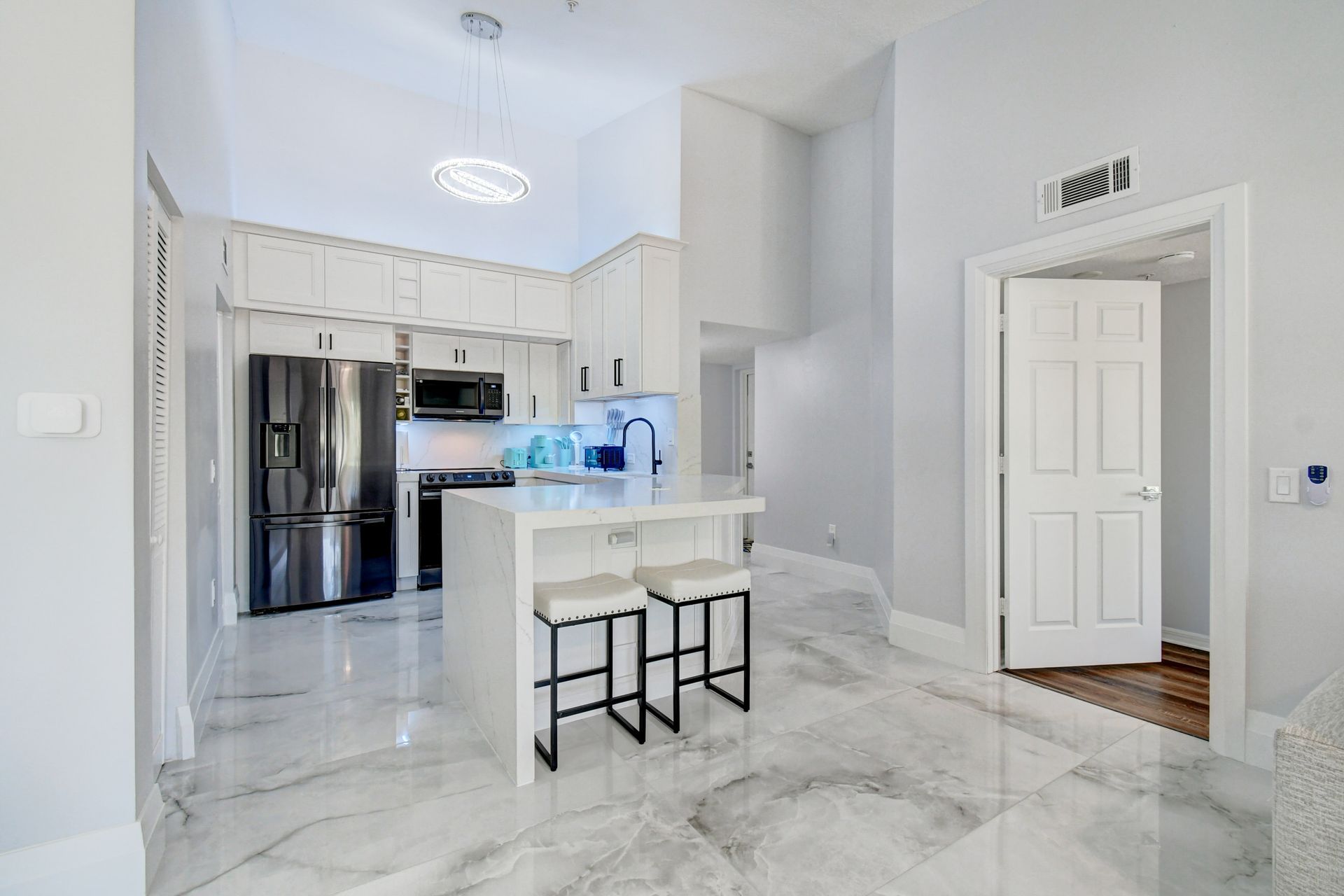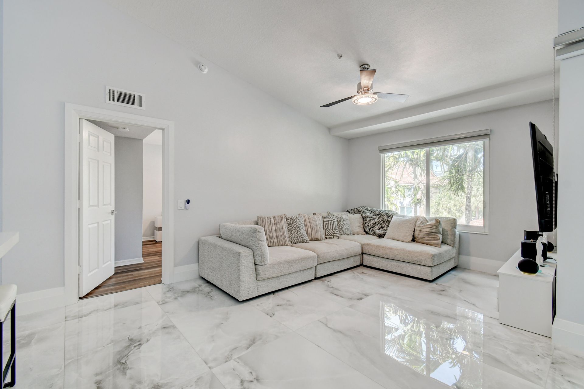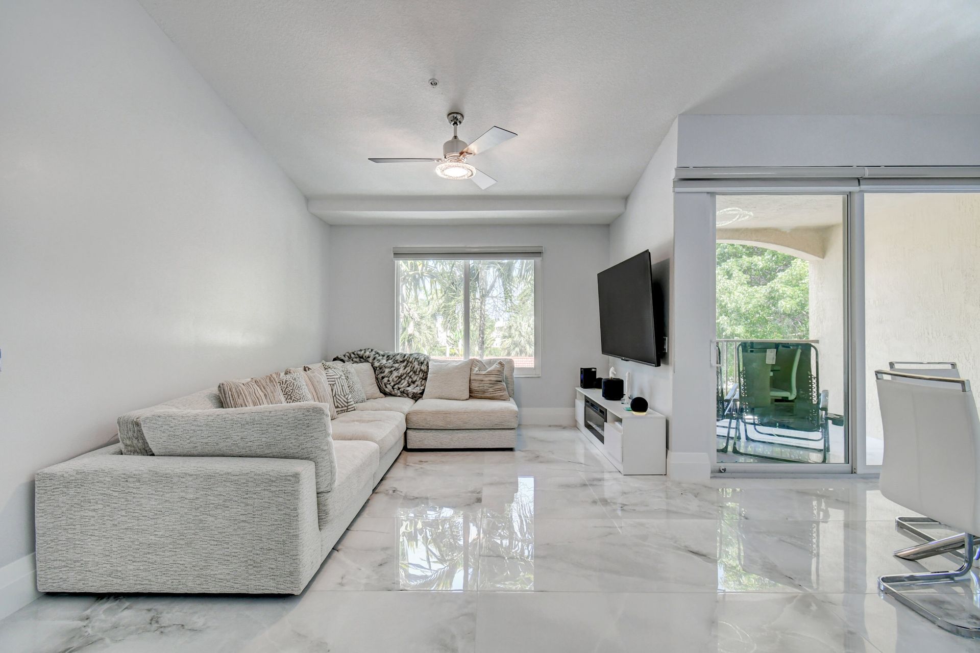 Experience grandeur with this stunning, completely remodeled penthouse in the highly-desired, gated Mirabella Villas. This rarely available three bedroom, two bathroom residence boasts vaulted ceilings and high-end finishes like oversized marbled porcelain tile and quartz countertops in the open concept kitchen. Brand new appliances include a full-sized washer and dryer. This luxuriously furnished unit offers high-tech details throughout. The primary bedroom has a generous walk-in closet and a fully redone en-suite bath with a step-in shower. The split floor plan provides privacy. There are Smart TVs in the living room, primary suite and one secondary bedroom. A covered, east facing balcony is perfect for morning coffee while you watch the sun rise. Mirabella Villas has endless amenities like a resort-style pool and spa, volleyball court, covered grilling area, billiards, gym room and indoor basketball / racquetball court. The property is one mile to I-95, 1.7 to the beach, around three miles to Delray Beach's famed Atlantic Avenue and about 20 minutes to PBI International Airport.