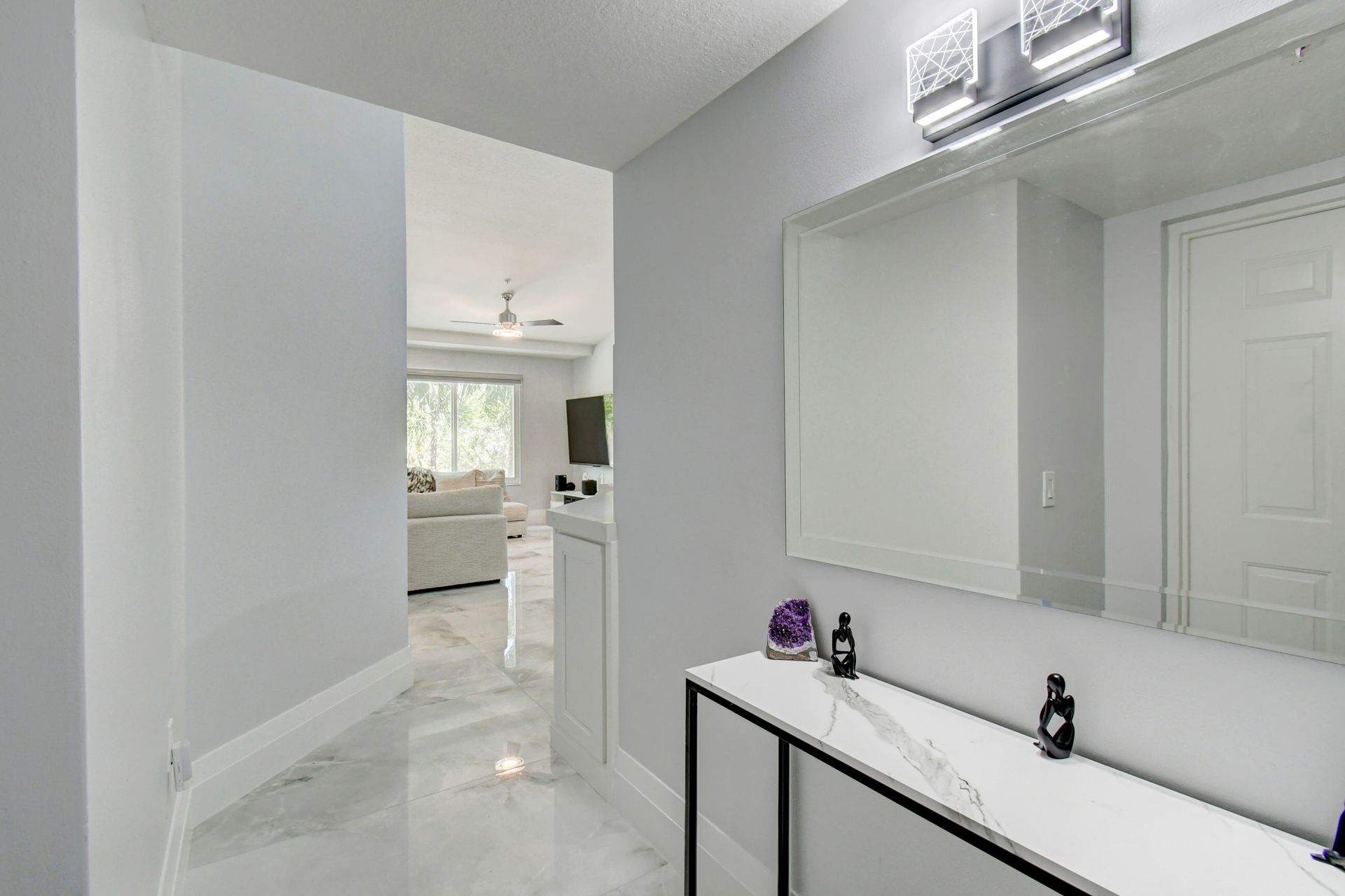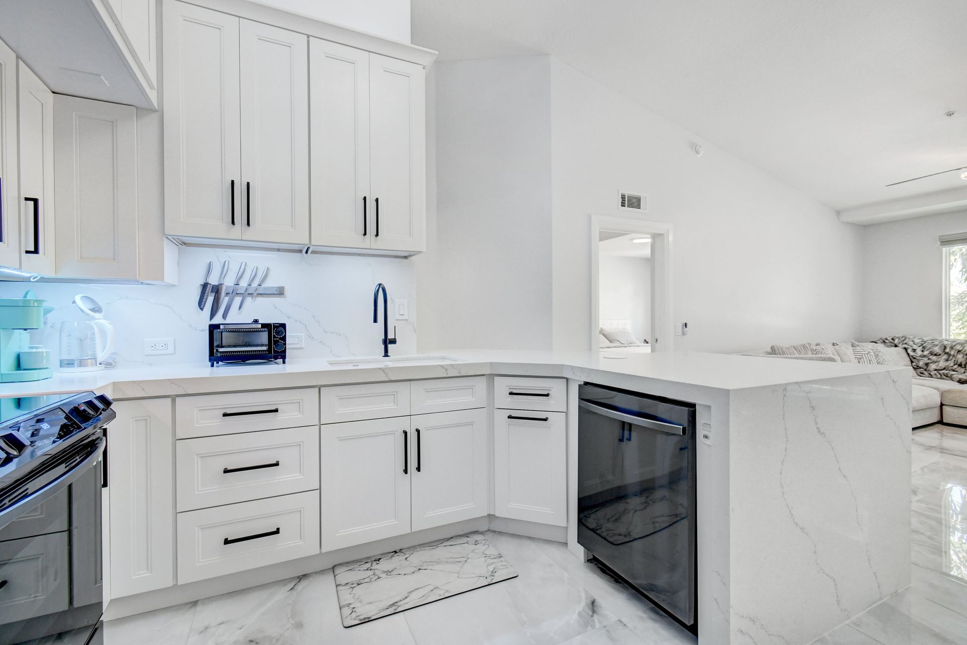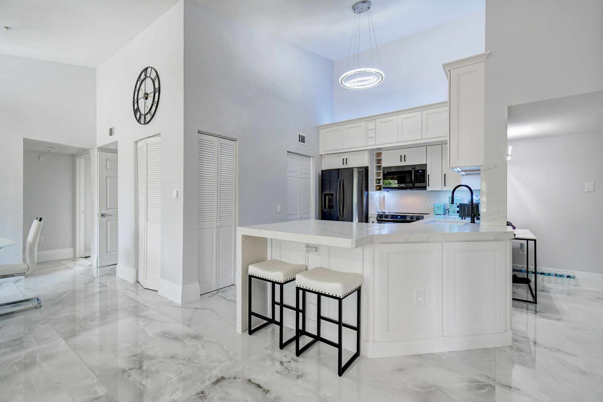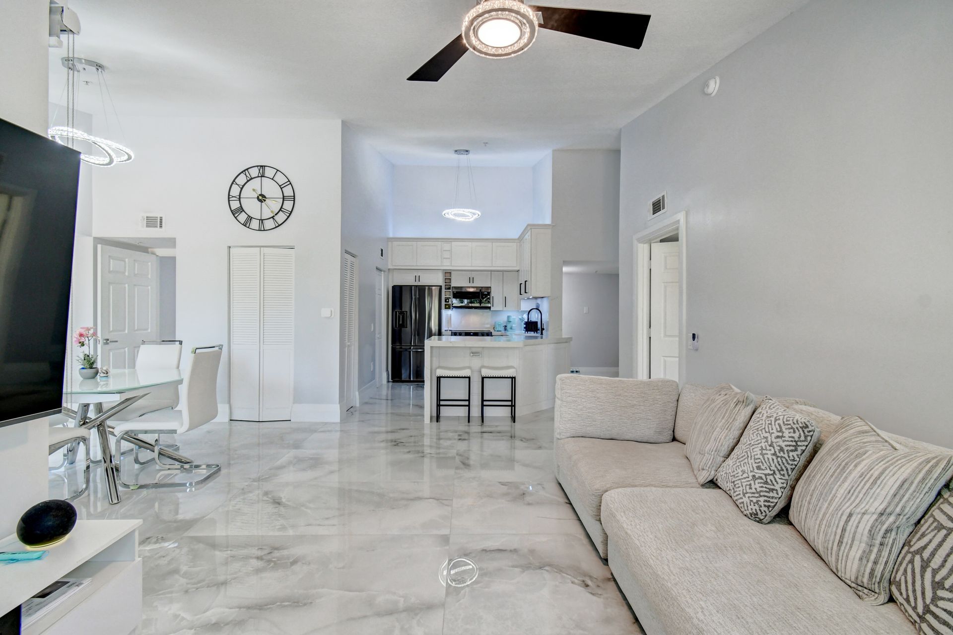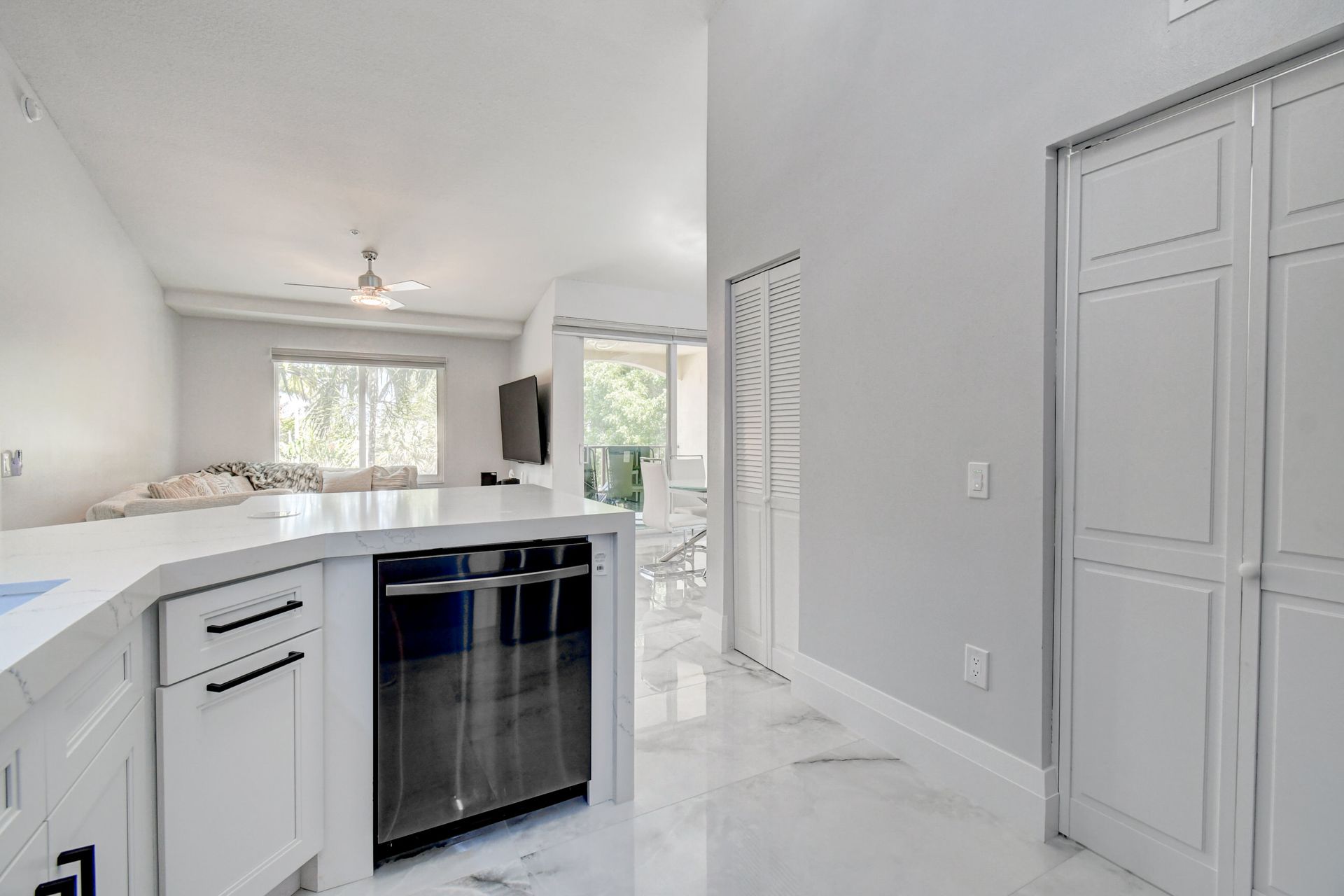 Experience grandeur with this stunning, completely remodeled penthouse in the highly-desired, gated Mirabella Villas. This rarely available three bedroom, two bathroom residence boasts vaulted ceilings and high-end finishes like oversized marbled porcelain tile and quartz countertops in the open concept kitchen. Brand new appliances include a full-sized washer and dryer. This luxuriously furnished unit offers high-tech details throughout. The primary bedroom has a generous walk-in closet and a fully redone en-suite bath with a step-in shower. The split floor plan provides privacy. There are Smart TVs in the living room, primary suite and one secondary bedroom. A covered, east facing balcony is perfect for morning coffee while you watch the sun rise. Mirabella Villas has endless amenities like a resort-style pool and spa, volleyball court, covered grilling area, billiards, gym room and indoor basketball / racquetball court. The property is one mile to I-95, 1.7 to the beach, around three miles to Delray Beach's famed Atlantic Avenue and about 20 minutes to PBI International Airport.