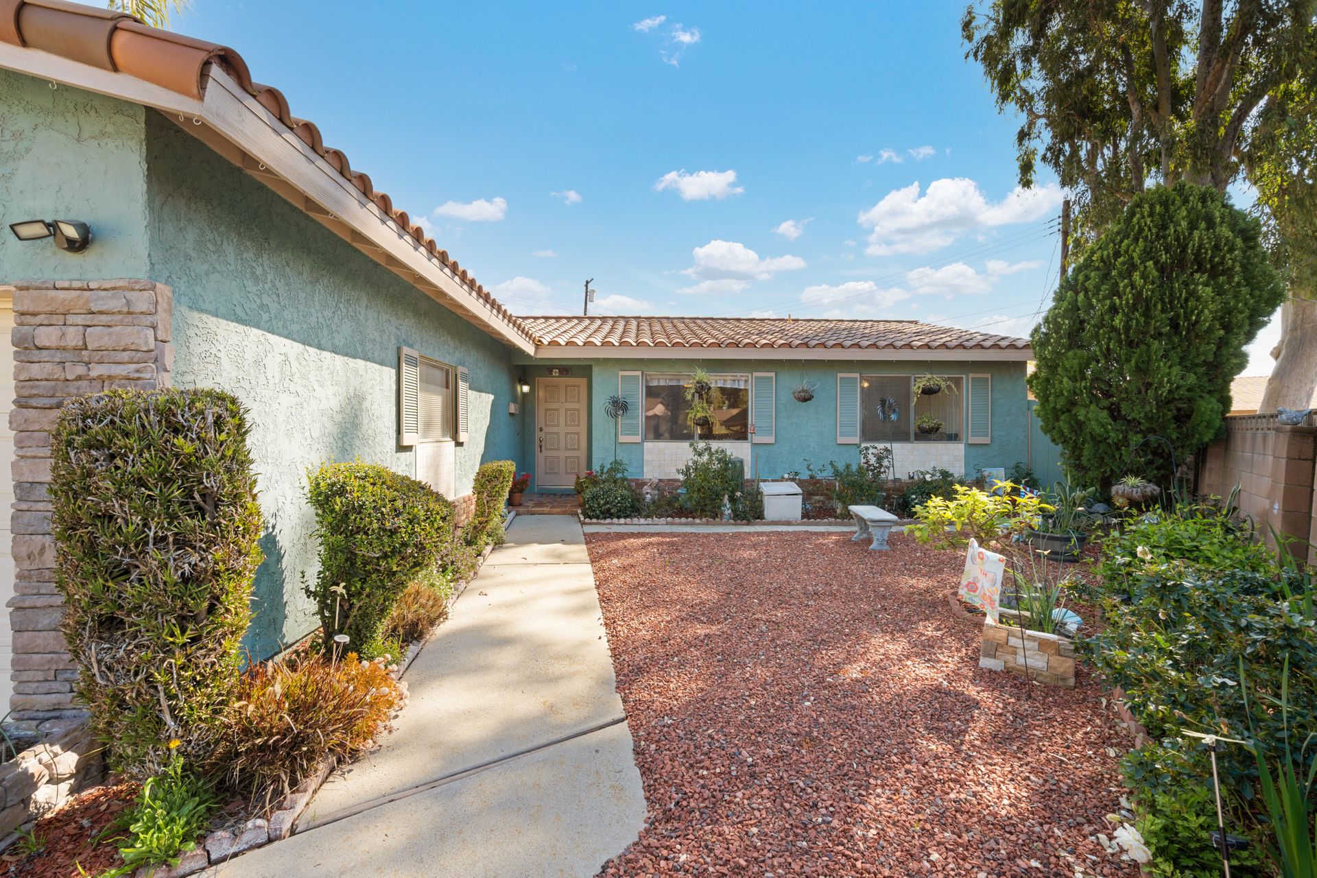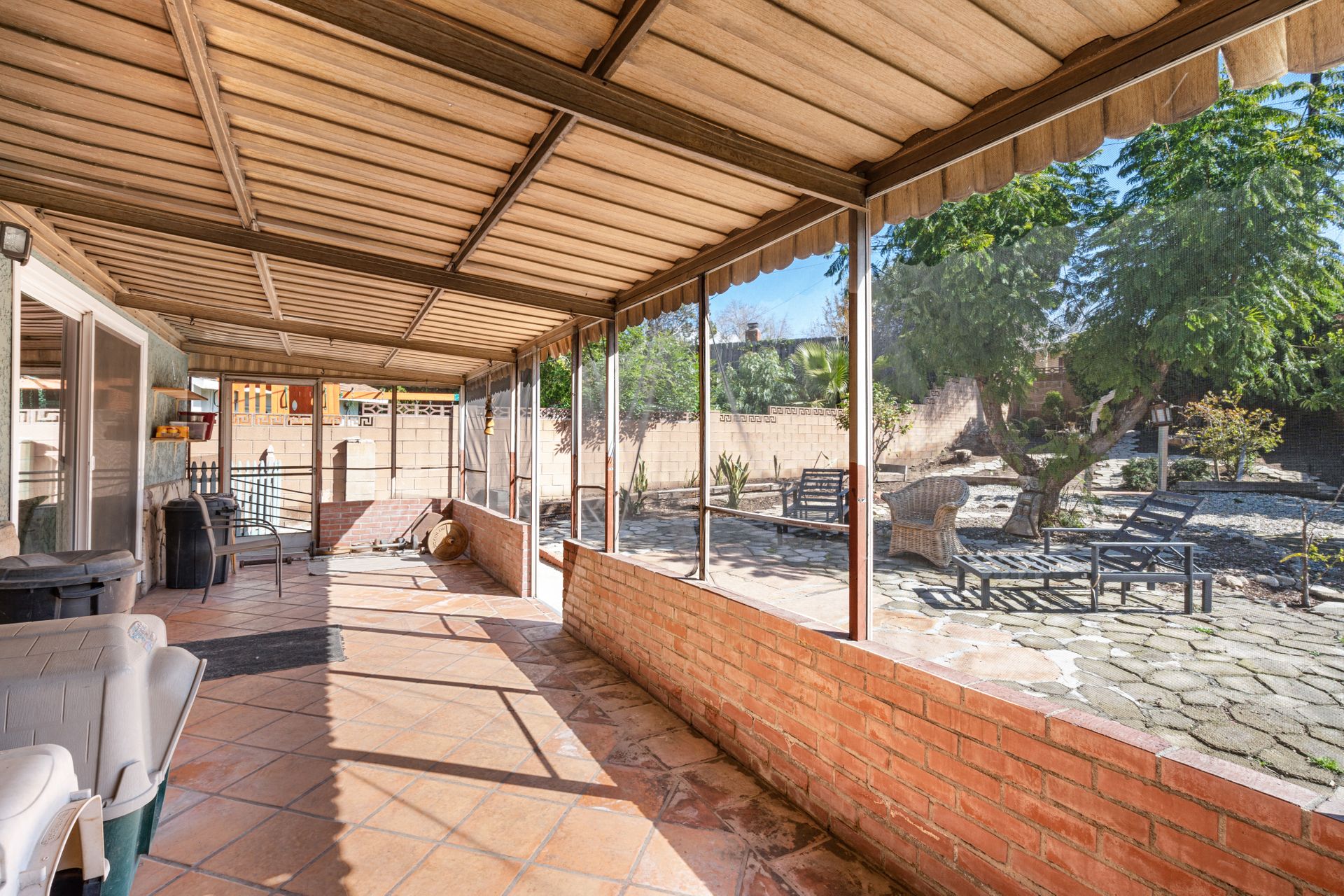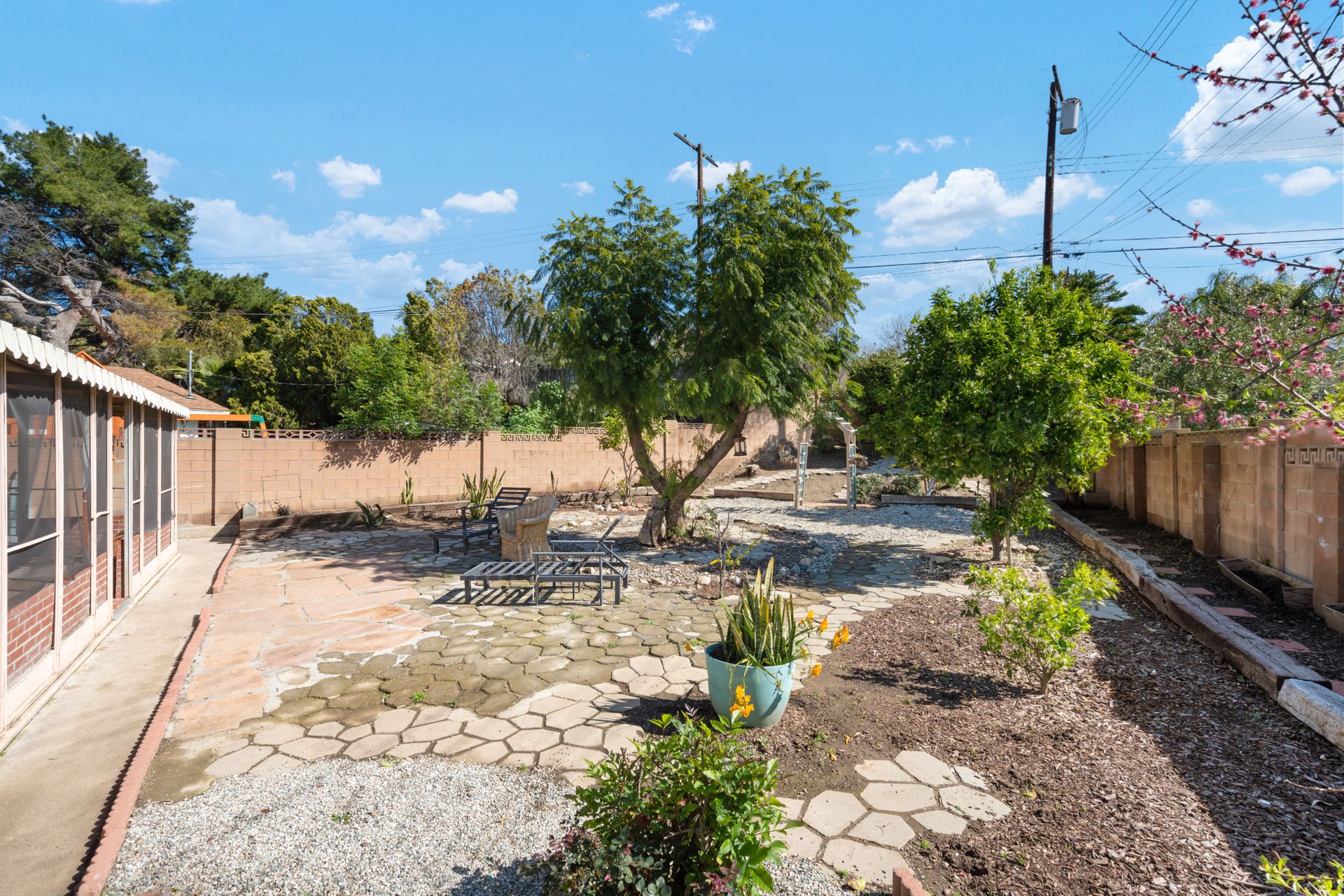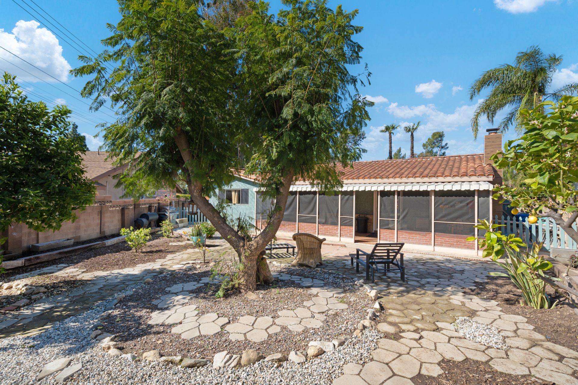 The spacious floor plan allows for seamless movement between the kitchen, living room and bedrooms. The large kitchen, complete with eye-catching woodblock countertops and direct garage access, leads to a comfortable dining area large enough to accommodate an eight-person dining table. The adjacent living room features a large fireplace and warm natural light streaming in through glass sliders. Head out onto the covered patio for delightful al-fresco dining or relish the yard's various fruit trees, including oranges, peaches, cherries, lemons and others. For additional storage or a basketball hoop, there are two expansive concrete side yards.