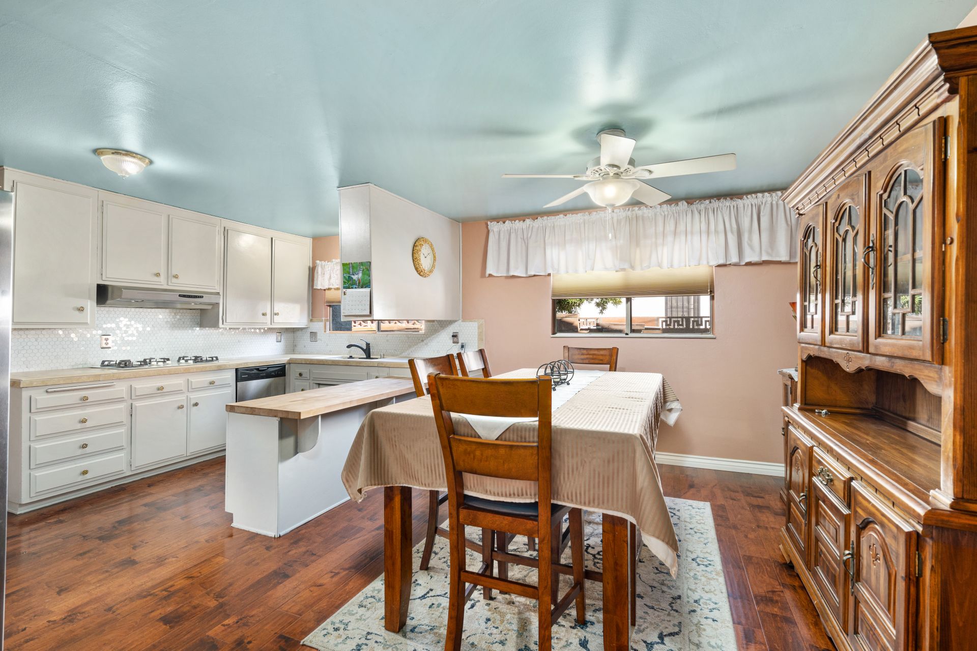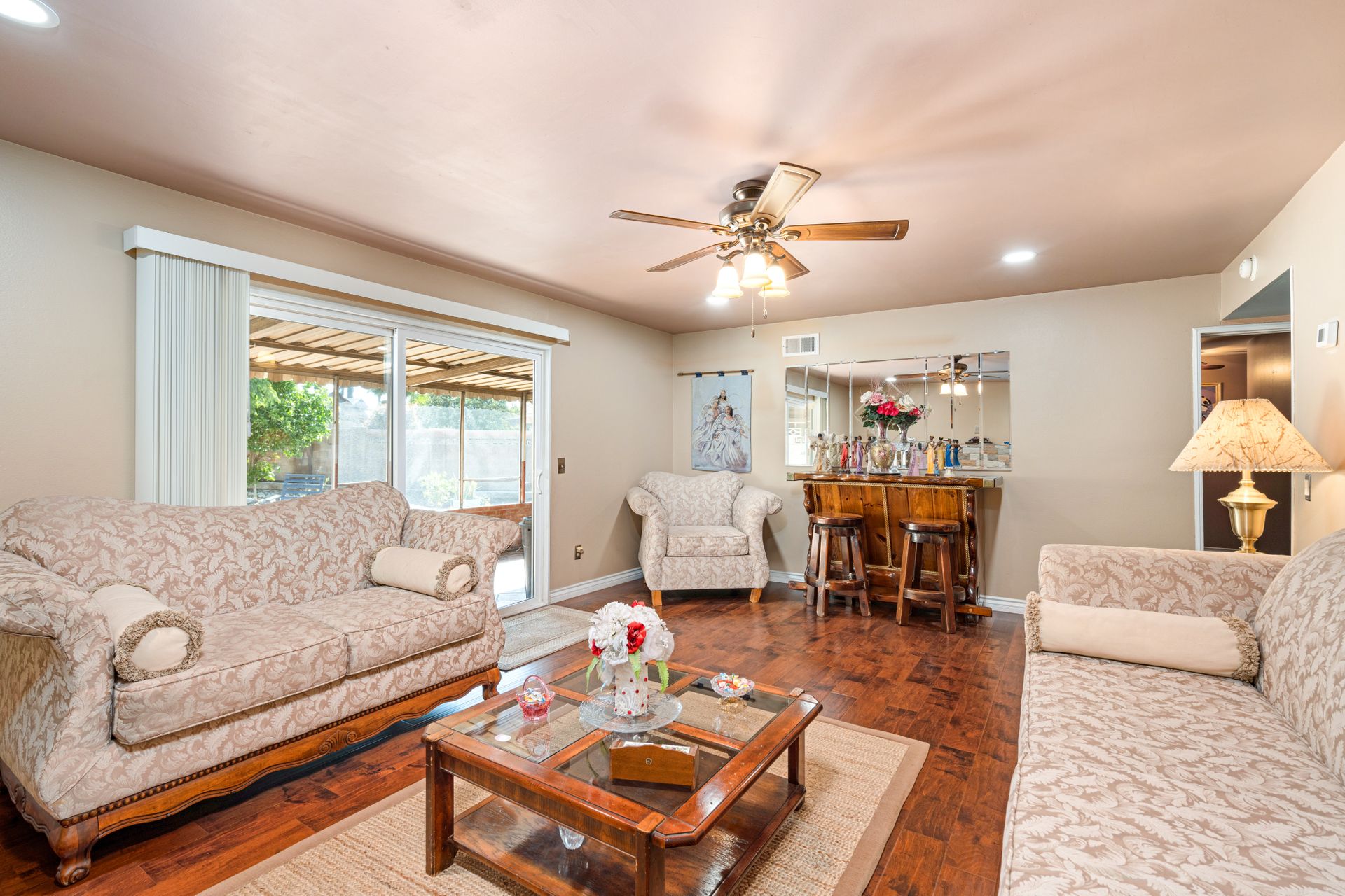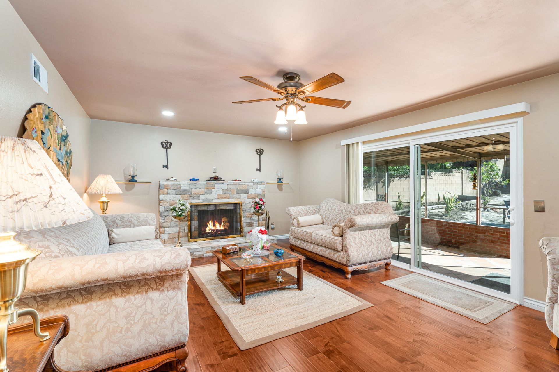 The spacious floor plan allows for seamless movement between the kitchen, living room and bedrooms. The large kitchen, complete with eye-catching woodblock countertops and direct garage access, leads to a comfortable dining area large enough to accommodate an eight-person dining table. The adjacent living room features a large fireplace and warm natural light streaming in through glass sliders. Head out onto the covered patio for delightful al-fresco dining or relish the yard's various fruit trees, including oranges, peaches, cherries, lemons and others. For additional storage or a basketball hoop, there are two expansive concrete side yards.