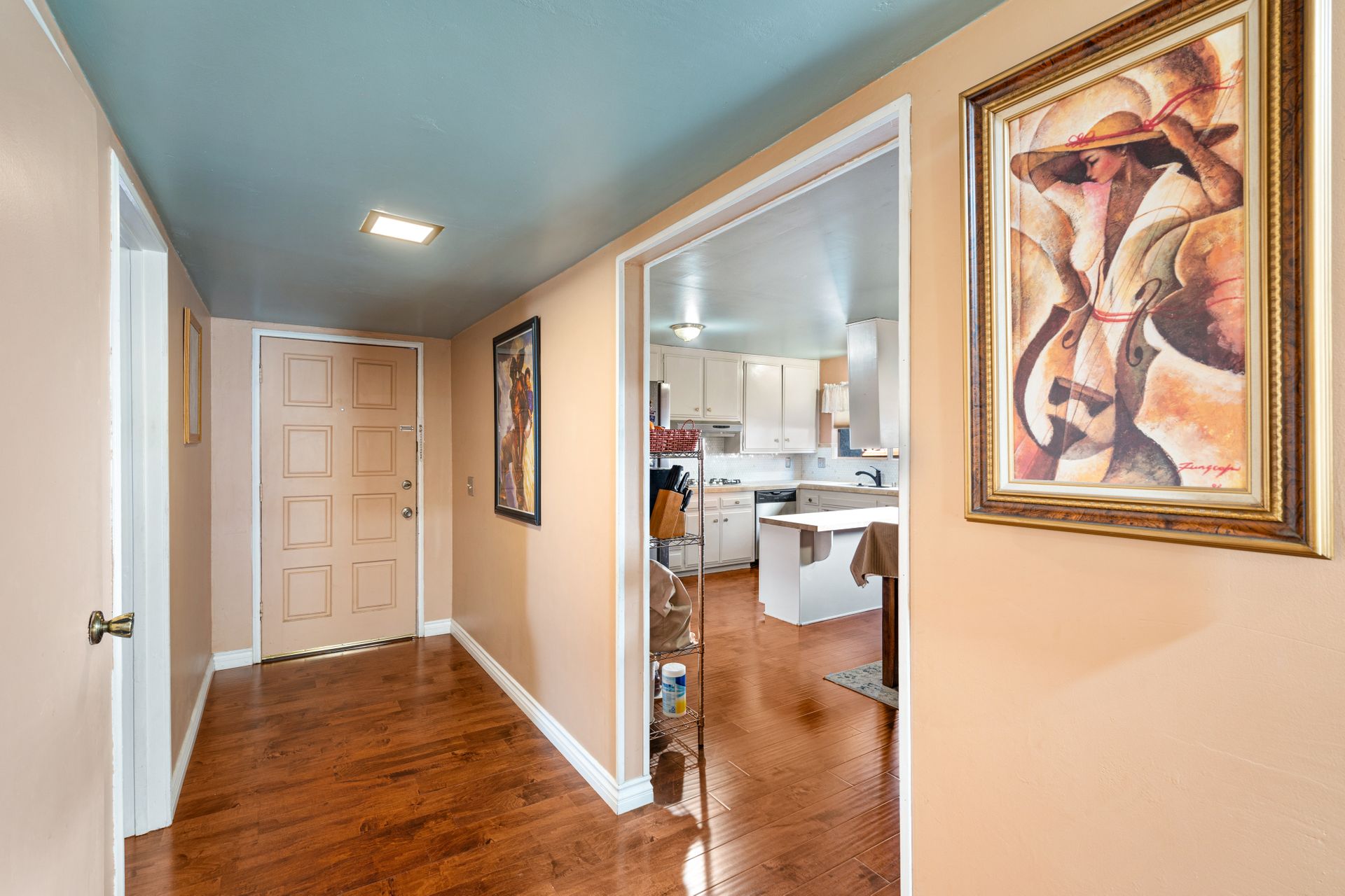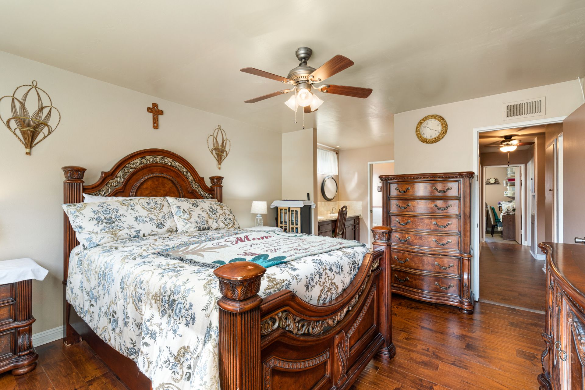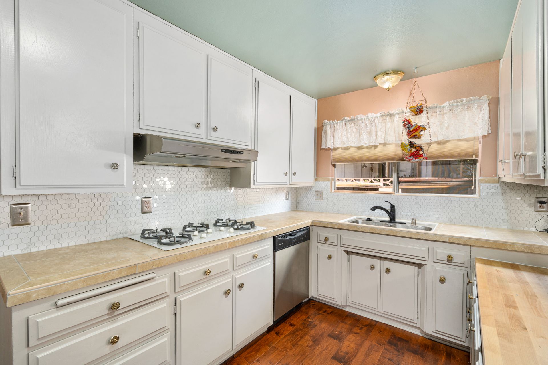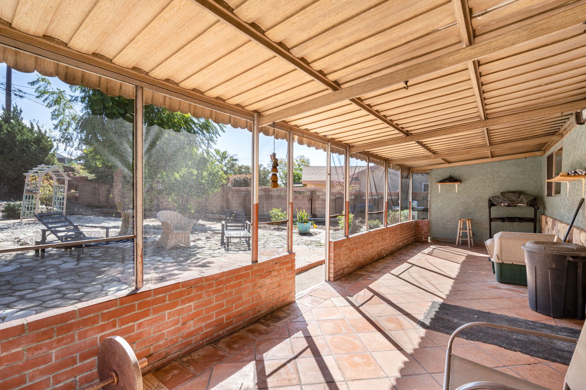 The spacious floor plan allows for seamless movement between the kitchen, living room and bedrooms. The large kitchen, complete with eye-catching woodblock countertops and direct garage access, leads to a comfortable dining area large enough to accommodate an eight-person dining table. The adjacent living room features a large fireplace and warm natural light streaming in through glass sliders. Head out onto the covered patio for delightful al-fresco dining or relish the yard's various fruit trees, including oranges, peaches, cherries, lemons and others. For additional storage or a basketball hoop, there are two expansive concrete side yards.