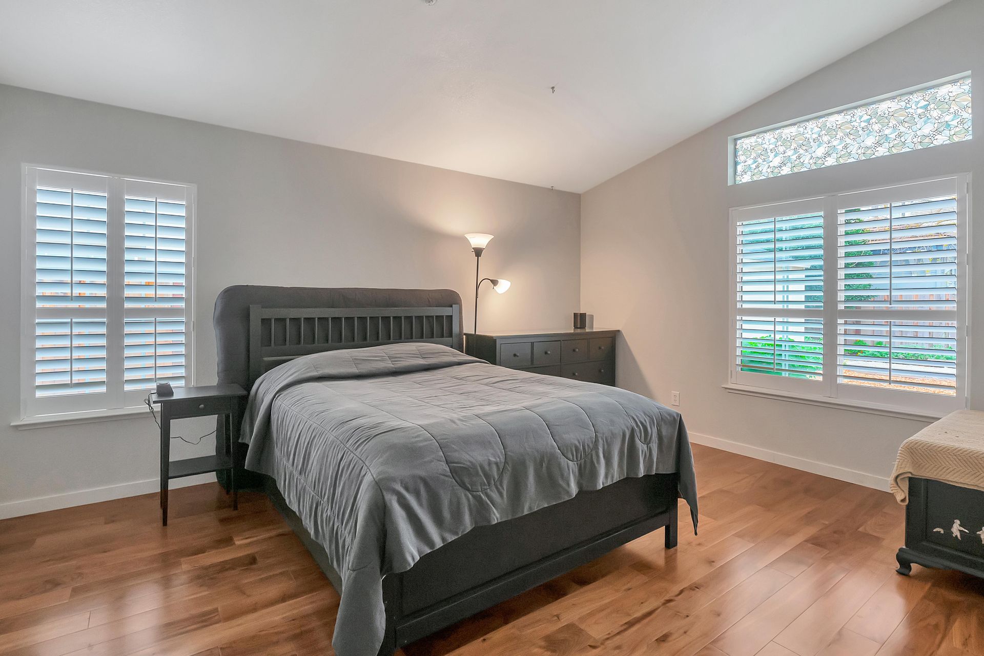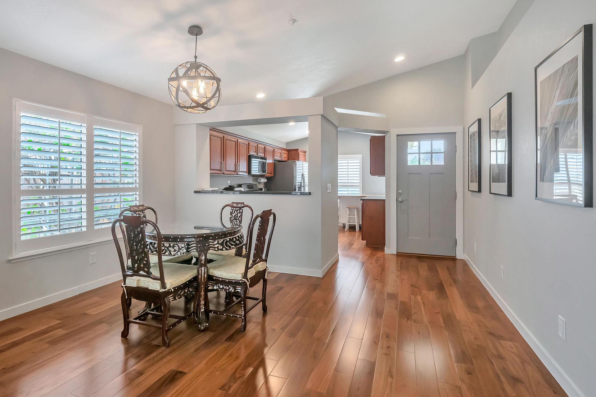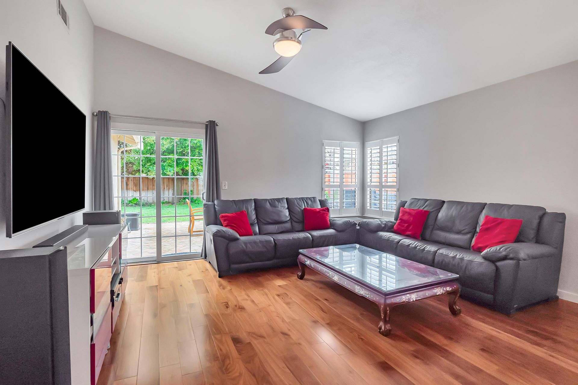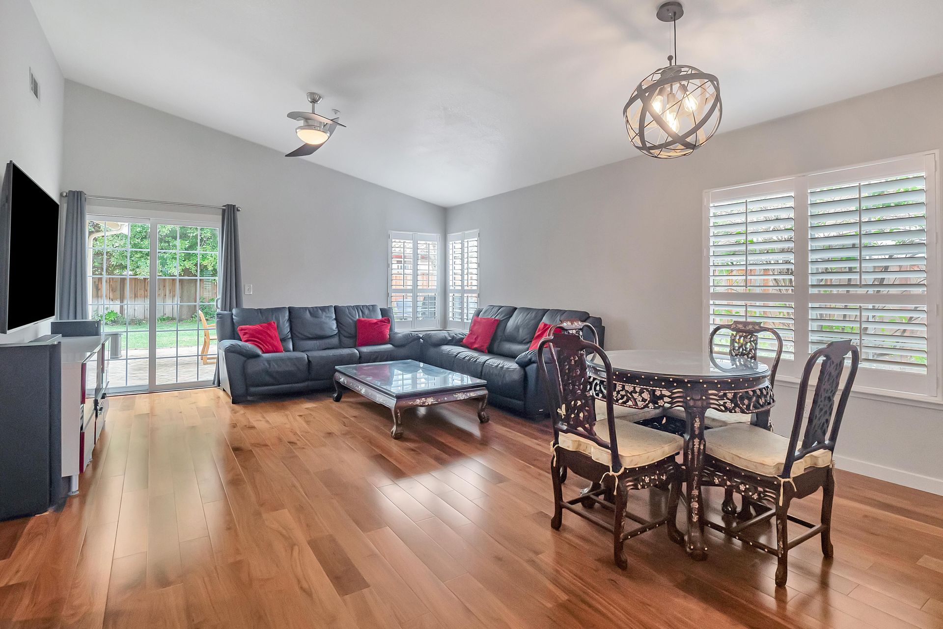 Gorgeous home inside and out. Spacious open concept living and newer beautiful wood floors. Updated kitchen has granite counters, a gas stove and stainless-steel appliances. Other features include washer/dryer, updated primary bath, plantation shutters throughout, updated light fixtures with all LED lights, parking pad for three cars, side yard access, newer concrete walkway in back and side yard, natural gas BBQ, two storage sheds and lush gardens including peach tree, plum tree, and so much more. Conveniently located close to major tech companies, restaurants, entertainment, parks and schools, as well as quick easy access to freeways. Don't miss this opportunity!