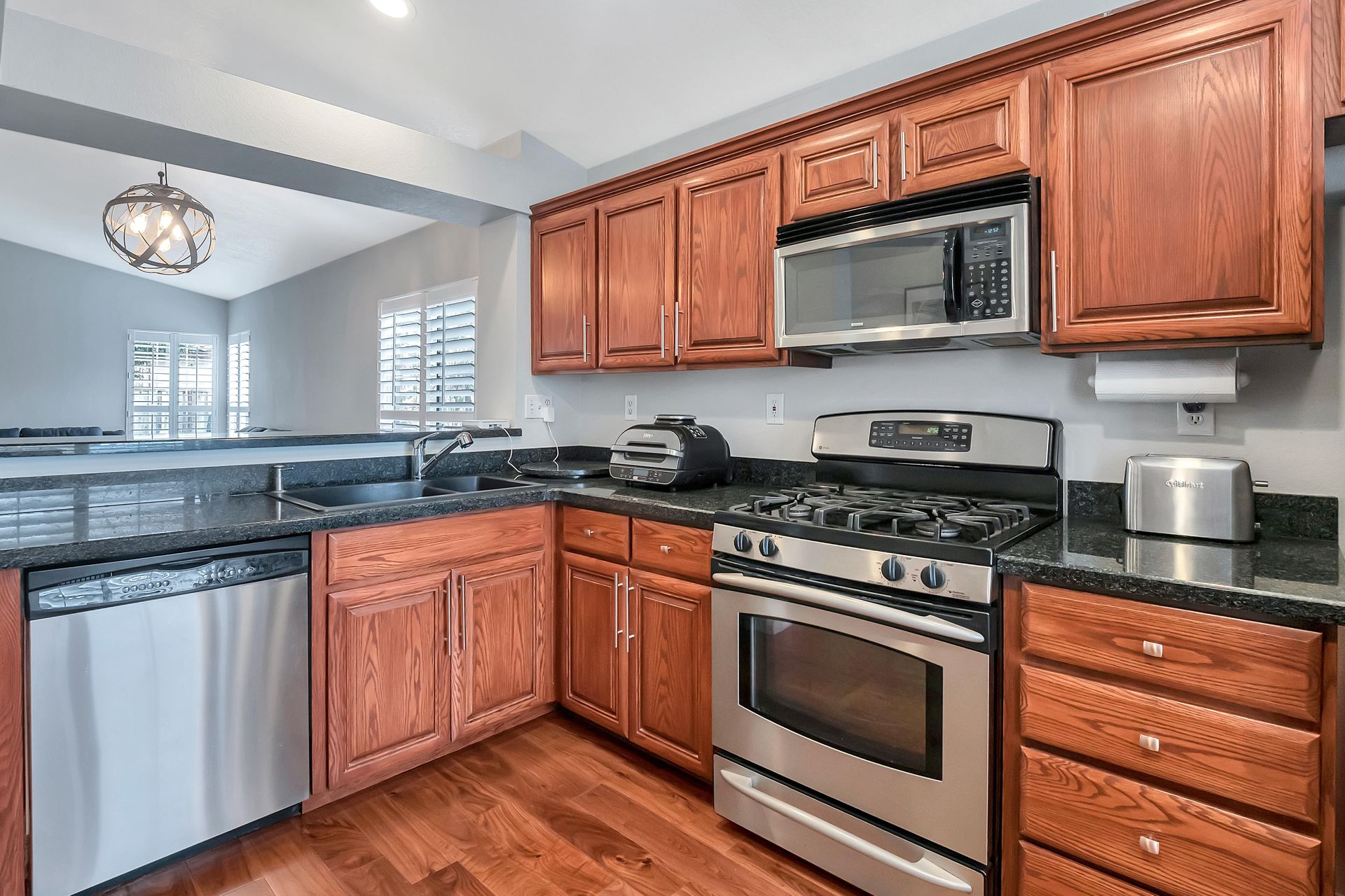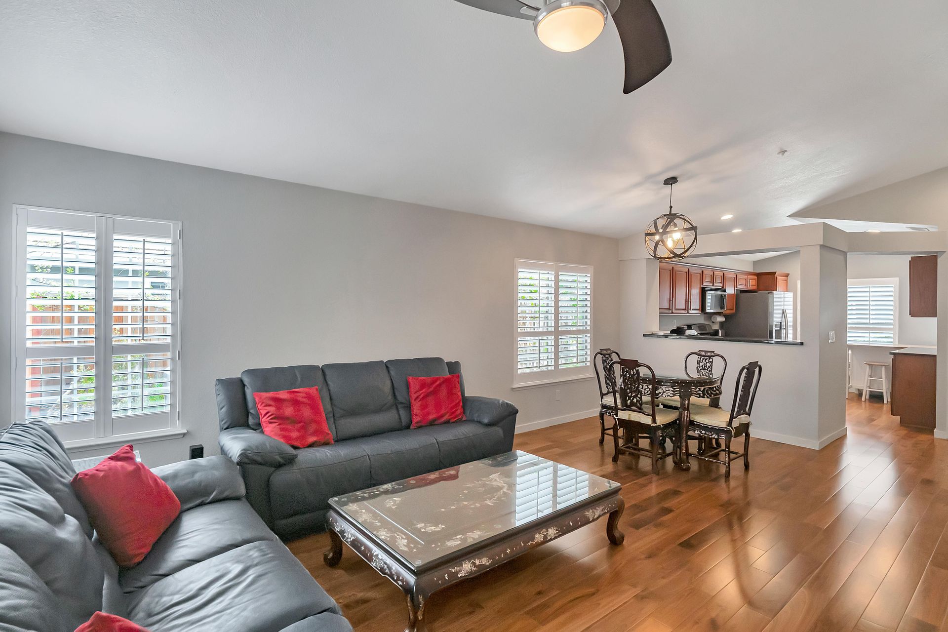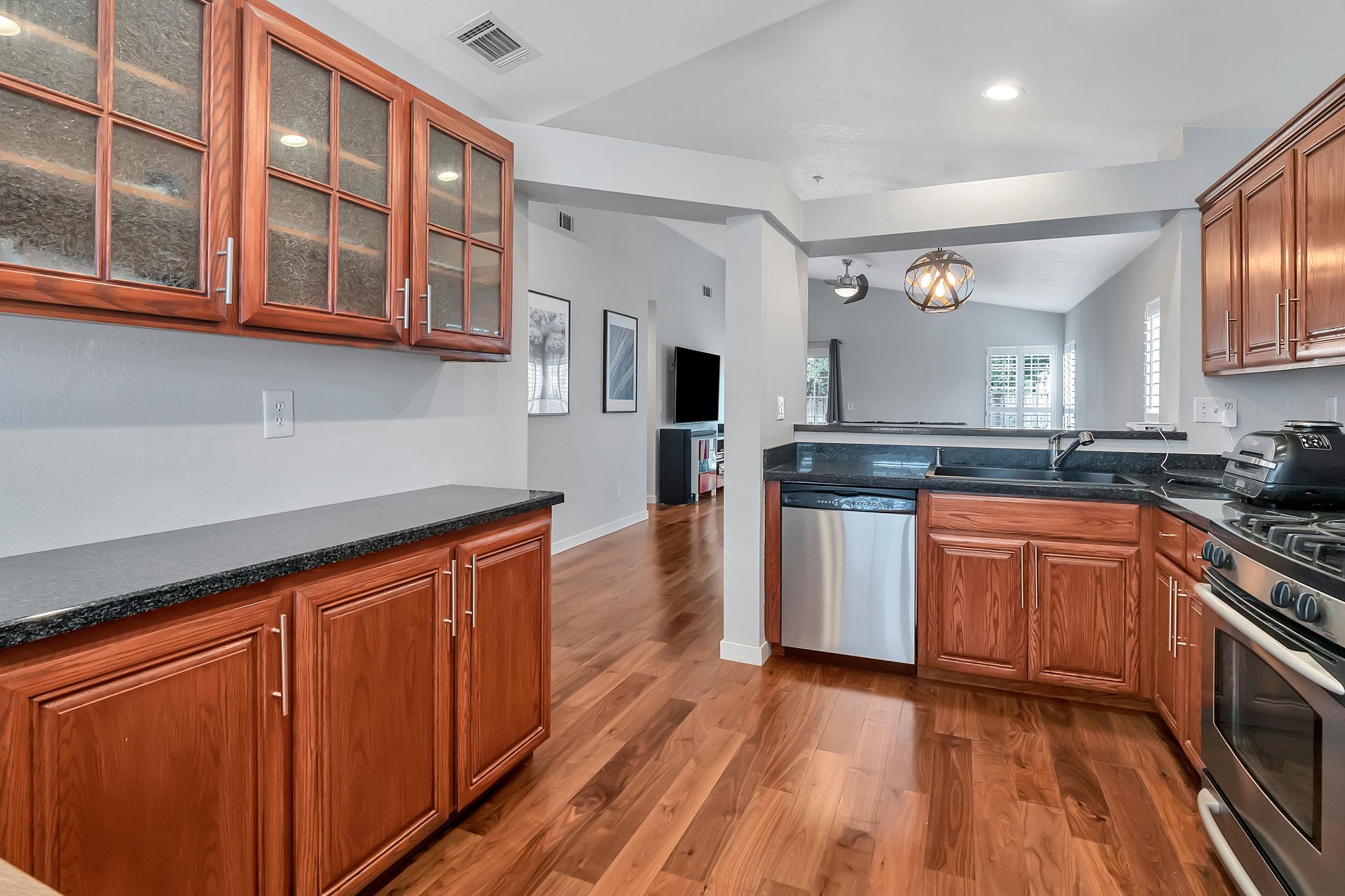Gorgeous home inside and out. Spacious open concept living and newer beautiful wood floors. Updated kitchen has granite counters, a gas stove and stainless-steel appliances. Other features include washer/dryer, updated primary bath, plantation shutters throughout, updated light fixtures with all LED lights, parking pad for three cars, side yard access, newer concrete walkway in back and side yard, natural gas BBQ, two storage sheds and lush gardens including peach tree, plum tree, and so much more. Conveniently located close to major tech companies, restaurants, entertainment, parks and schools, as well as quick easy access to freeways. Don't miss this opportunity!