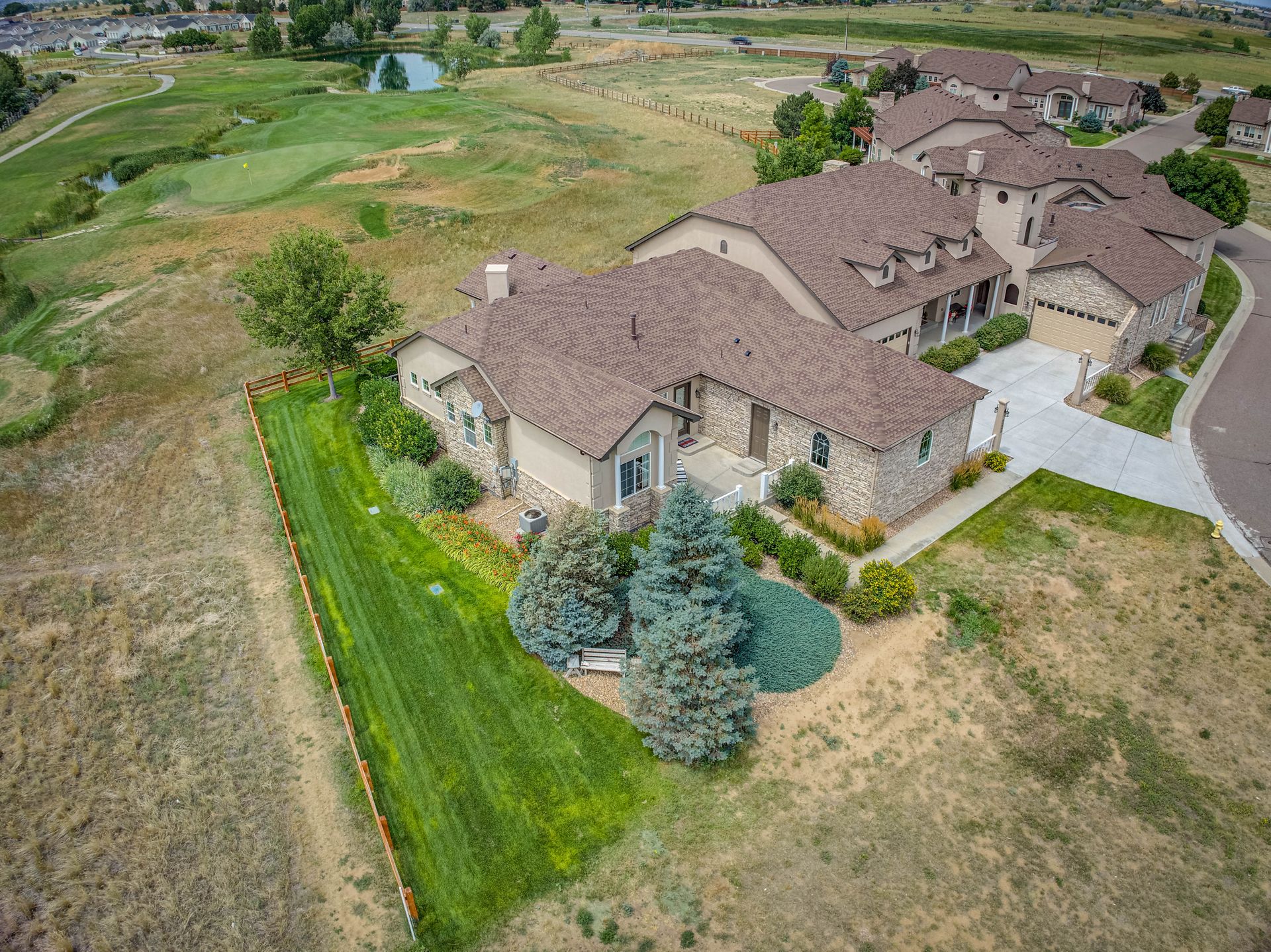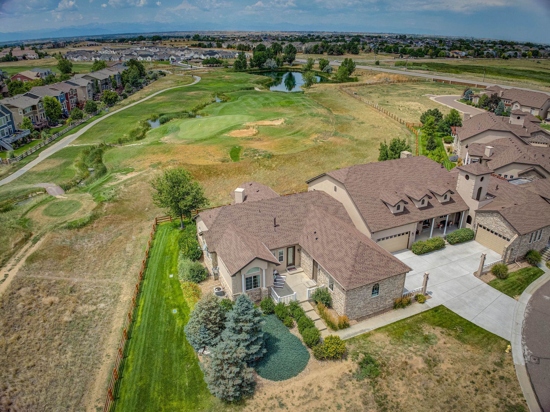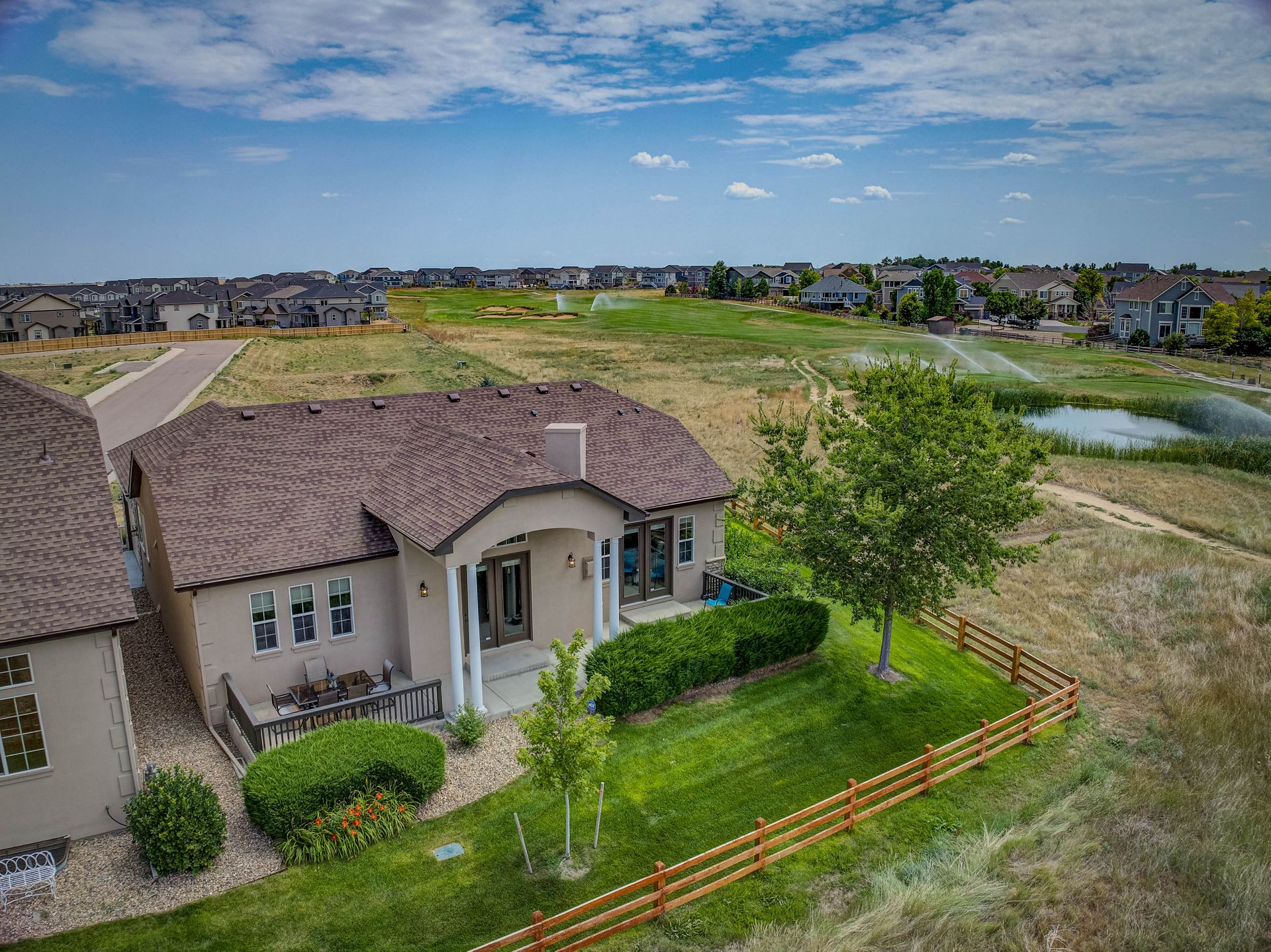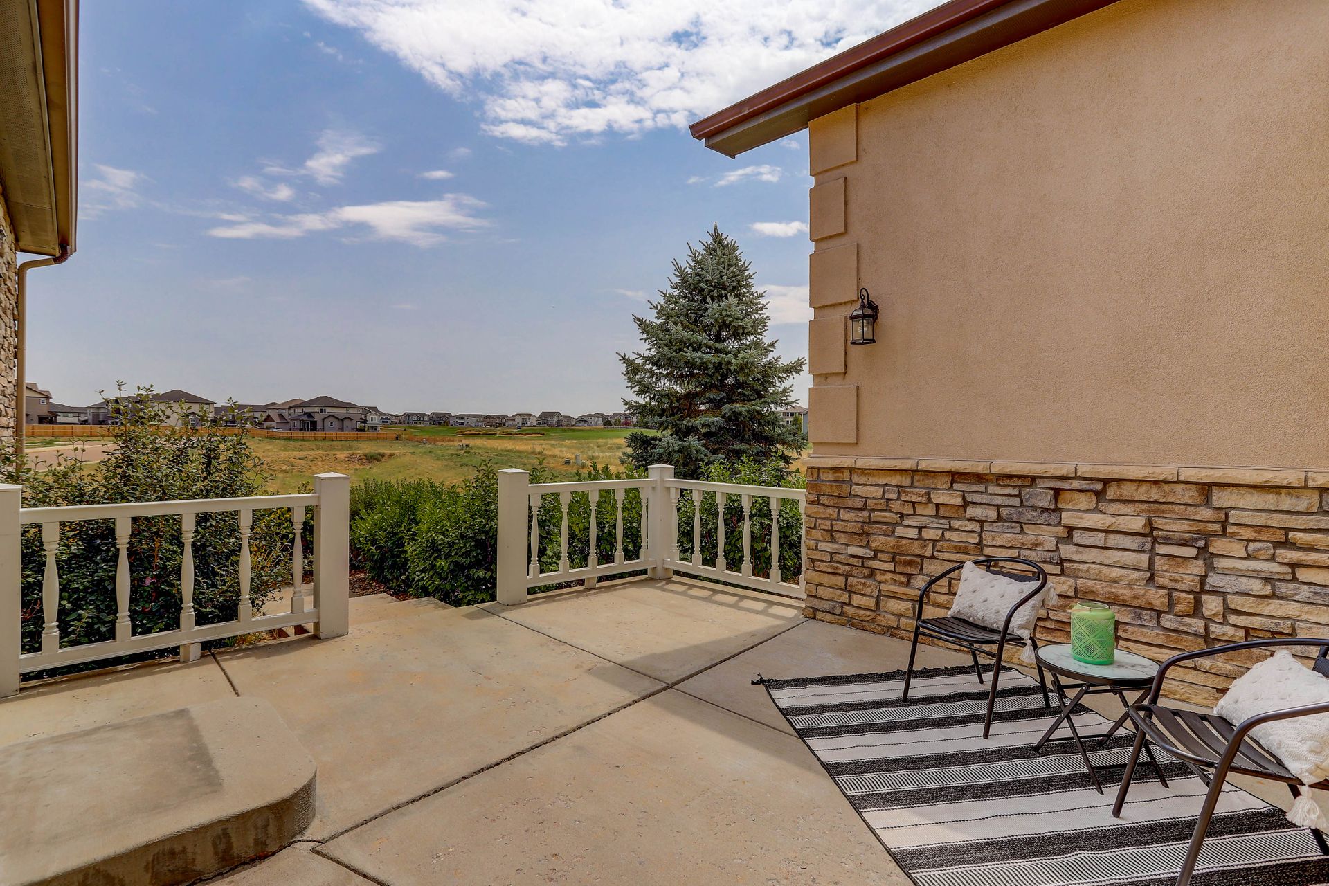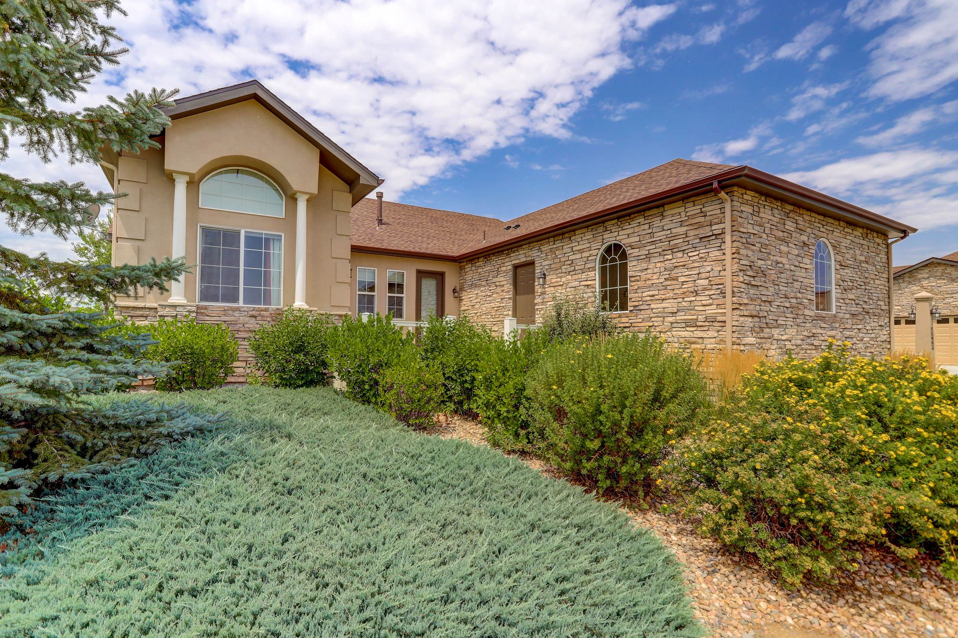 Gorgeous patio home surrounded by golf course, with over 4100 finished square feet. This beautiful home has high ceilings and an open floor plan. The kitchen hosts granite countertops with a breakfast bar, stainless steel appliances and plenty of cabinets, accented with decorative crown molding and under cabinet lighting. The living room has a stacked-stone, gas fireplace, vaulted ceilings and double glass doors leading to the patio. The spacious dining room offers a coffered ceiling and a graceful archway. The main floor primary suite also has double doors leading to the patio, a five-piece bath and a walk-in closet. The main floor also has an office and additional bedroom. The finished basement includes a family room with a fireplace and a wet bar as well as a three-fourths bath and two large bedrooms. Outside you'll find a spacious patio with views of the mountains, golf course and pond. The HOA provides exterior building maintenance, snow removal and grounds maintenance. This is a very quiet, gated community with easy highway access to I-76.