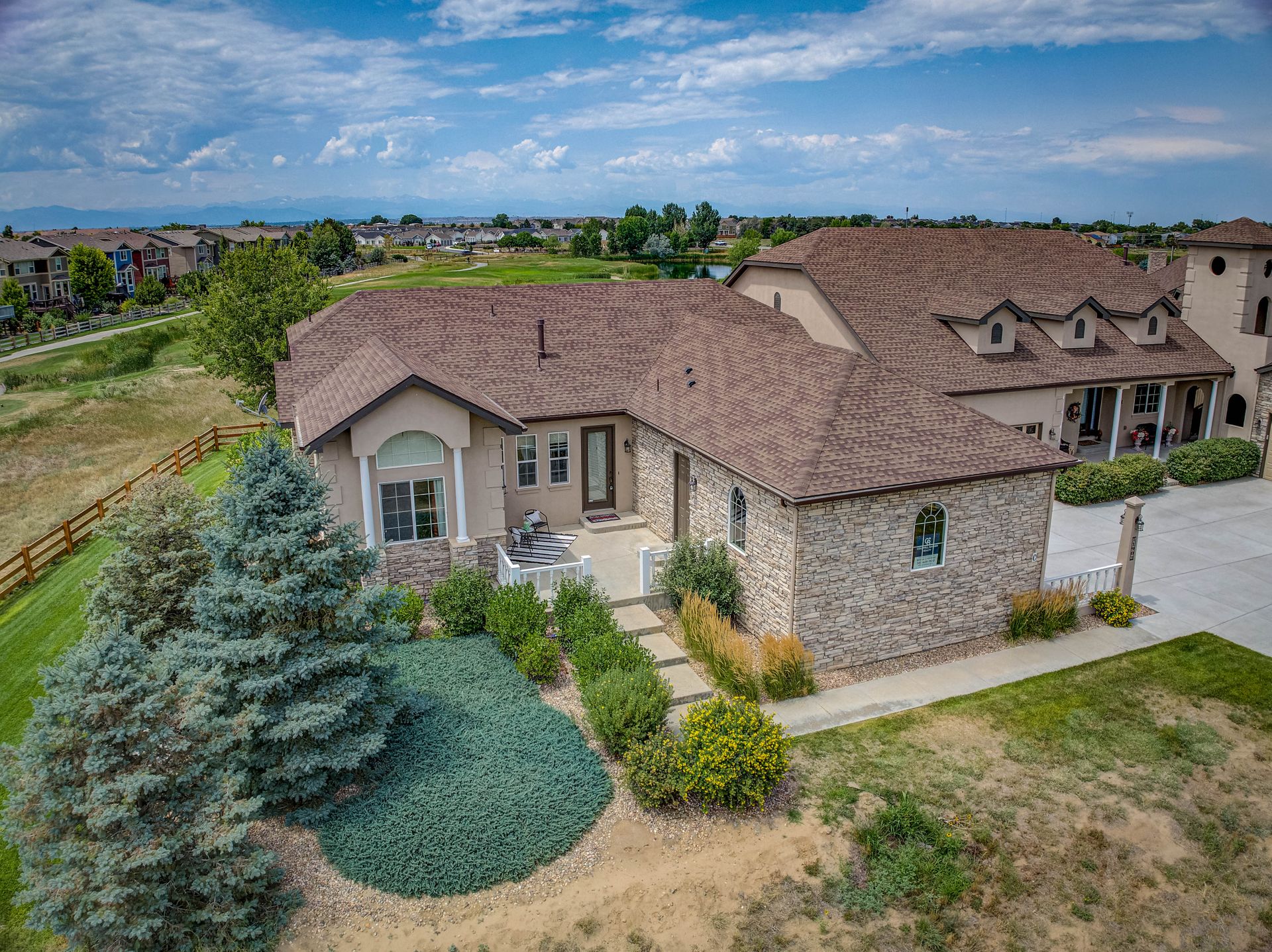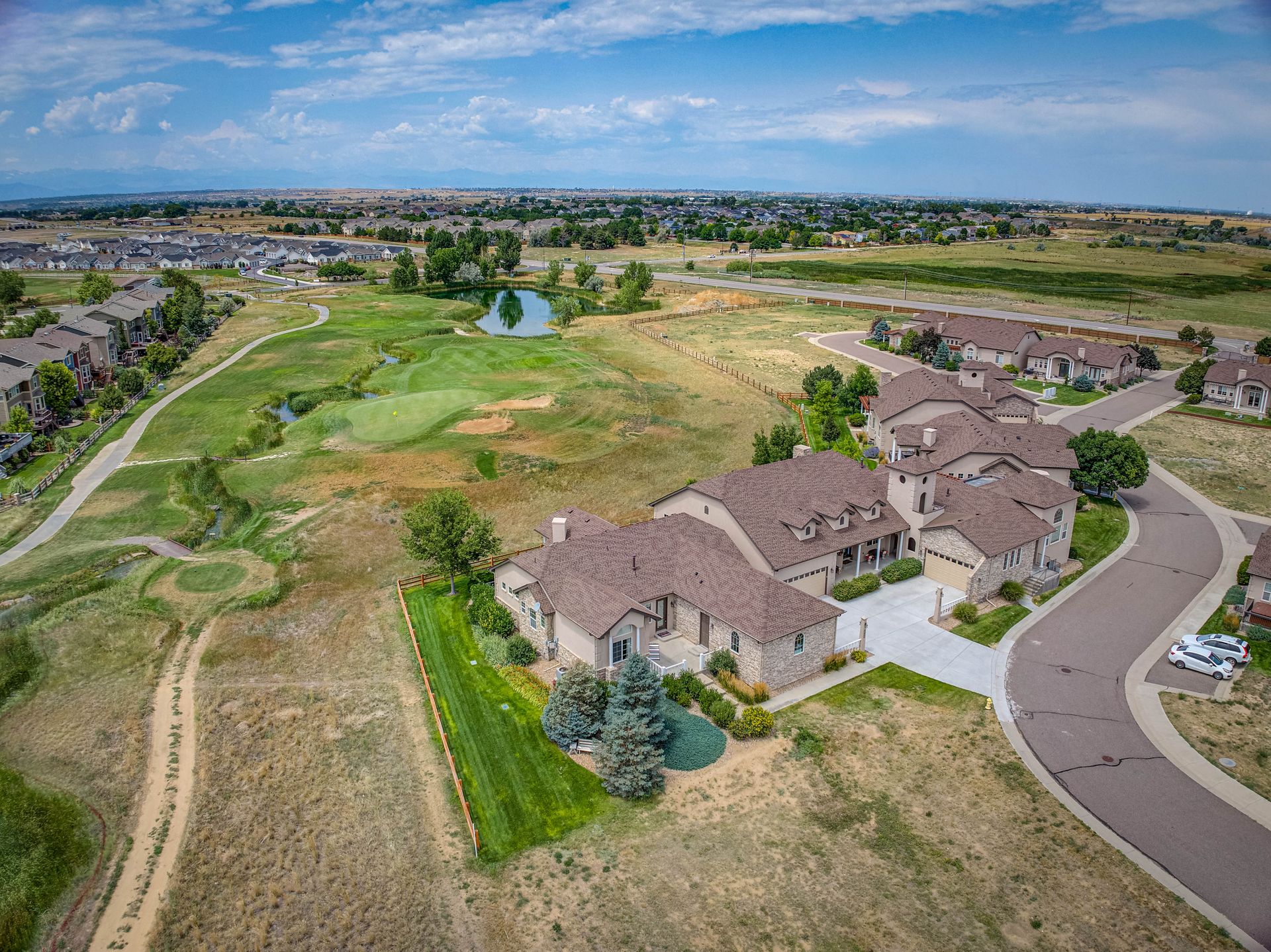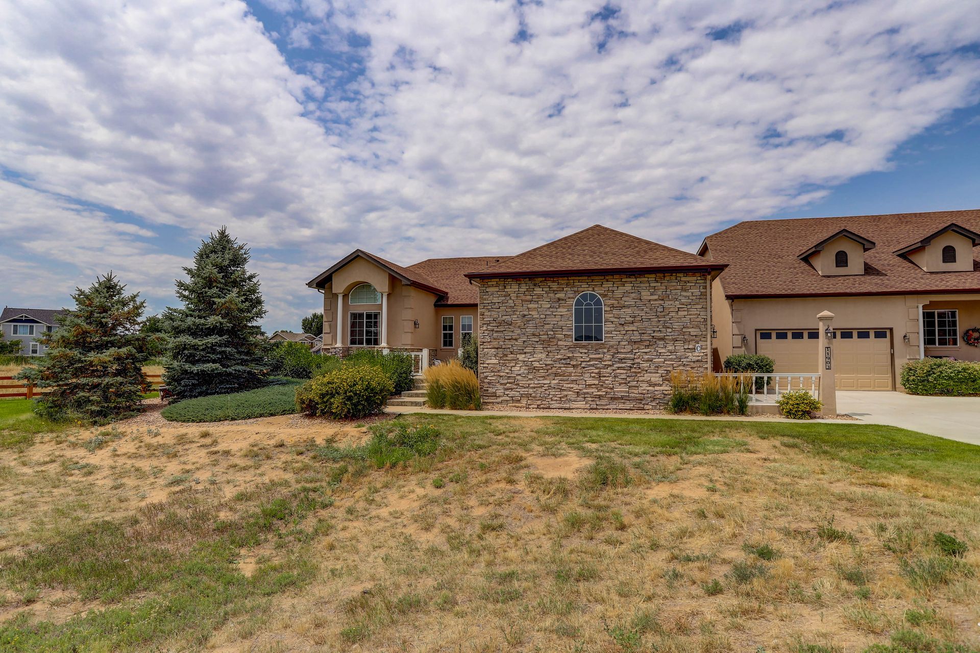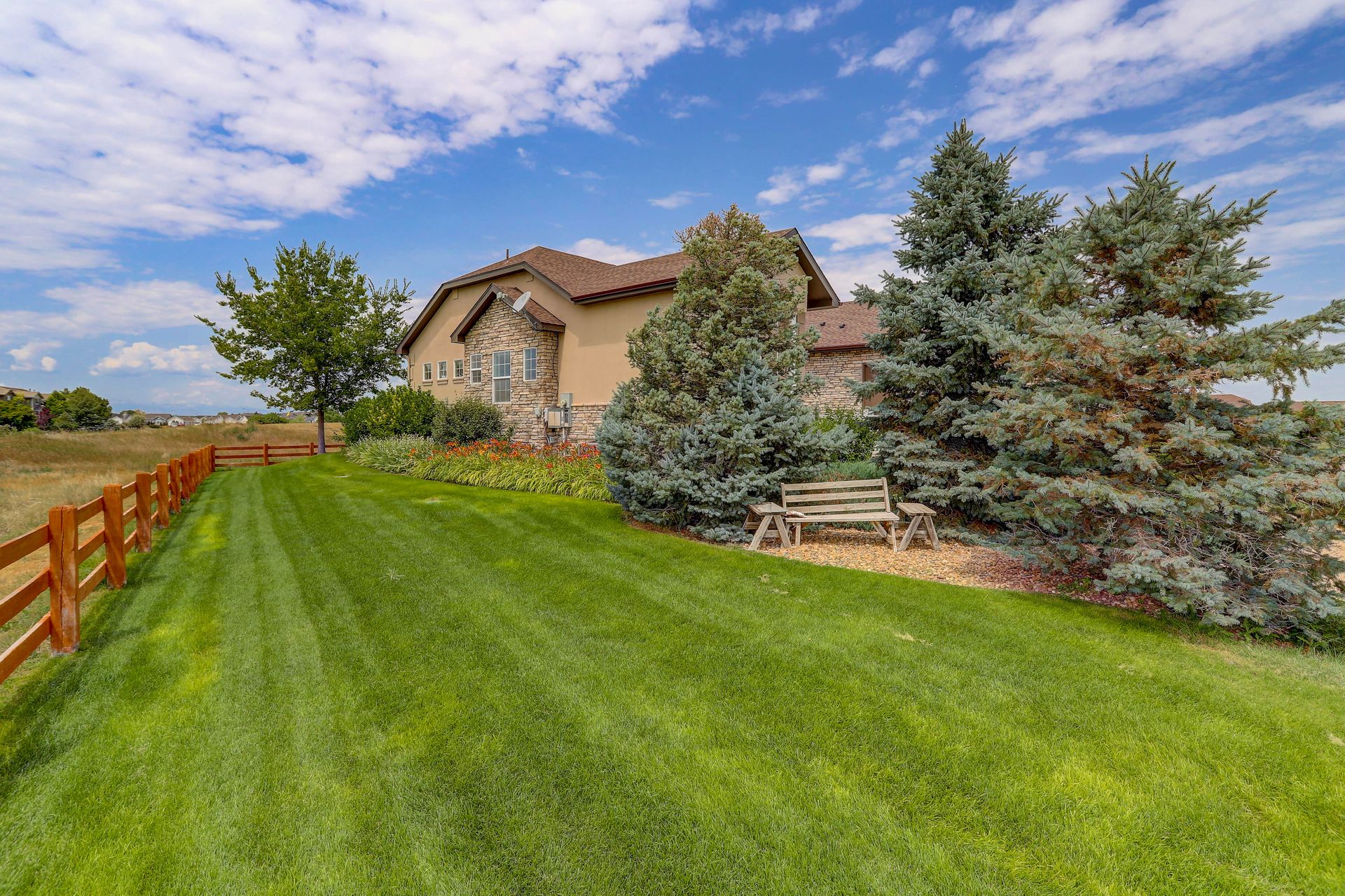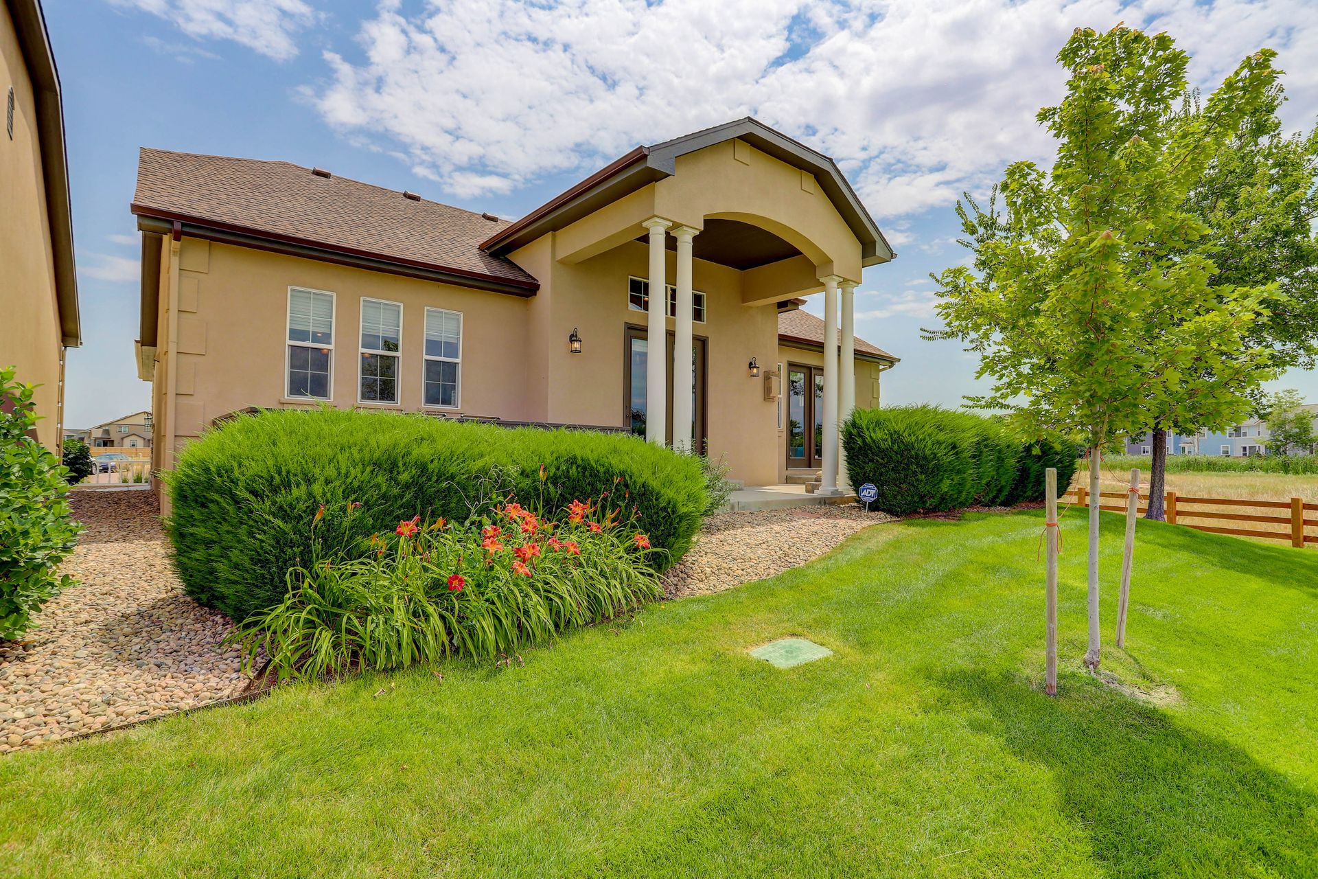 Gorgeous patio home surrounded by golf course, with over 4100 finished square feet. This beautiful home has high ceilings and an open floor plan. The kitchen hosts granite countertops with a breakfast bar, stainless steel appliances and plenty of cabinets, accented with decorative crown molding and under cabinet lighting. The living room has a stacked-stone, gas fireplace, vaulted ceilings and double glass doors leading to the patio. The spacious dining room offers a coffered ceiling and a graceful archway. The main floor primary suite also has double doors leading to the patio, a five-piece bath and a walk-in closet. The main floor also has an office and additional bedroom. The finished basement includes a family room with a fireplace and a wet bar as well as a three-fourths bath and two large bedrooms. Outside you'll find a spacious patio with views of the mountains, golf course and pond. The HOA provides exterior building maintenance, snow removal and grounds maintenance. This is a very quiet, gated community with easy highway access to I-76.