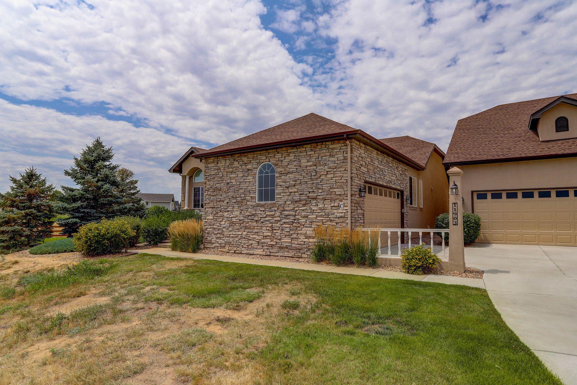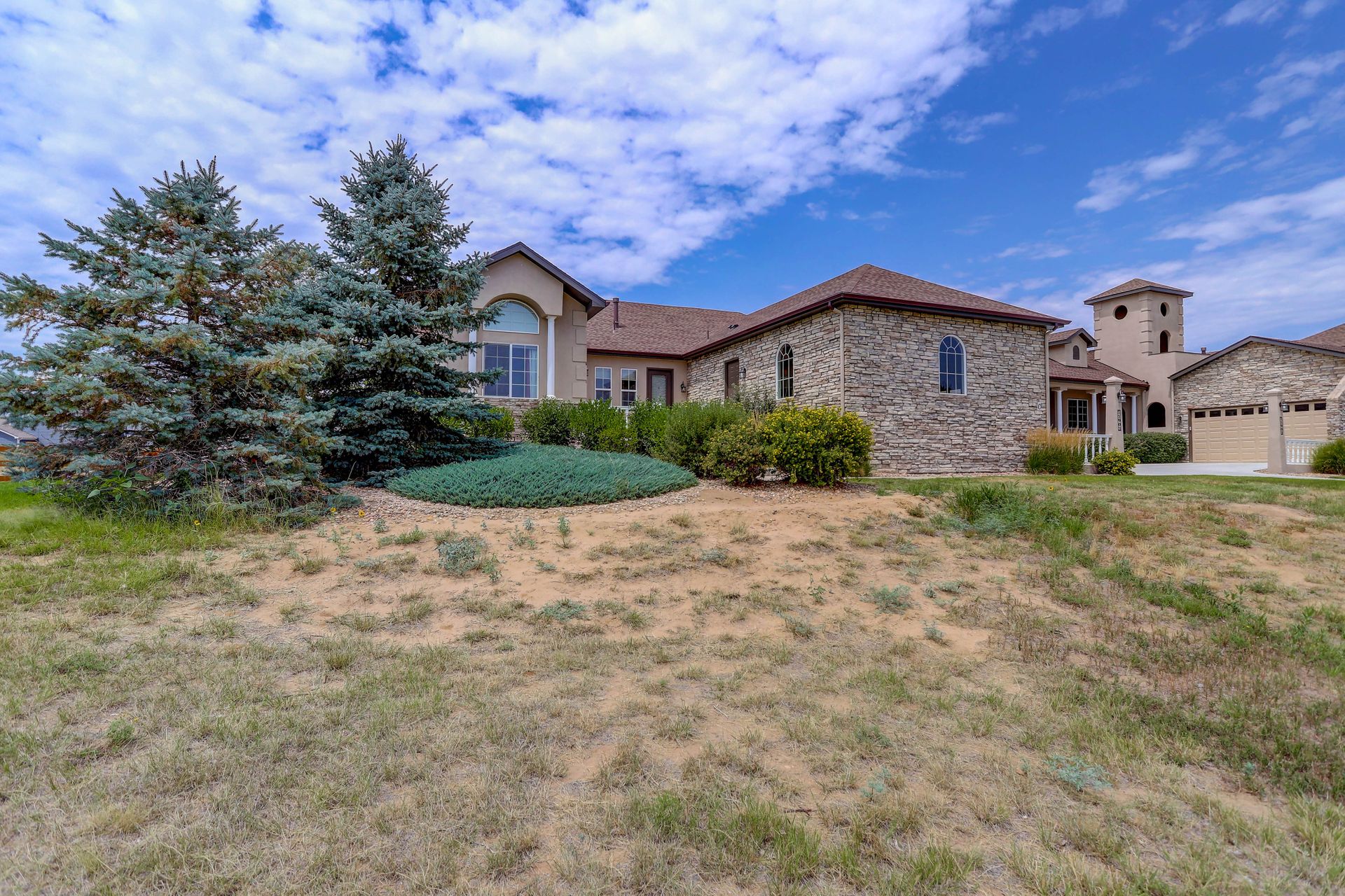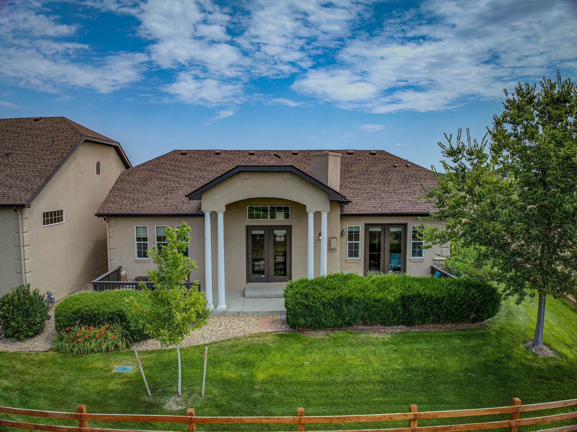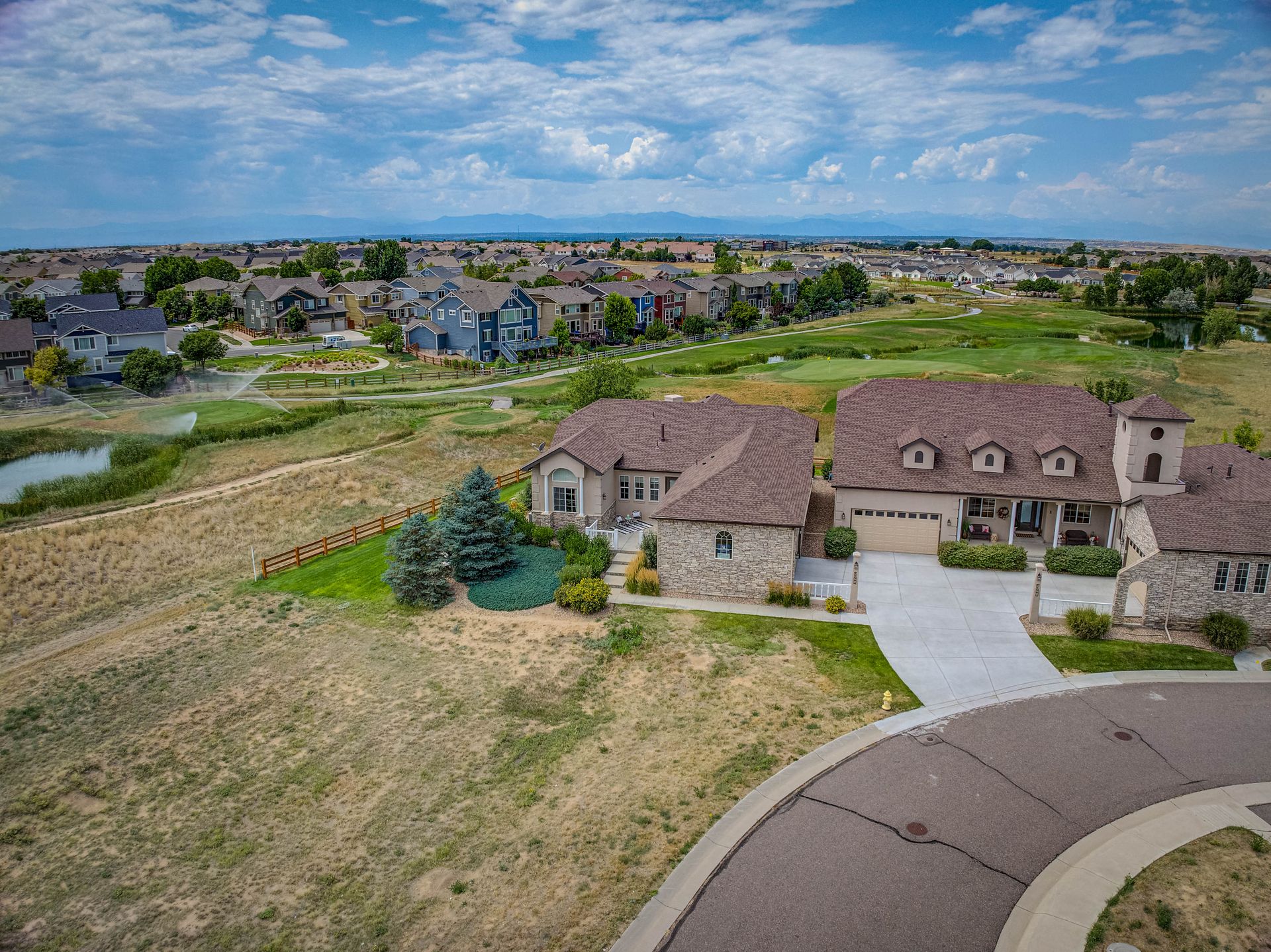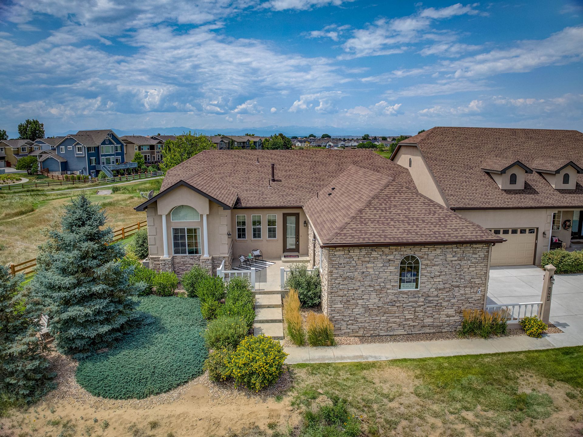 Gorgeous patio home surrounded by golf course, with over 4100 finished square feet. This beautiful home has high ceilings and an open floor plan. The kitchen hosts granite countertops with a breakfast bar, stainless steel appliances and plenty of cabinets, accented with decorative crown molding and under cabinet lighting. The living room has a stacked-stone, gas fireplace, vaulted ceilings and double glass doors leading to the patio. The spacious dining room offers a coffered ceiling and a graceful archway. The main floor primary suite also has double doors leading to the patio, a five-piece bath and a walk-in closet. The main floor also has an office and additional bedroom. The finished basement includes a family room with a fireplace and a wet bar as well as a three-fourths bath and two large bedrooms. Outside you'll find a spacious patio with views of the mountains, golf course and pond. The HOA provides exterior building maintenance, snow removal and grounds maintenance. This is a very quiet, gated community with easy highway access to I-76.