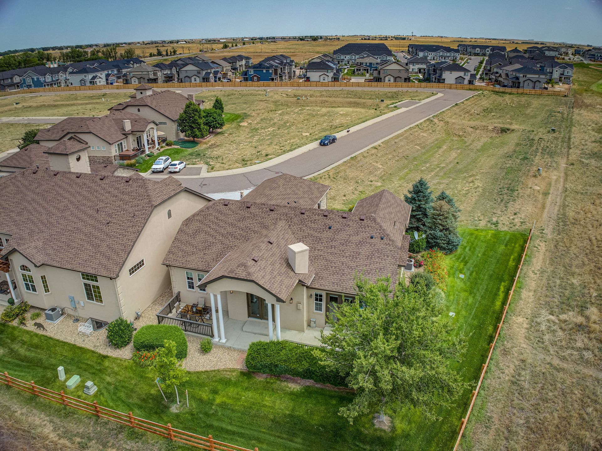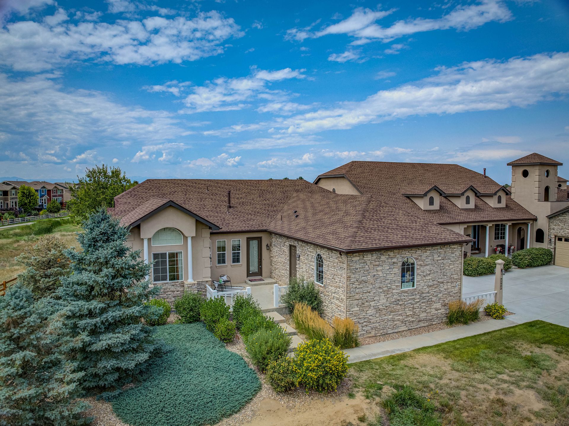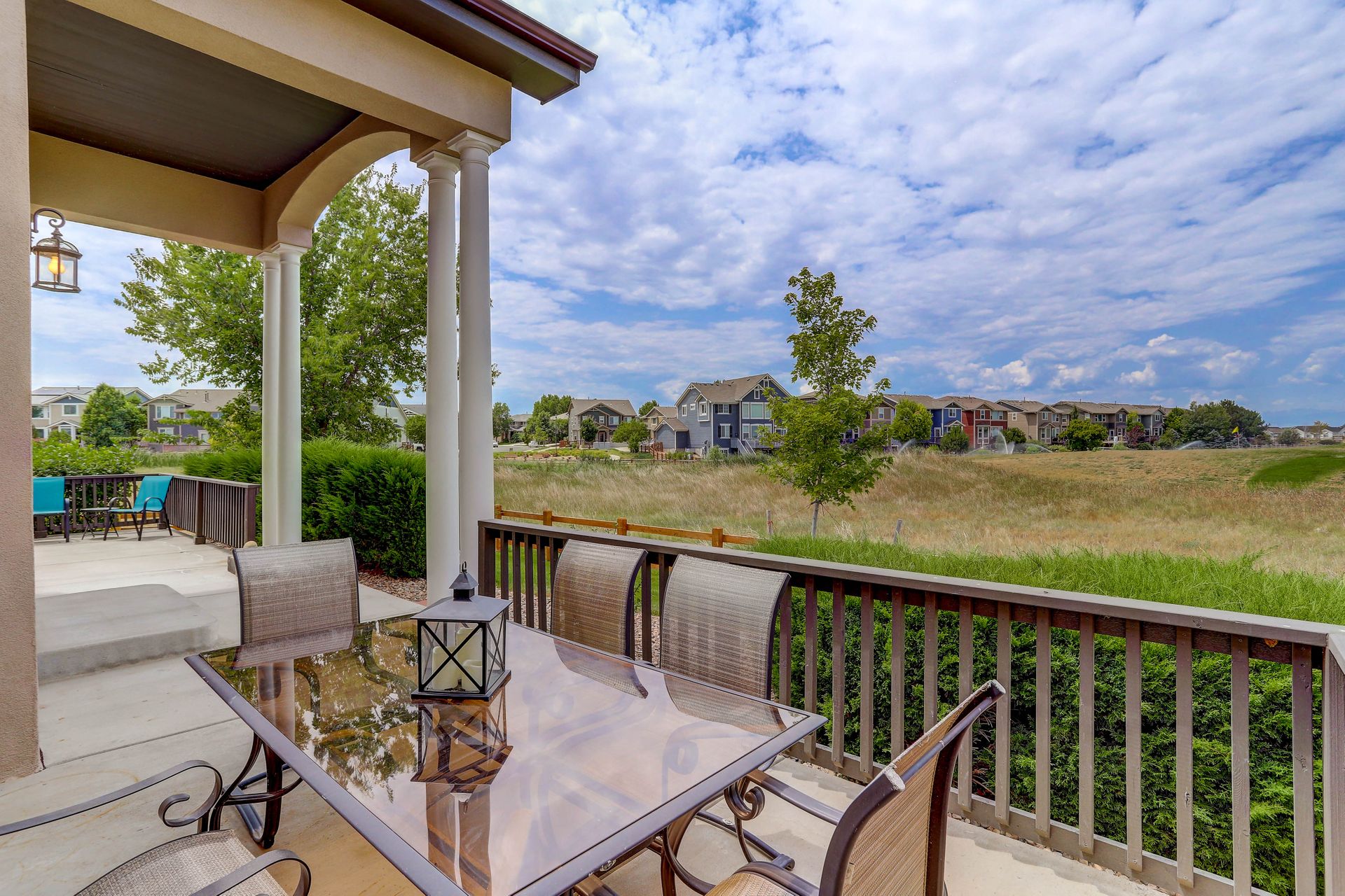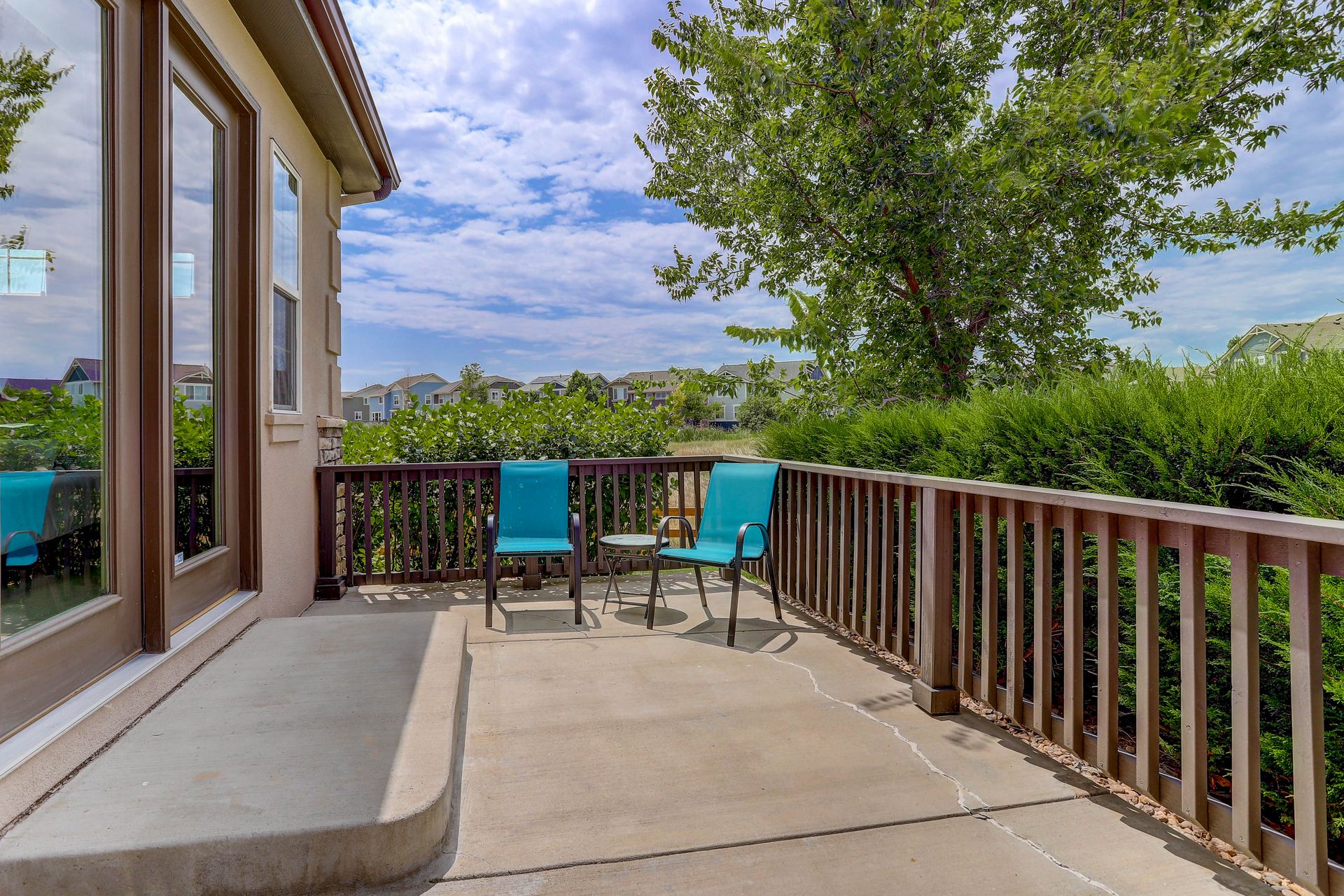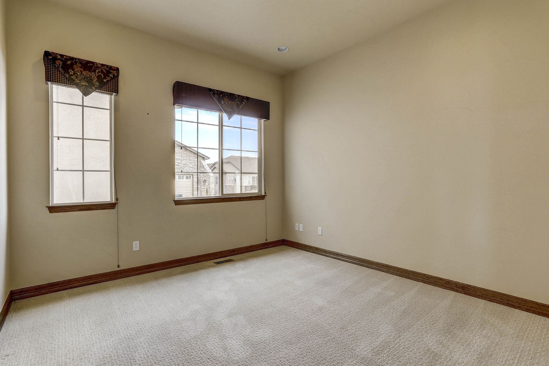 Gorgeous patio home surrounded by golf course, with over 4100 finished square feet. This beautiful home has high ceilings and an open floor plan. The kitchen hosts granite countertops with a breakfast bar, stainless steel appliances and plenty of cabinets, accented with decorative crown molding and under cabinet lighting. The living room has a stacked-stone, gas fireplace, vaulted ceilings and double glass doors leading to the patio. The spacious dining room offers a coffered ceiling and a graceful archway. The main floor primary suite also has double doors leading to the patio, a five-piece bath and a walk-in closet. The main floor also has an office and additional bedroom. The finished basement includes a family room with a fireplace and a wet bar as well as a three-fourths bath and two large bedrooms. Outside you'll find a spacious patio with views of the mountains, golf course and pond. The HOA provides exterior building maintenance, snow removal and grounds maintenance. This is a very quiet, gated community with easy highway access to I-76.