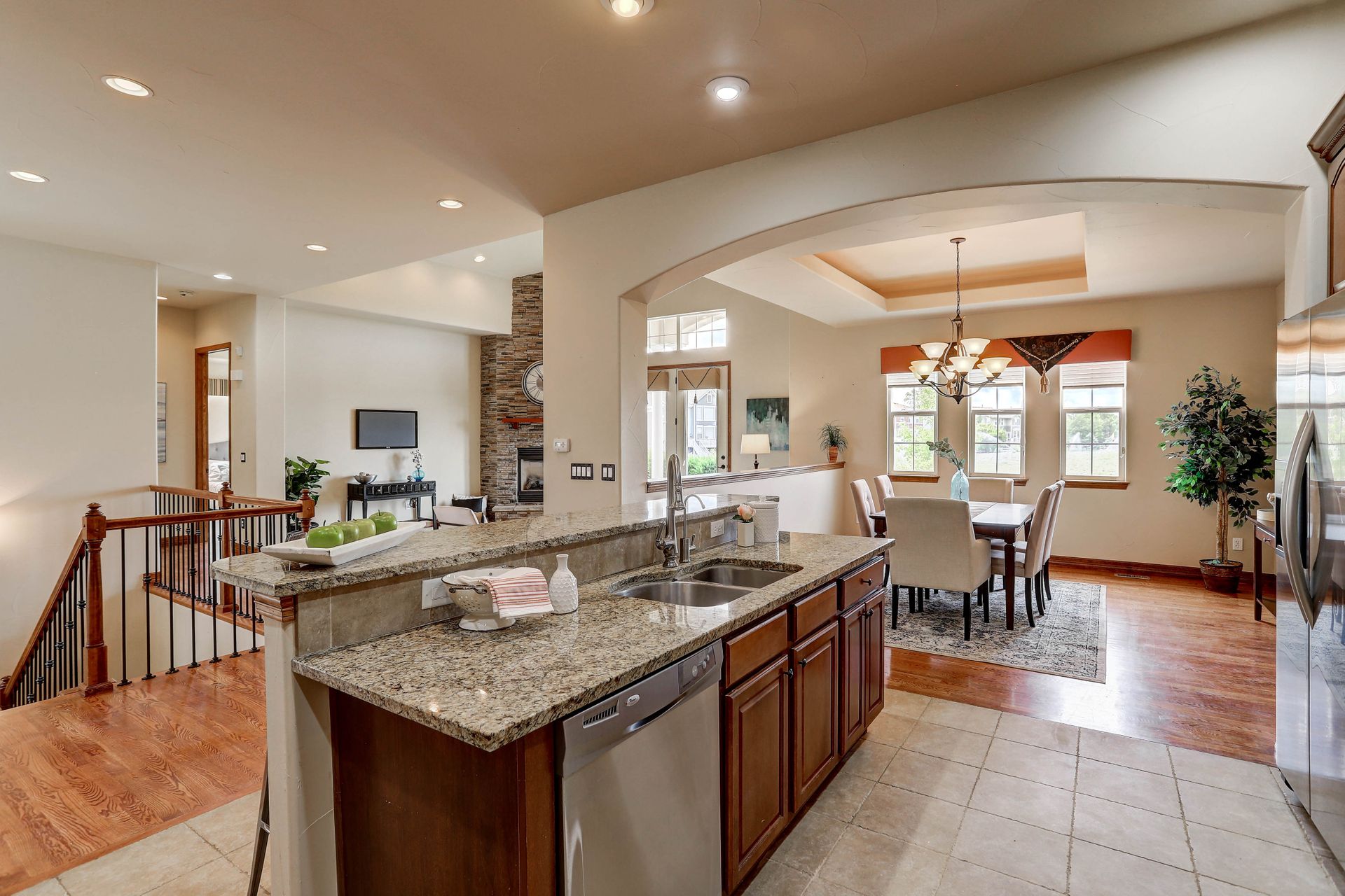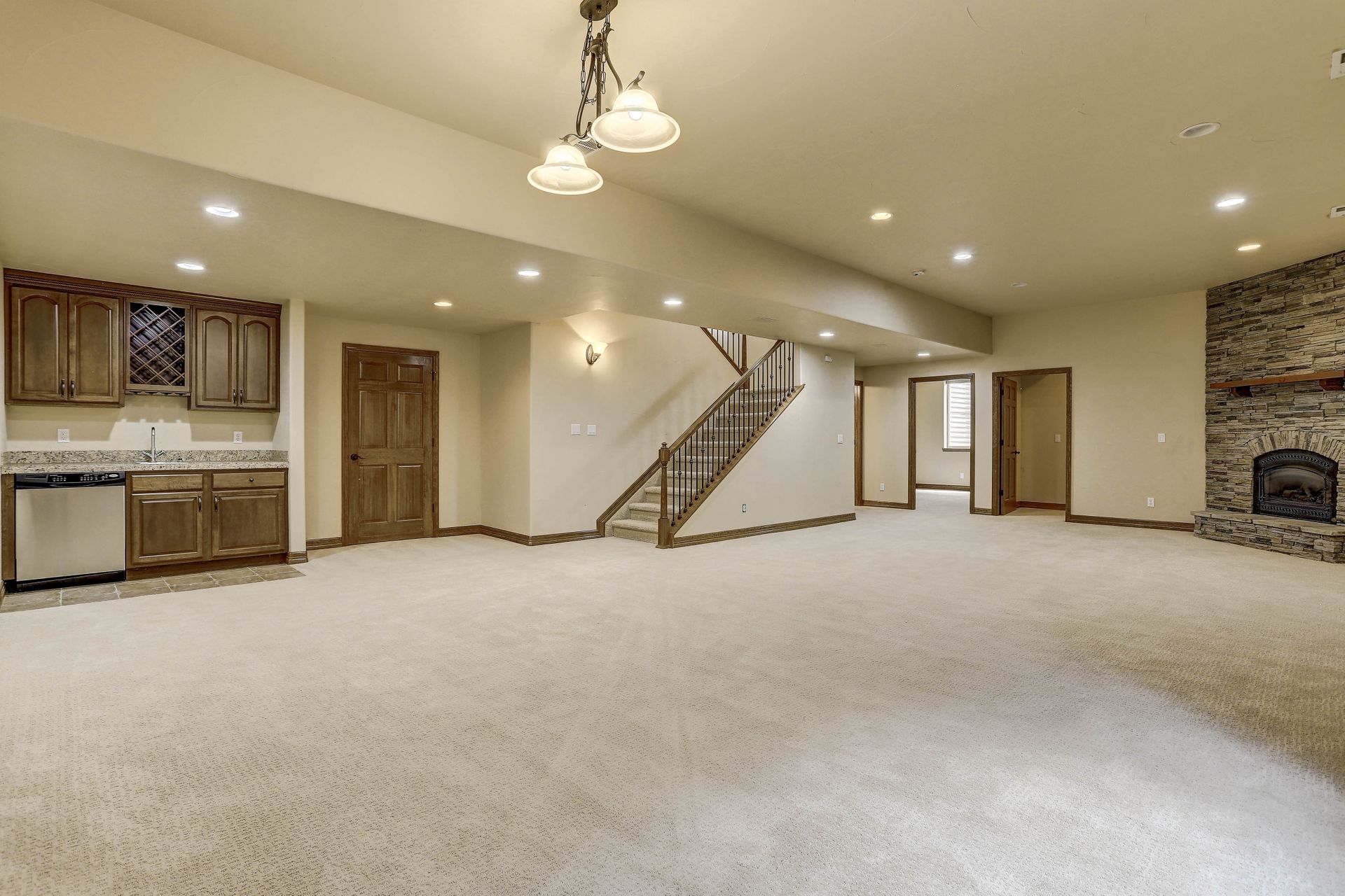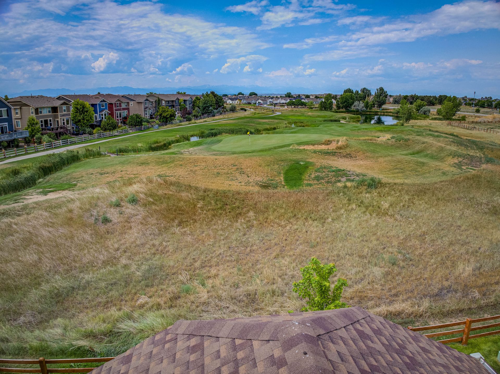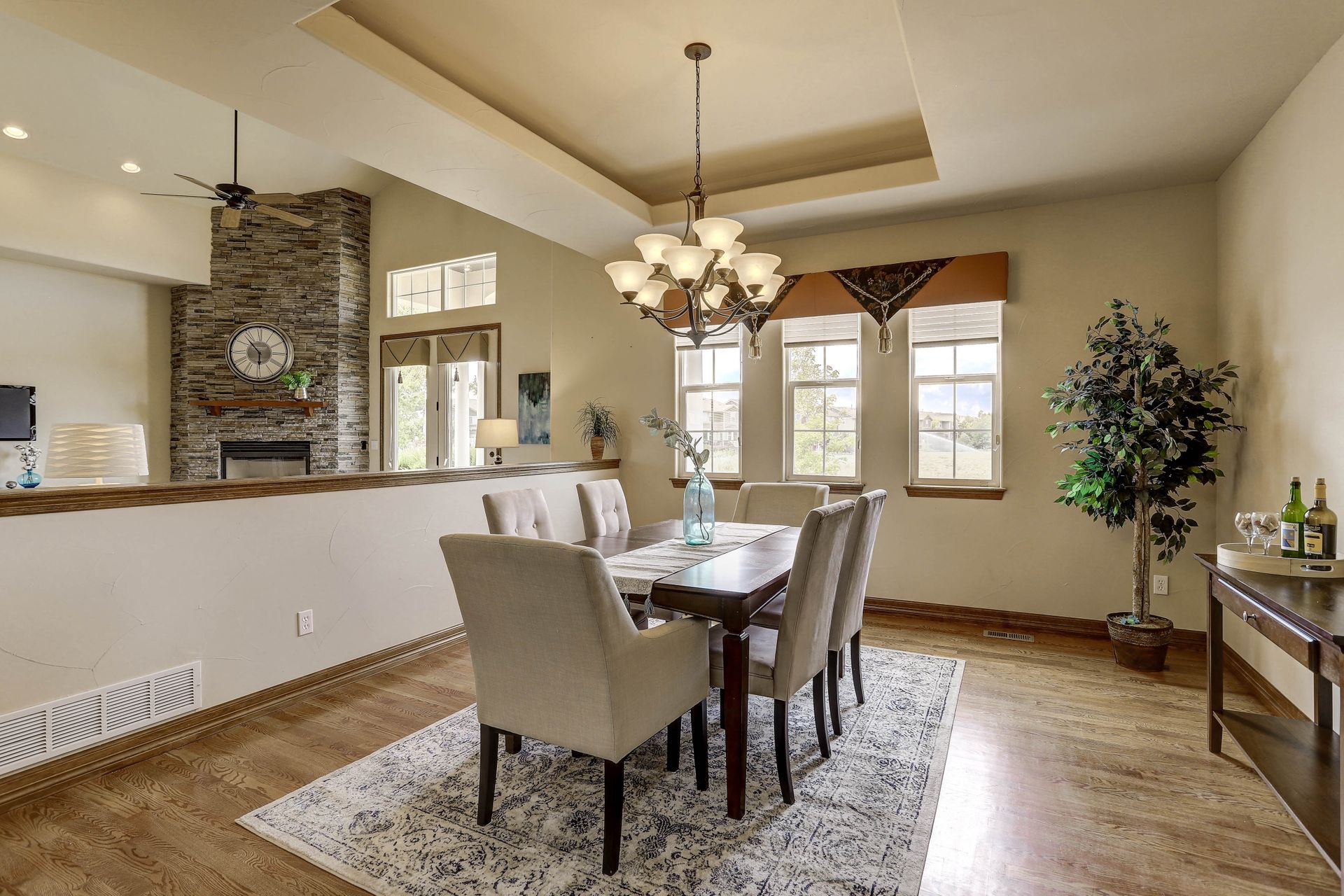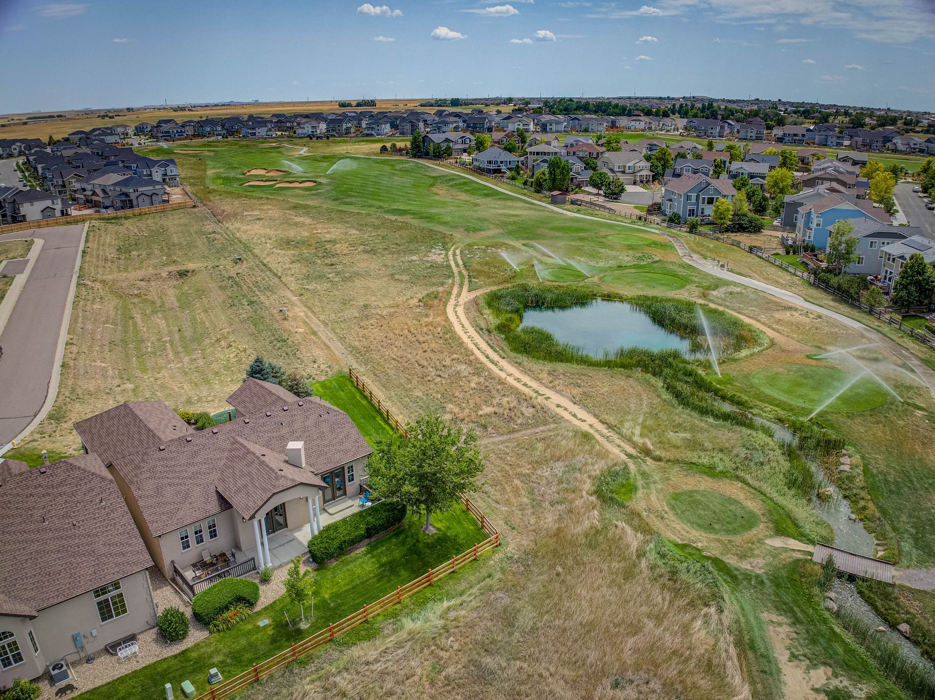 Gorgeous patio home surrounded by golf course, with over 4100 finished square feet. This beautiful home has high ceilings and an open floor plan. The kitchen hosts granite countertops with a breakfast bar, stainless steel appliances and plenty of cabinets, accented with decorative crown molding and under cabinet lighting. The living room has a stacked-stone, gas fireplace, vaulted ceilings and double glass doors leading to the patio. The spacious dining room offers a coffered ceiling and a graceful archway. The main floor primary suite also has double doors leading to the patio, a five-piece bath and a walk-in closet. The main floor also has an office and additional bedroom. The finished basement includes a family room with a fireplace and a wet bar as well as a three-fourths bath and two large bedrooms. Outside you'll find a spacious patio with views of the mountains, golf course and pond. The HOA provides exterior building maintenance, snow removal and grounds maintenance. This is a very quiet, gated community with easy highway access to I-76.