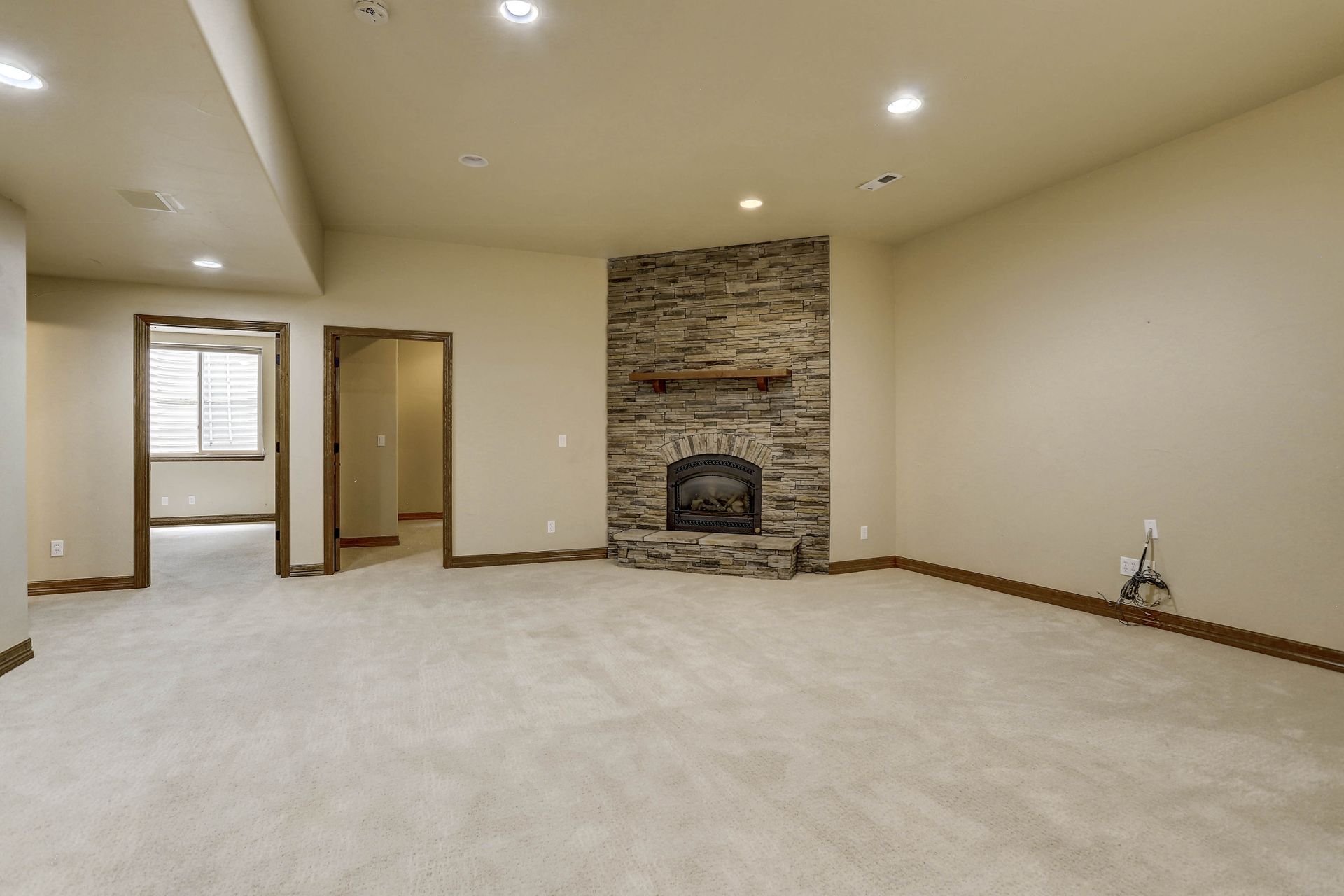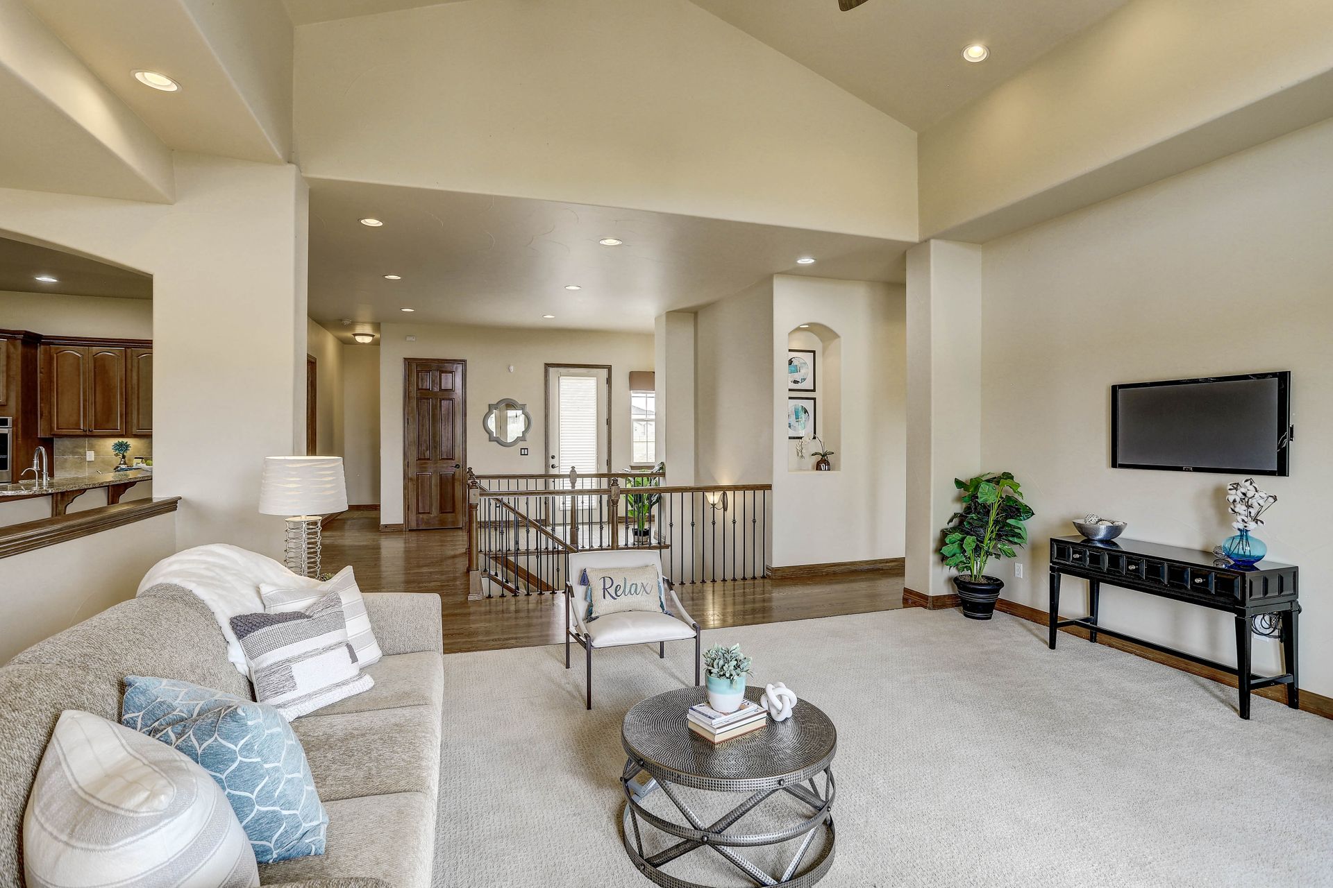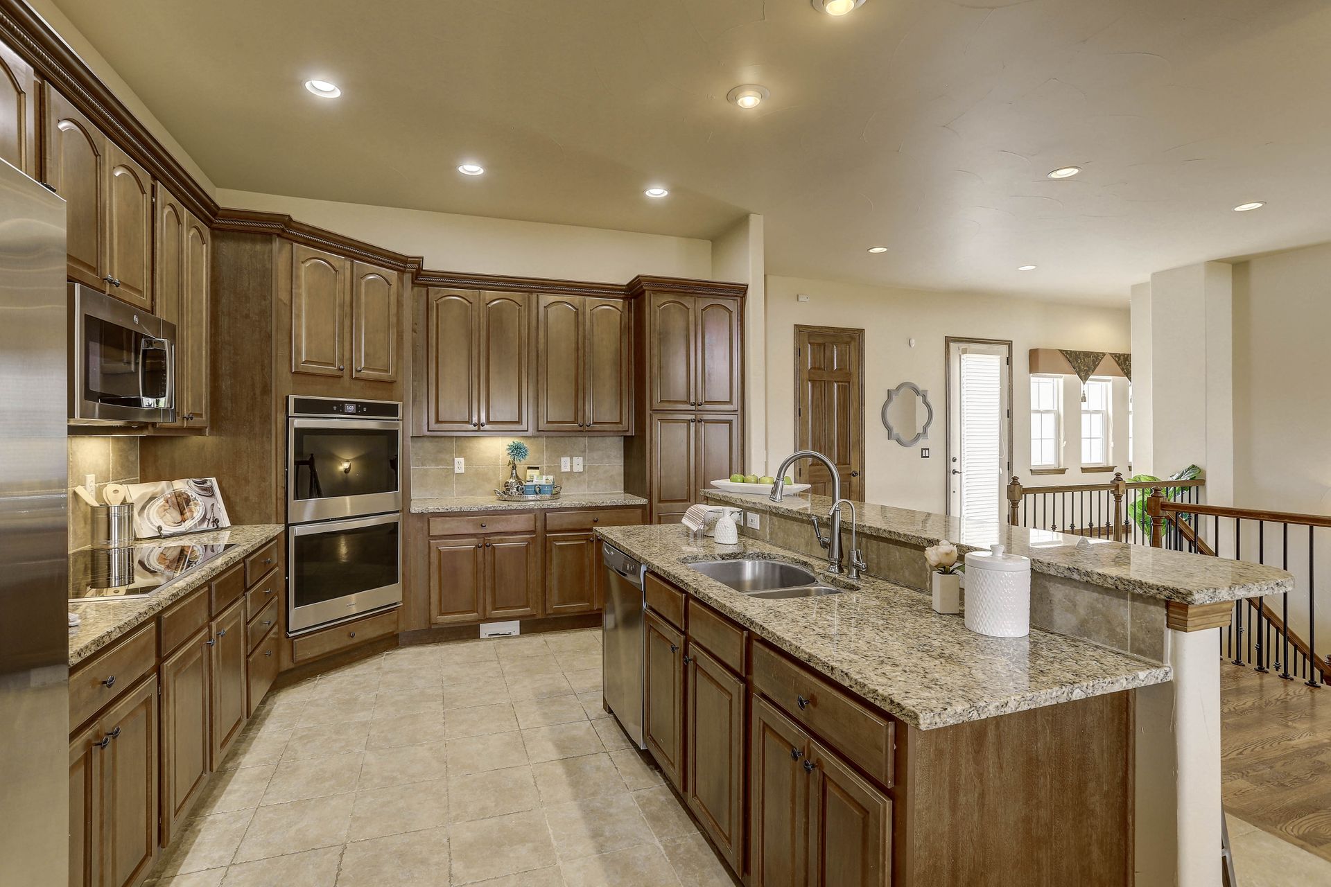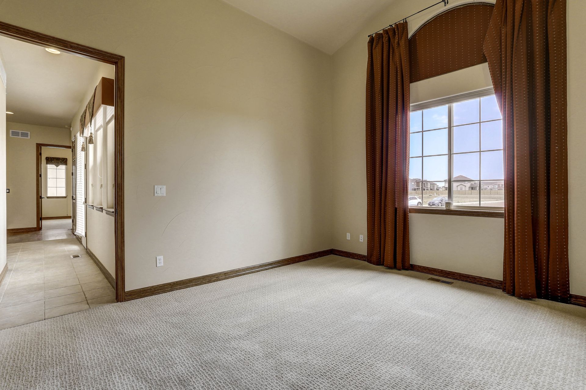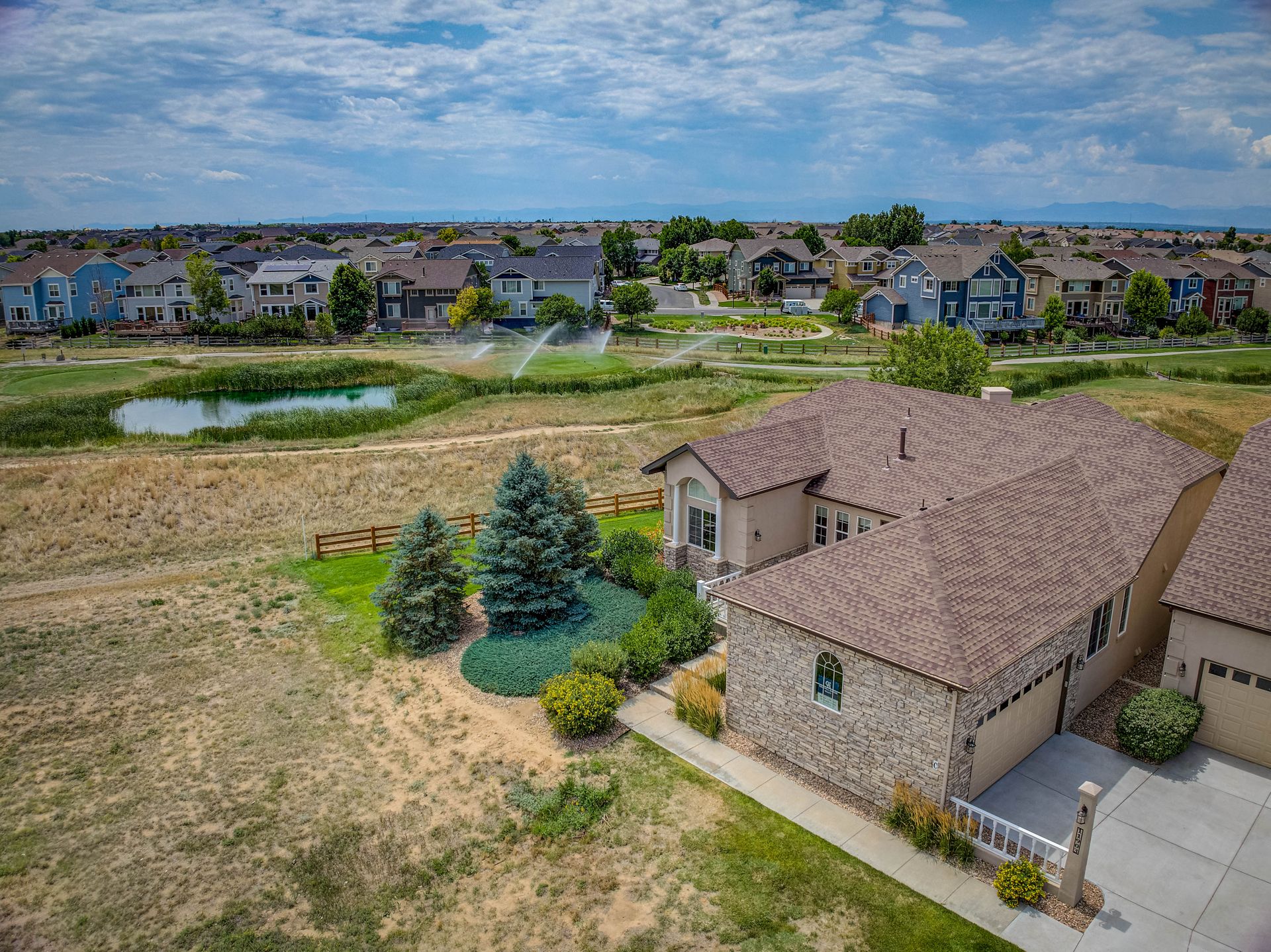 Gorgeous patio home surrounded by golf course, with over 4100 finished square feet. This beautiful home has high ceilings and an open floor plan. The kitchen hosts granite countertops with a breakfast bar, stainless steel appliances and plenty of cabinets, accented with decorative crown molding and under cabinet lighting. The living room has a stacked-stone, gas fireplace, vaulted ceilings and double glass doors leading to the patio. The spacious dining room offers a coffered ceiling and a graceful archway. The main floor primary suite also has double doors leading to the patio, a five-piece bath and a walk-in closet. The main floor also has an office and additional bedroom. The finished basement includes a family room with a fireplace and a wet bar as well as a three-fourths bath and two large bedrooms. Outside you'll find a spacious patio with views of the mountains, golf course and pond. The HOA provides exterior building maintenance, snow removal and grounds maintenance. This is a very quiet, gated community with easy highway access to I-76.