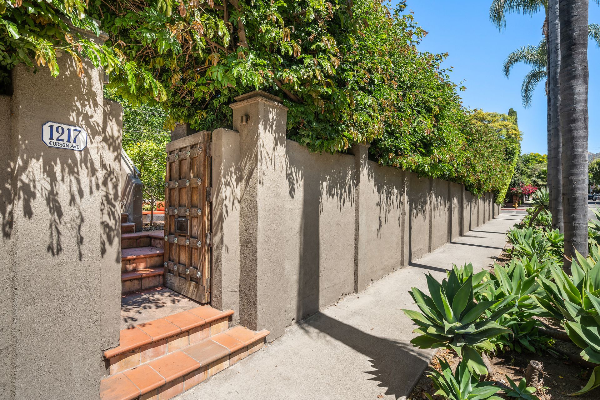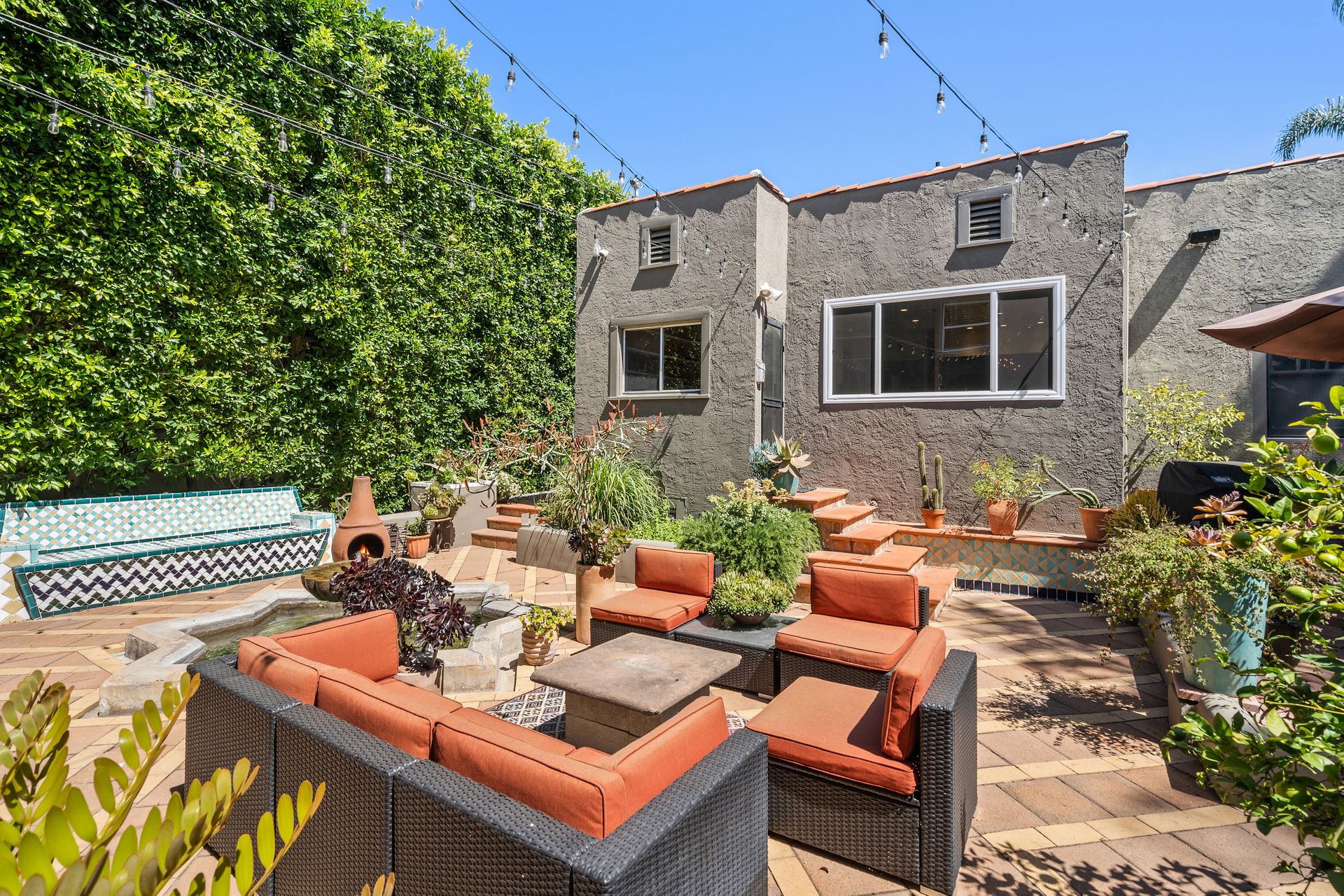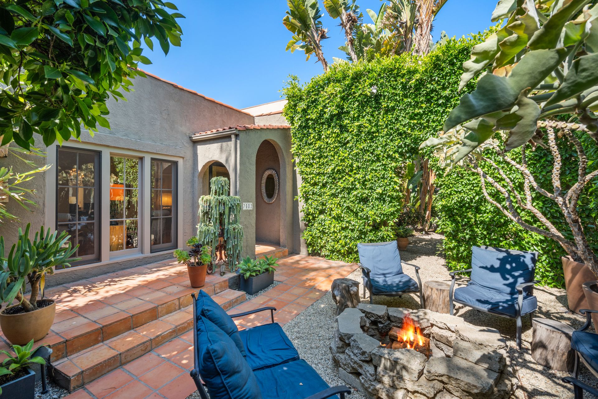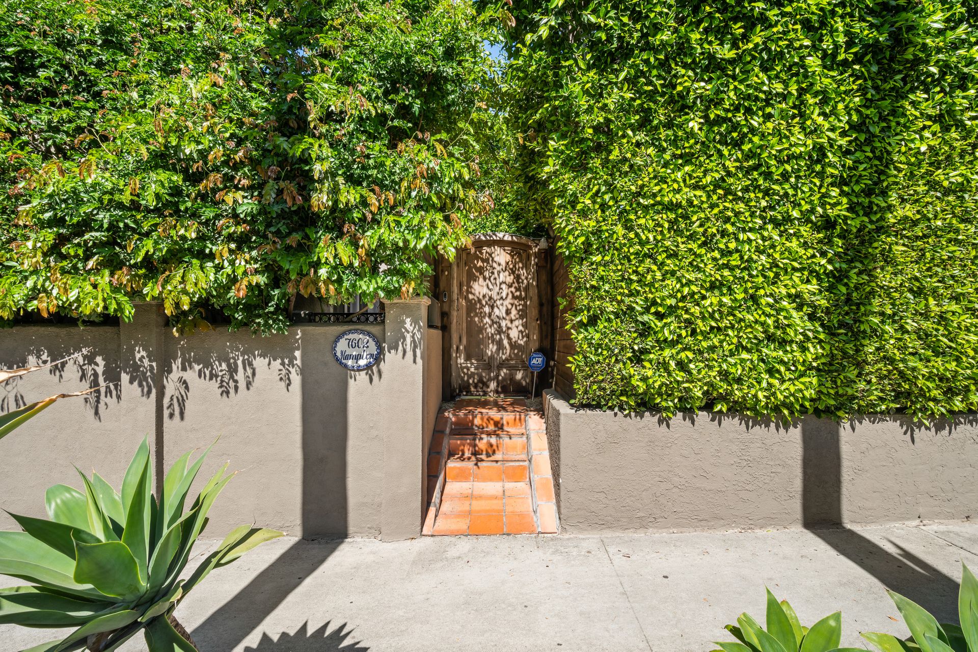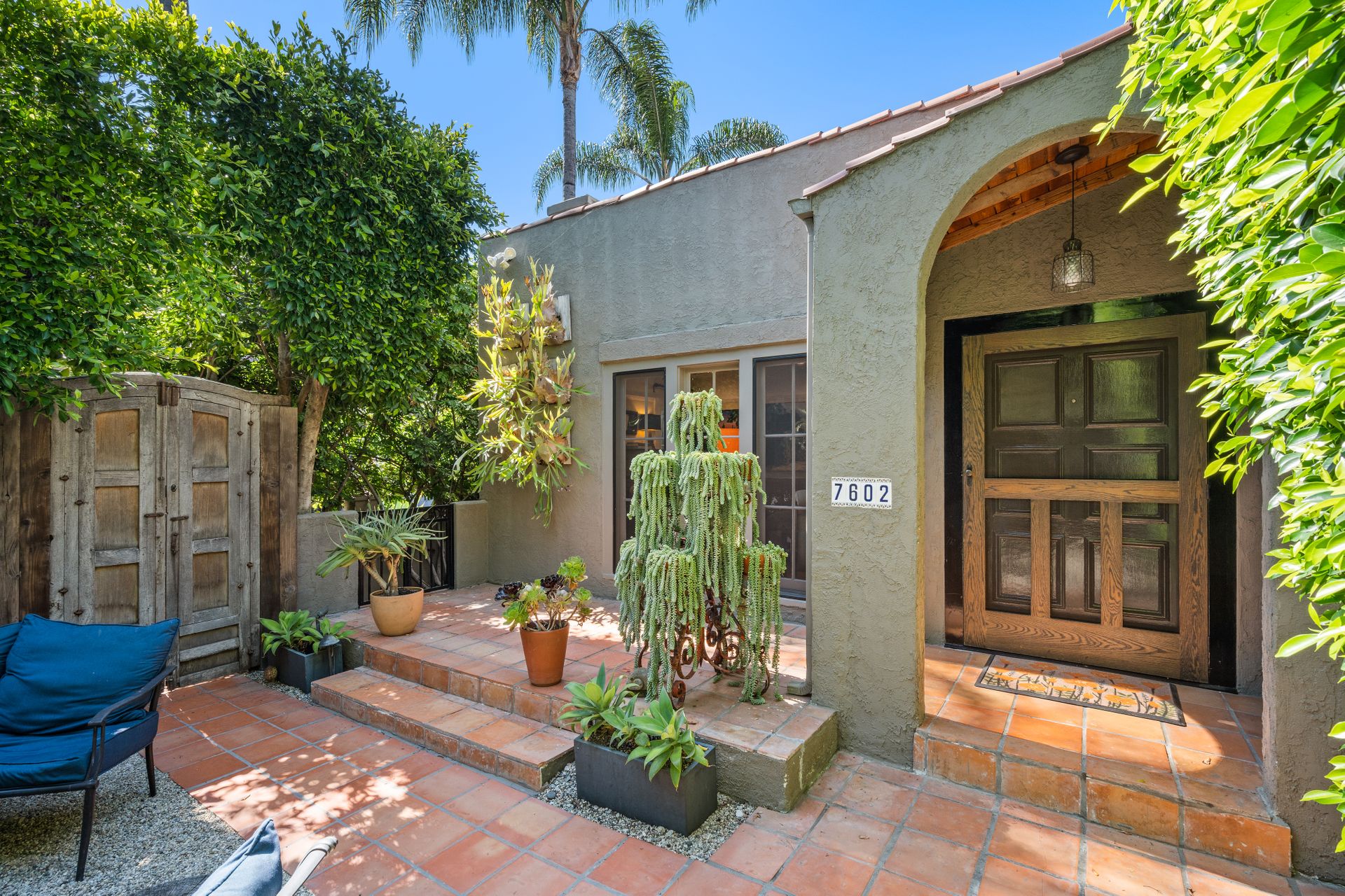 Enchanting compound featuring an impeccably updated character home plus two apartment units in a hedged and gated oasis. The charming owner's bungalow has its own address 7602 Hampton Avenue with three bedrooms and two baths plus a den. The true professional kitchen has recently been recently redone retaining original Douglas Fir flooring and offers superior appliances including a Wolf range and Bosch dishwasher. There is a private front yard and two gated entries. The common area includes a lush Moroccan inspired patio and a fountain for entertaining. The two detached apartments are configured as follows: Unit A is a ground level one bedroom, one bath with a living room and courtyard with a fountain. Unit B is upstairs and has two bedrooms, one bath, laundry, central AC/heat and a nice kitchen with a dishwasher. There is a two car garage with an opener and driveway parking. A solar system (owned not leased) serves the main house. Drought tolerant specimen succulents, fountains and hedges complete the picture. Seismic updates undertaken preemptively by the owner include foundation bolting to the main house and recent soft-story retrofit. This trophy property shows impeccable pride of ownership.