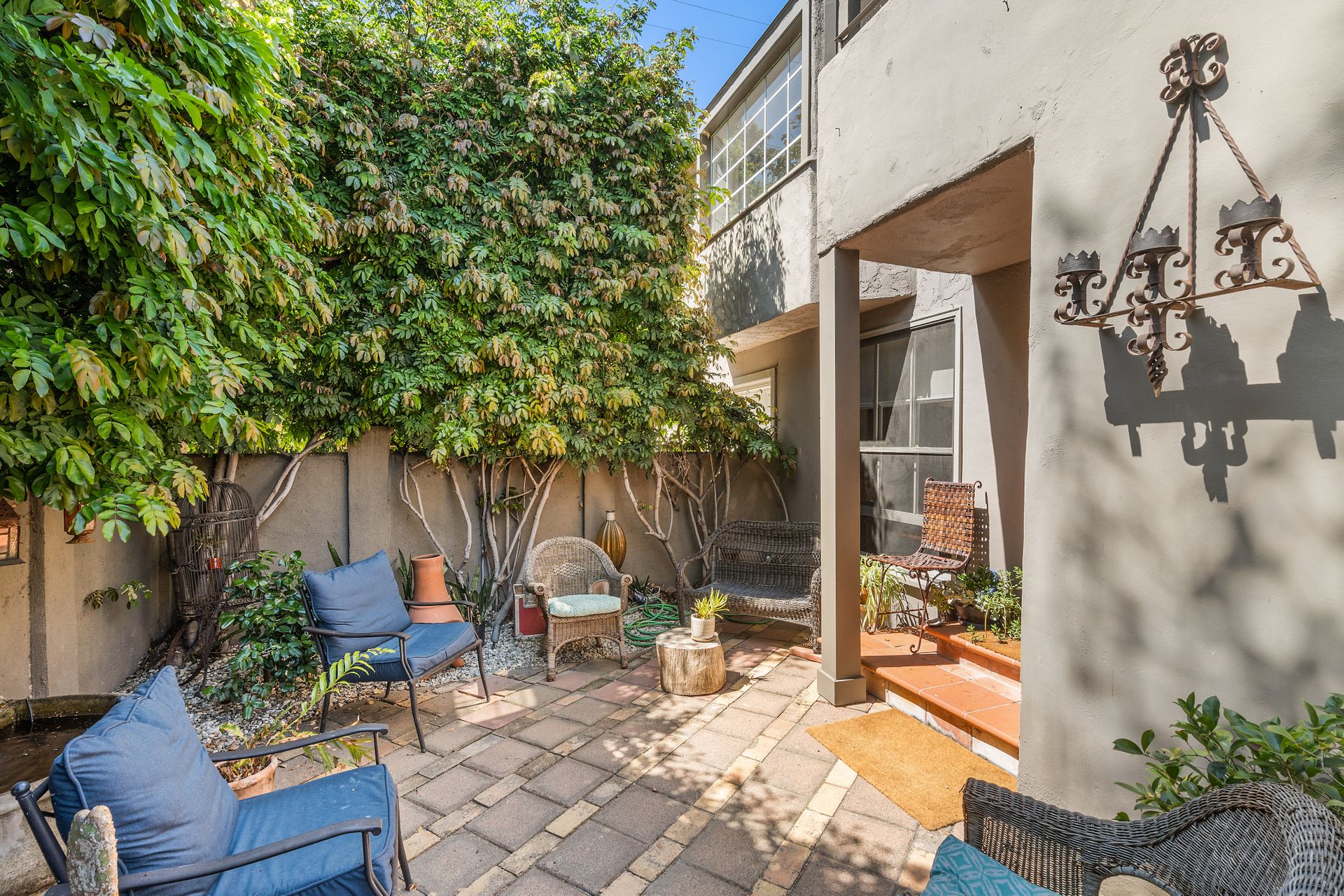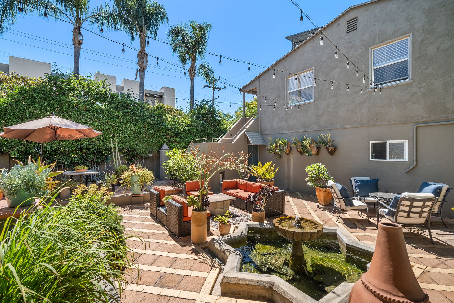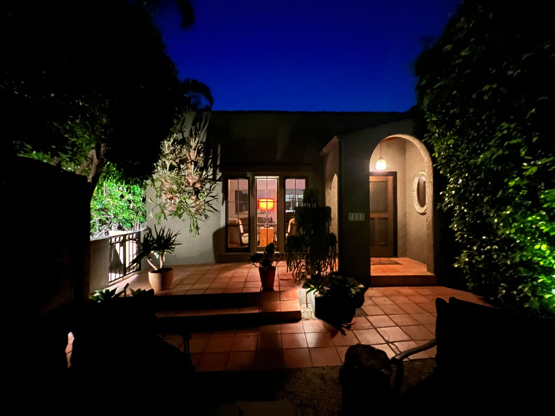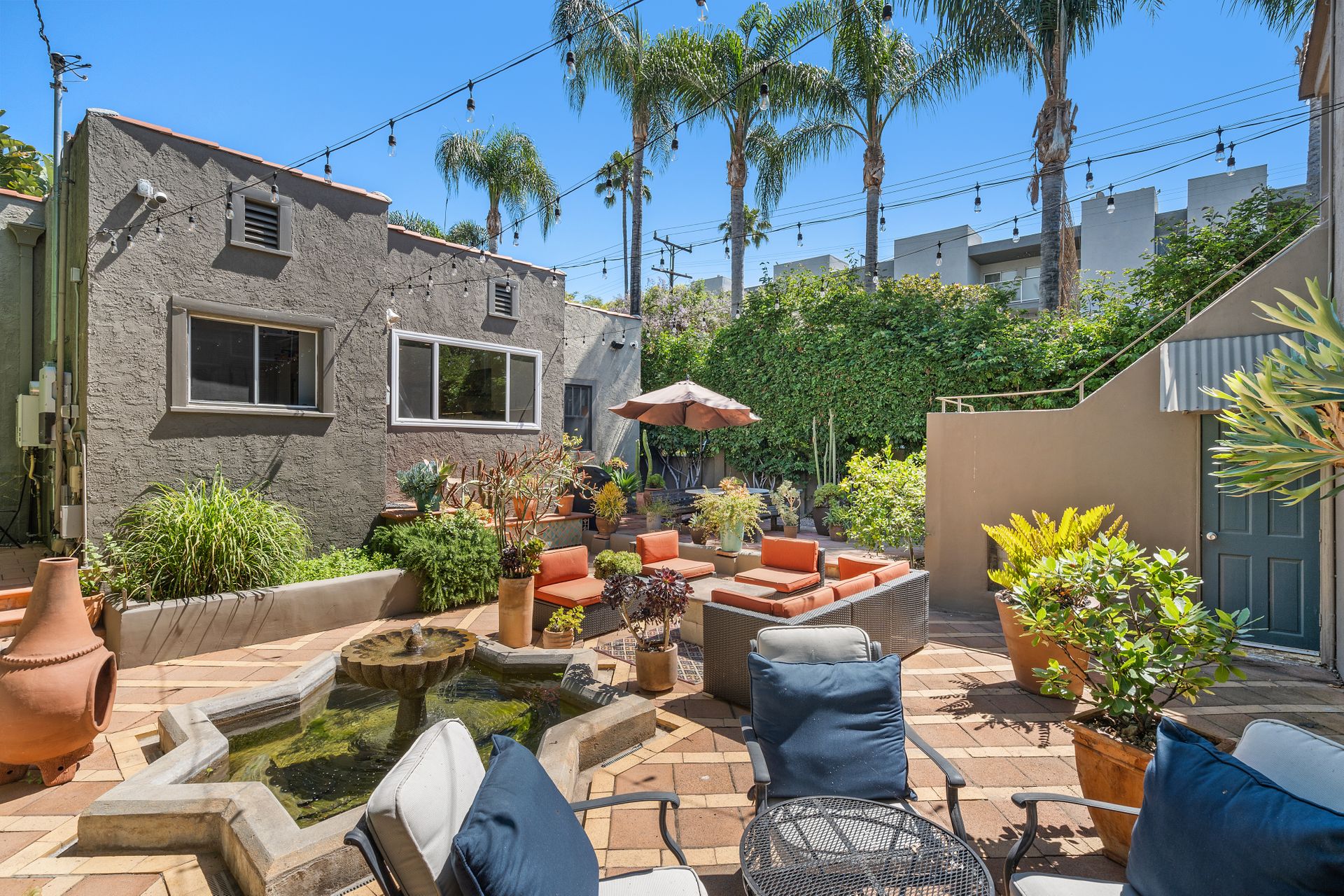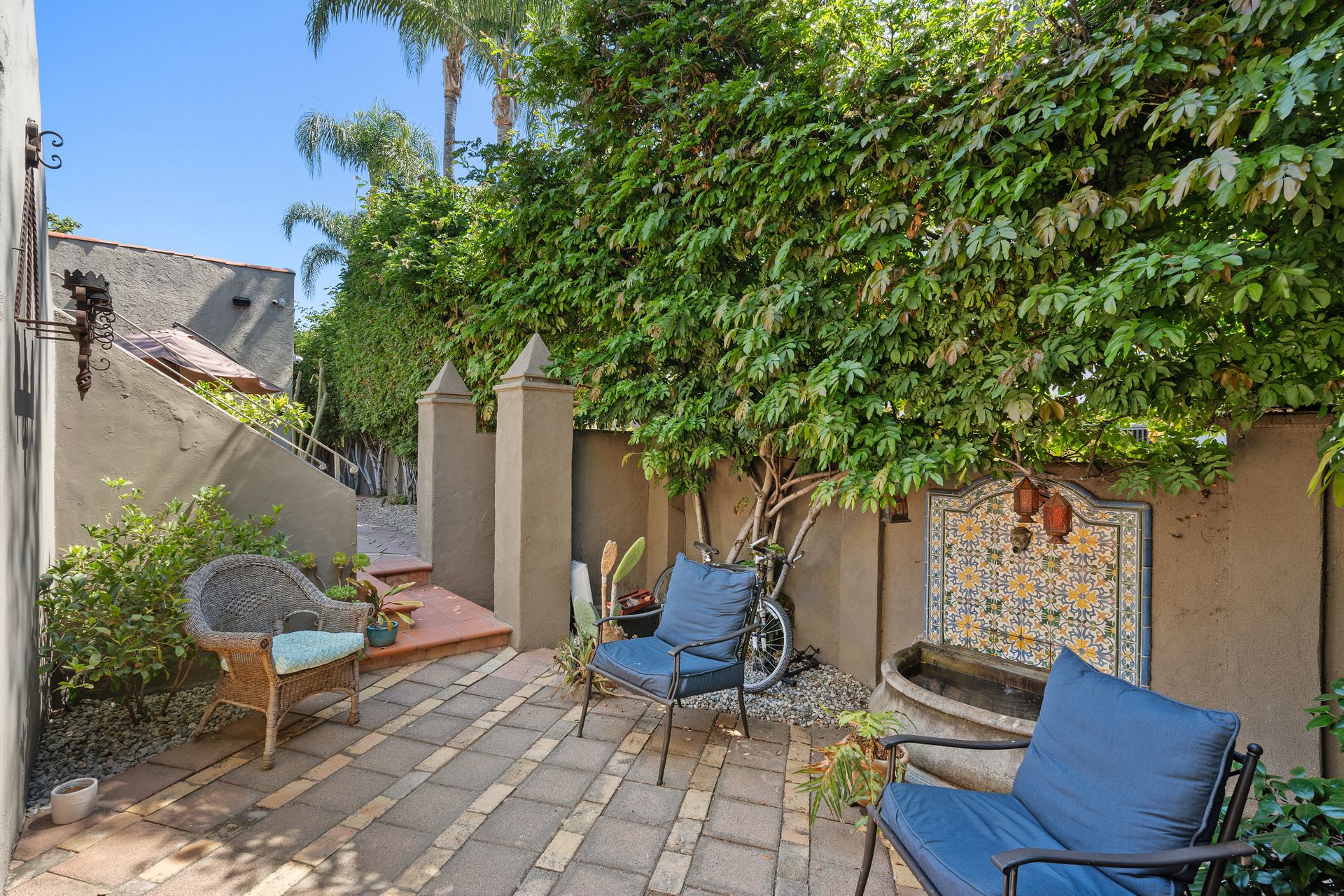 Enchanting compound featuring an impeccably updated character home plus two apartment units in a hedged and gated oasis. The charming owner's bungalow has its own address 7602 Hampton Avenue with three bedrooms and two baths plus a den. The true professional kitchen has recently been recently redone retaining original Douglas Fir flooring and offers superior appliances including a Wolf range and Bosch dishwasher. There is a private front yard and two gated entries. The common area includes a lush Moroccan inspired patio and a fountain for entertaining. The two detached apartments are configured as follows: Unit A is a ground level one bedroom, one bath with a living room and courtyard with a fountain. Unit B is upstairs and has two bedrooms, one bath, laundry, central AC/heat and a nice kitchen with a dishwasher. There is a two car garage with an opener and driveway parking. A solar system (owned not leased) serves the main house. Drought tolerant specimen succulents, fountains and hedges complete the picture. Seismic updates undertaken preemptively by the owner include foundation bolting to the main house and recent soft-story retrofit. This trophy property shows impeccable pride of ownership.