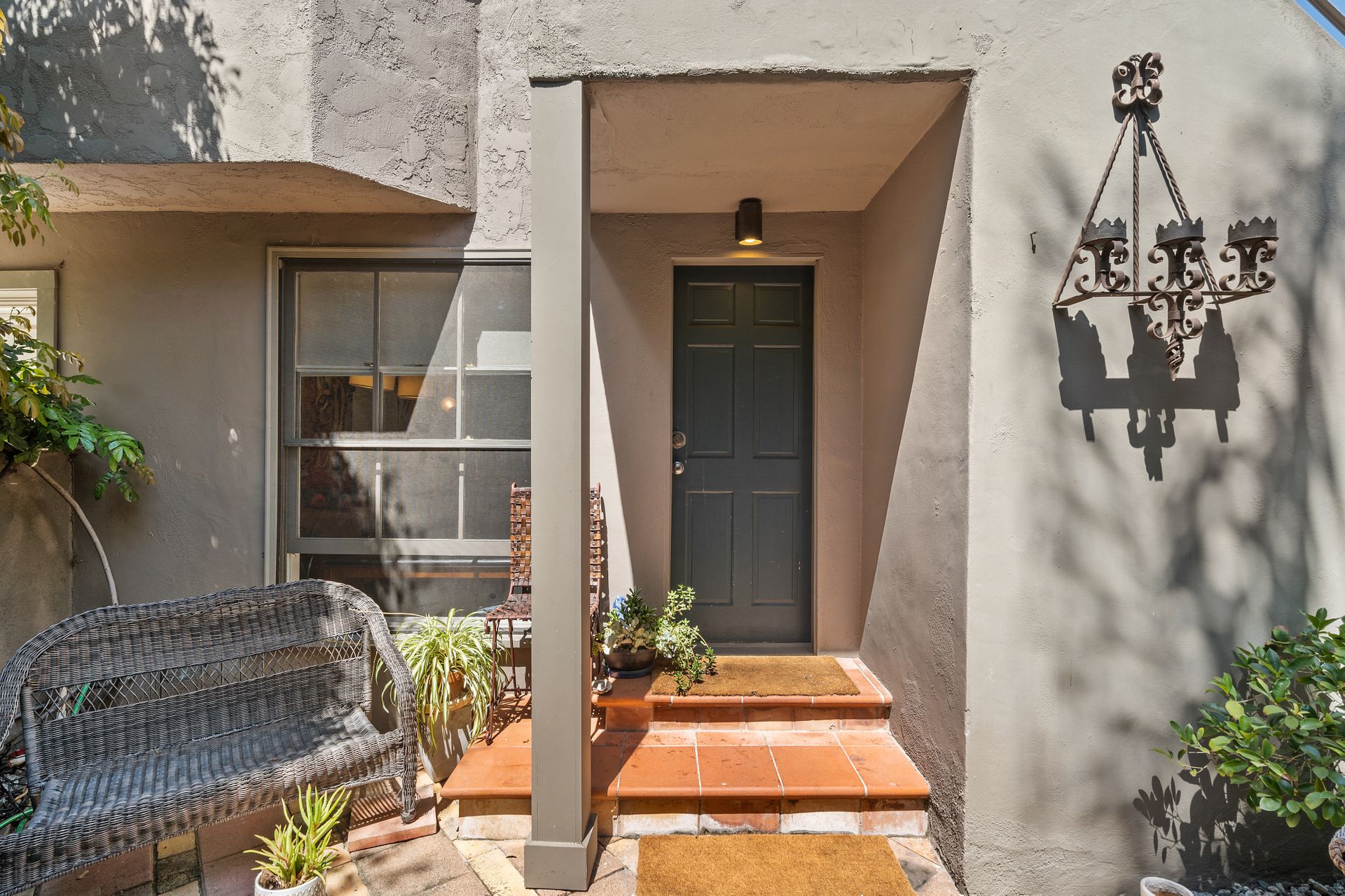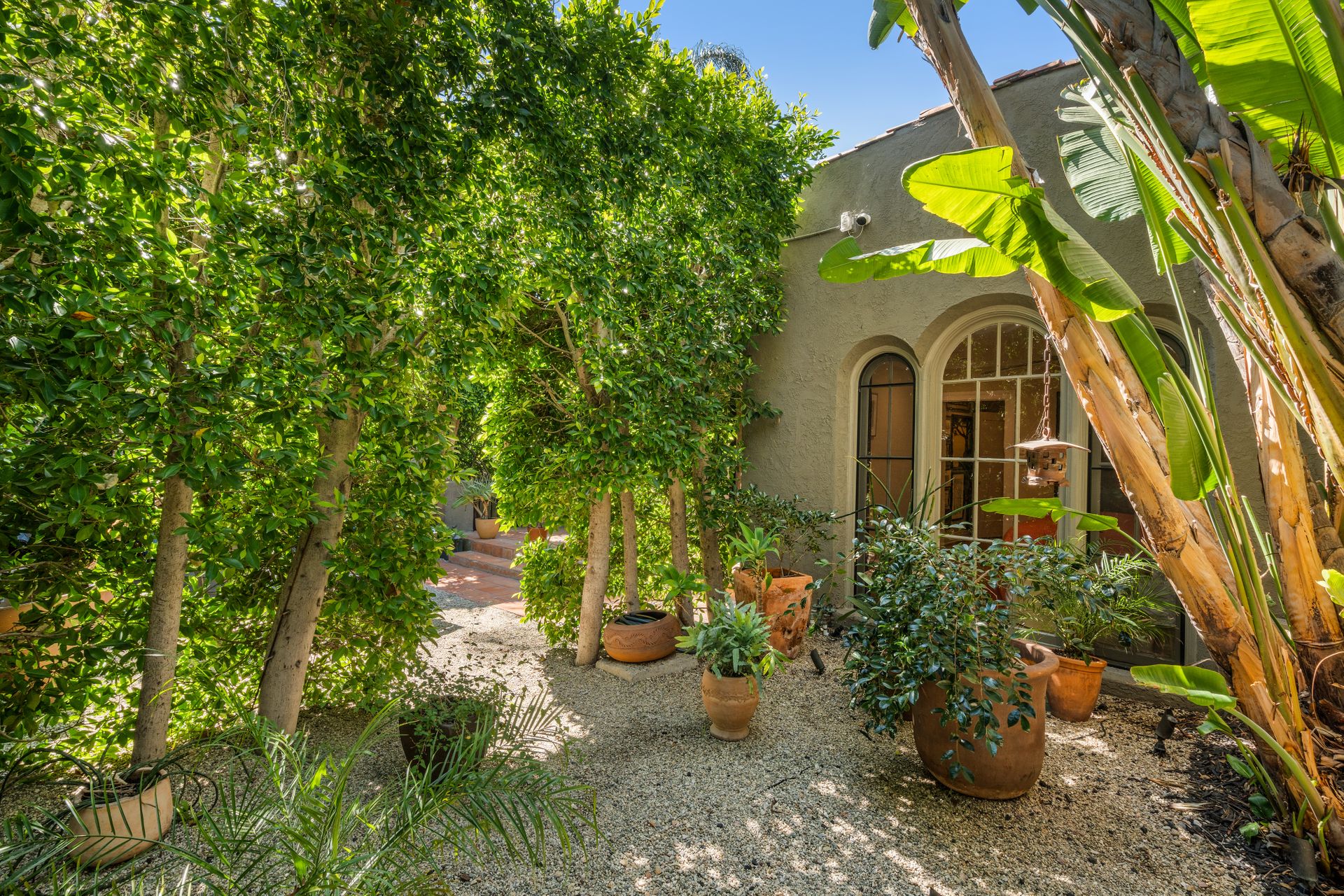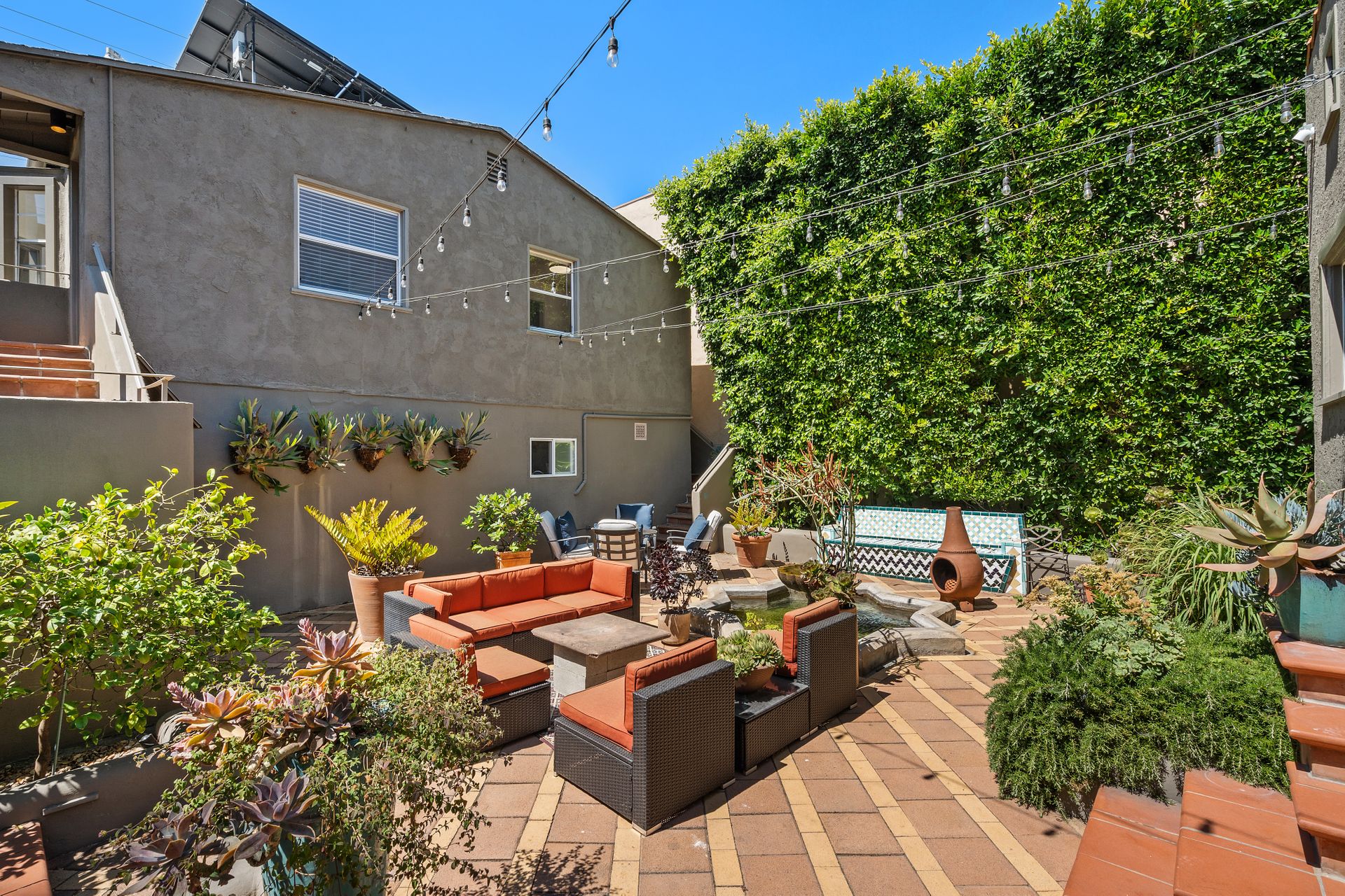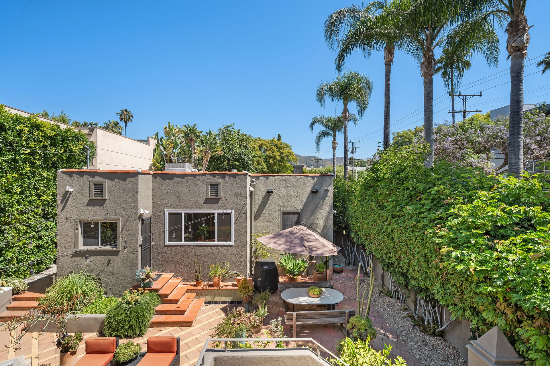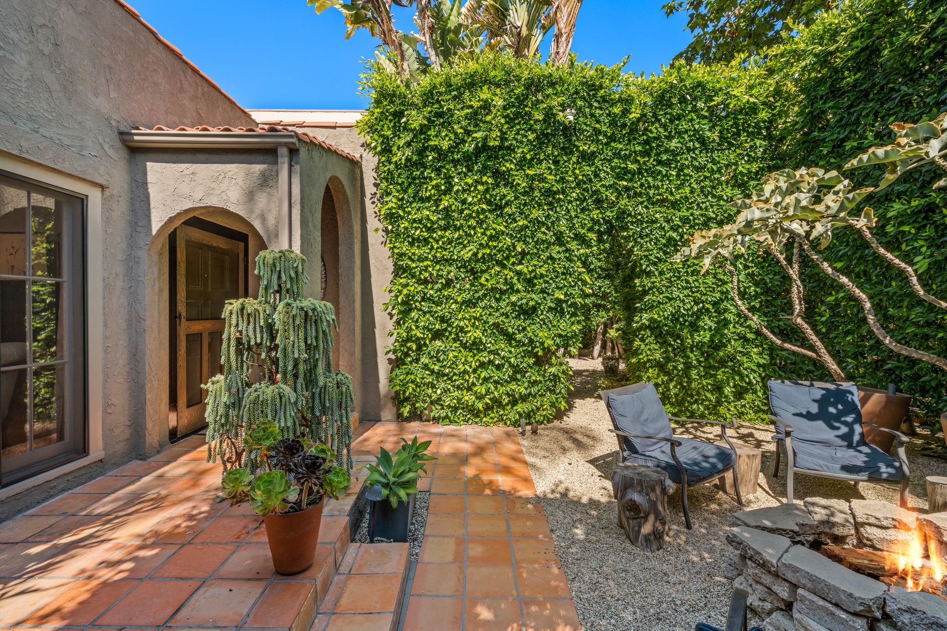 Enchanting compound featuring an impeccably updated character home plus two apartment units in a hedged and gated oasis. The charming owner's bungalow has its own address 7602 Hampton Avenue with three bedrooms and two baths plus a den. The true professional kitchen has recently been recently redone retaining original Douglas Fir flooring and offers superior appliances including a Wolf range and Bosch dishwasher. There is a private front yard and two gated entries. The common area includes a lush Moroccan inspired patio and a fountain for entertaining. The two detached apartments are configured as follows: Unit A is a ground level one bedroom, one bath with a living room and courtyard with a fountain. Unit B is upstairs and has two bedrooms, one bath, laundry, central AC/heat and a nice kitchen with a dishwasher. There is a two car garage with an opener and driveway parking. A solar system (owned not leased) serves the main house. Drought tolerant specimen succulents, fountains and hedges complete the picture. Seismic updates undertaken preemptively by the owner include foundation bolting to the main house and recent soft-story retrofit. This trophy property shows impeccable pride of ownership.