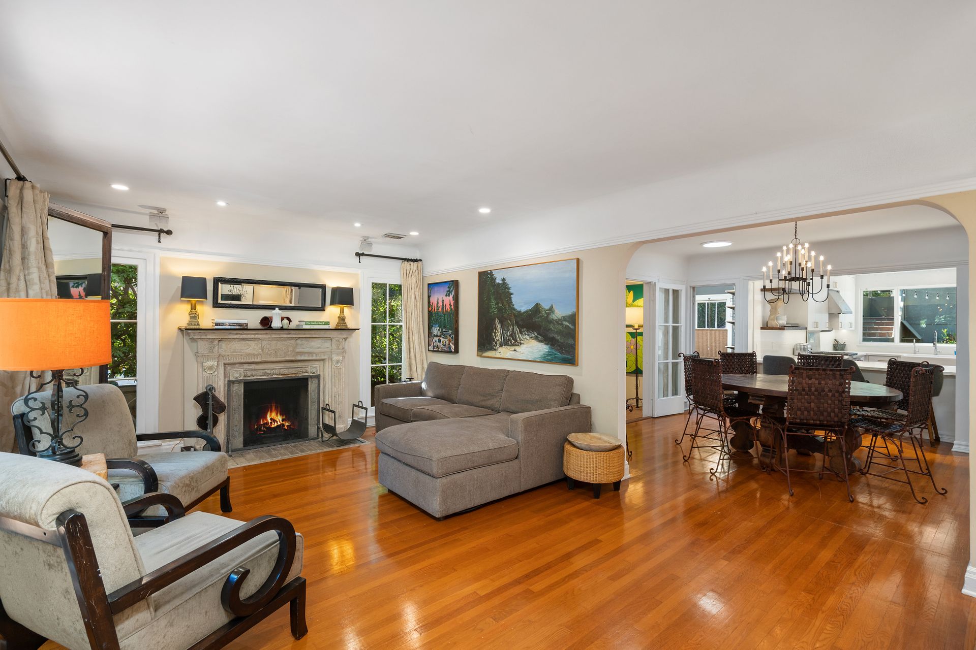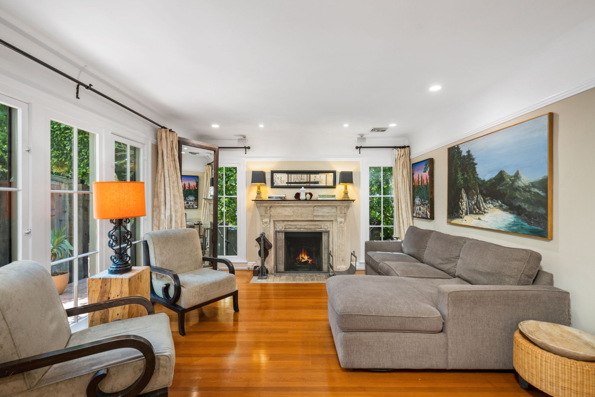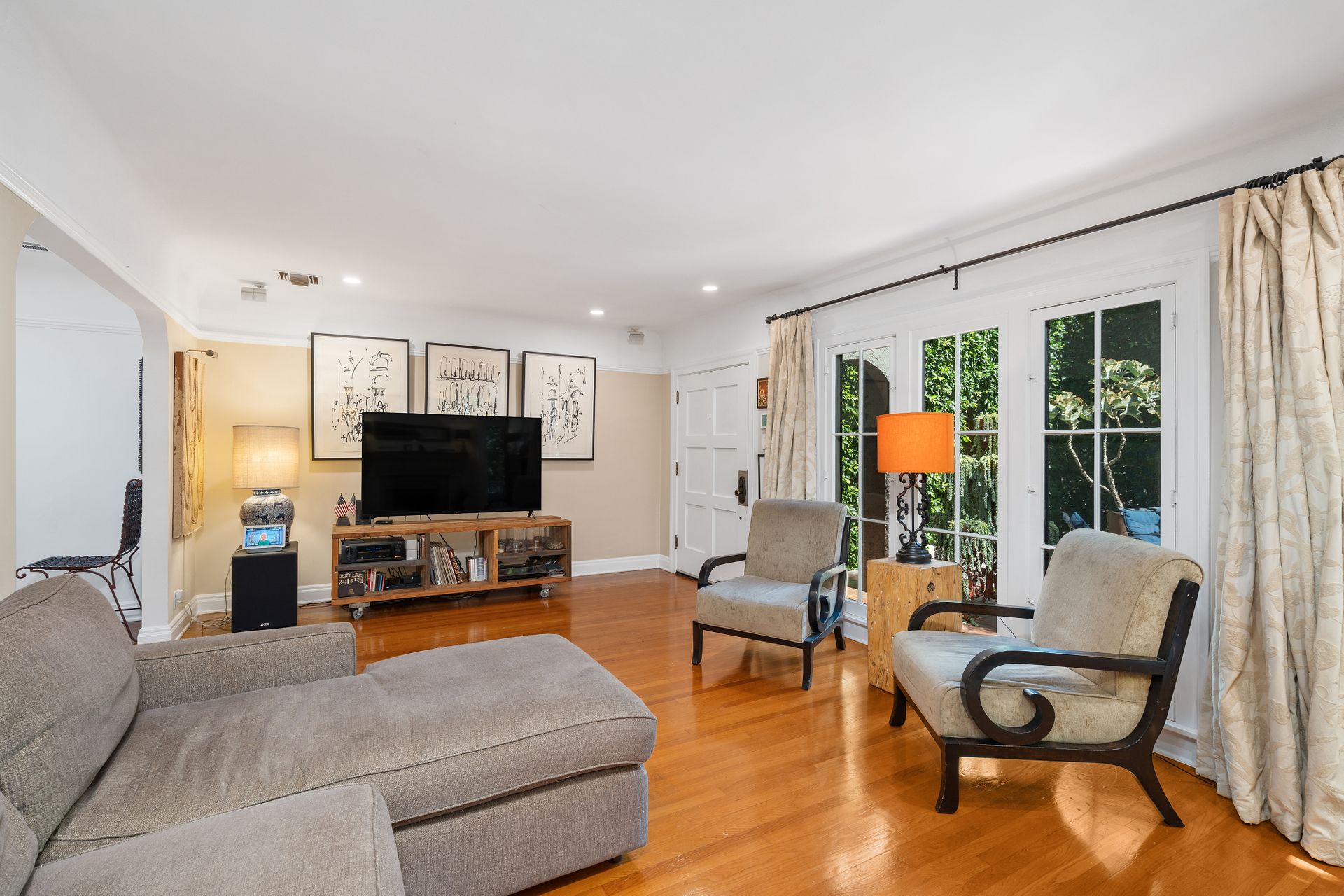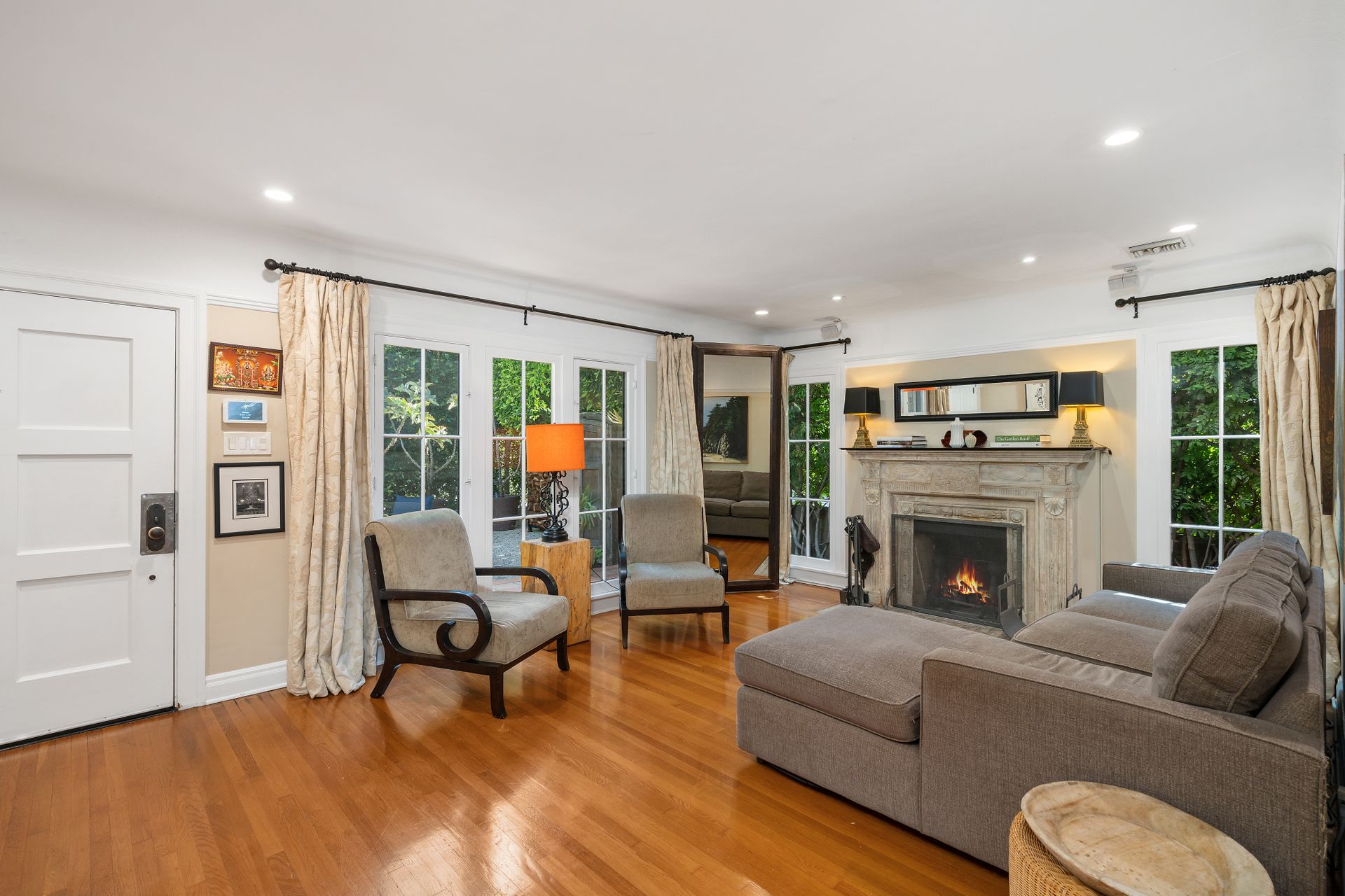 Enchanting compound featuring an impeccably updated character home plus two apartment units in a hedged and gated oasis. The charming owner's bungalow has its own address 7602 Hampton Avenue with three bedrooms and two baths plus a den. The true professional kitchen has recently been recently redone retaining original Douglas Fir flooring and offers superior appliances including a Wolf range and Bosch dishwasher. There is a private front yard and two gated entries. The common area includes a lush Moroccan inspired patio and a fountain for entertaining. The two detached apartments are configured as follows: Unit A is a ground level one bedroom, one bath with a living room and courtyard with a fountain. Unit B is upstairs and has two bedrooms, one bath, laundry, central AC/heat and a nice kitchen with a dishwasher. There is a two car garage with an opener and driveway parking. A solar system (owned not leased) serves the main house. Drought tolerant specimen succulents, fountains and hedges complete the picture. Seismic updates undertaken preemptively by the owner include foundation bolting to the main house and recent soft-story retrofit. This trophy property shows impeccable pride of ownership.