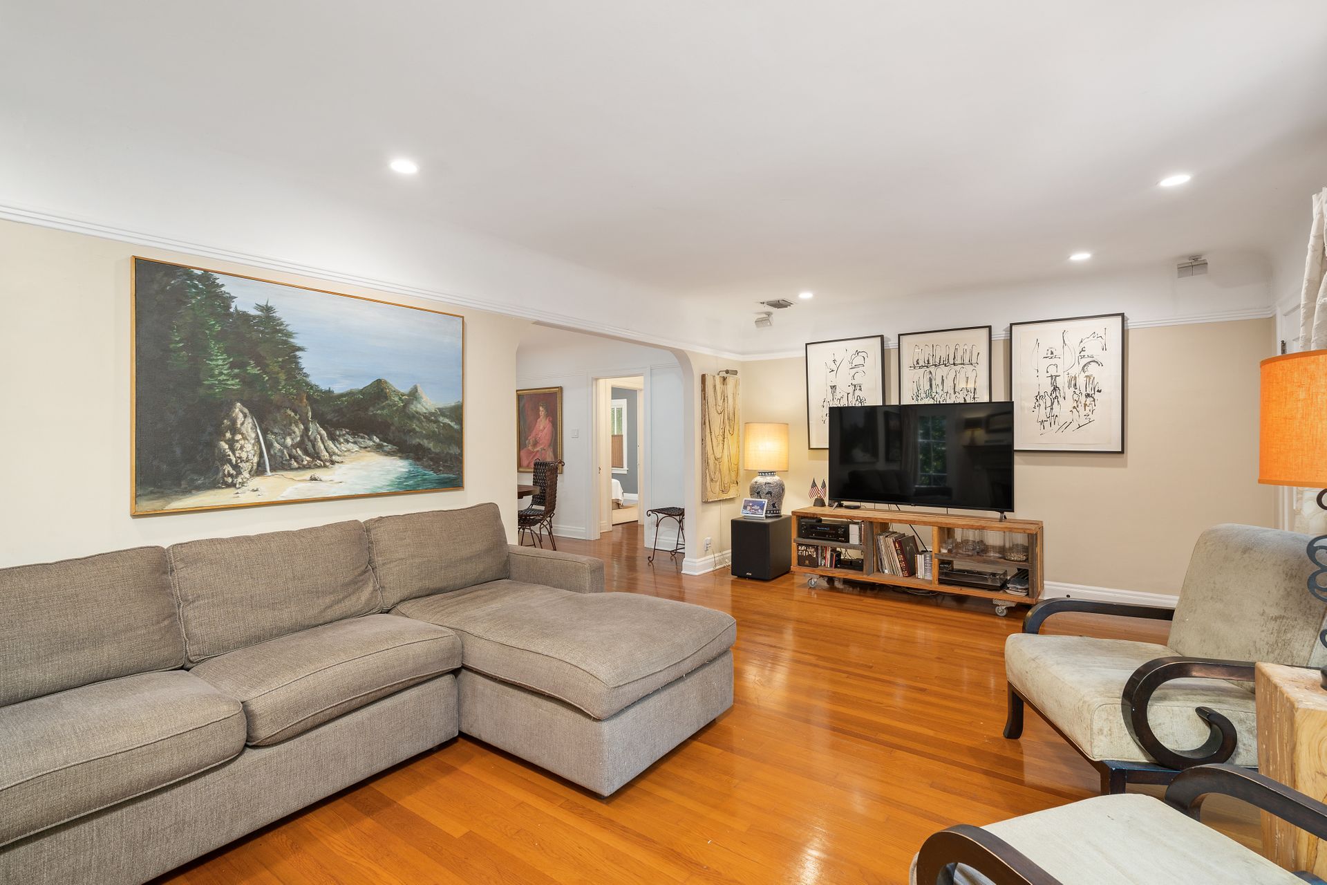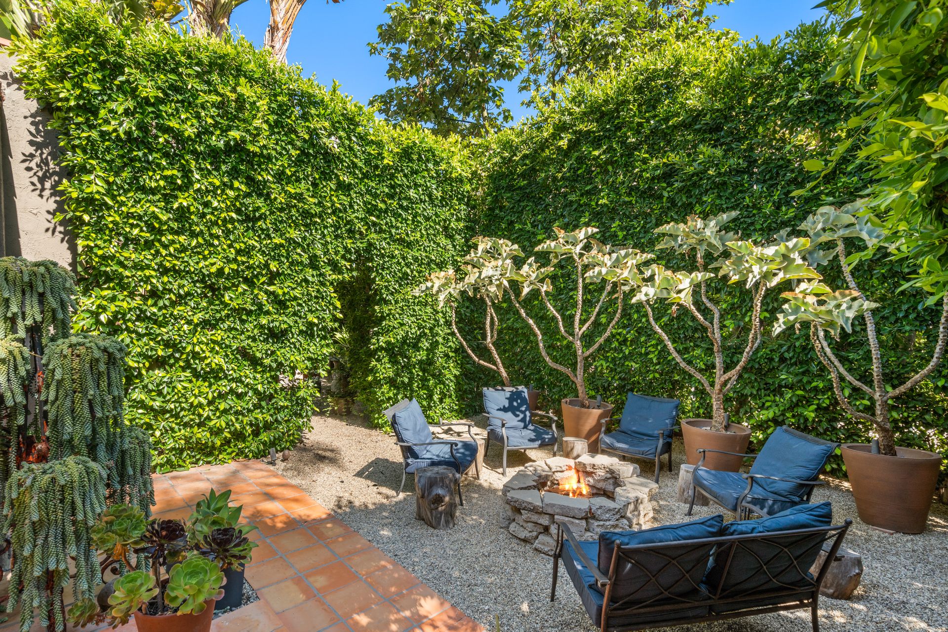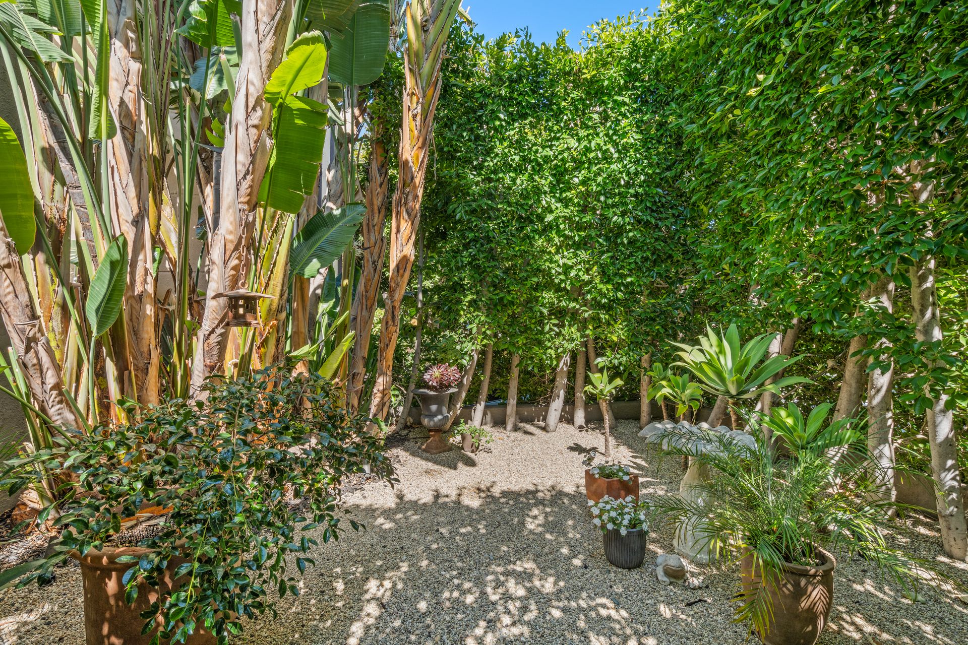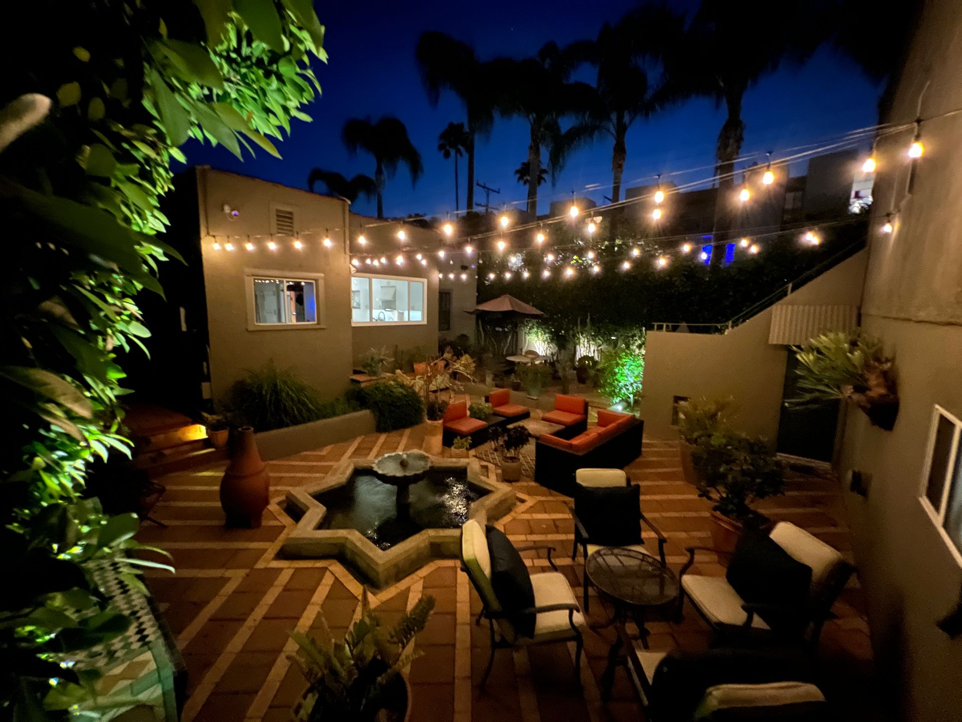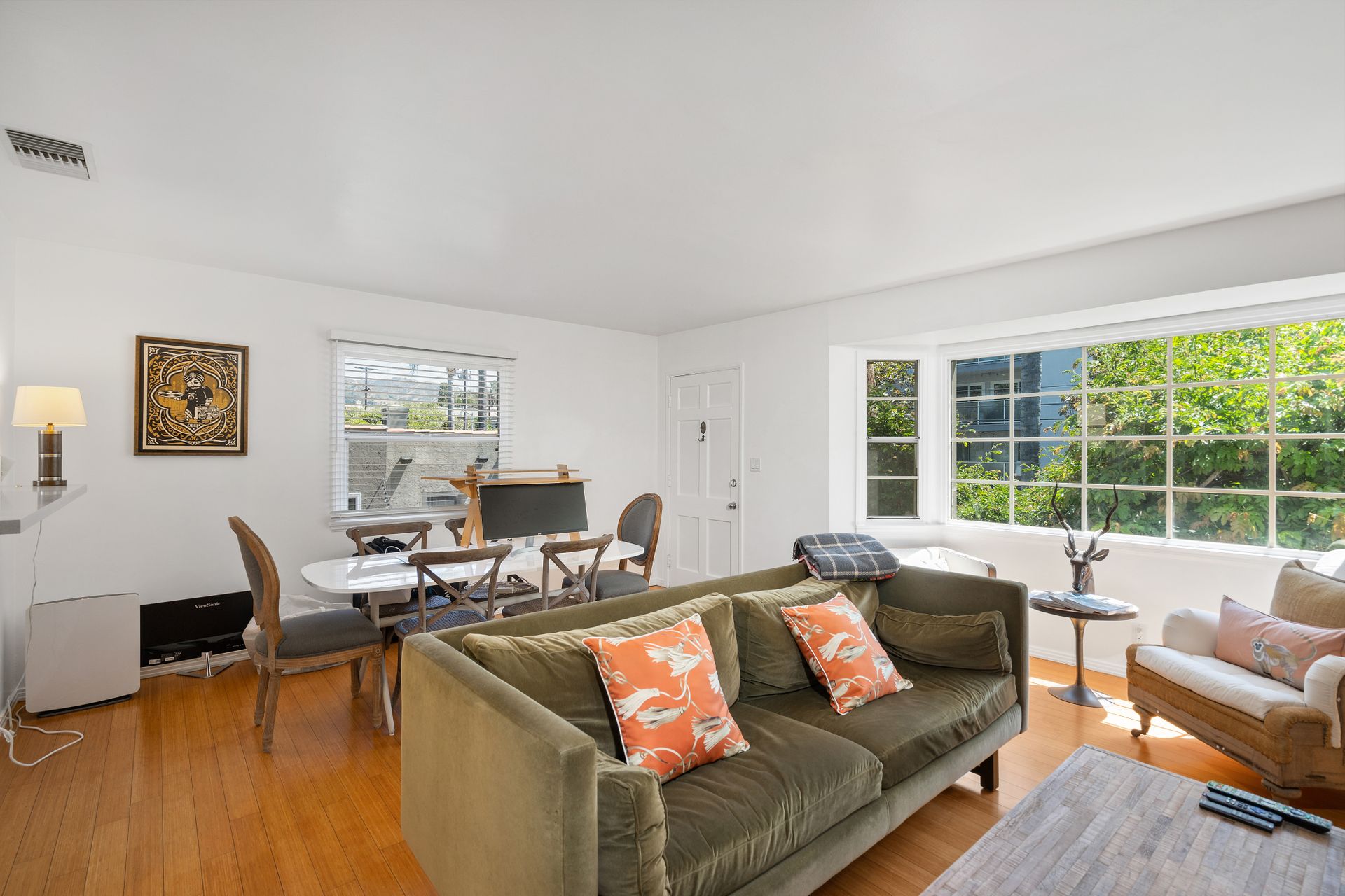 Enchanting compound featuring an impeccably updated character home plus two apartment units in a hedged and gated oasis. The charming owner's bungalow has its own address 7602 Hampton Avenue with three bedrooms and two baths plus a den. The true professional kitchen has recently been recently redone retaining original Douglas Fir flooring and offers superior appliances including a Wolf range and Bosch dishwasher. There is a private front yard and two gated entries. The common area includes a lush Moroccan inspired patio and a fountain for entertaining. The two detached apartments are configured as follows: Unit A is a ground level one bedroom, one bath with a living room and courtyard with a fountain. Unit B is upstairs and has two bedrooms, one bath, laundry, central AC/heat and a nice kitchen with a dishwasher. There is a two car garage with an opener and driveway parking. A solar system (owned not leased) serves the main house. Drought tolerant specimen succulents, fountains and hedges complete the picture. Seismic updates undertaken preemptively by the owner include foundation bolting to the main house and recent soft-story retrofit. This trophy property shows impeccable pride of ownership.
