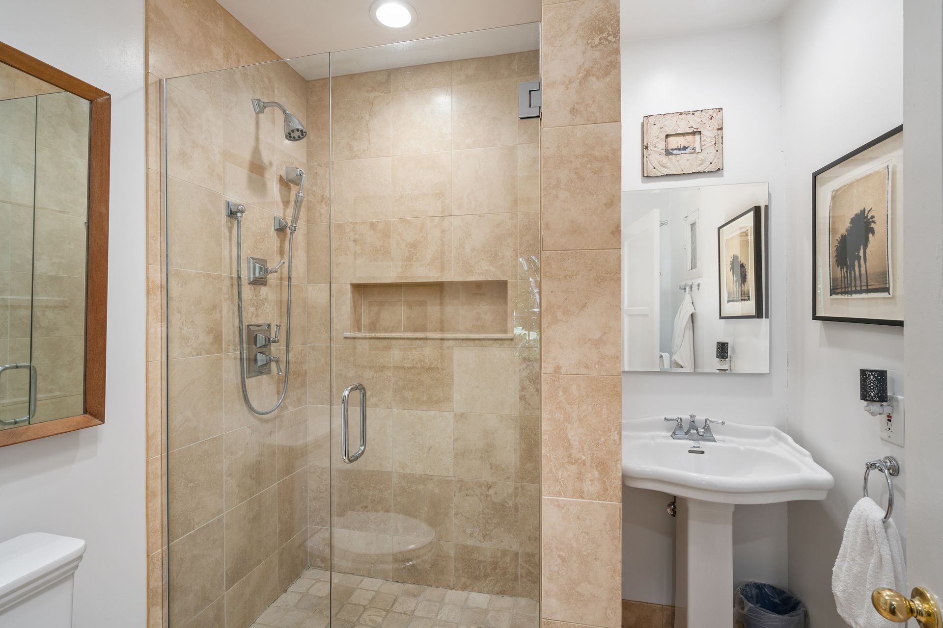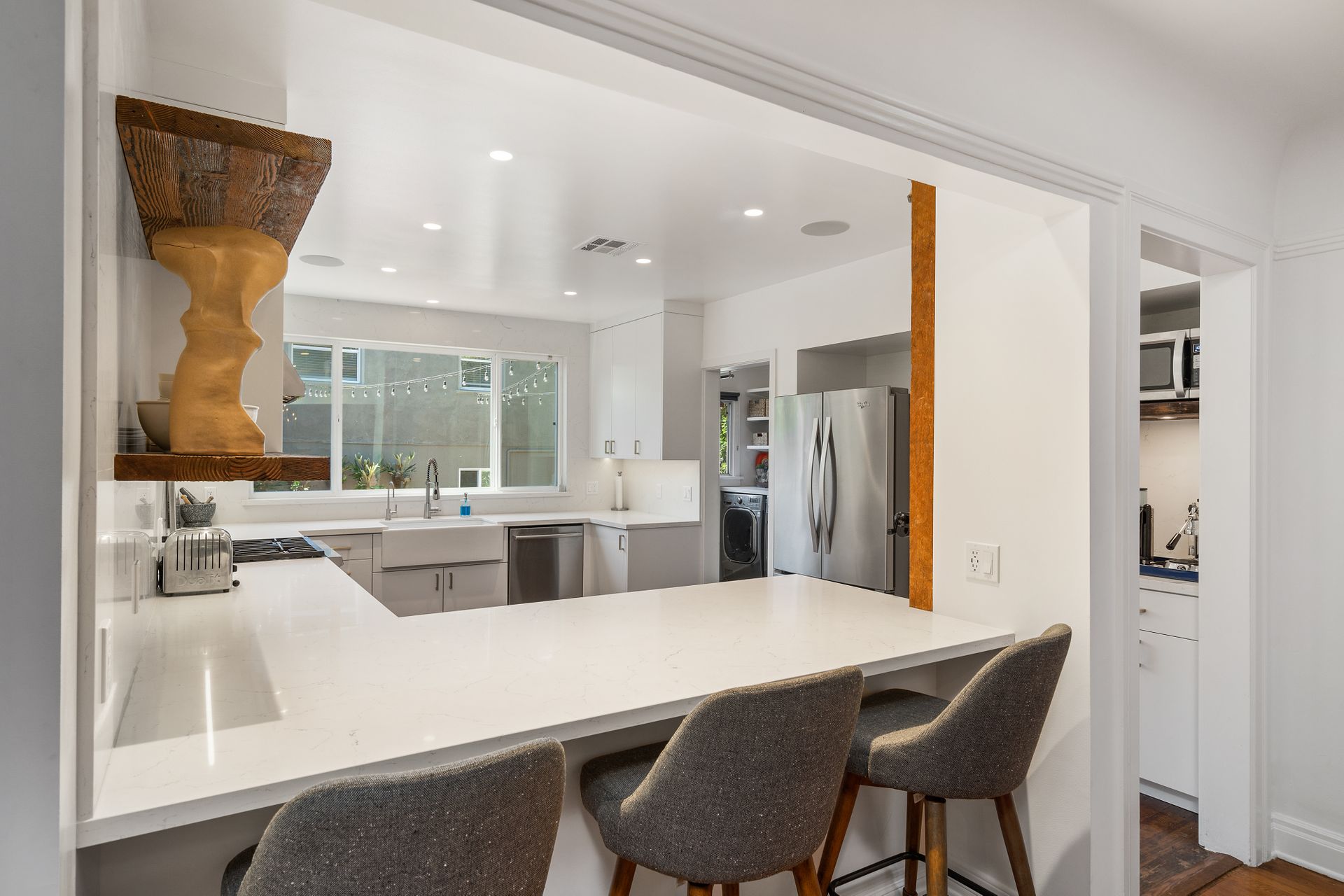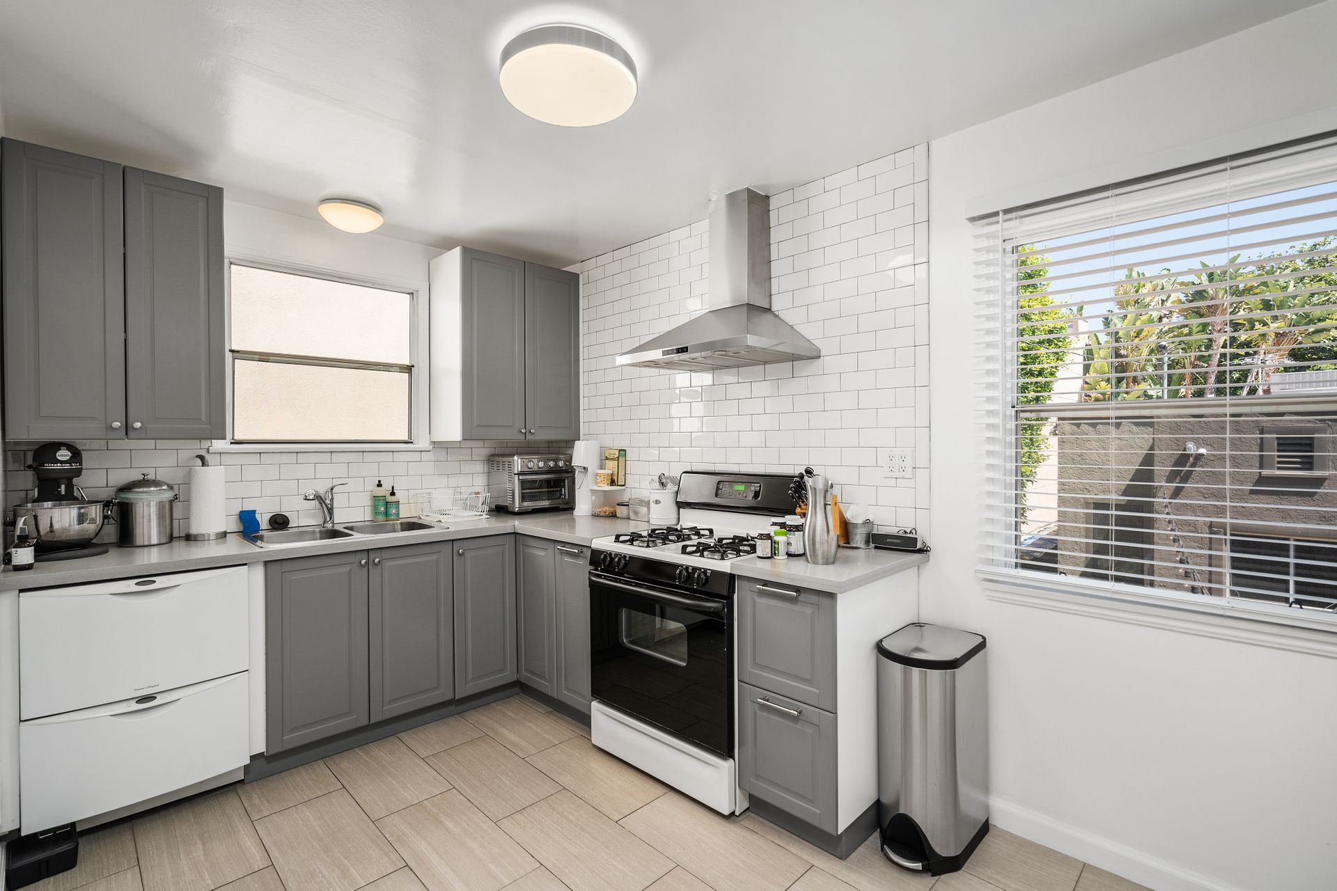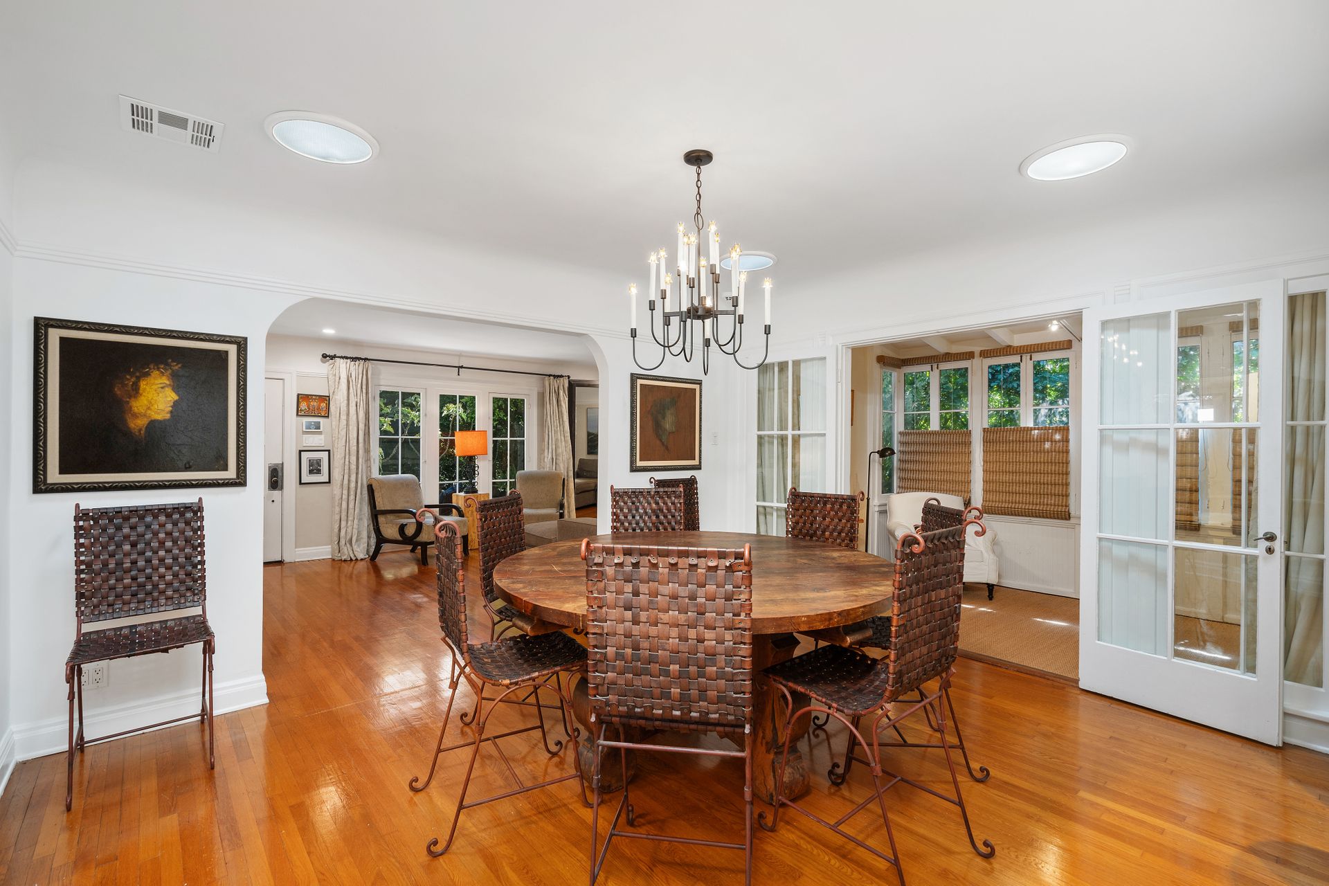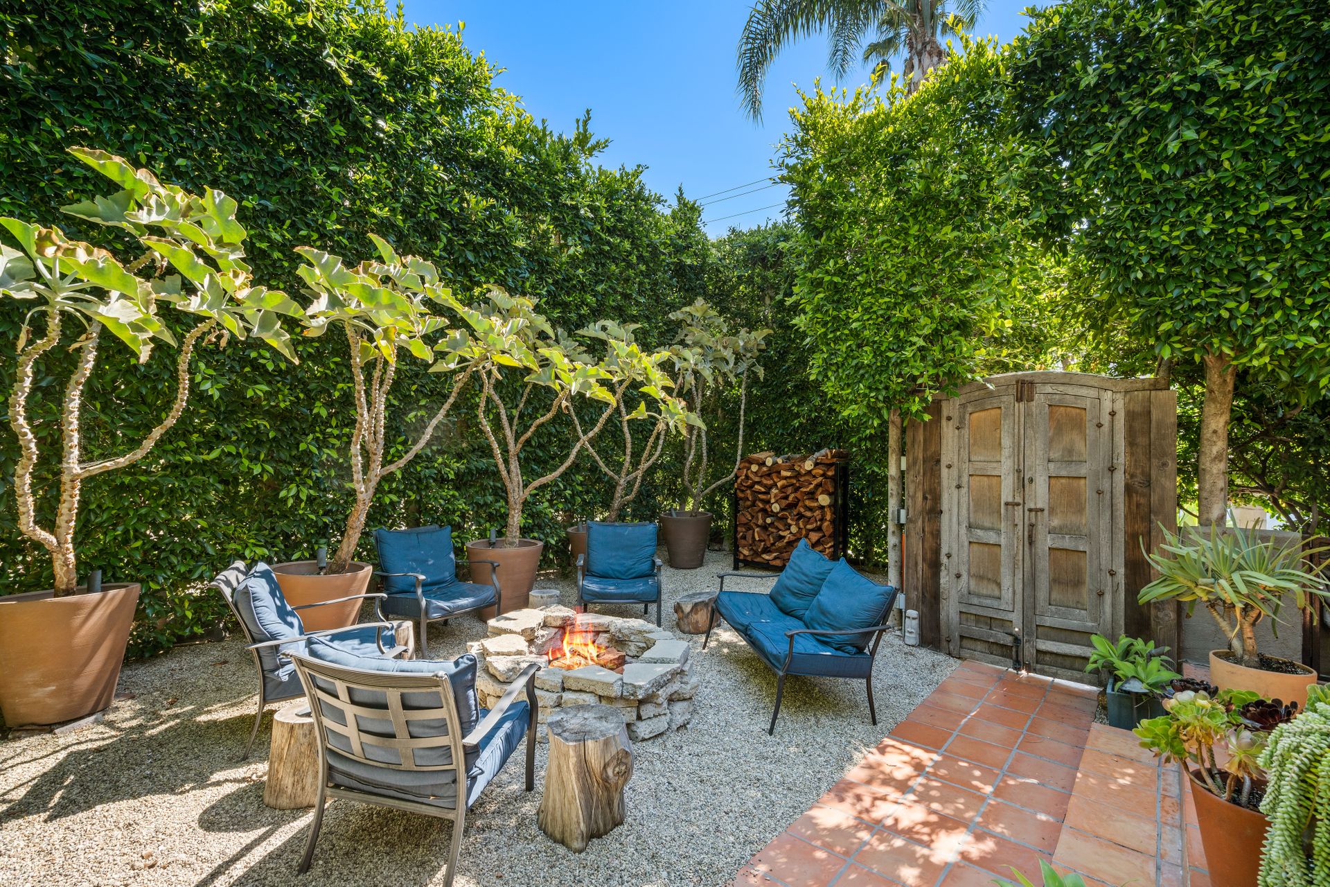 Enchanting compound featuring an impeccably updated character home plus two apartment units in a hedged and gated oasis. The charming owner's bungalow has its own address 7602 Hampton Avenue with three bedrooms and two baths plus a den. The true professional kitchen has recently been recently redone retaining original Douglas Fir flooring and offers superior appliances including a Wolf range and Bosch dishwasher. There is a private front yard and two gated entries. The common area includes a lush Moroccan inspired patio and a fountain for entertaining. The two detached apartments are configured as follows: Unit A is a ground level one bedroom, one bath with a living room and courtyard with a fountain. Unit B is upstairs and has two bedrooms, one bath, laundry, central AC/heat and a nice kitchen with a dishwasher. There is a two car garage with an opener and driveway parking. A solar system (owned not leased) serves the main house. Drought tolerant specimen succulents, fountains and hedges complete the picture. Seismic updates undertaken preemptively by the owner include foundation bolting to the main house and recent soft-story retrofit. This trophy property shows impeccable pride of ownership.