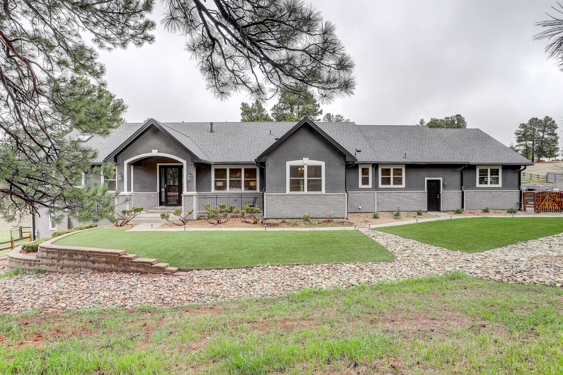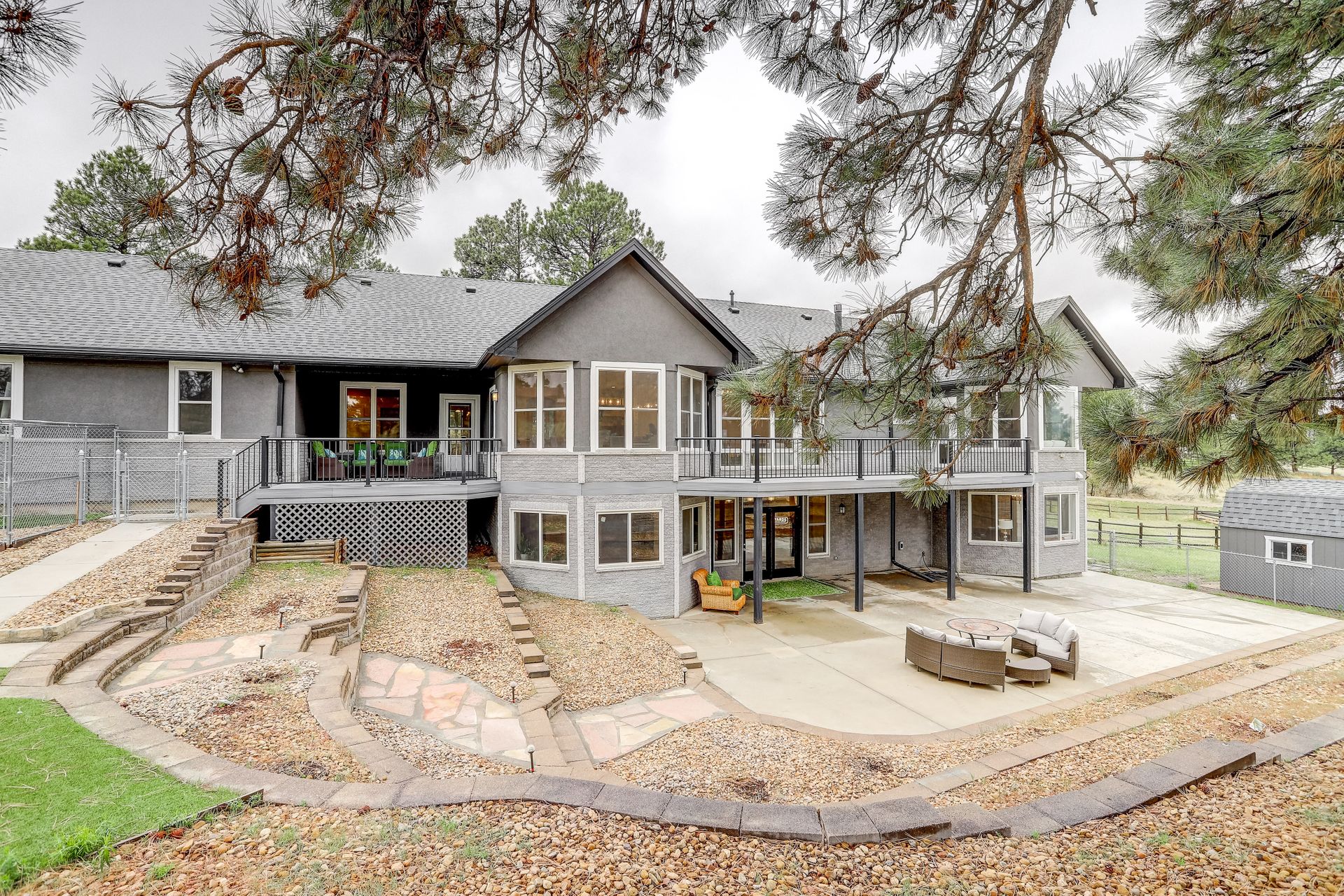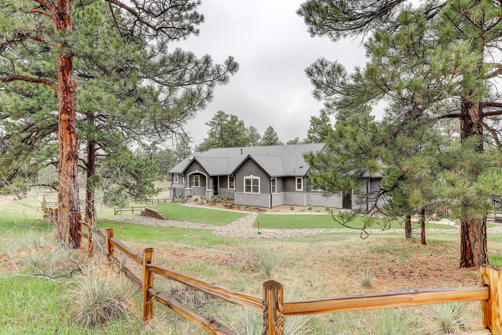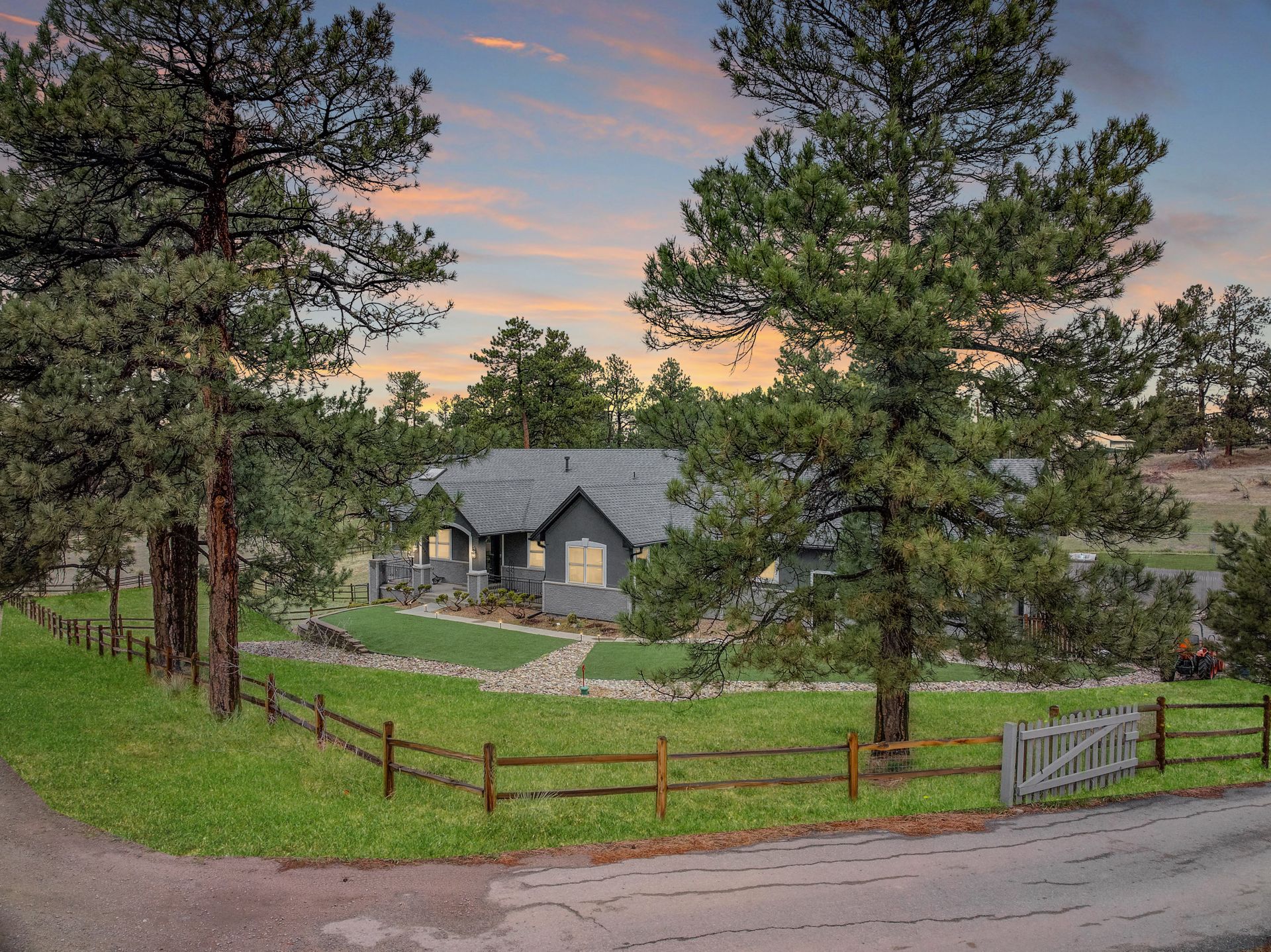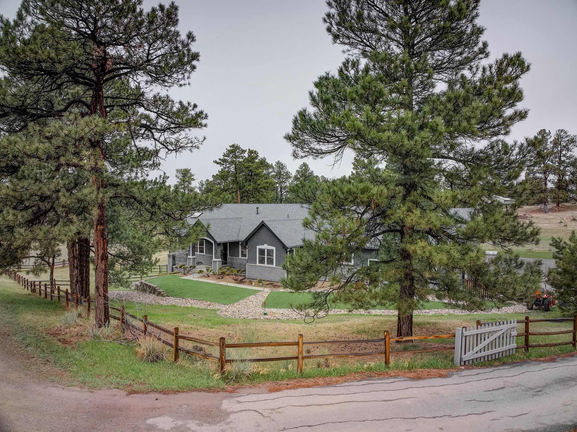 At once surprising and classic, nestled amongst the mature whispering pines on 2.65 acres this stunning Ponderosa Hills ranch home is the essence of Colorado living. Private country living yet close to modern conveniences and easy access to Denver and DIA. Head up onto the welcoming covered porch and into a vaulted foyer with a custom mosaic floor. The great room is grounded by a beveled metal and stone surround fireplace and features a two-tiered chandelier that compliments the high ceilings and open floor plan. Sophistication abounds in the chef’s kitchen finished with an interior pop of metallic brushed gold features, open shelving and two-toned Merillat Masterpiece cabinetry. The oversized eating area offers gorgeous private views and flows out to the covered and uncovered deck spaces. The gracious primary main floor suite has deck access and a two-sided fireplace that allows enjoyment from the bedroom sitting area or the free-standing tub. The five-piece luxury bath has a steam shower. A private study with French doors and built ins, two bedrooms, two baths and spacious custom laundry room round out the first floor. The walkout lower level is an entertainer’s dream with a pool table and patio access. High ceilings and floor to ceiling built-ins provide an inviting living space that features an elegant galley seated home bar with an under-mount sink, display cabinets, dishwasher and bar refrigerator drawers. Additional flex space is ready as a gym or would make a great home theatre. Two large bedrooms with a shared five-piece luxury bath complete the lower level. Two furnaces/A/C units, two water heaters and ample storage. Tiered landscaping, multiple patios, fencing and storage shed.