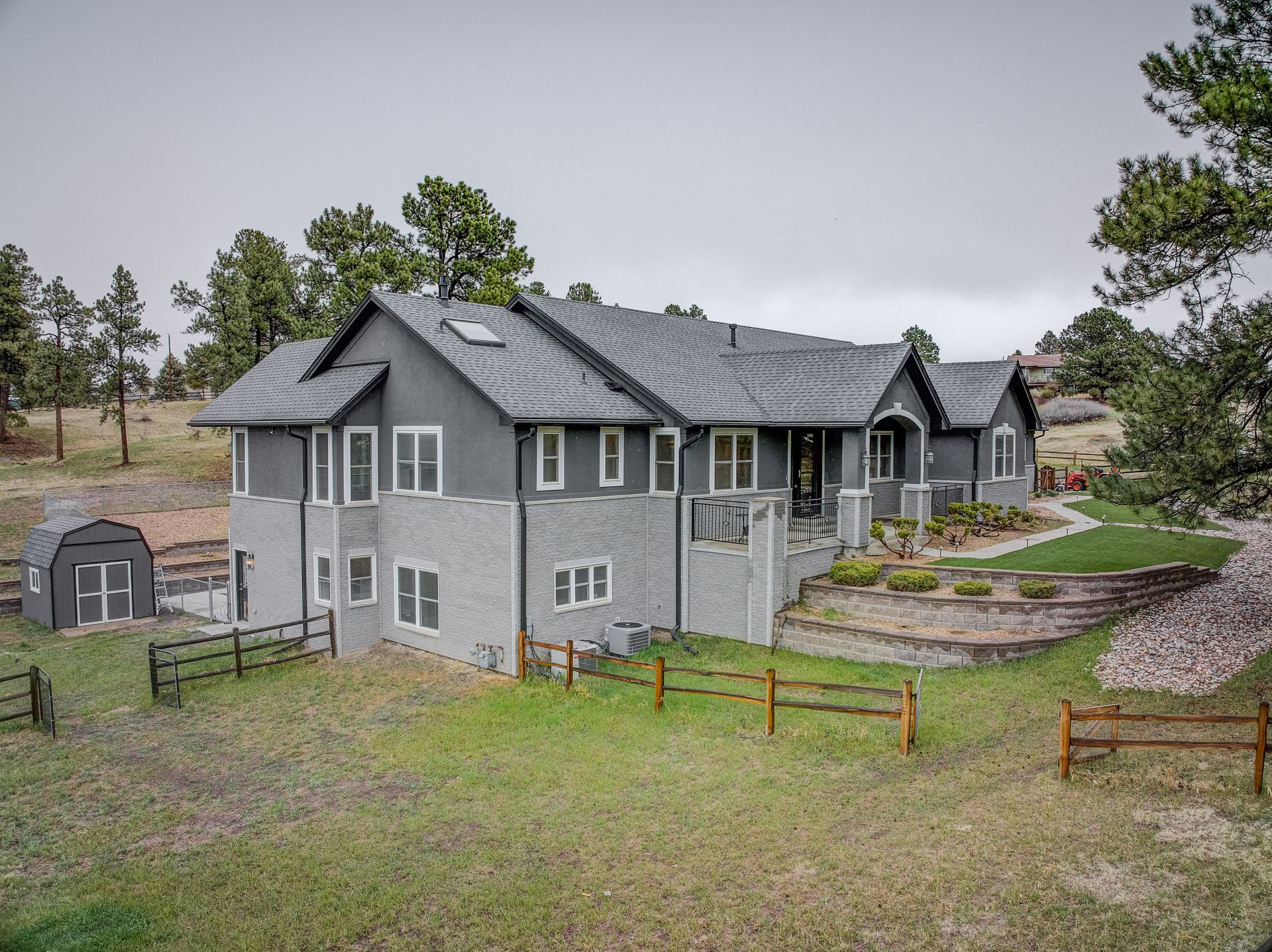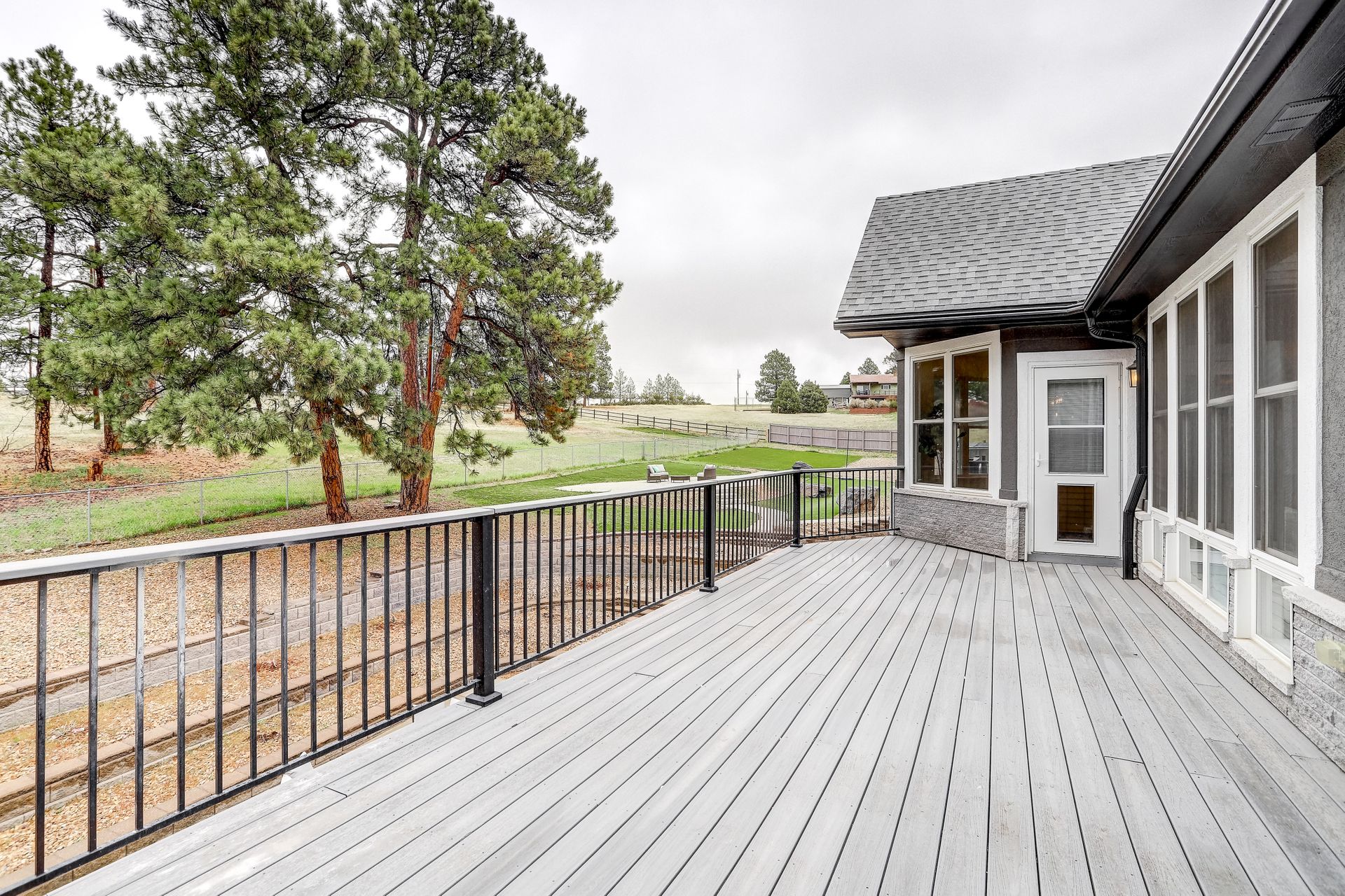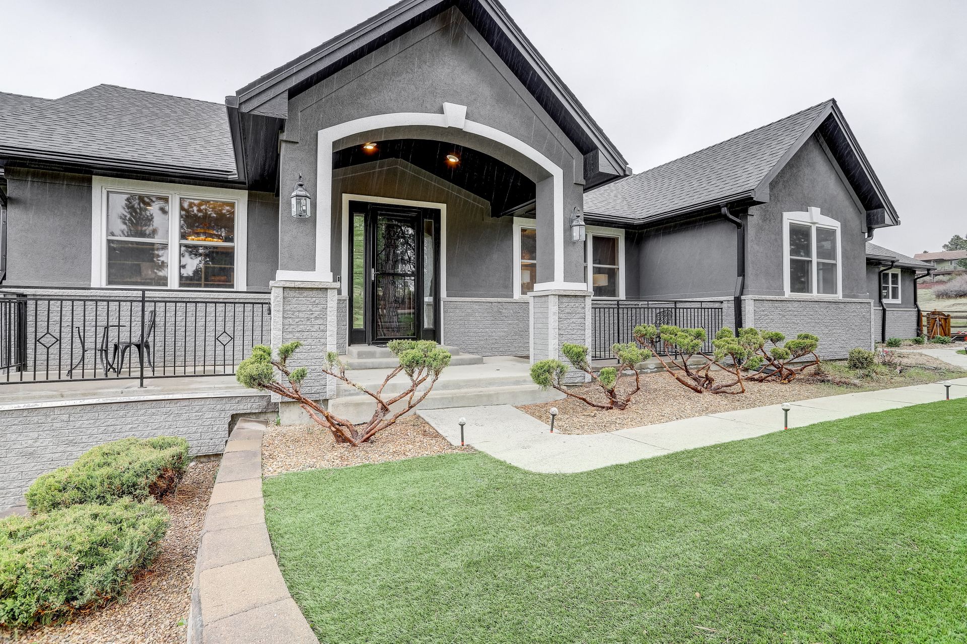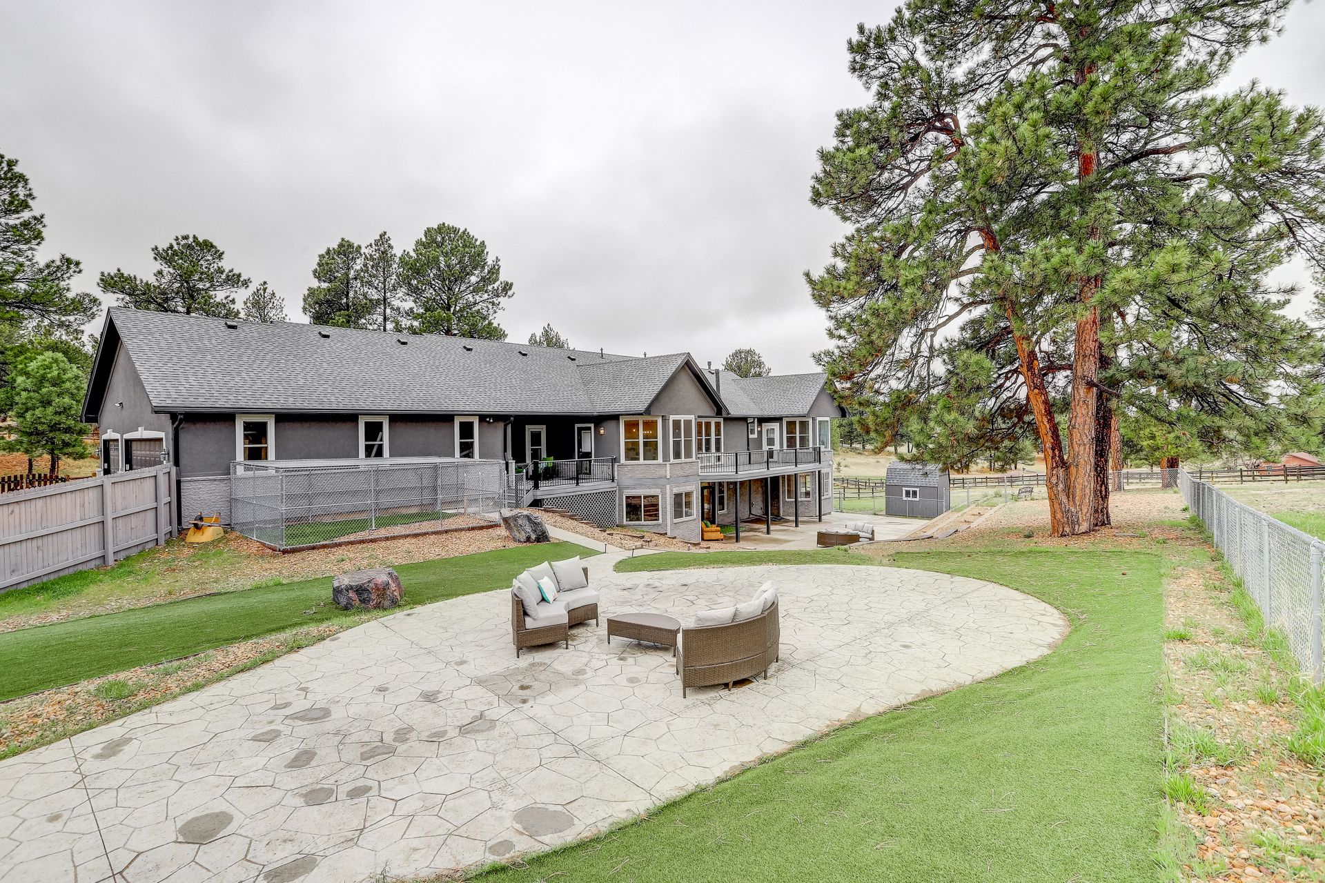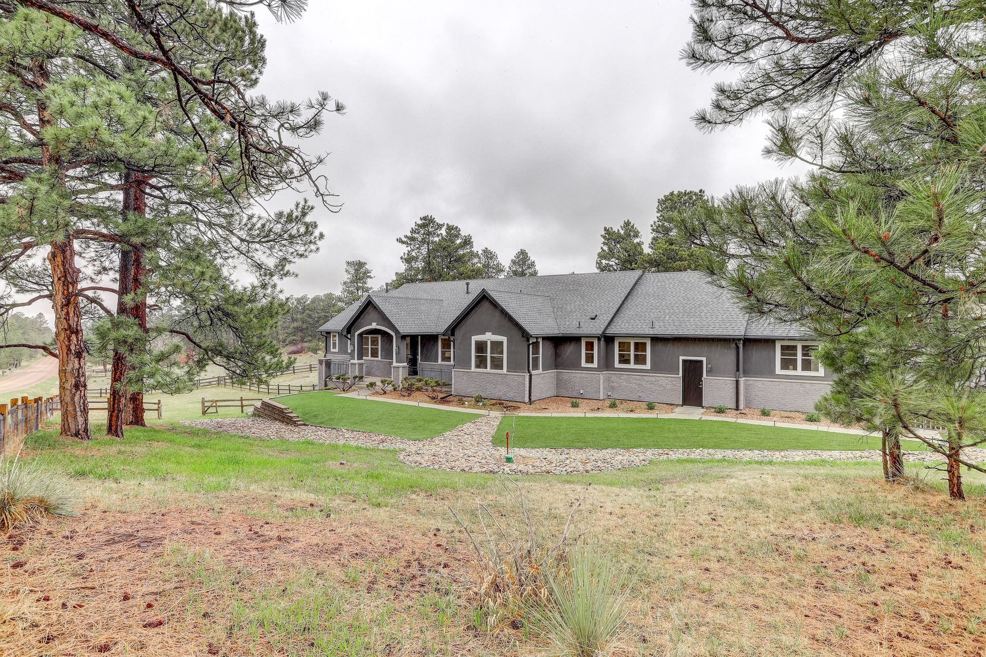 At once surprising and classic, nestled amongst the mature whispering pines on 2.65 acres this stunning Ponderosa Hills ranch home is the essence of Colorado living. Private country living yet close to modern conveniences and easy access to Denver and DIA. Head up onto the welcoming covered porch and into a vaulted foyer with a custom mosaic floor. The great room is grounded by a beveled metal and stone surround fireplace and features a two-tiered chandelier that compliments the high ceilings and open floor plan. Sophistication abounds in the chef’s kitchen finished with an interior pop of metallic brushed gold features, open shelving and two-toned Merillat Masterpiece cabinetry. The oversized eating area offers gorgeous private views and flows out to the covered and uncovered deck spaces. The gracious primary main floor suite has deck access and a two-sided fireplace that allows enjoyment from the bedroom sitting area or the free-standing tub. The five-piece luxury bath has a steam shower. A private study with French doors and built ins, two bedrooms, two baths and spacious custom laundry room round out the first floor. The walkout lower level is an entertainer’s dream with a pool table and patio access. High ceilings and floor to ceiling built-ins provide an inviting living space that features an elegant galley seated home bar with an under-mount sink, display cabinets, dishwasher and bar refrigerator drawers. Additional flex space is ready as a gym or would make a great home theatre. Two large bedrooms with a shared five-piece luxury bath complete the lower level. Two furnaces/A/C units, two water heaters and ample storage. Tiered landscaping, multiple patios, fencing and storage shed.