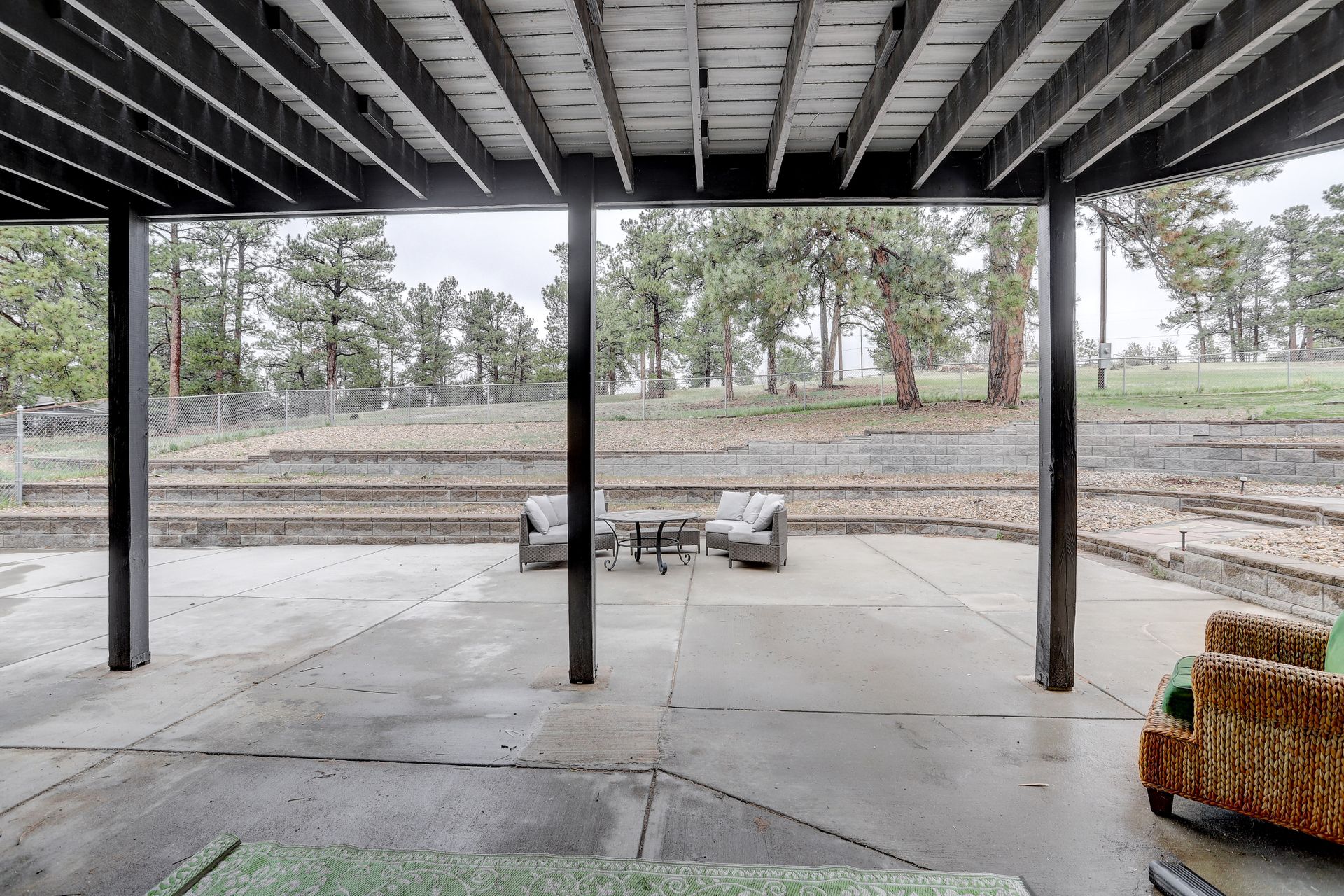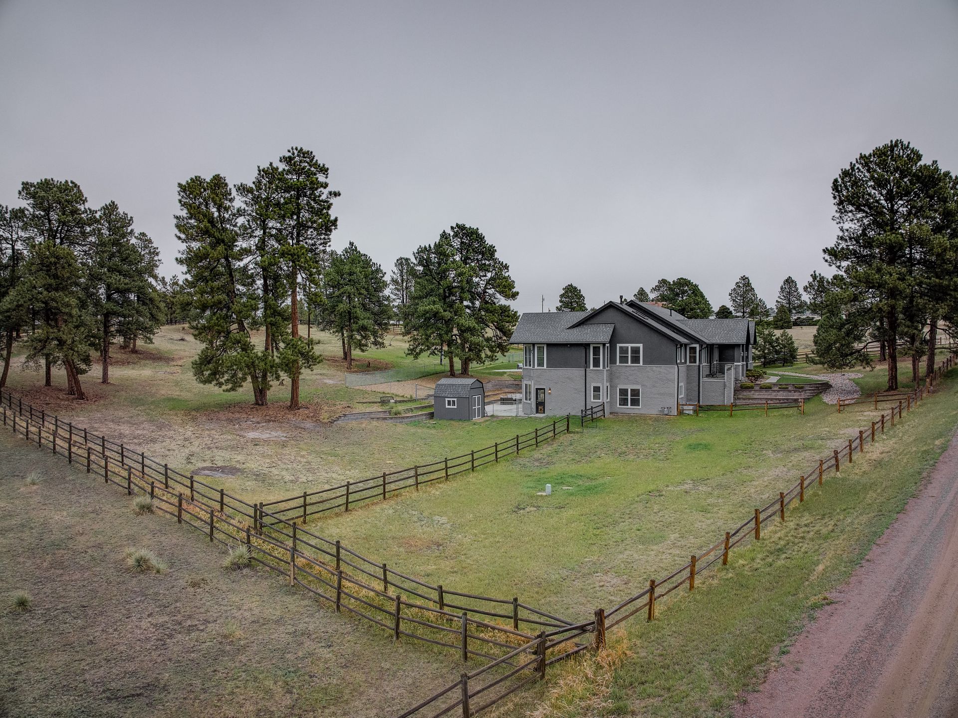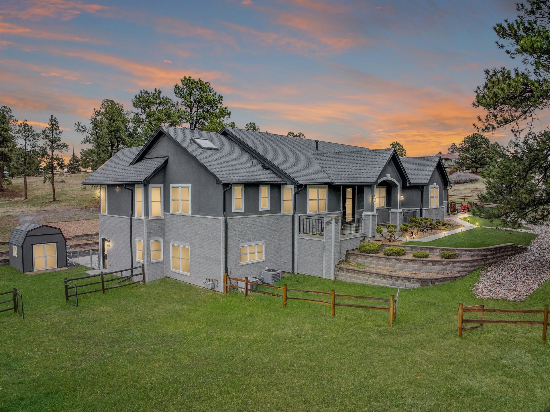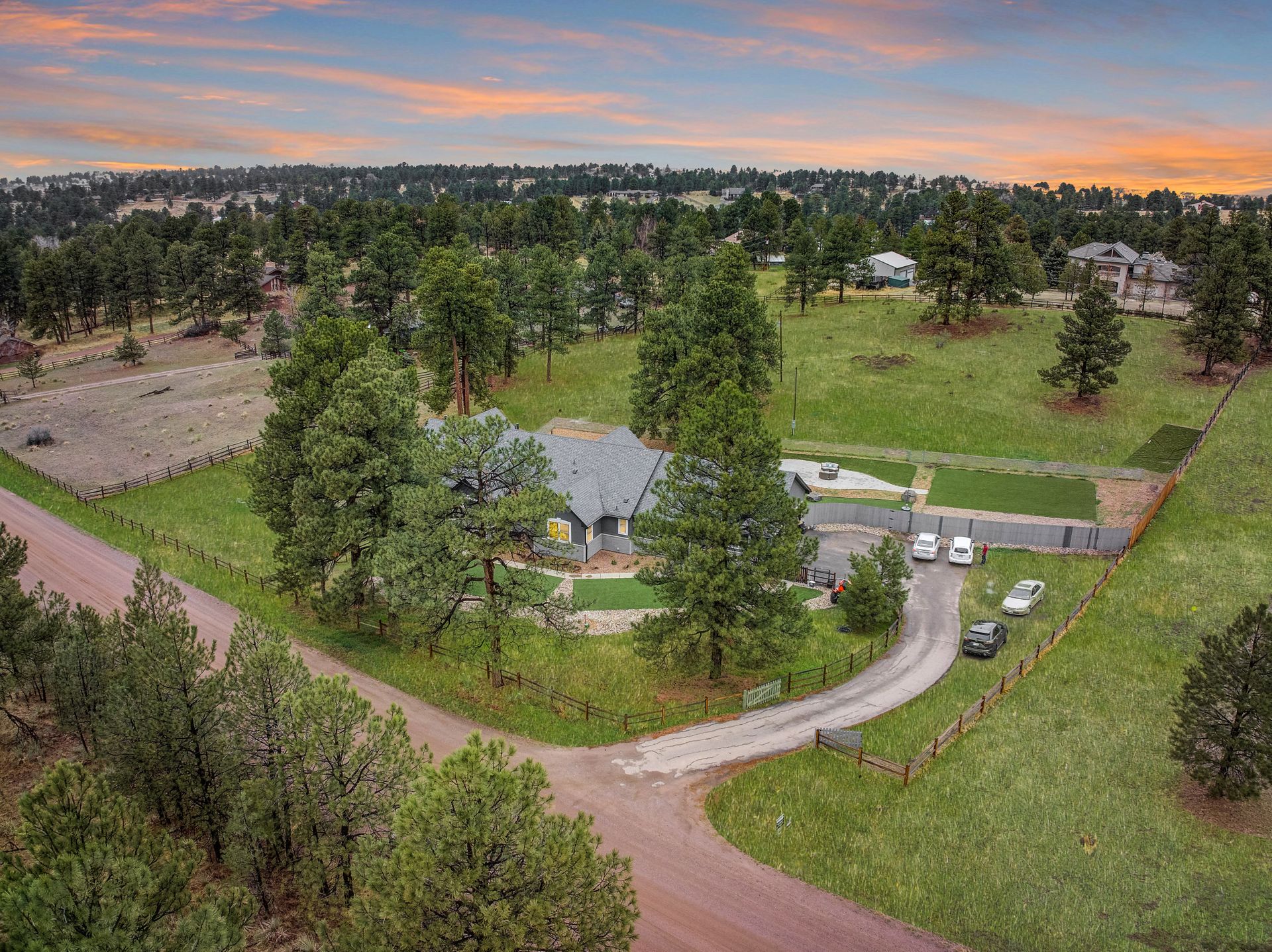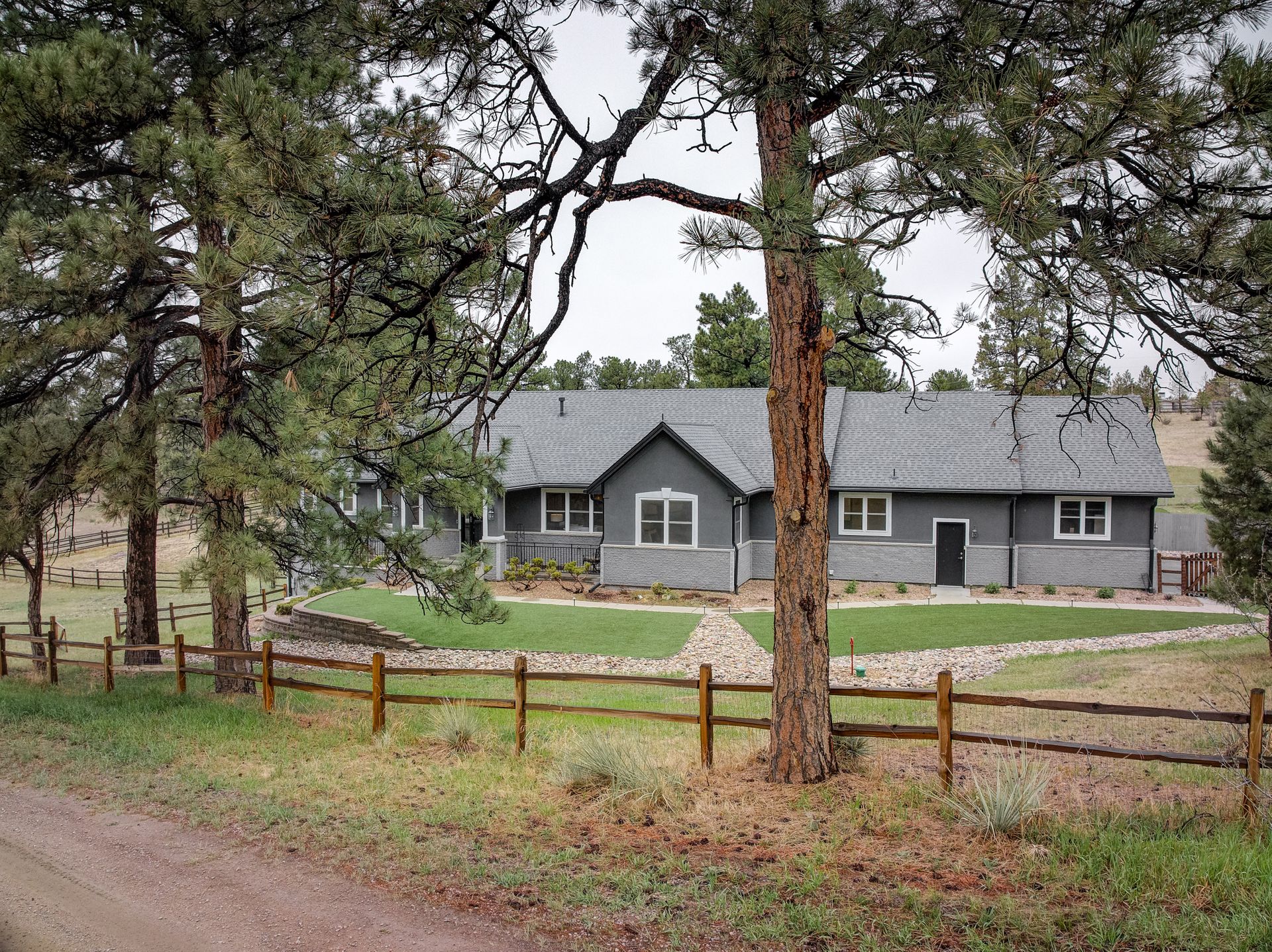 At once surprising and classic, nestled amongst the mature whispering pines on 2.65 acres this stunning Ponderosa Hills ranch home is the essence of Colorado living. Private country living yet close to modern conveniences and easy access to Denver and DIA. Head up onto the welcoming covered porch and into a vaulted foyer with a custom mosaic floor. The great room is grounded by a beveled metal and stone surround fireplace and features a two-tiered chandelier that compliments the high ceilings and open floor plan. Sophistication abounds in the chef’s kitchen finished with an interior pop of metallic brushed gold features, open shelving and two-toned Merillat Masterpiece cabinetry. The oversized eating area offers gorgeous private views and flows out to the covered and uncovered deck spaces. The gracious primary main floor suite has deck access and a two-sided fireplace that allows enjoyment from the bedroom sitting area or the free-standing tub. The five-piece luxury bath has a steam shower. A private study with French doors and built ins, two bedrooms, two baths and spacious custom laundry room round out the first floor. The walkout lower level is an entertainer’s dream with a pool table and patio access. High ceilings and floor to ceiling built-ins provide an inviting living space that features an elegant galley seated home bar with an under-mount sink, display cabinets, dishwasher and bar refrigerator drawers. Additional flex space is ready as a gym or would make a great home theatre. Two large bedrooms with a shared five-piece luxury bath complete the lower level. Two furnaces/A/C units, two water heaters and ample storage. Tiered landscaping, multiple patios, fencing and storage shed.