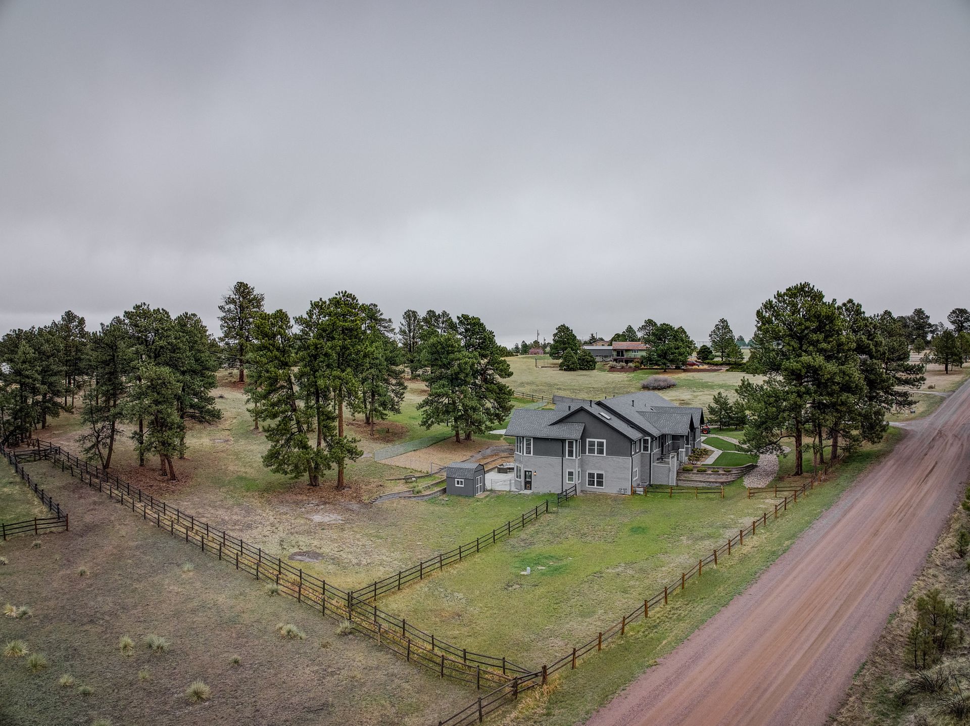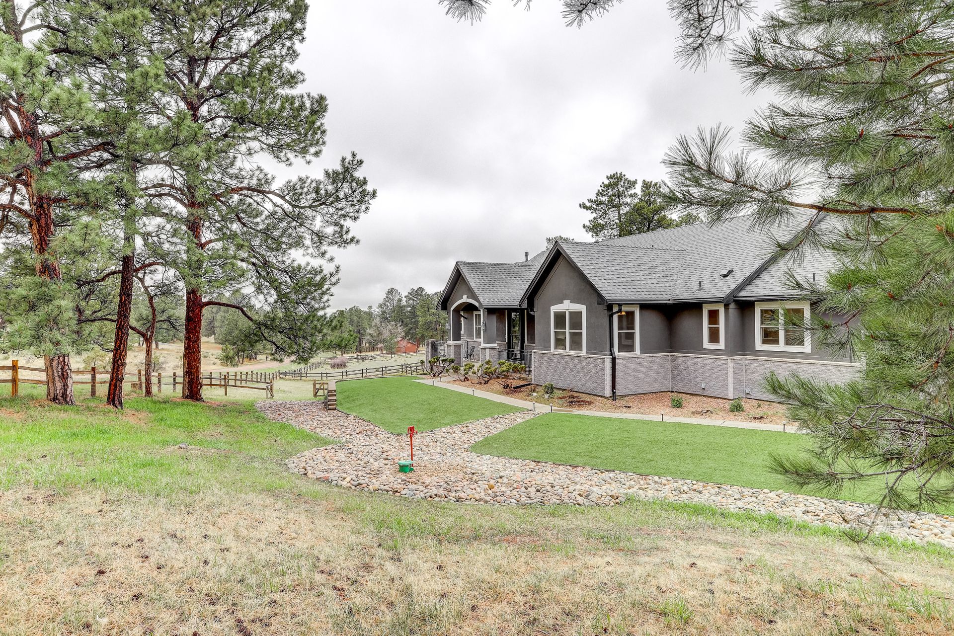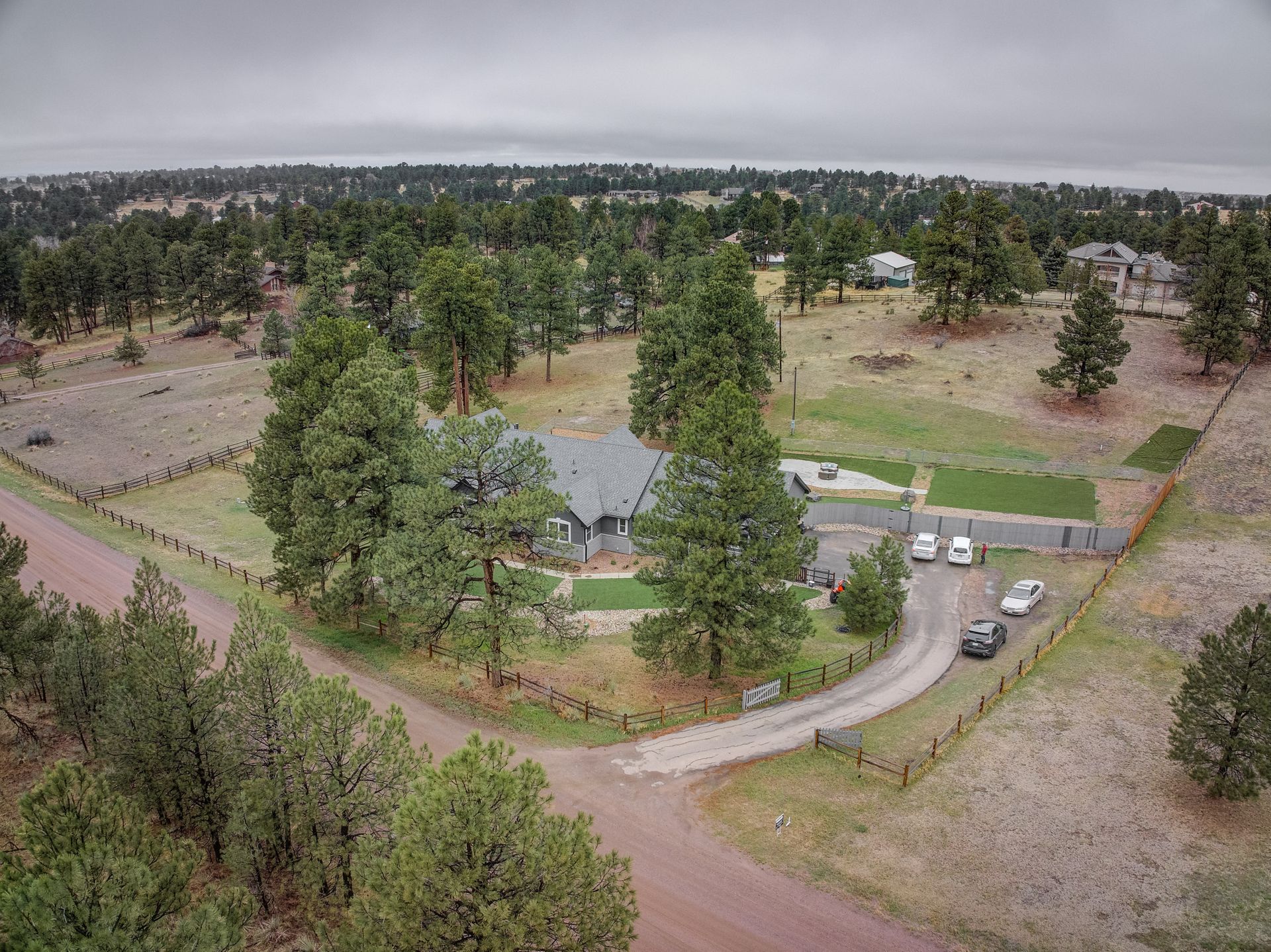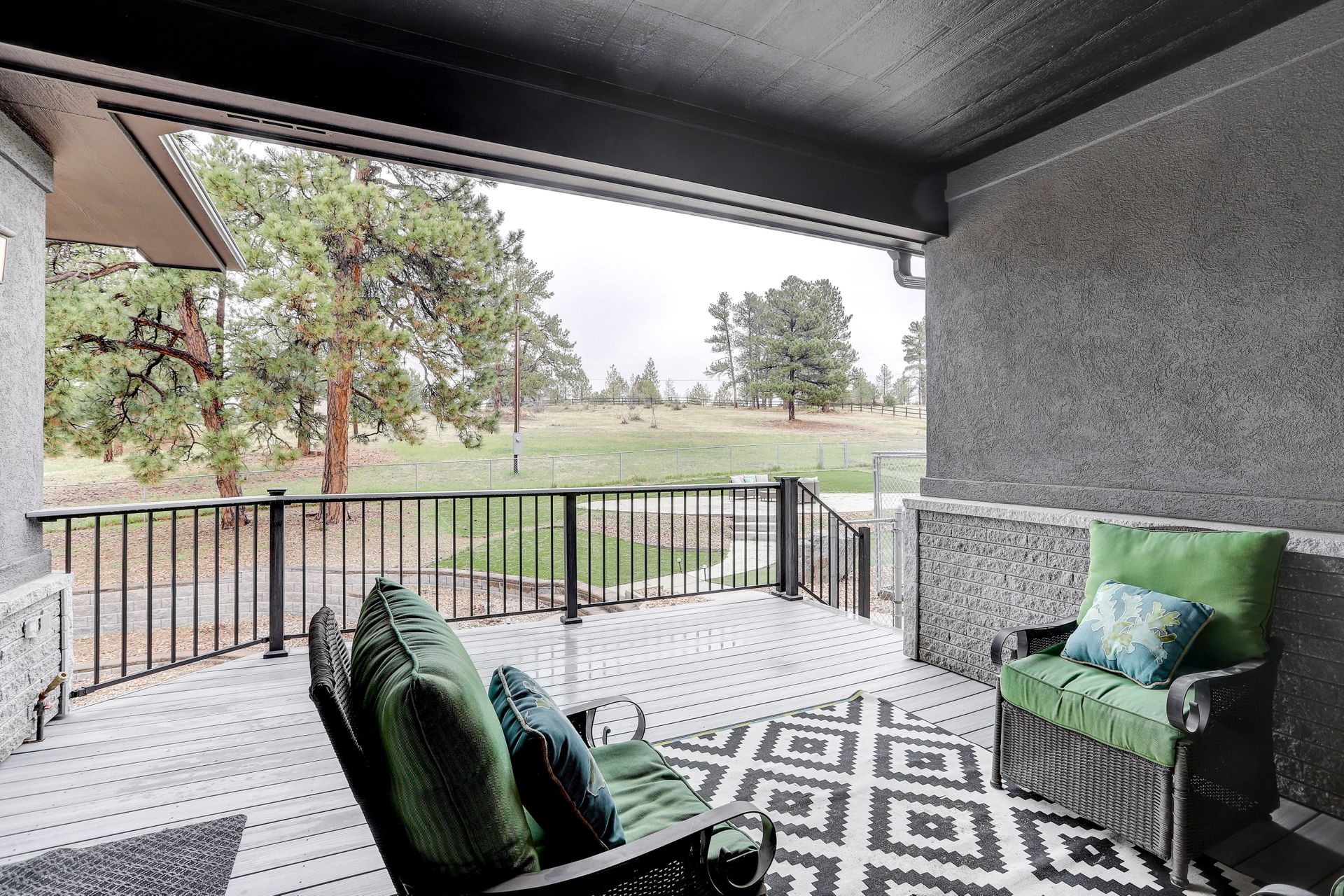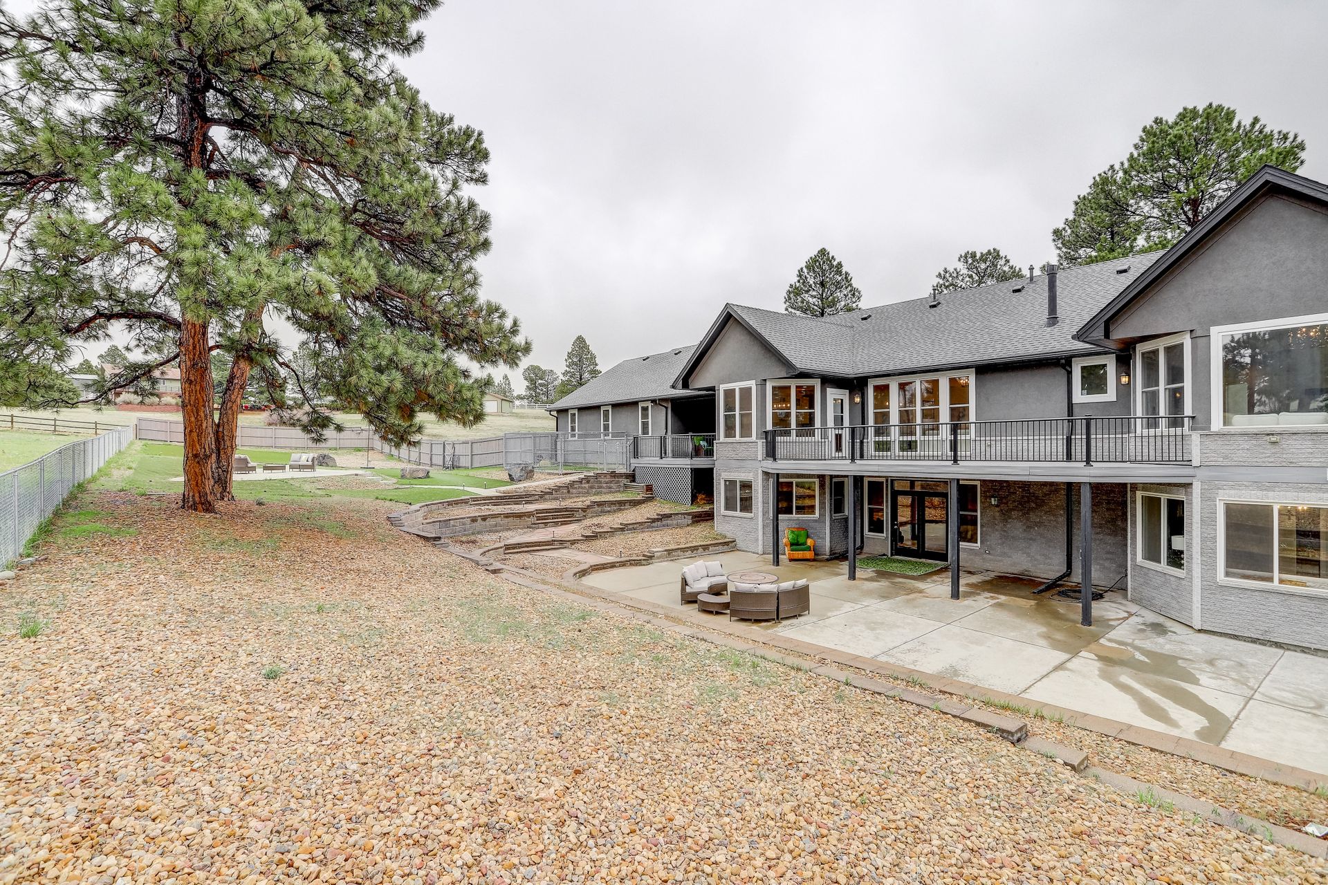 At once surprising and classic, nestled amongst the mature whispering pines on 2.65 acres this stunning Ponderosa Hills ranch home is the essence of Colorado living. Private country living yet close to modern conveniences and easy access to Denver and DIA. Head up onto the welcoming covered porch and into a vaulted foyer with a custom mosaic floor. The great room is grounded by a beveled metal and stone surround fireplace and features a two-tiered chandelier that compliments the high ceilings and open floor plan. Sophistication abounds in the chef’s kitchen finished with an interior pop of metallic brushed gold features, open shelving and two-toned Merillat Masterpiece cabinetry. The oversized eating area offers gorgeous private views and flows out to the covered and uncovered deck spaces. The gracious primary main floor suite has deck access and a two-sided fireplace that allows enjoyment from the bedroom sitting area or the free-standing tub. The five-piece luxury bath has a steam shower. A private study with French doors and built ins, two bedrooms, two baths and spacious custom laundry room round out the first floor. The walkout lower level is an entertainer’s dream with a pool table and patio access. High ceilings and floor to ceiling built-ins provide an inviting living space that features an elegant galley seated home bar with an under-mount sink, display cabinets, dishwasher and bar refrigerator drawers. Additional flex space is ready as a gym or would make a great home theatre. Two large bedrooms with a shared five-piece luxury bath complete the lower level. Two furnaces/A/C units, two water heaters and ample storage. Tiered landscaping, multiple patios, fencing and storage shed.