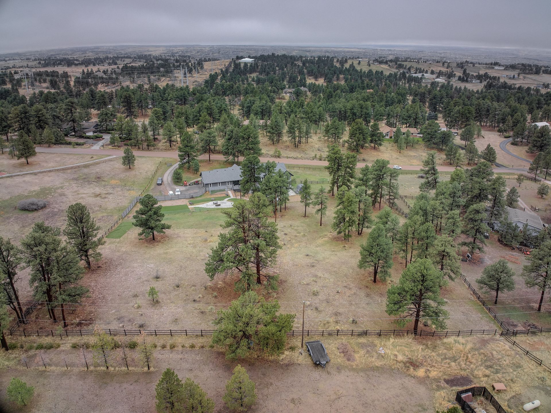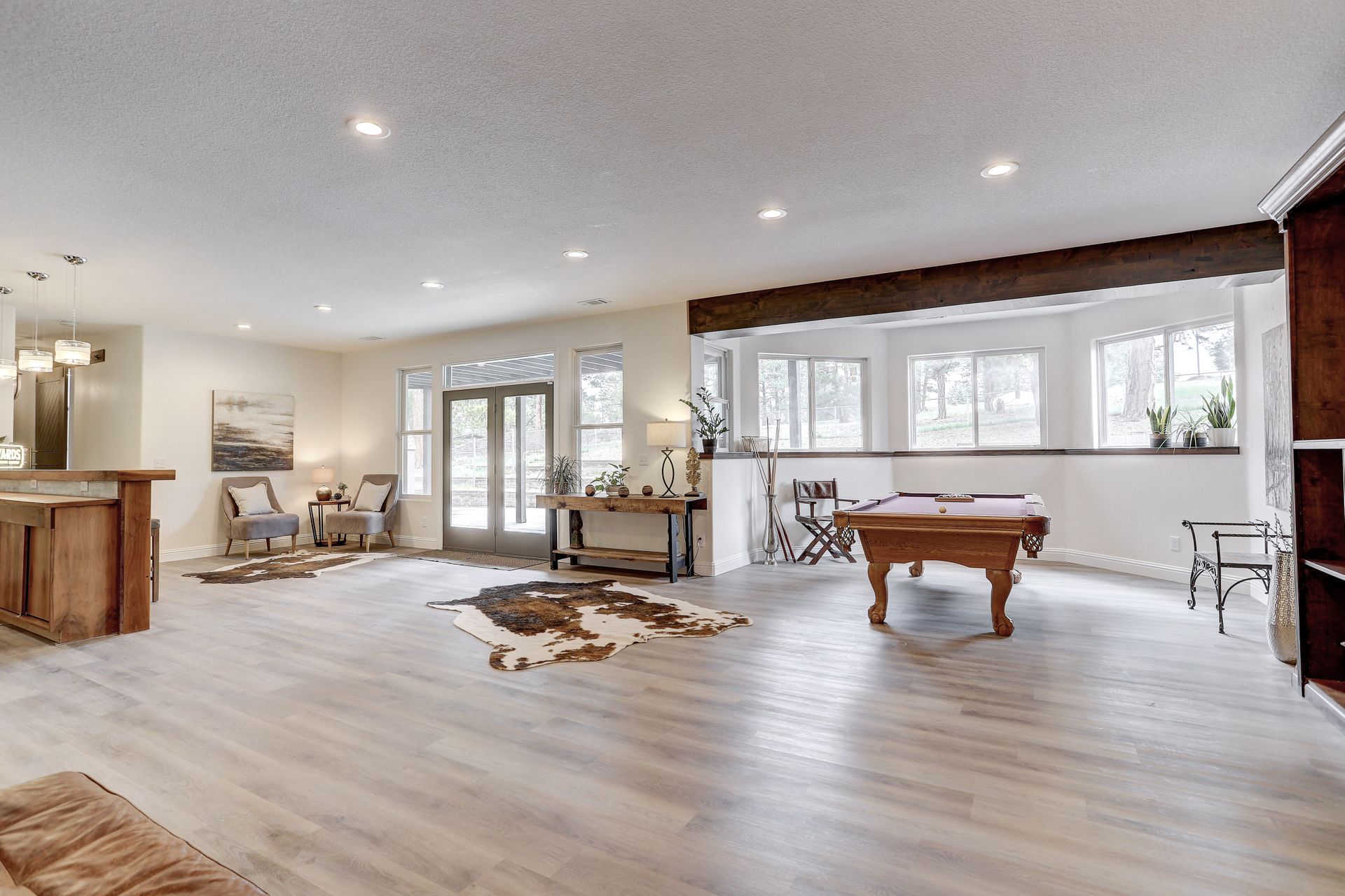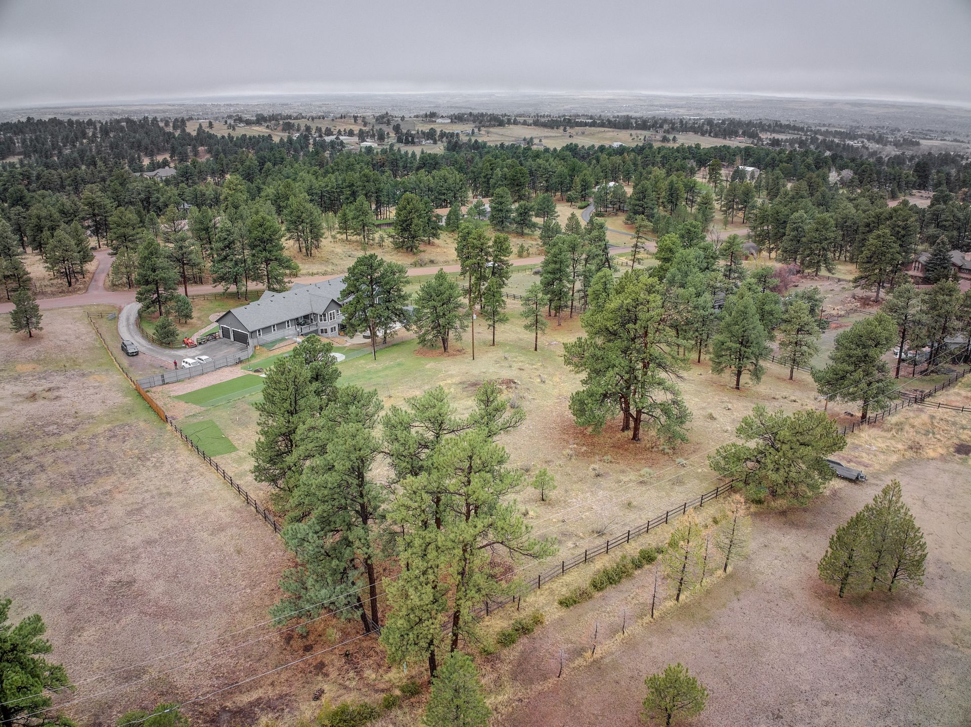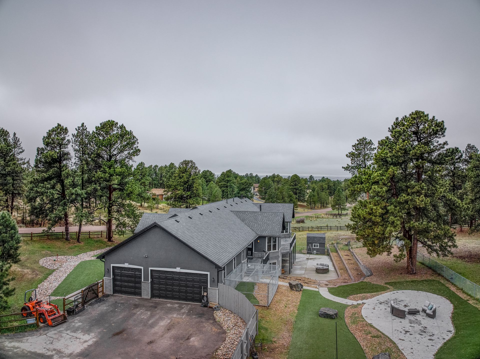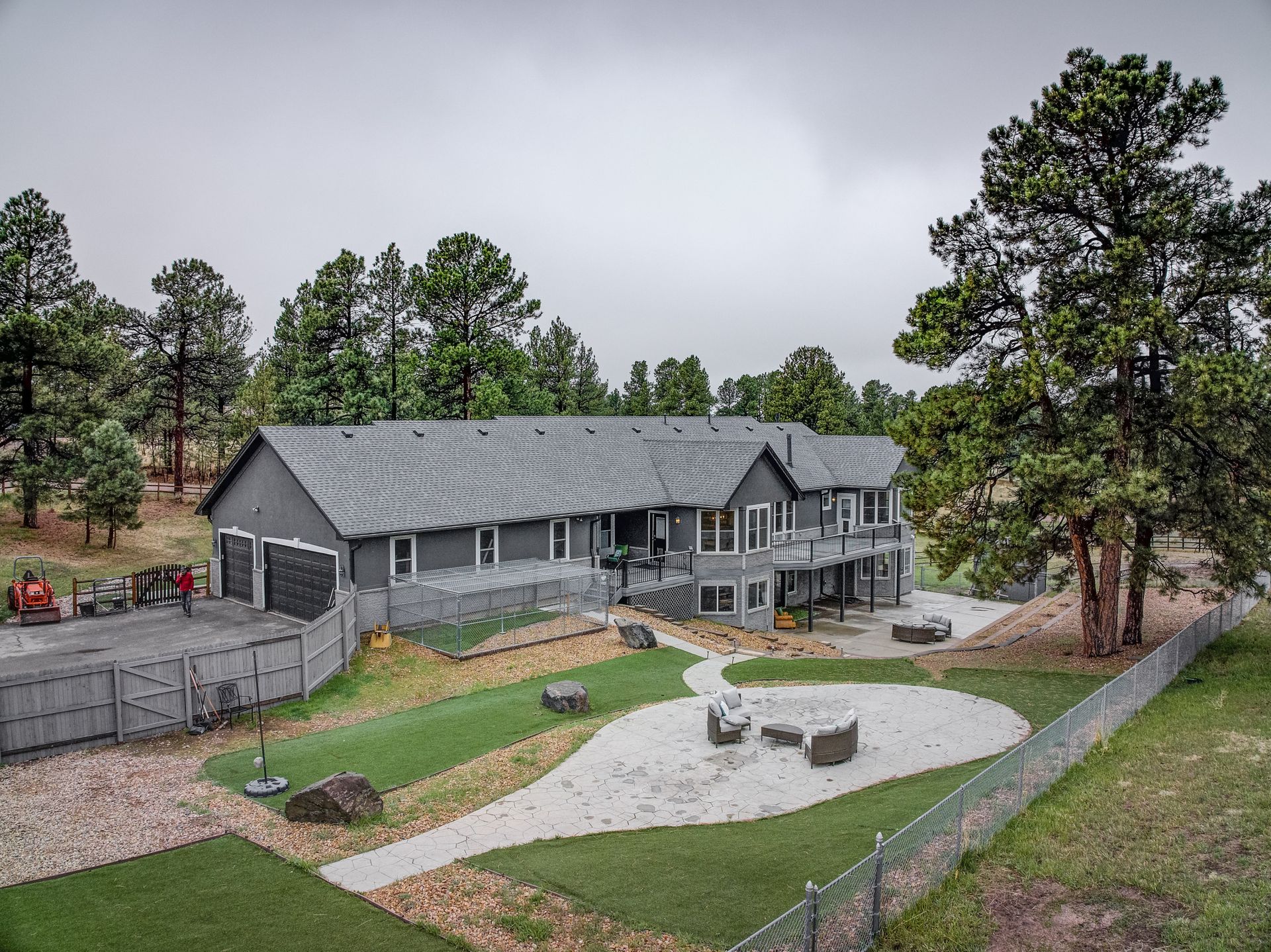 At once surprising and classic, nestled amongst the mature whispering pines on 2.65 acres this stunning Ponderosa Hills ranch home is the essence of Colorado living. Private country living yet close to modern conveniences and easy access to Denver and DIA. Head up onto the welcoming covered porch and into a vaulted foyer with a custom mosaic floor. The great room is grounded by a beveled metal and stone surround fireplace and features a two-tiered chandelier that compliments the high ceilings and open floor plan. Sophistication abounds in the chef’s kitchen finished with an interior pop of metallic brushed gold features, open shelving and two-toned Merillat Masterpiece cabinetry. The oversized eating area offers gorgeous private views and flows out to the covered and uncovered deck spaces. The gracious primary main floor suite has deck access and a two-sided fireplace that allows enjoyment from the bedroom sitting area or the free-standing tub. The five-piece luxury bath has a steam shower. A private study with French doors and built ins, two bedrooms, two baths and spacious custom laundry room round out the first floor. The walkout lower level is an entertainer’s dream with a pool table and patio access. High ceilings and floor to ceiling built-ins provide an inviting living space that features an elegant galley seated home bar with an under-mount sink, display cabinets, dishwasher and bar refrigerator drawers. Additional flex space is ready as a gym or would make a great home theatre. Two large bedrooms with a shared five-piece luxury bath complete the lower level. Two furnaces/A/C units, two water heaters and ample storage. Tiered landscaping, multiple patios, fencing and storage shed.