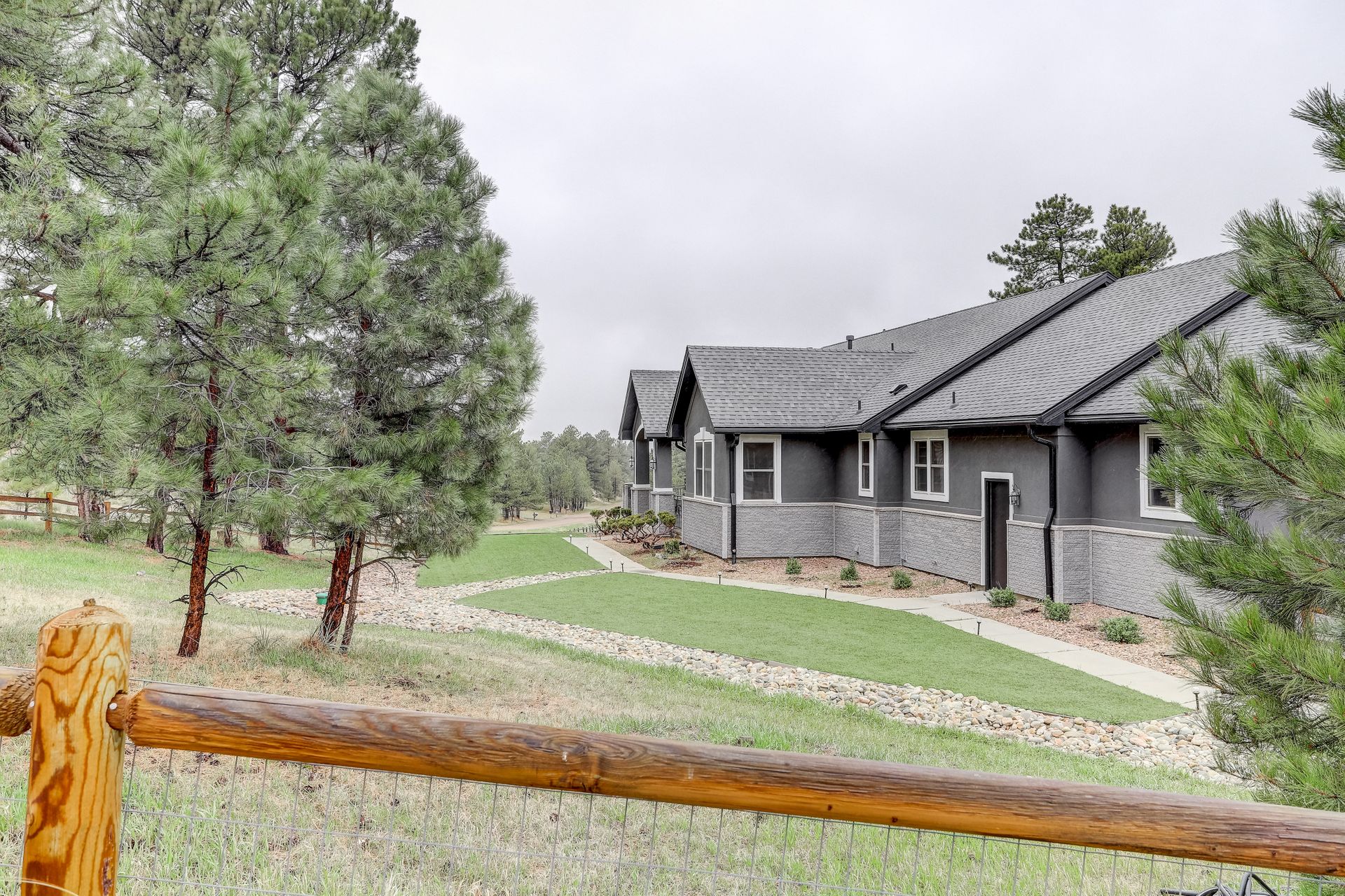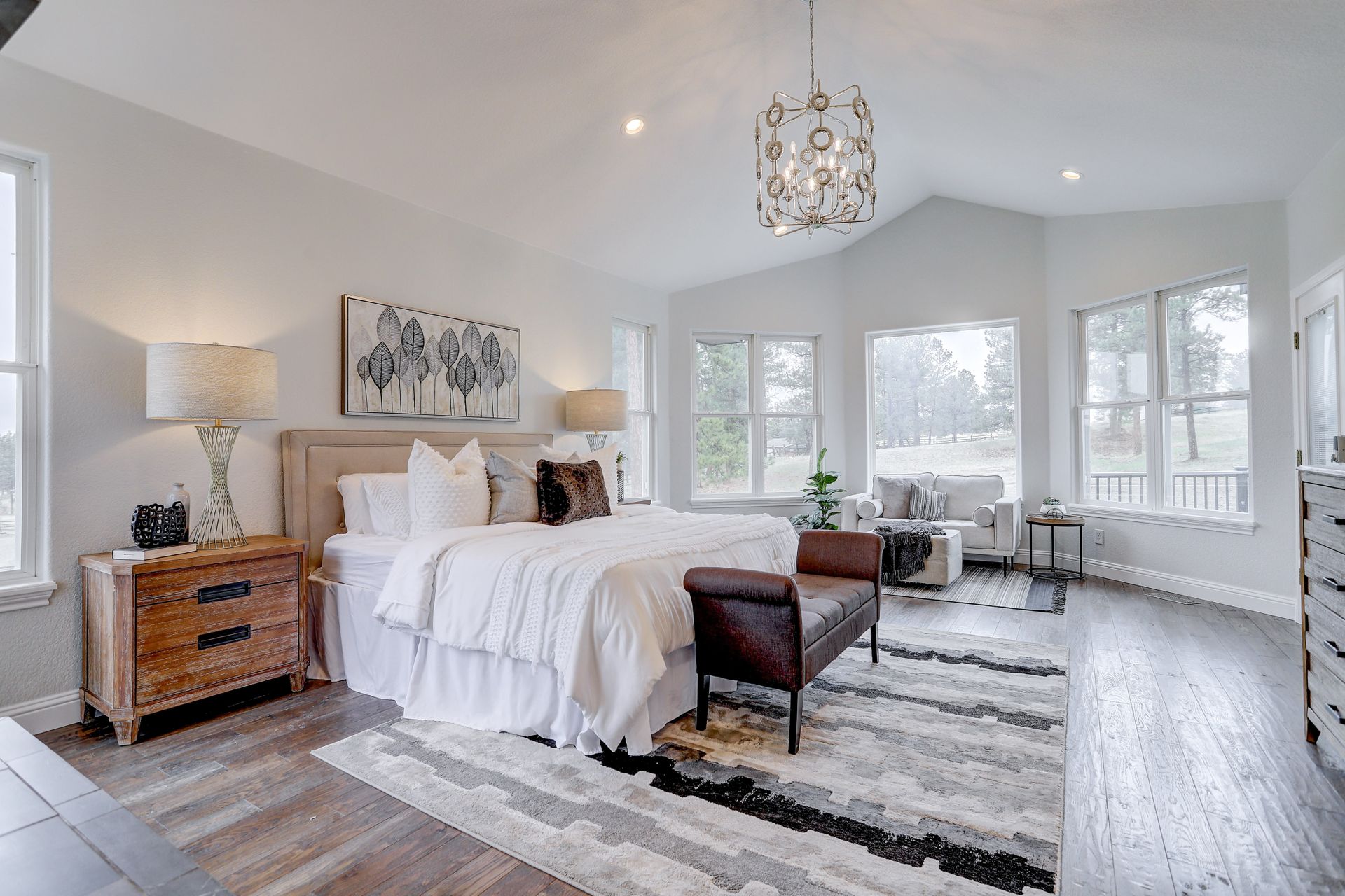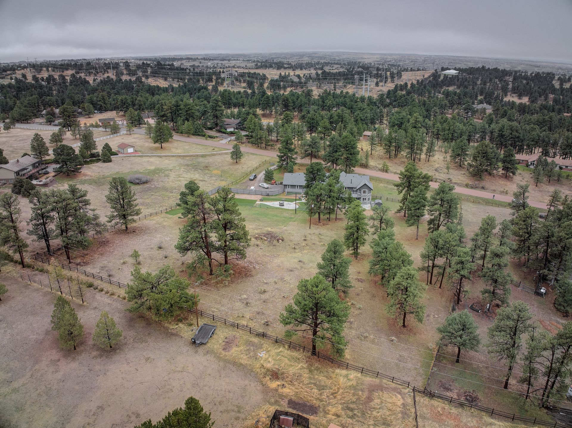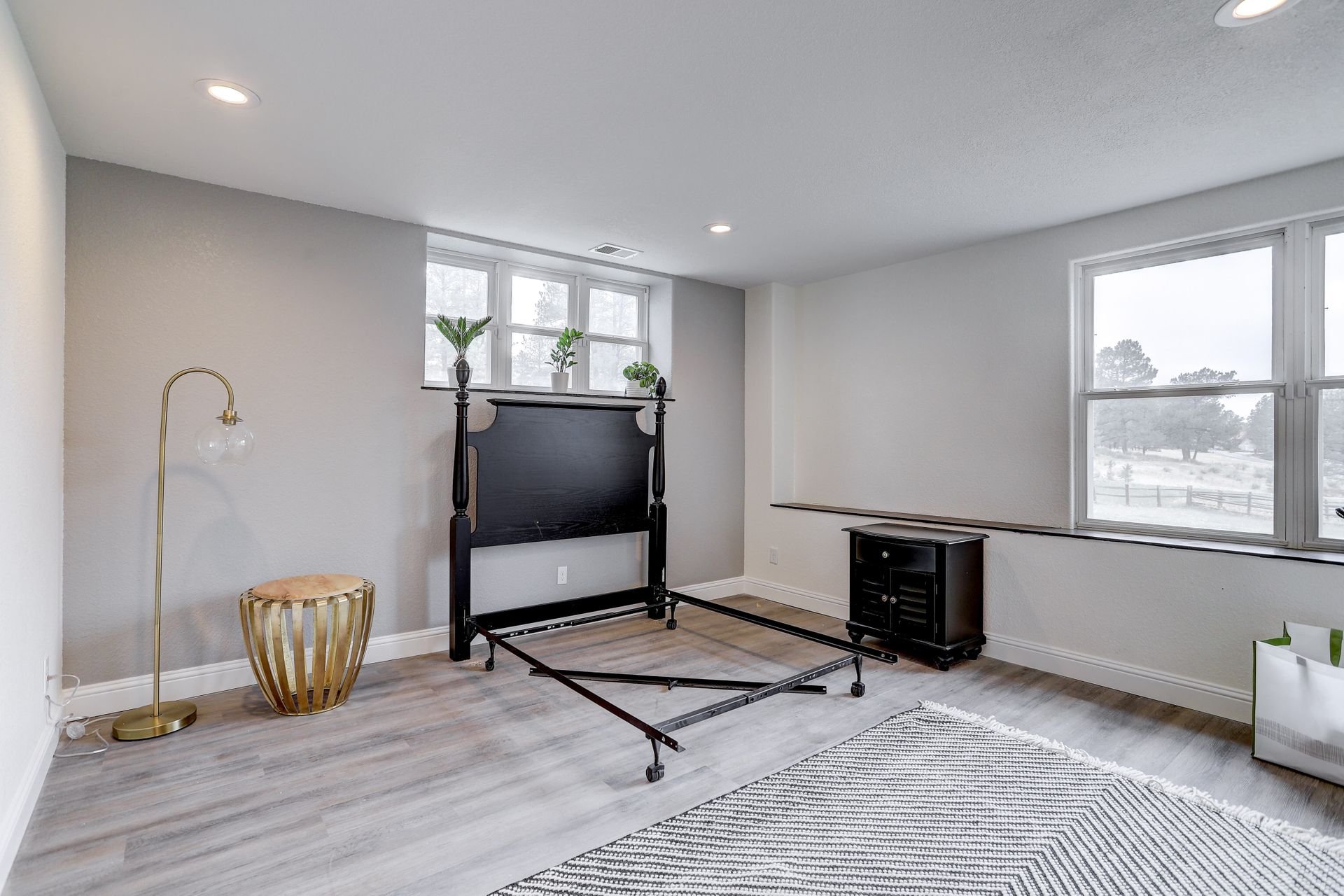 At once surprising and classic, nestled amongst the mature whispering pines on 2.65 acres this stunning Ponderosa Hills ranch home is the essence of Colorado living. Private country living yet close to modern conveniences and easy access to Denver and DIA. Head up onto the welcoming covered porch and into a vaulted foyer with a custom mosaic floor. The great room is grounded by a beveled metal and stone surround fireplace and features a two-tiered chandelier that compliments the high ceilings and open floor plan. Sophistication abounds in the chef’s kitchen finished with an interior pop of metallic brushed gold features, open shelving and two-toned Merillat Masterpiece cabinetry. The oversized eating area offers gorgeous private views and flows out to the covered and uncovered deck spaces. The gracious primary main floor suite has deck access and a two-sided fireplace that allows enjoyment from the bedroom sitting area or the free-standing tub. The five-piece luxury bath has a steam shower. A private study with French doors and built ins, two bedrooms, two baths and spacious custom laundry room round out the first floor. The walkout lower level is an entertainer’s dream with a pool table and patio access. High ceilings and floor to ceiling built-ins provide an inviting living space that features an elegant galley seated home bar with an under-mount sink, display cabinets, dishwasher and bar refrigerator drawers. Additional flex space is ready as a gym or would make a great home theatre. Two large bedrooms with a shared five-piece luxury bath complete the lower level. Two furnaces/A/C units, two water heaters and ample storage. Tiered landscaping, multiple patios, fencing and storage shed.