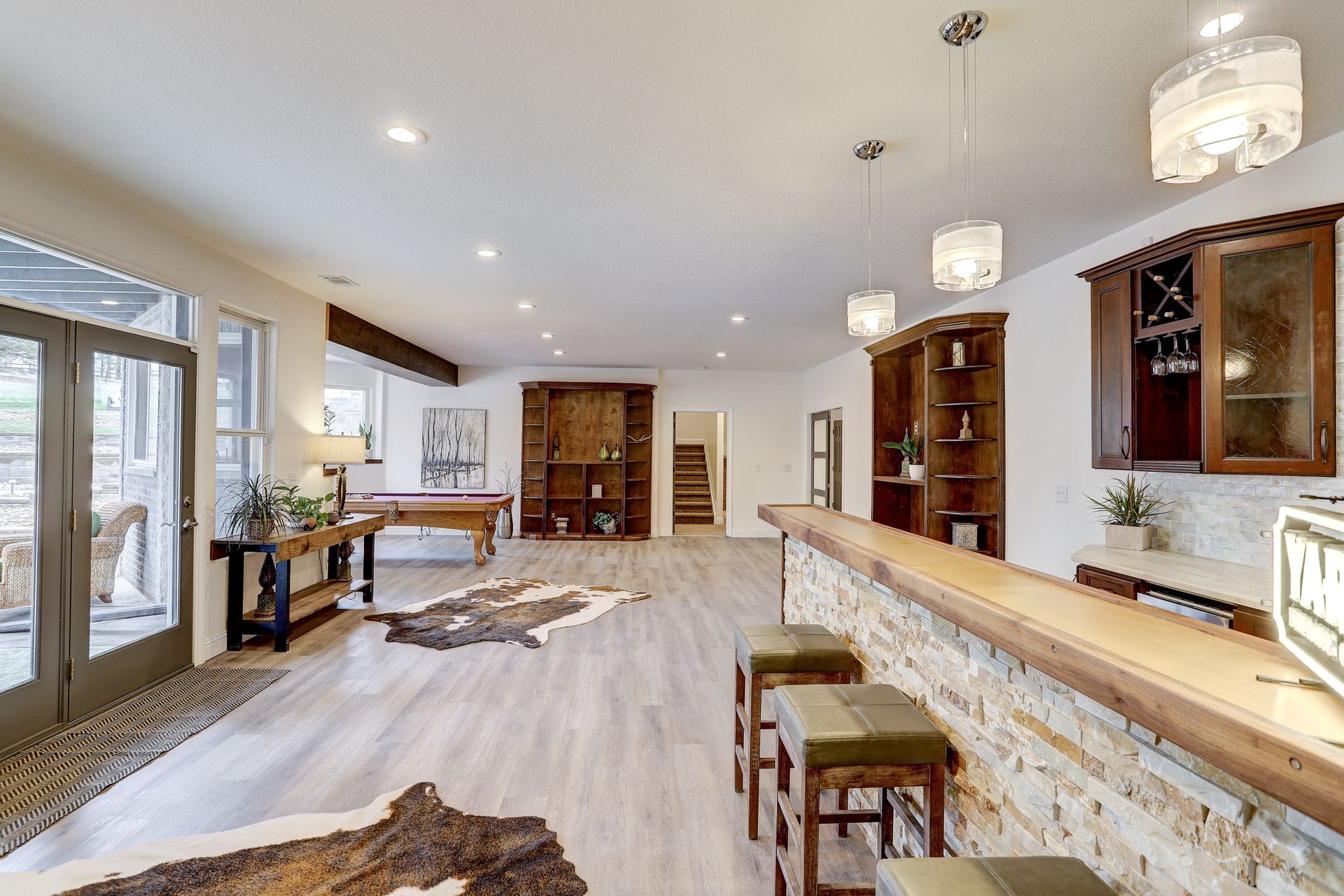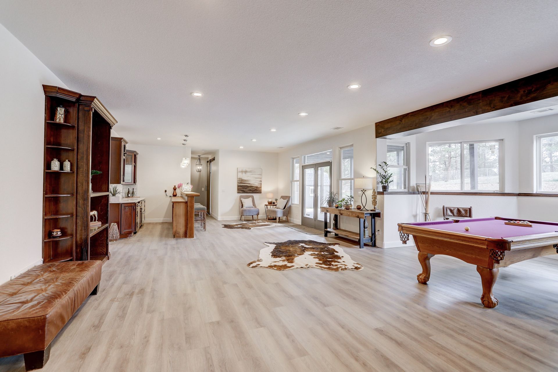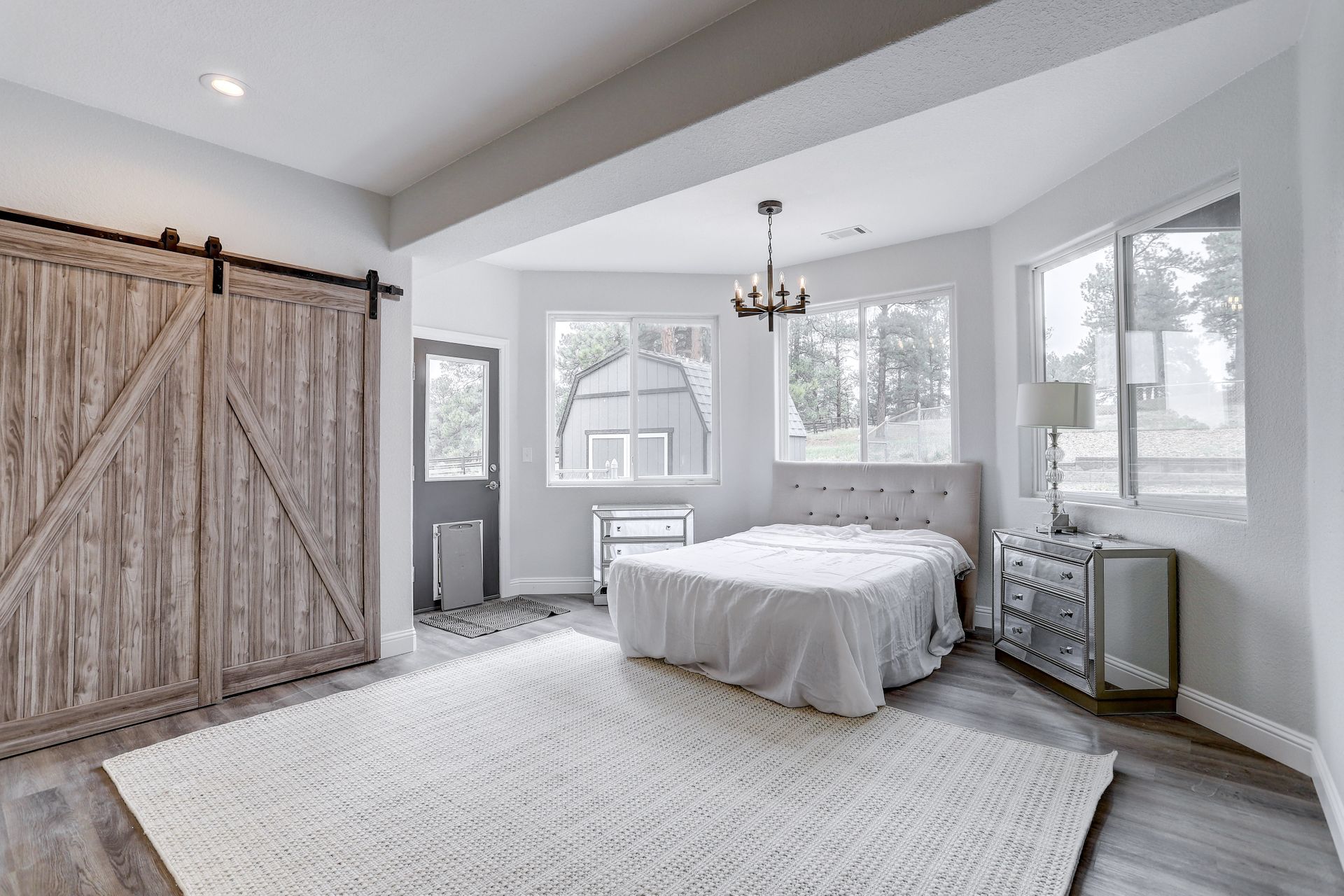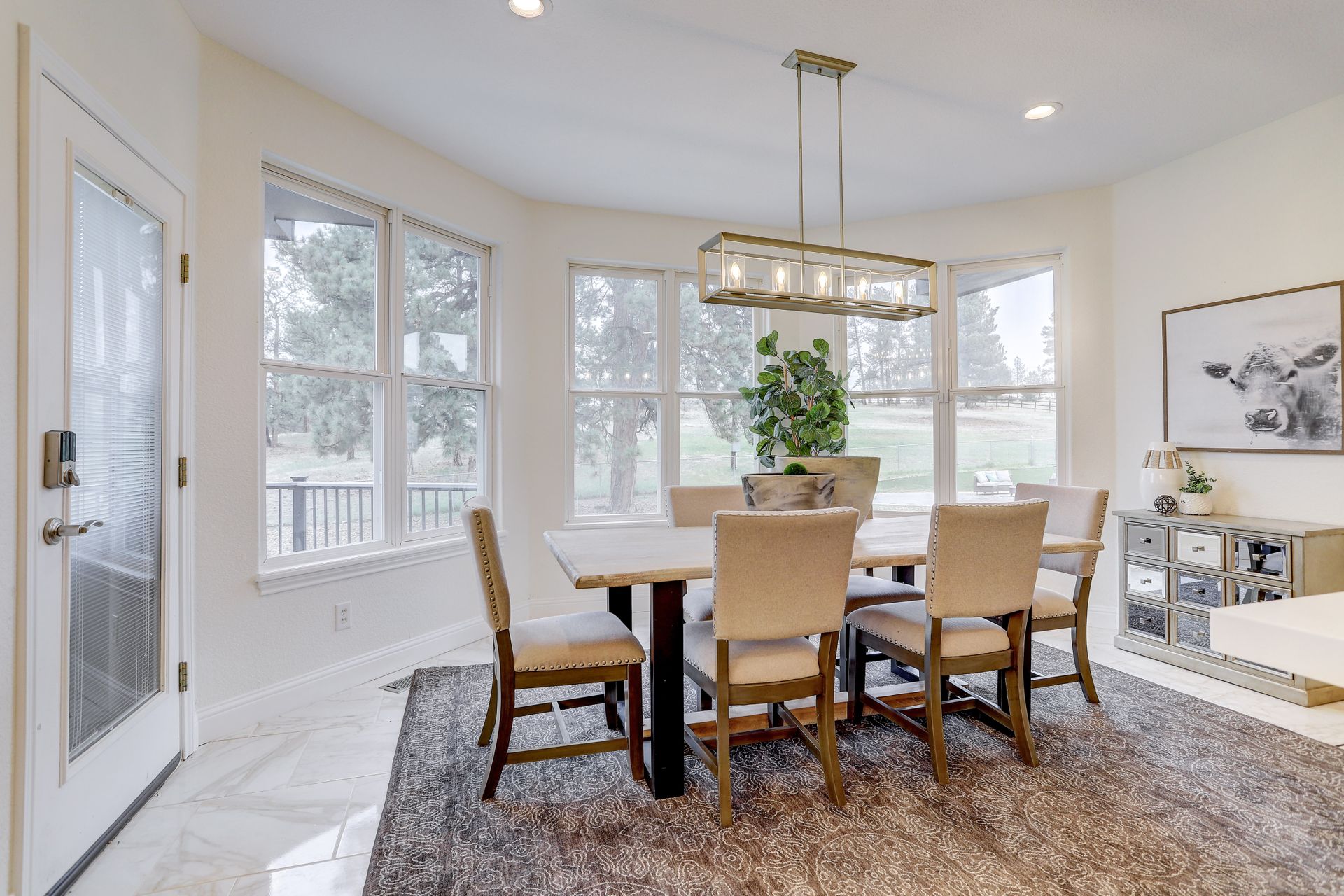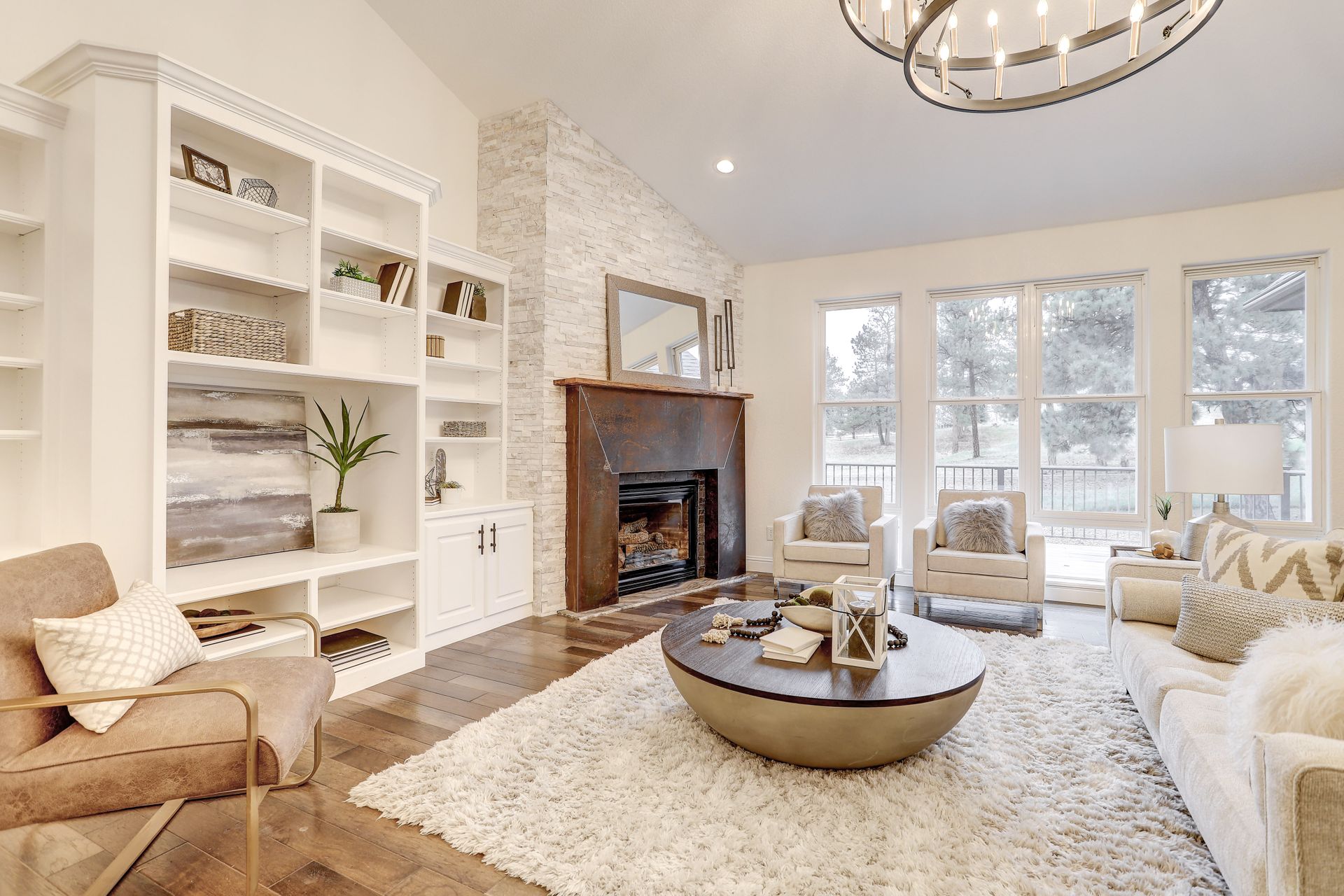 At once surprising and classic, nestled amongst the mature whispering pines on 2.65 acres this stunning Ponderosa Hills ranch home is the essence of Colorado living. Private country living yet close to modern conveniences and easy access to Denver and DIA. Head up onto the welcoming covered porch and into a vaulted foyer with a custom mosaic floor. The great room is grounded by a beveled metal and stone surround fireplace and features a two-tiered chandelier that compliments the high ceilings and open floor plan. Sophistication abounds in the chef’s kitchen finished with an interior pop of metallic brushed gold features, open shelving and two-toned Merillat Masterpiece cabinetry. The oversized eating area offers gorgeous private views and flows out to the covered and uncovered deck spaces. The gracious primary main floor suite has deck access and a two-sided fireplace that allows enjoyment from the bedroom sitting area or the free-standing tub. The five-piece luxury bath has a steam shower. A private study with French doors and built ins, two bedrooms, two baths and spacious custom laundry room round out the first floor. The walkout lower level is an entertainer’s dream with a pool table and patio access. High ceilings and floor to ceiling built-ins provide an inviting living space that features an elegant galley seated home bar with an under-mount sink, display cabinets, dishwasher and bar refrigerator drawers. Additional flex space is ready as a gym or would make a great home theatre. Two large bedrooms with a shared five-piece luxury bath complete the lower level. Two furnaces/A/C units, two water heaters and ample storage. Tiered landscaping, multiple patios, fencing and storage shed.
