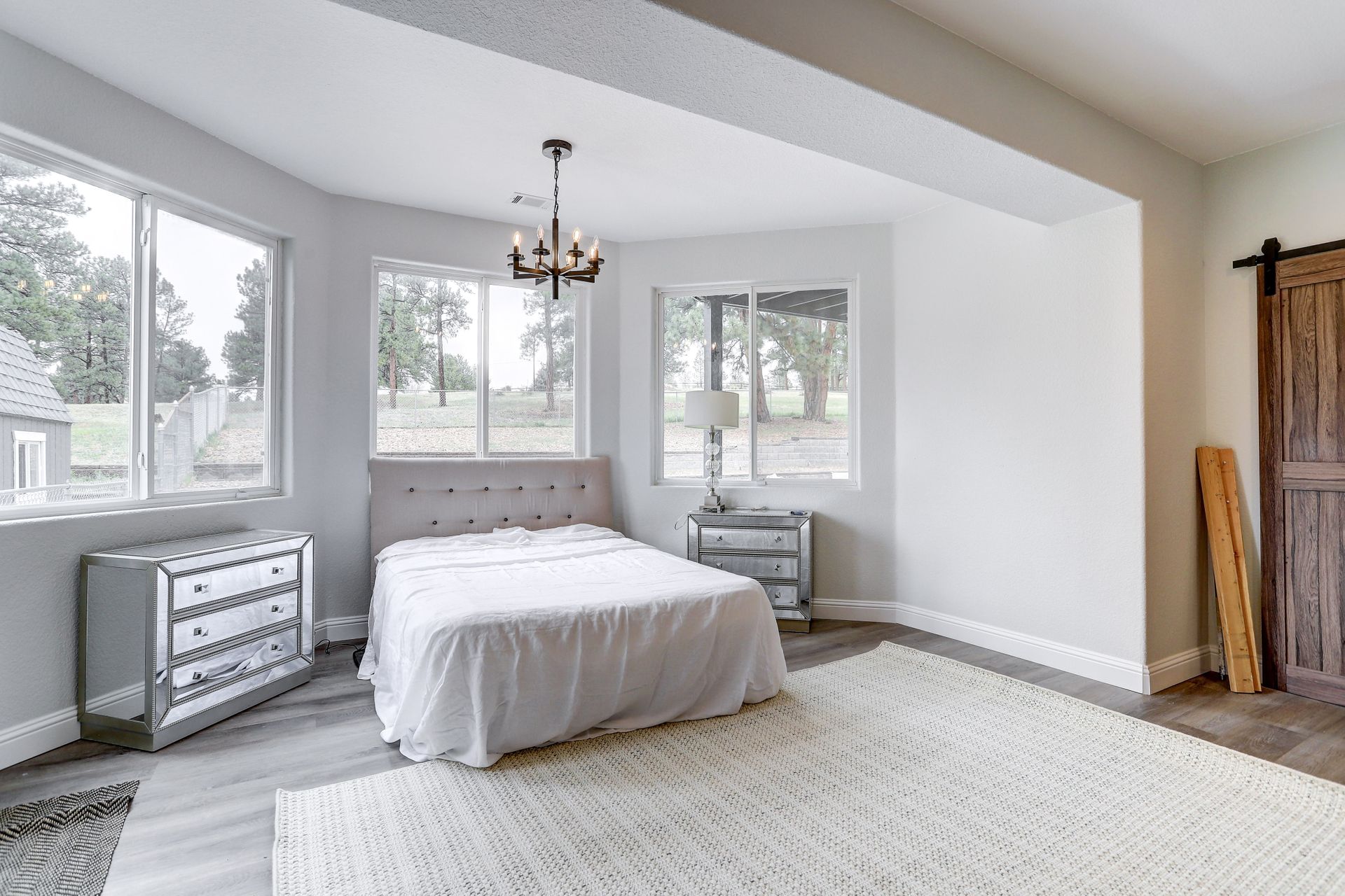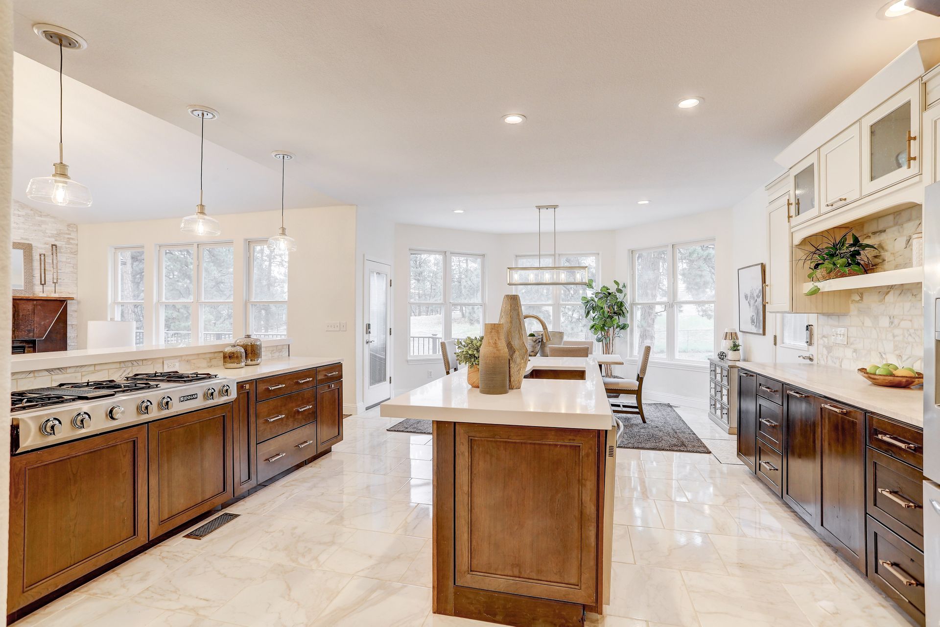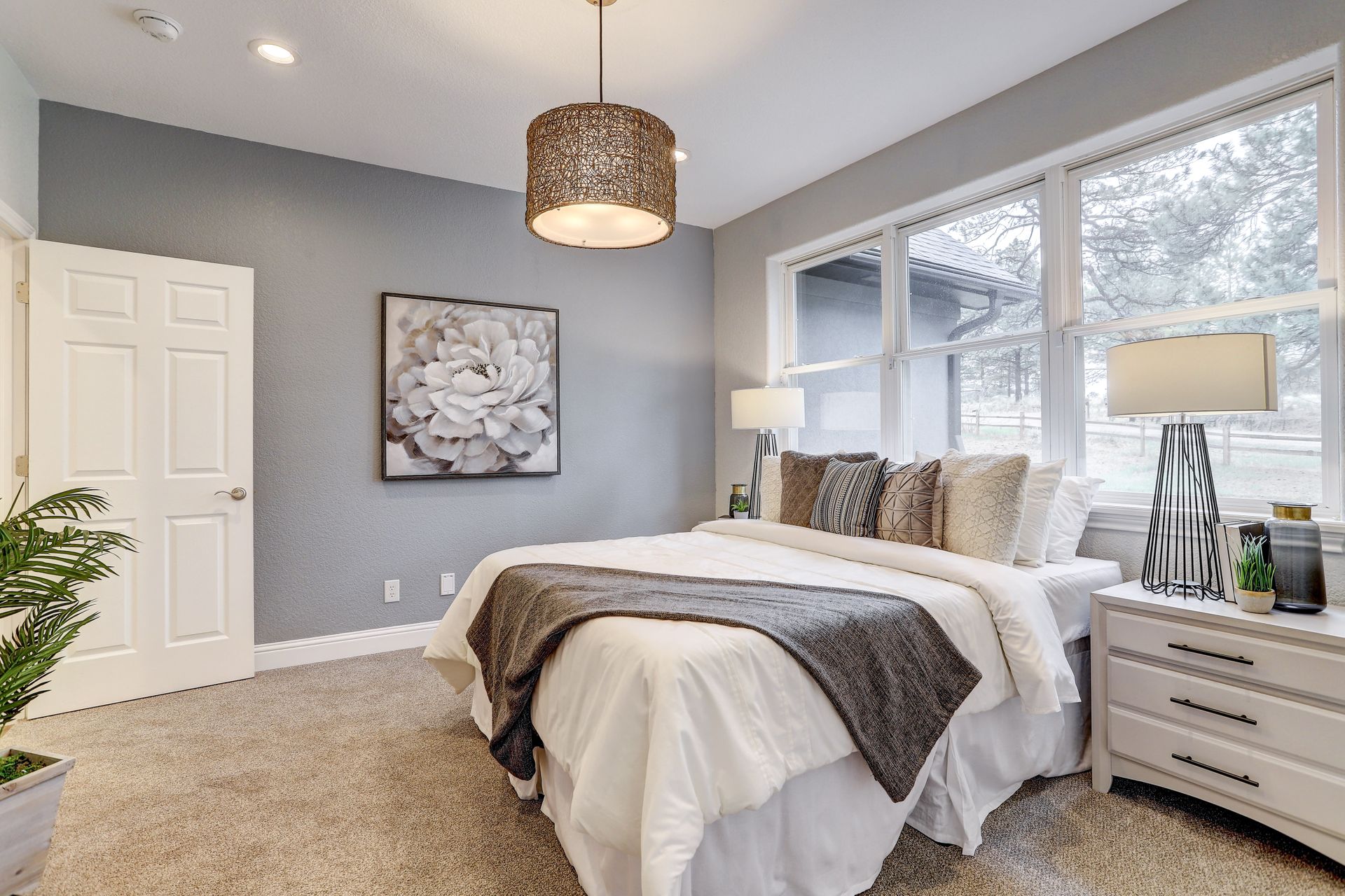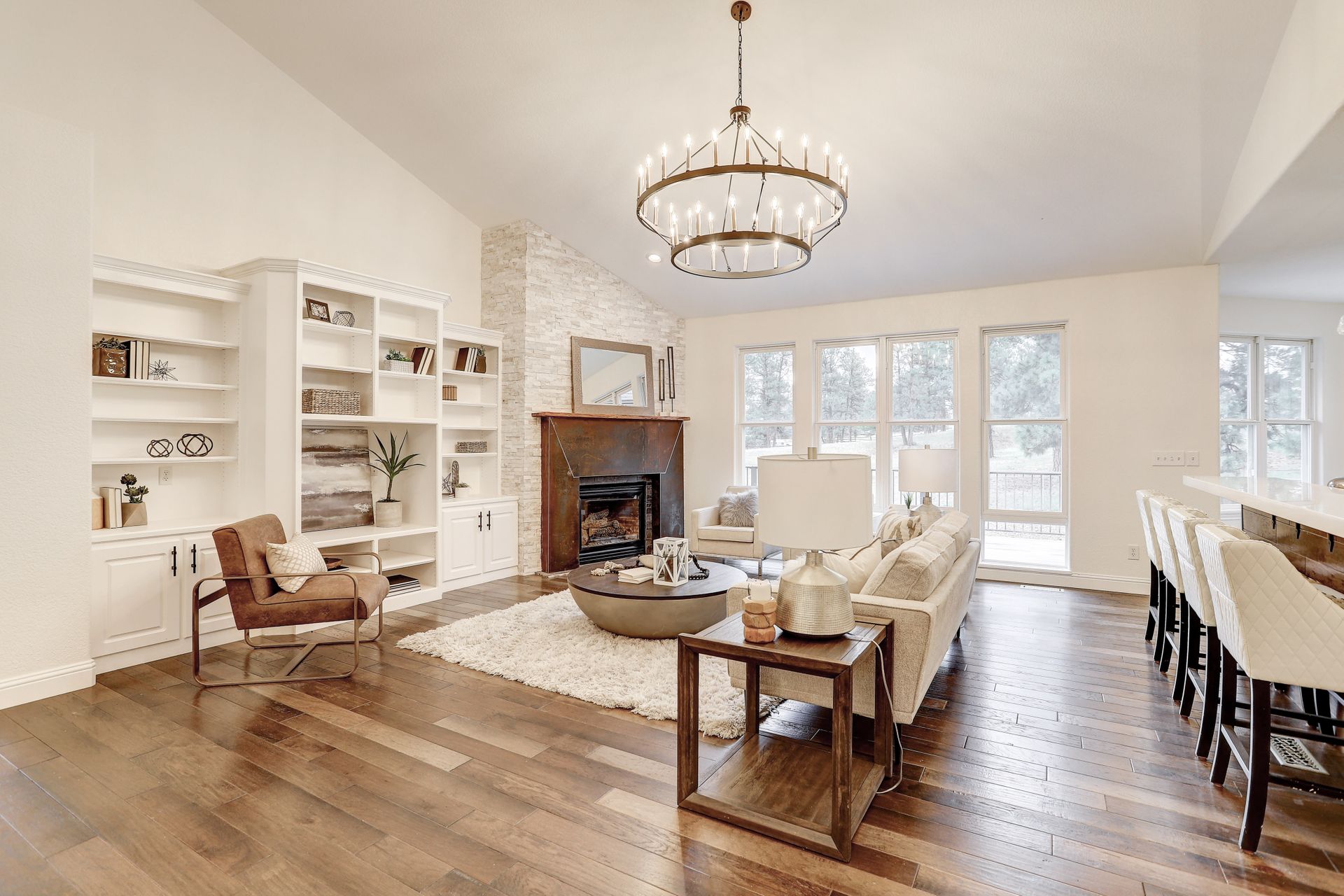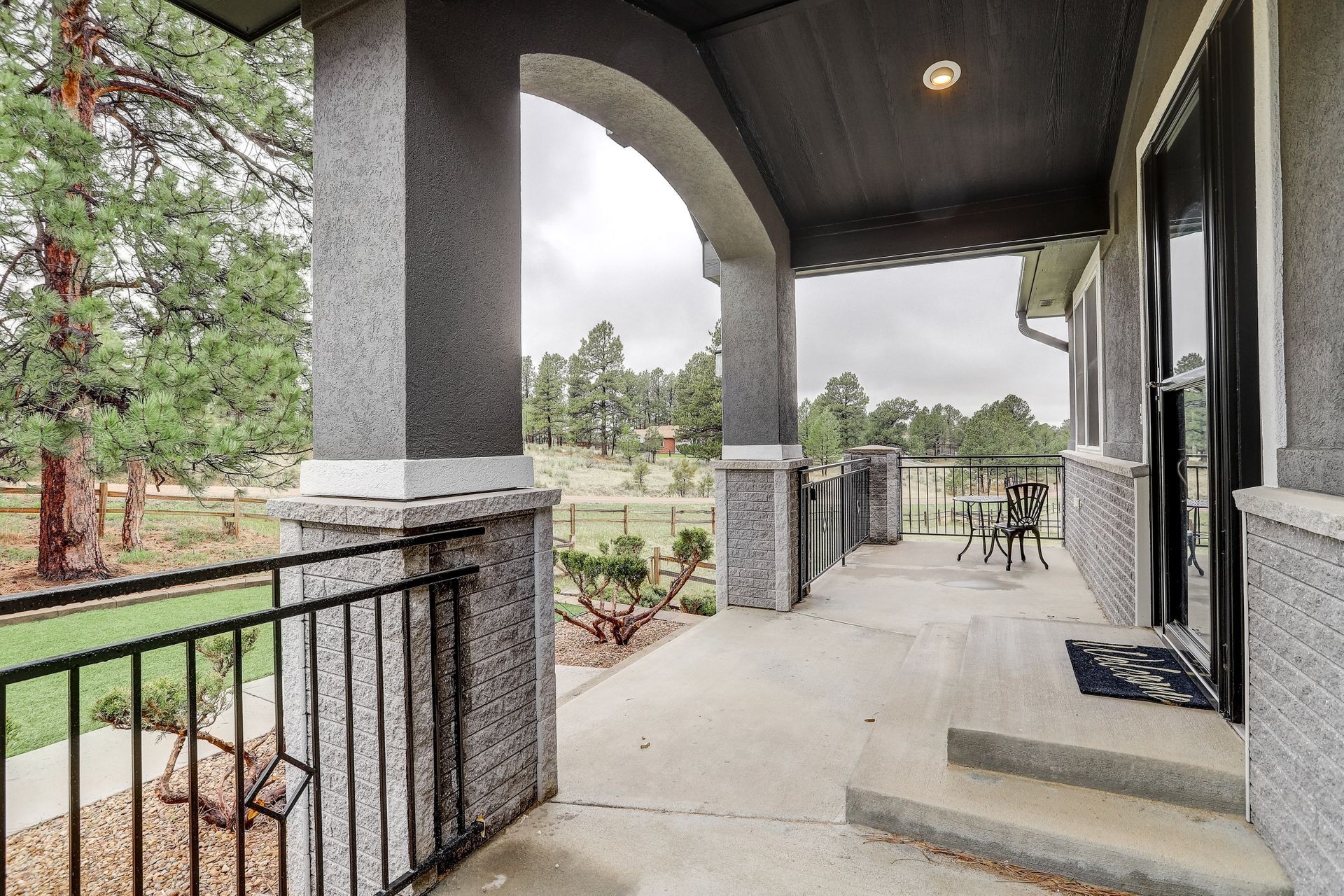 At once surprising and classic, nestled amongst the mature whispering pines on 2.65 acres this stunning Ponderosa Hills ranch home is the essence of Colorado living. Private country living yet close to modern conveniences and easy access to Denver and DIA. Head up onto the welcoming covered porch and into a vaulted foyer with a custom mosaic floor. The great room is grounded by a beveled metal and stone surround fireplace and features a two-tiered chandelier that compliments the high ceilings and open floor plan. Sophistication abounds in the chef’s kitchen finished with an interior pop of metallic brushed gold features, open shelving and two-toned Merillat Masterpiece cabinetry. The oversized eating area offers gorgeous private views and flows out to the covered and uncovered deck spaces. The gracious primary main floor suite has deck access and a two-sided fireplace that allows enjoyment from the bedroom sitting area or the free-standing tub. The five-piece luxury bath has a steam shower. A private study with French doors and built ins, two bedrooms, two baths and spacious custom laundry room round out the first floor. The walkout lower level is an entertainer’s dream with a pool table and patio access. High ceilings and floor to ceiling built-ins provide an inviting living space that features an elegant galley seated home bar with an under-mount sink, display cabinets, dishwasher and bar refrigerator drawers. Additional flex space is ready as a gym or would make a great home theatre. Two large bedrooms with a shared five-piece luxury bath complete the lower level. Two furnaces/A/C units, two water heaters and ample storage. Tiered landscaping, multiple patios, fencing and storage shed.