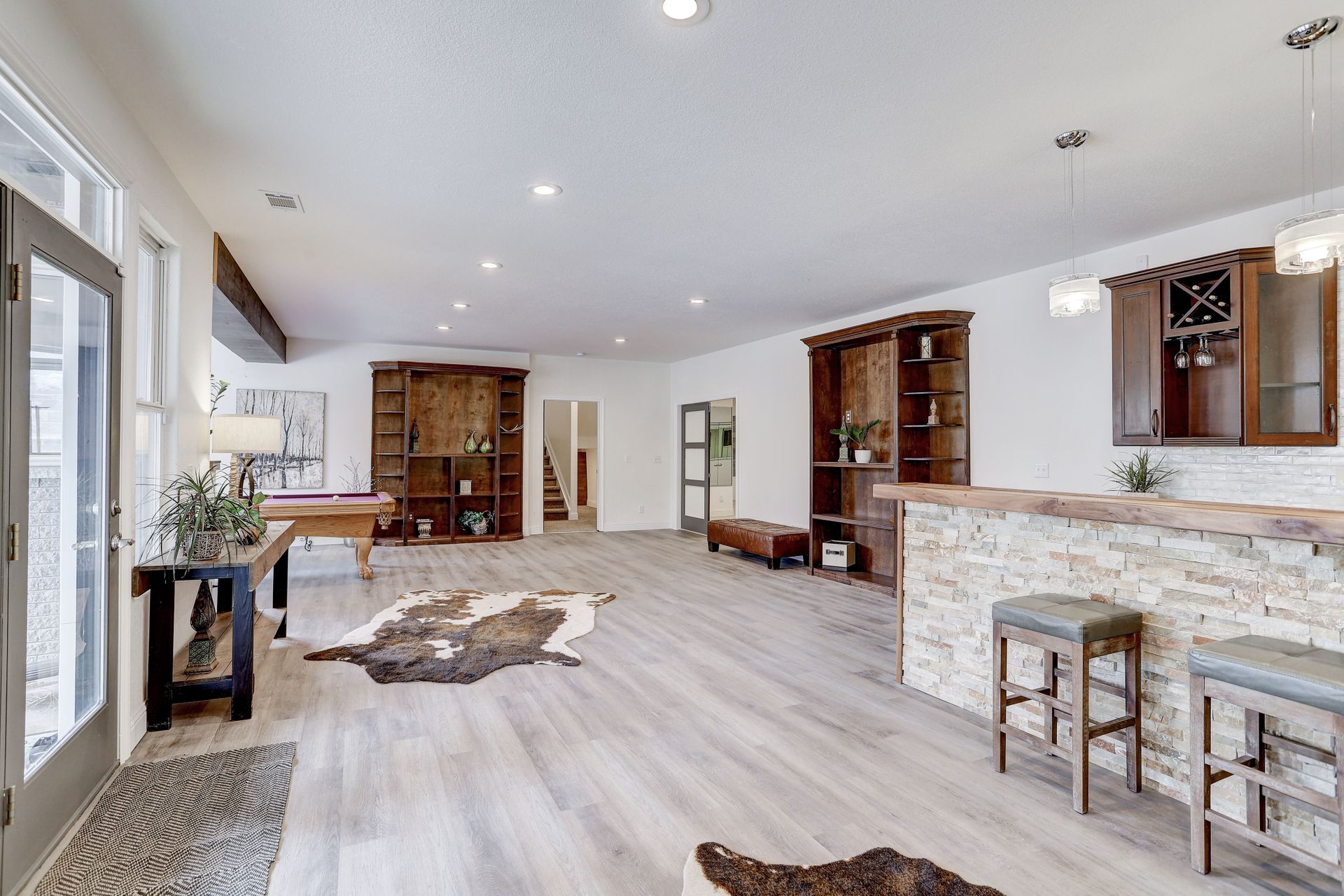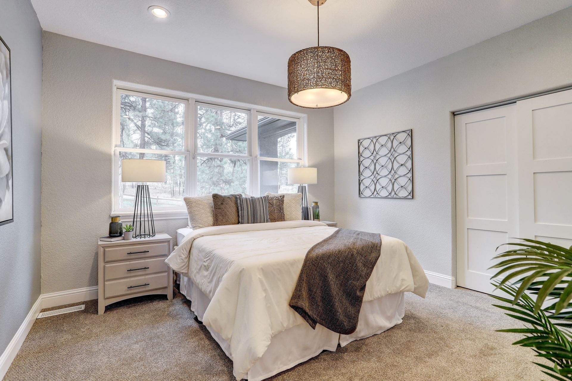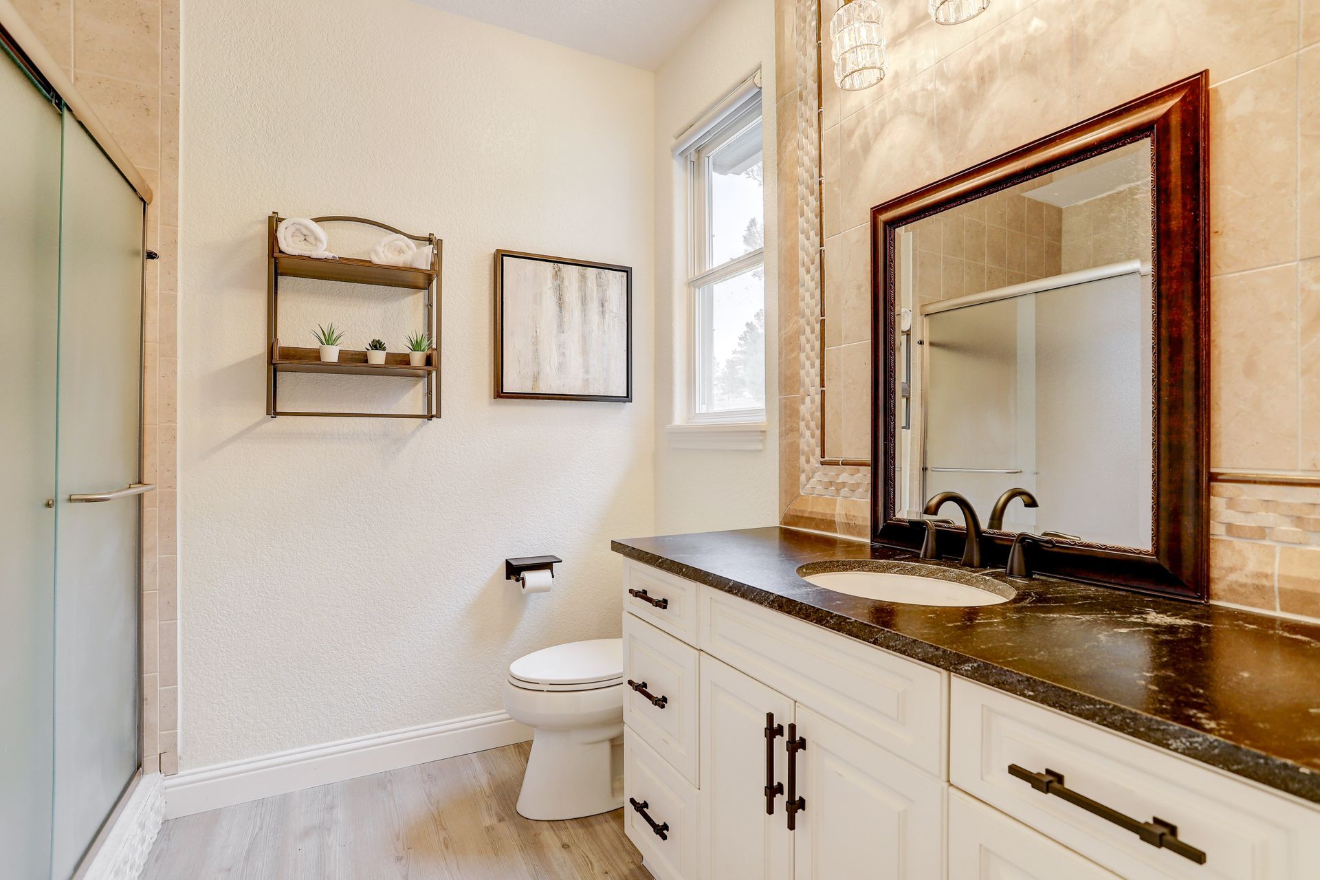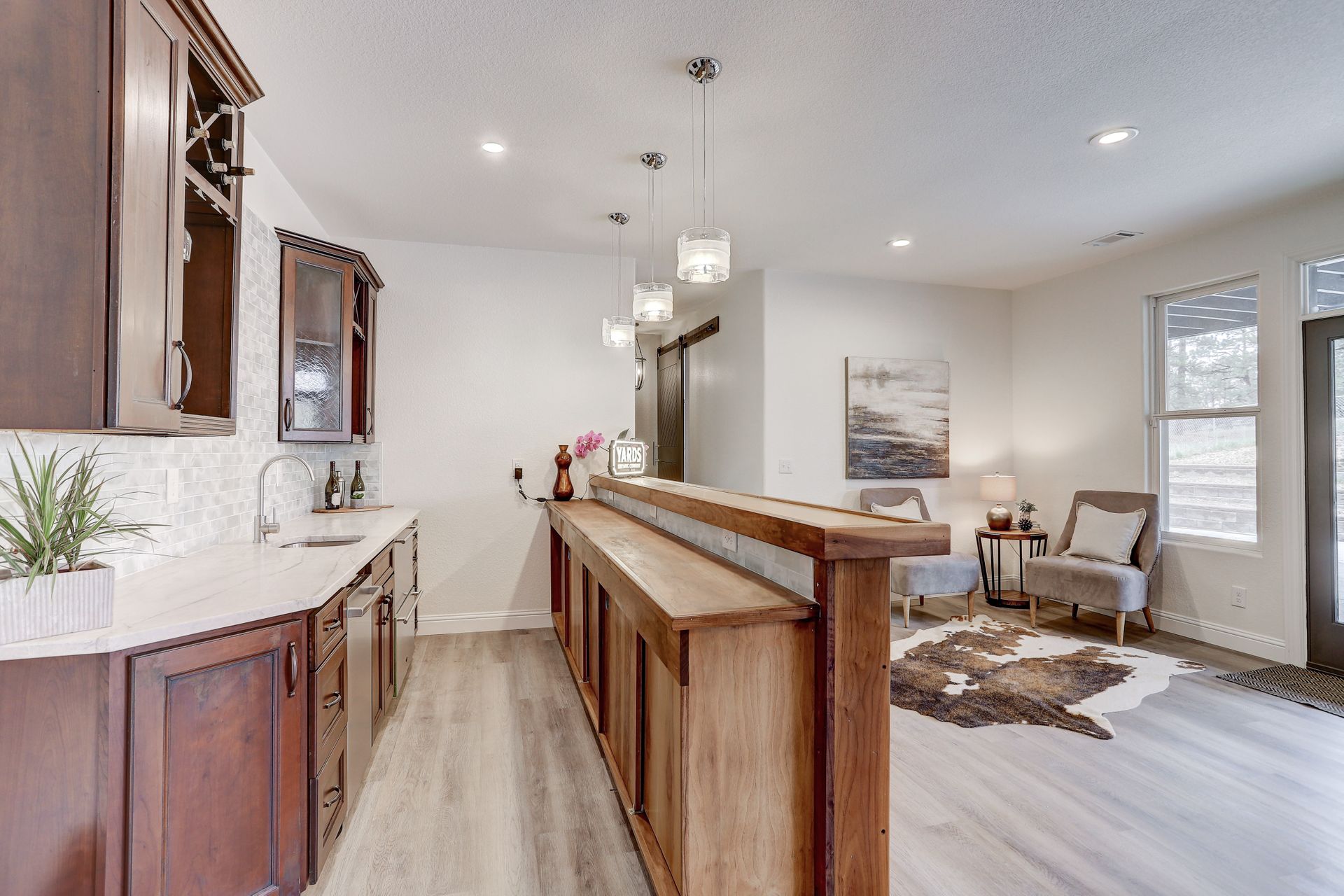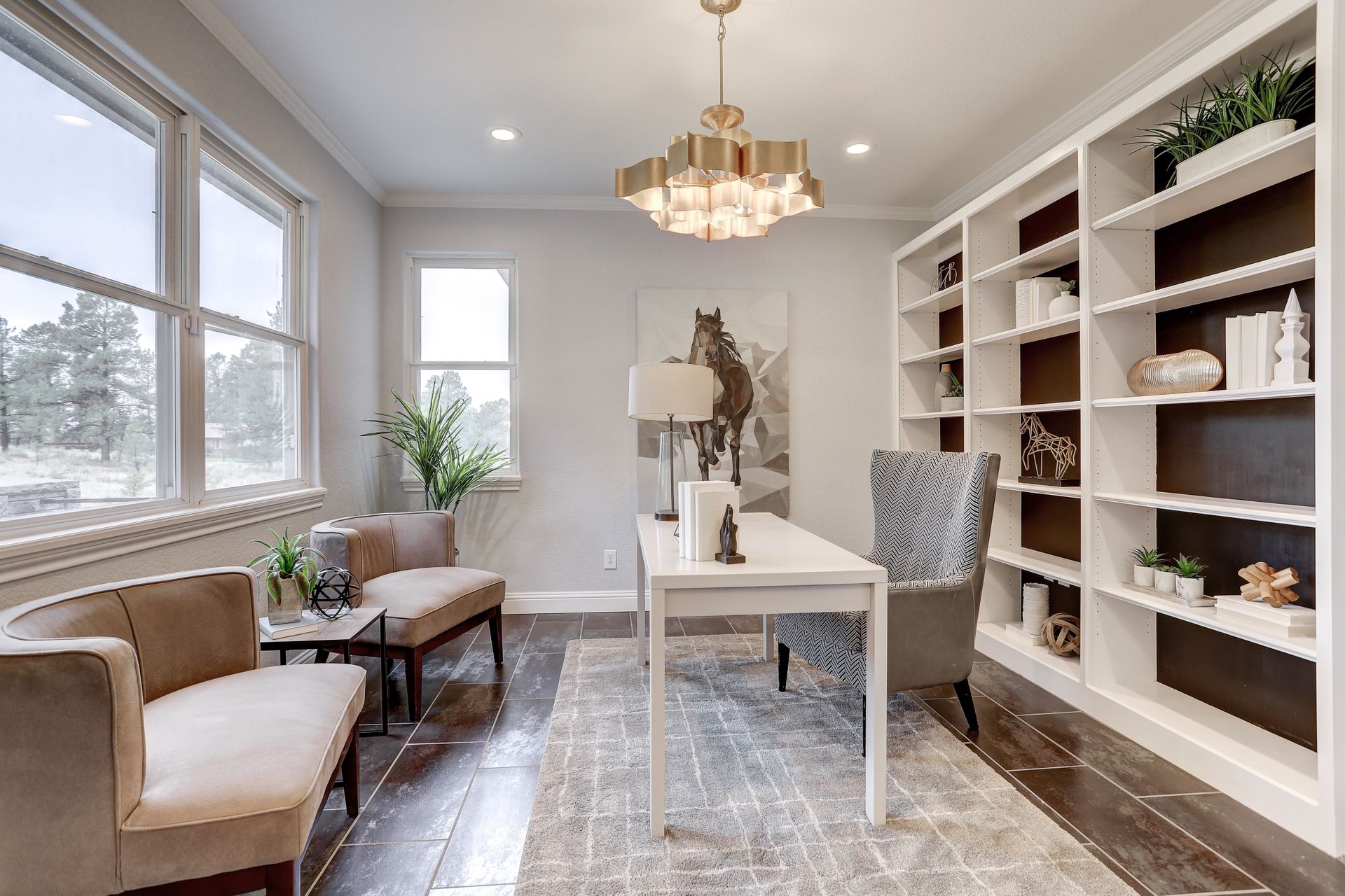 At once surprising and classic, nestled amongst the mature whispering pines on 2.65 acres this stunning Ponderosa Hills ranch home is the essence of Colorado living. Private country living yet close to modern conveniences and easy access to Denver and DIA. Head up onto the welcoming covered porch and into a vaulted foyer with a custom mosaic floor. The great room is grounded by a beveled metal and stone surround fireplace and features a two-tiered chandelier that compliments the high ceilings and open floor plan. Sophistication abounds in the chef’s kitchen finished with an interior pop of metallic brushed gold features, open shelving and two-toned Merillat Masterpiece cabinetry. The oversized eating area offers gorgeous private views and flows out to the covered and uncovered deck spaces. The gracious primary main floor suite has deck access and a two-sided fireplace that allows enjoyment from the bedroom sitting area or the free-standing tub. The five-piece luxury bath has a steam shower. A private study with French doors and built ins, two bedrooms, two baths and spacious custom laundry room round out the first floor. The walkout lower level is an entertainer’s dream with a pool table and patio access. High ceilings and floor to ceiling built-ins provide an inviting living space that features an elegant galley seated home bar with an under-mount sink, display cabinets, dishwasher and bar refrigerator drawers. Additional flex space is ready as a gym or would make a great home theatre. Two large bedrooms with a shared five-piece luxury bath complete the lower level. Two furnaces/A/C units, two water heaters and ample storage. Tiered landscaping, multiple patios, fencing and storage shed.