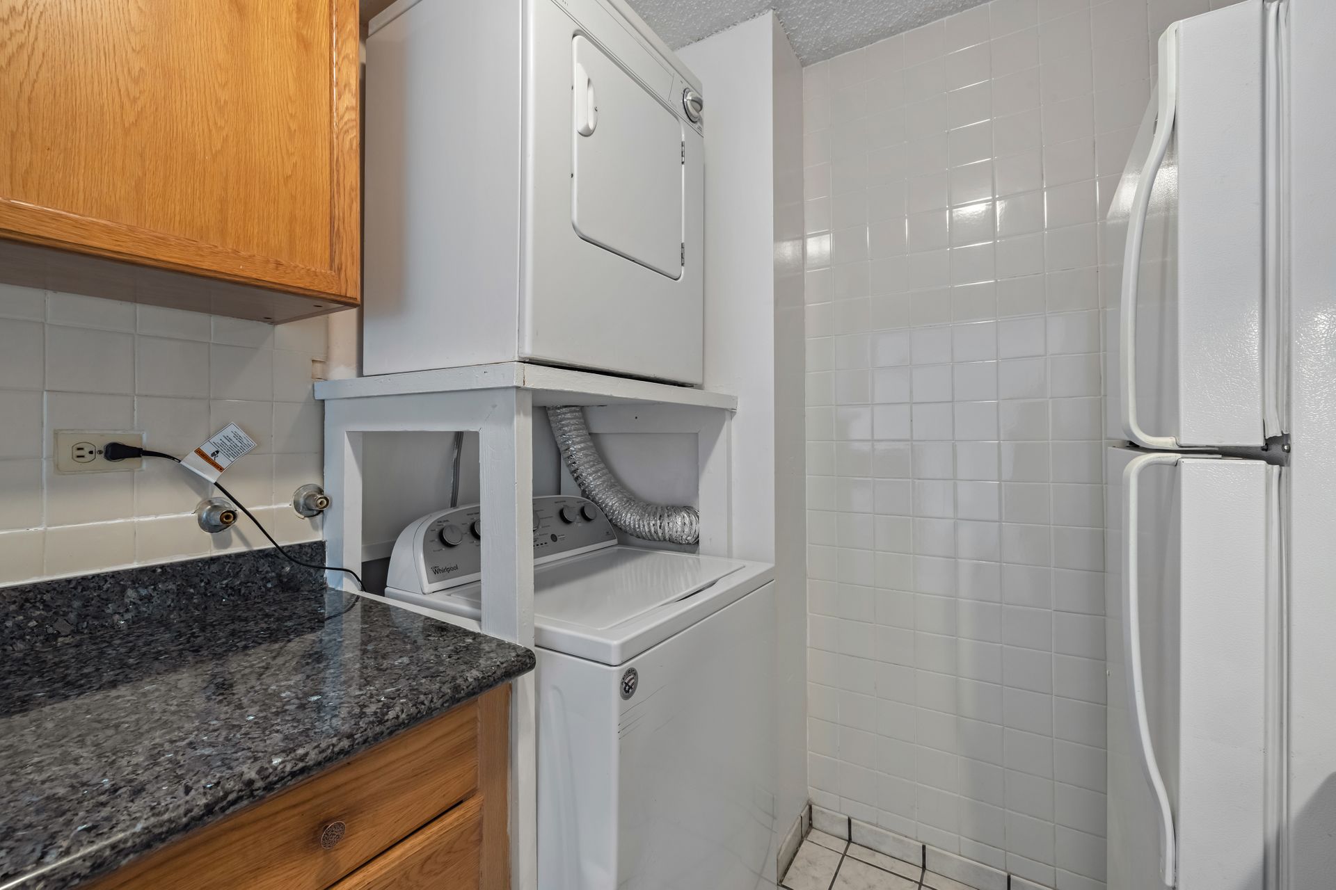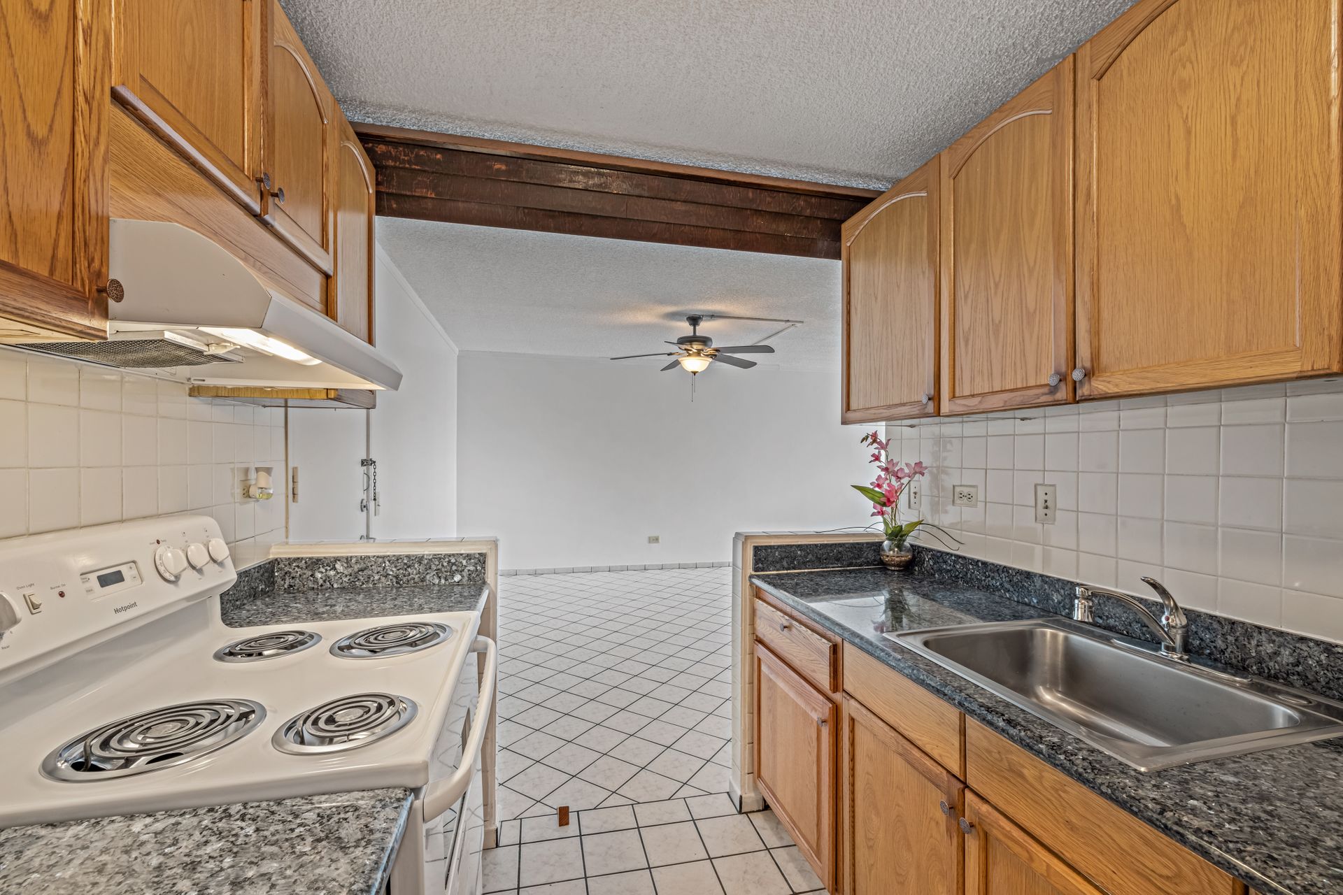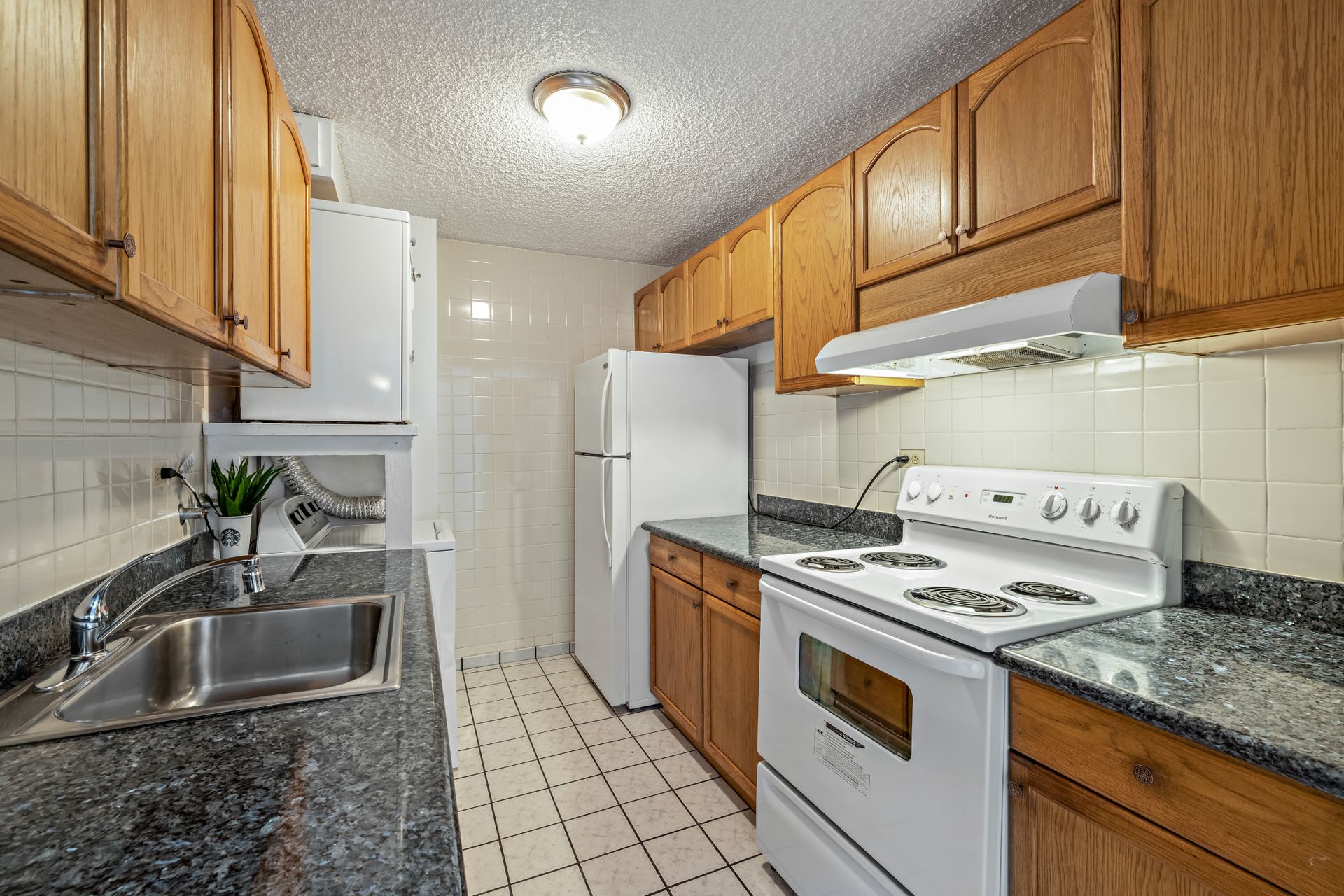 Bright and spacious open floor plan. This home has been nicely upgraded with ceramic tile flooring throughout, granite kitchen counters, newer appliances with washer and dryer and a freshly painted interior. Move-in ready! Must see to appreciate. Selling in "As Is" condition.