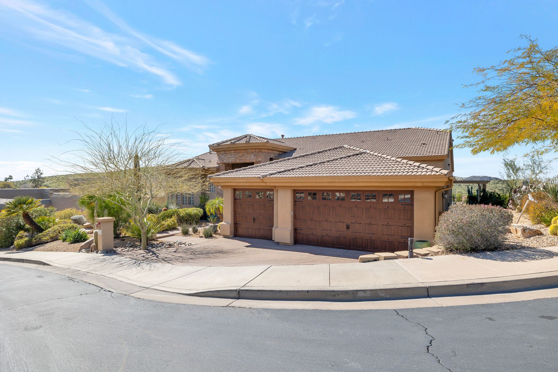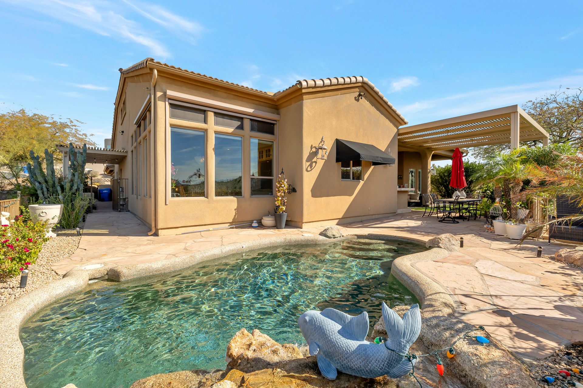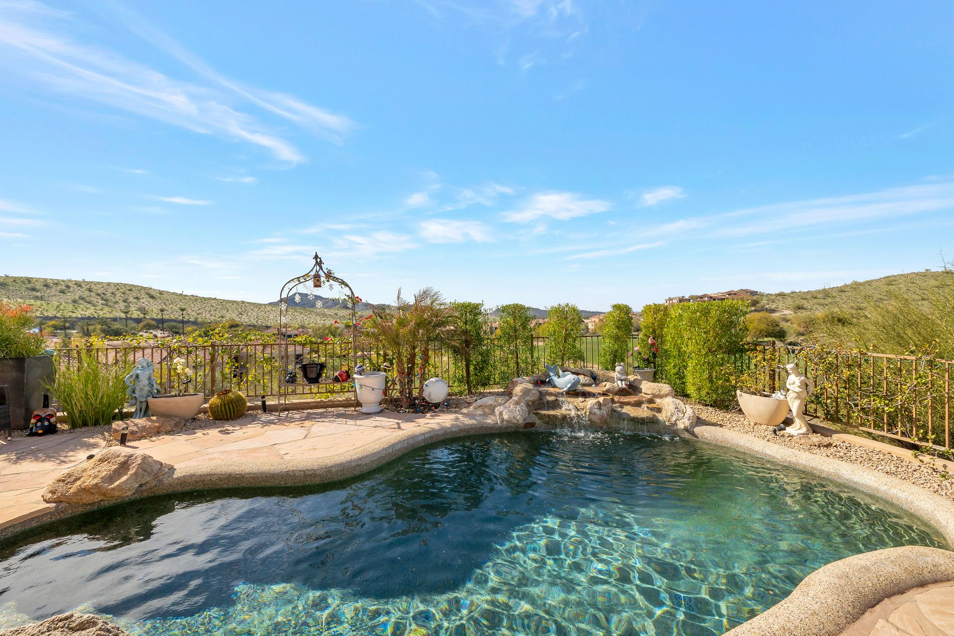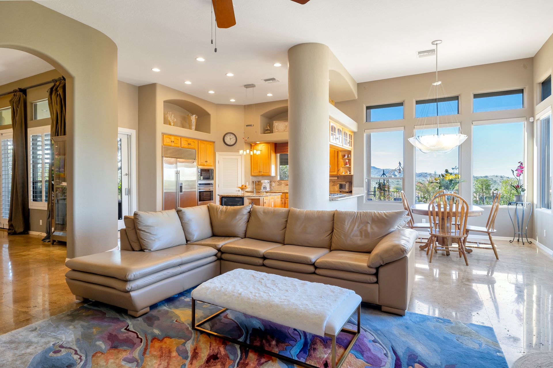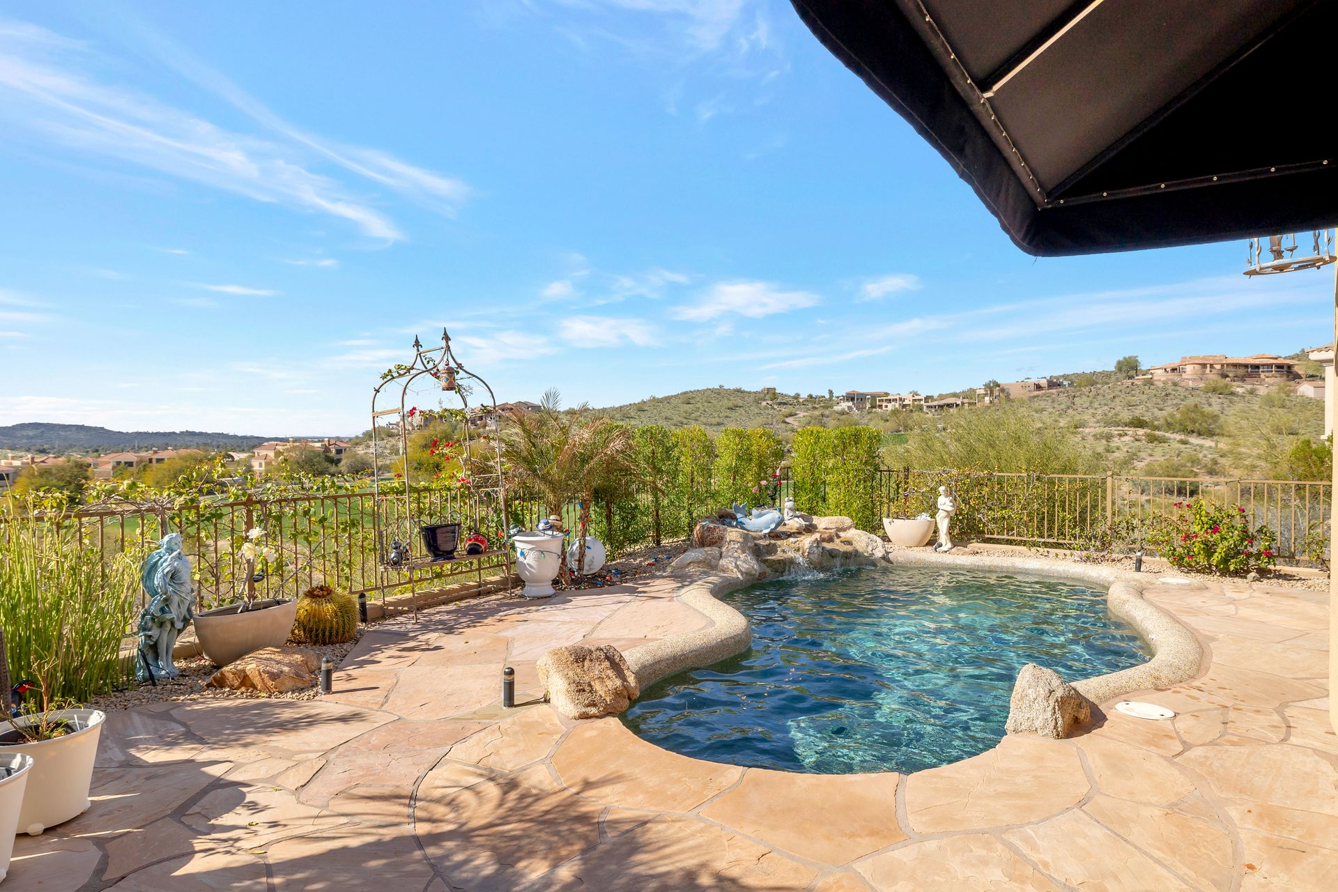 This Ridge at Lookout Mountain property offers a combination of luxurious features and natural beauty. The elevated, hillside location delivers unparalleled sunset, golf and mountain views in a gated community overlooking Lookout Mountain Golf Club. The well-designed floorplan is tailored for entertaining and the kitchen is a standout feature with custom cabinetry and high-end SubZero and Wolf appliances. The owner's suite, separated from other bedrooms, provides a lavish escape with a sitting area, gas fireplace, two walk-in closets, jetted tub and a walk-in shower. The low-maintenance backyard enhances the outdoor living experience with a covered patio, PebbleTec pool, built-in BBQ and artificial turf, creating a perfect retreat. Other features include solar panels, a new roof and a tankless water heater, contributing to energy efficiency. Additional recent improvements are all new smart locks, shutters, invisible screen doors, electronic window screens, both a water softener and reverse osmosis, new insulated garage doors, two pergolas, gutters and a backyard gate. Overall, this residence combines modern elegance with its natural surroundings, offering a luxurious and tranquil lifestyle for those seeking a sophisticated home with breathtaking views and upscale amenities. 4 BD, 3 BA, 3 CG, 3410