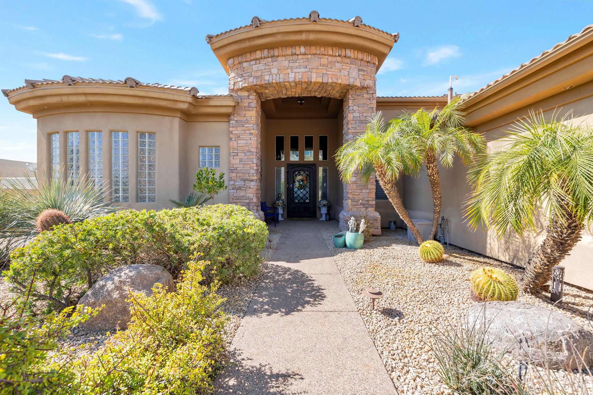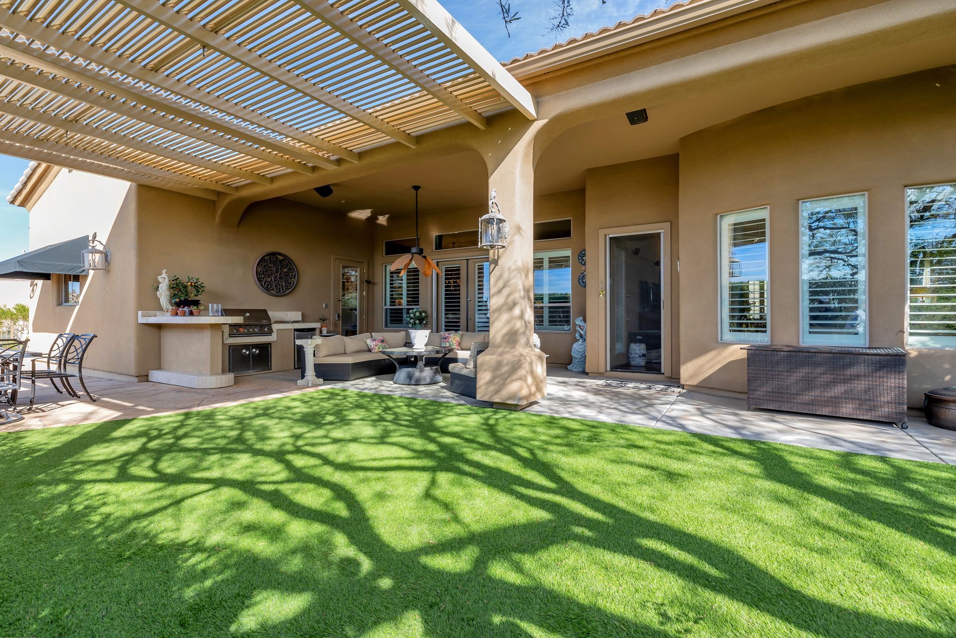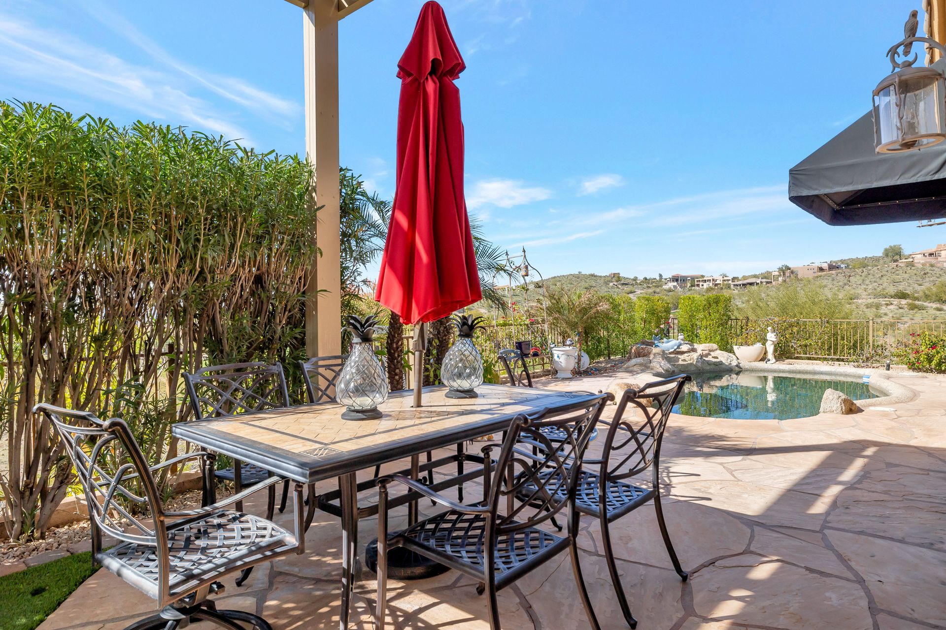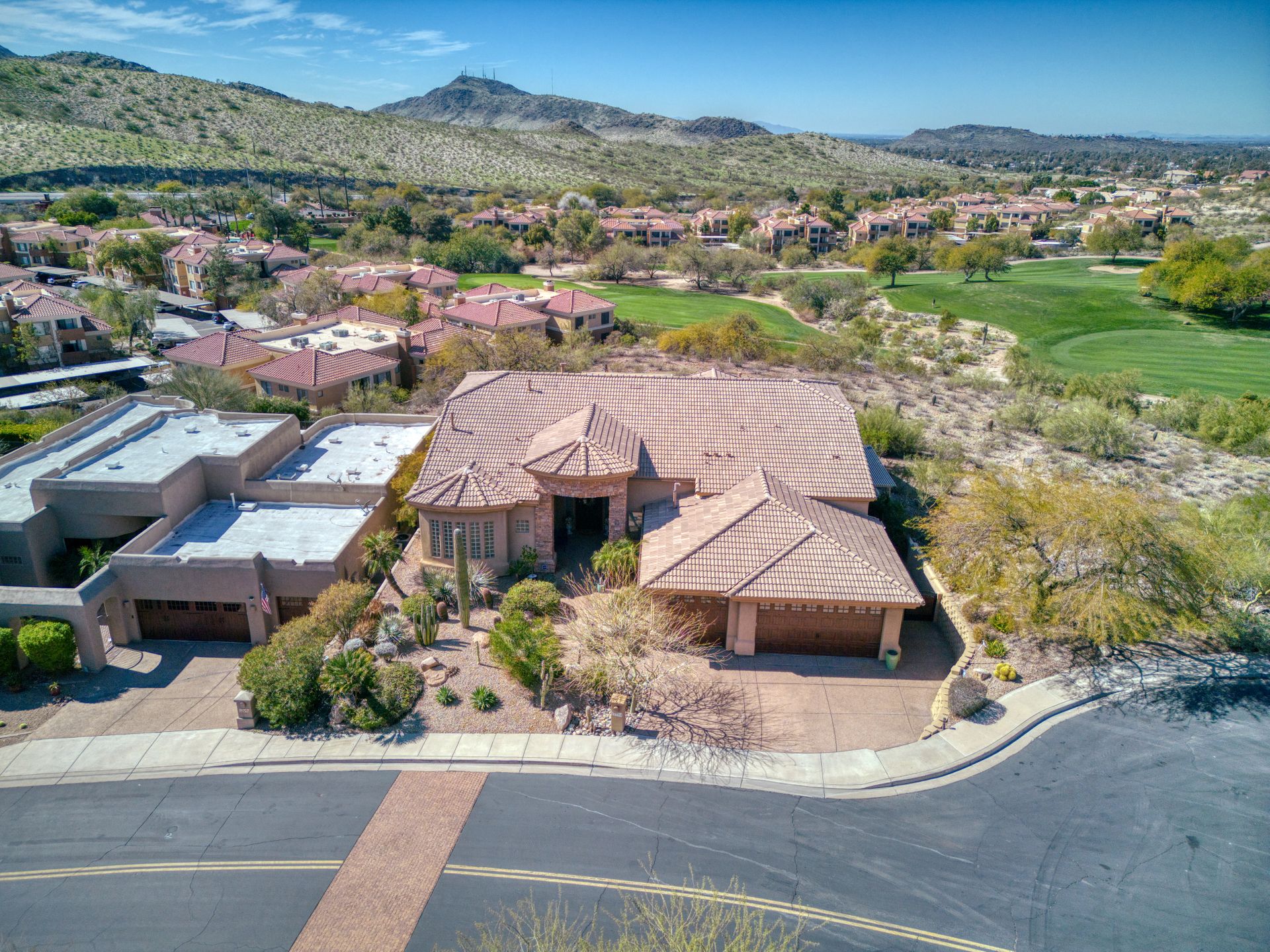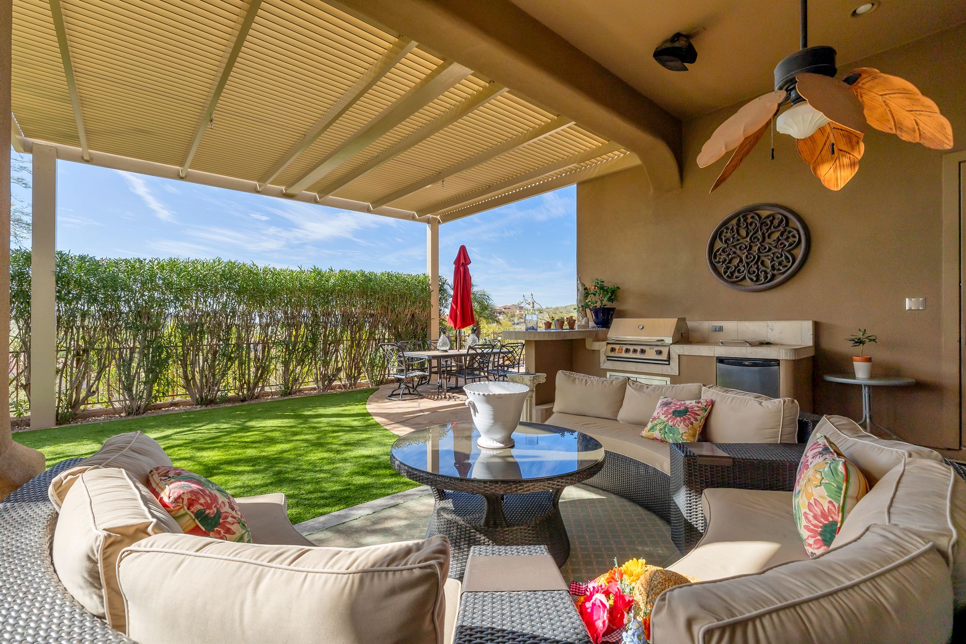 This Ridge at Lookout Mountain property offers a combination of luxurious features and natural beauty. The elevated, hillside location delivers unparalleled sunset, golf and mountain views in a gated community overlooking Lookout Mountain Golf Club. The well-designed floorplan is tailored for entertaining and the kitchen is a standout feature with custom cabinetry and high-end SubZero and Wolf appliances. The owner's suite, separated from other bedrooms, provides a lavish escape with a sitting area, gas fireplace, two walk-in closets, jetted tub and a walk-in shower. The low-maintenance backyard enhances the outdoor living experience with a covered patio, PebbleTec pool, built-in BBQ and artificial turf, creating a perfect retreat. Other features include solar panels, a new roof and a tankless water heater, contributing to energy efficiency. Additional recent improvements are all new smart locks, shutters, invisible screen doors, electronic window screens, both a water softener and reverse osmosis, new insulated garage doors, two pergolas, gutters and a backyard gate. Overall, this residence combines modern elegance with its natural surroundings, offering a luxurious and tranquil lifestyle for those seeking a sophisticated home with breathtaking views and upscale amenities. 4 BD, 3 BA, 3 CG, 3410