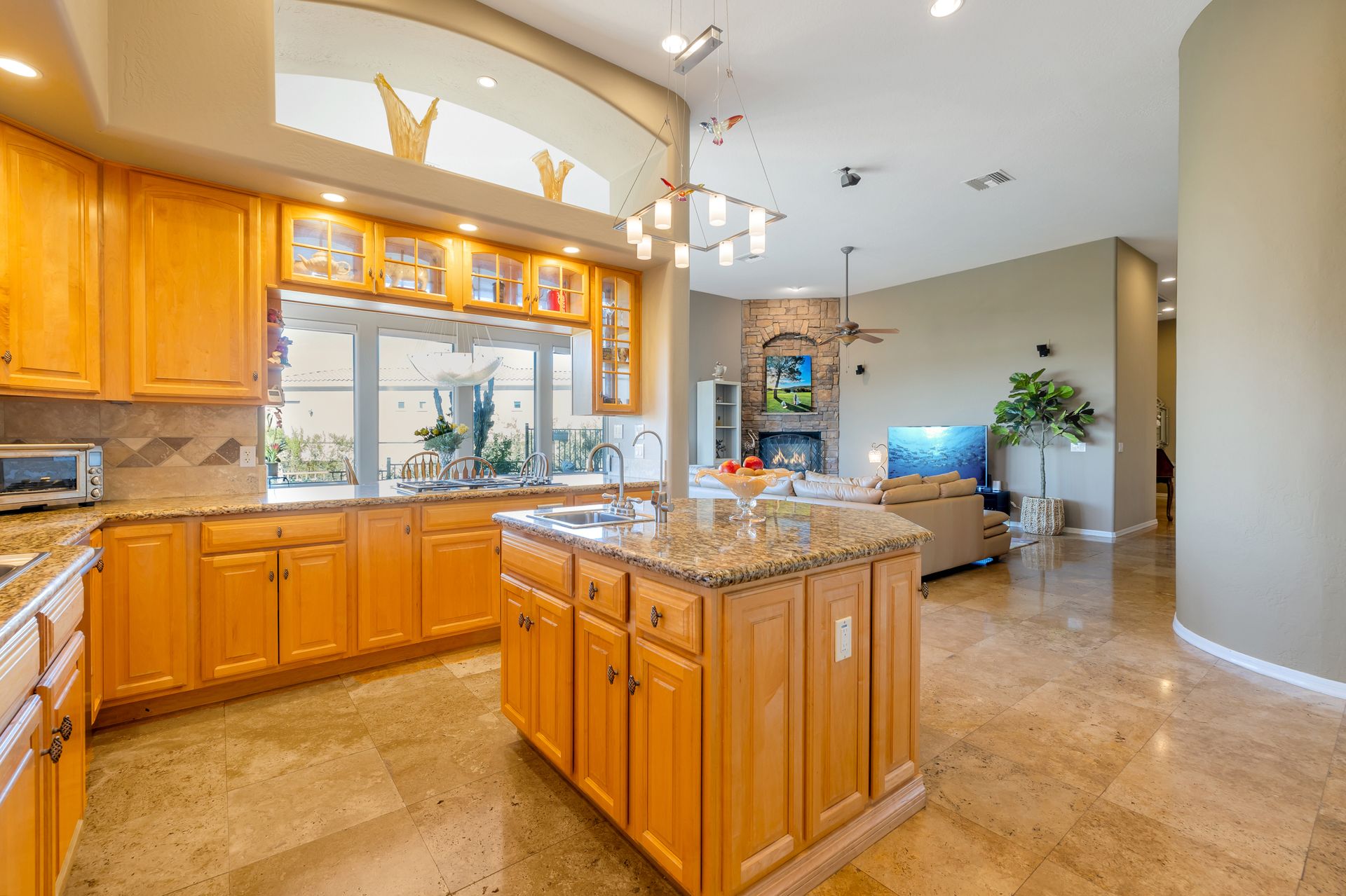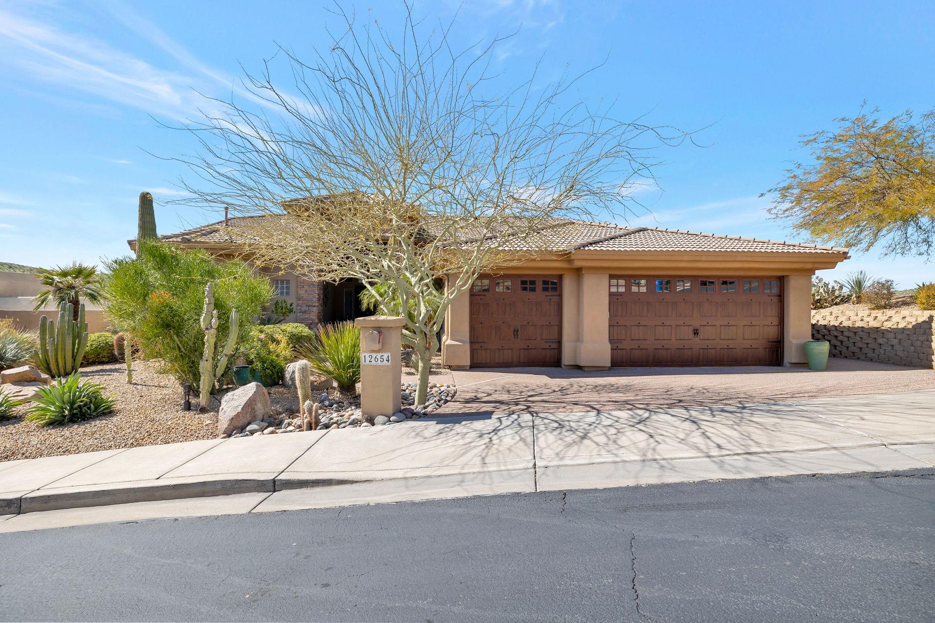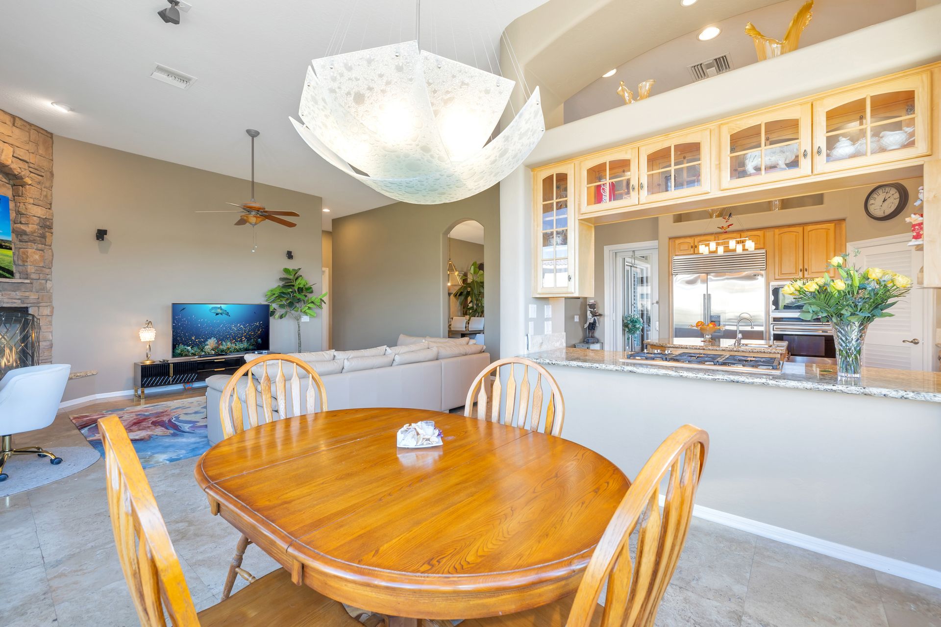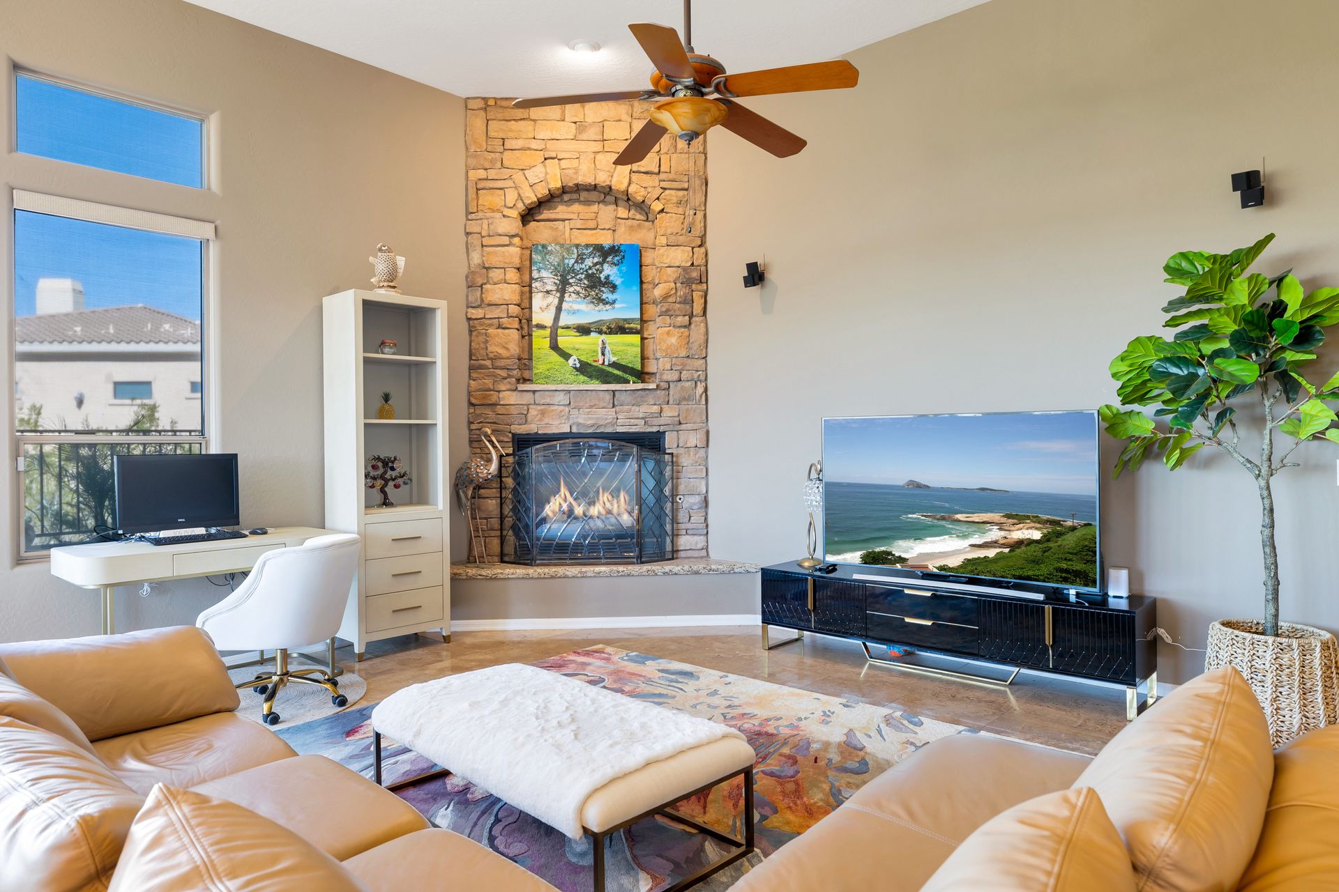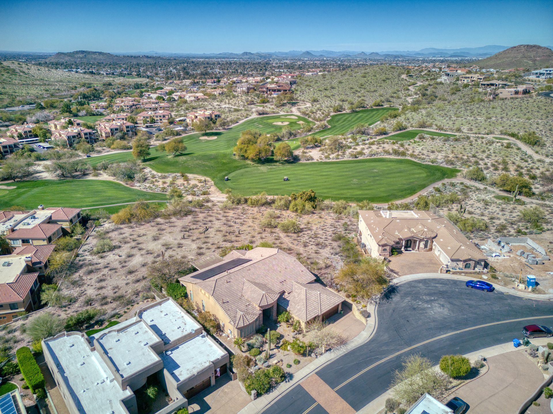 This Ridge at Lookout Mountain property offers a combination of luxurious features and natural beauty. The elevated, hillside location delivers unparalleled sunset, golf and mountain views in a gated community overlooking Lookout Mountain Golf Club. The well-designed floorplan is tailored for entertaining and the kitchen is a standout feature with custom cabinetry and high-end SubZero and Wolf appliances. The owner's suite, separated from other bedrooms, provides a lavish escape with a sitting area, gas fireplace, two walk-in closets, jetted tub and a walk-in shower. The low-maintenance backyard enhances the outdoor living experience with a covered patio, PebbleTec pool, built-in BBQ and artificial turf, creating a perfect retreat. Other features include solar panels, a new roof and a tankless water heater, contributing to energy efficiency. Additional recent improvements are all new smart locks, shutters, invisible screen doors, electronic window screens, both a water softener and reverse osmosis, new insulated garage doors, two pergolas, gutters and a backyard gate. Overall, this residence combines modern elegance with its natural surroundings, offering a luxurious and tranquil lifestyle for those seeking a sophisticated home with breathtaking views and upscale amenities. 4 BD, 3 BA, 3 CG, 3410