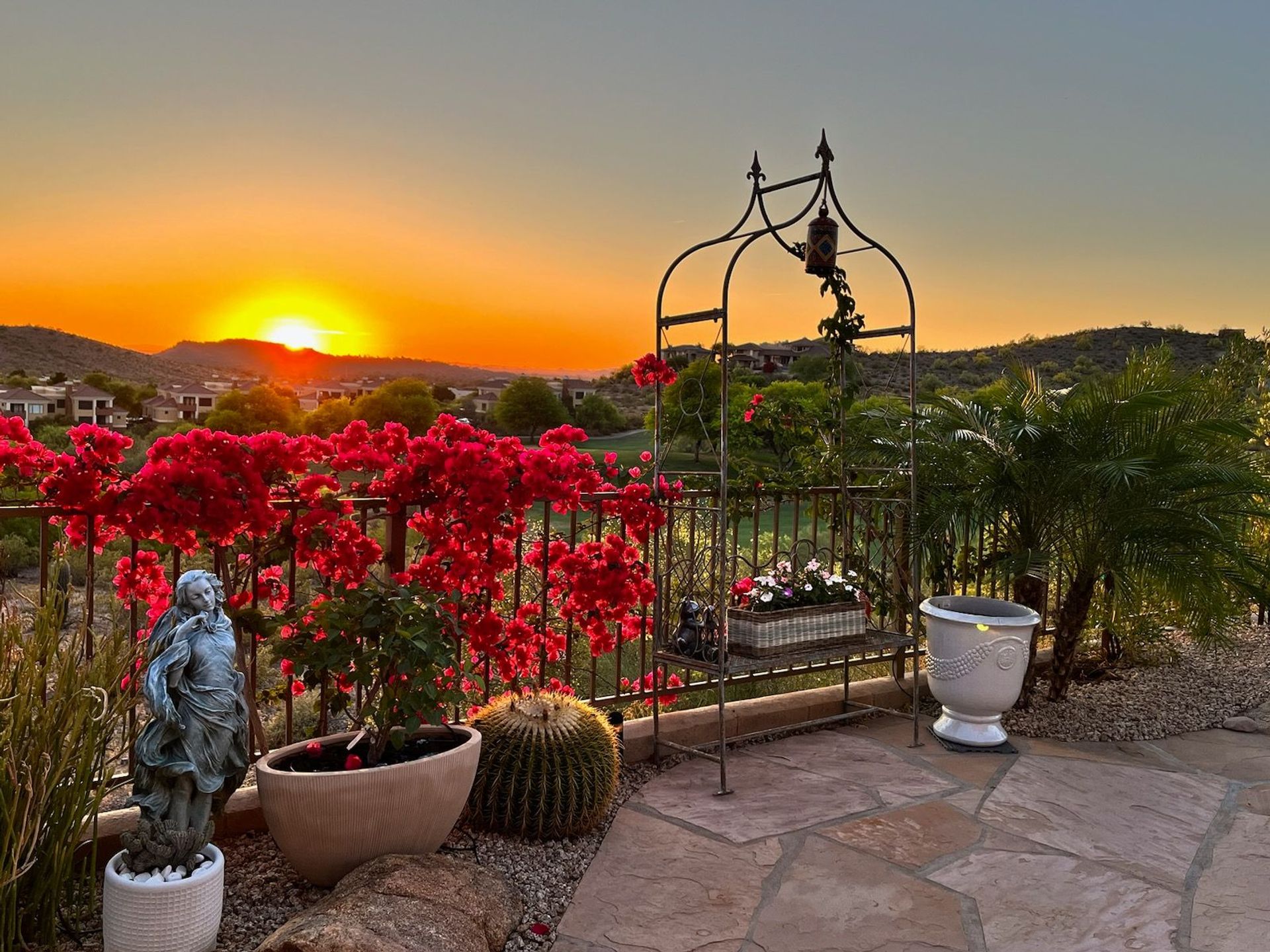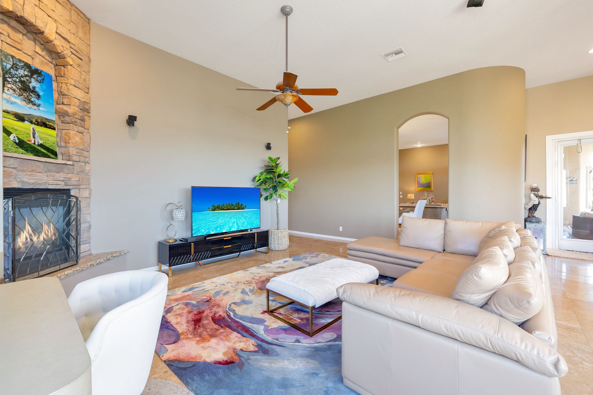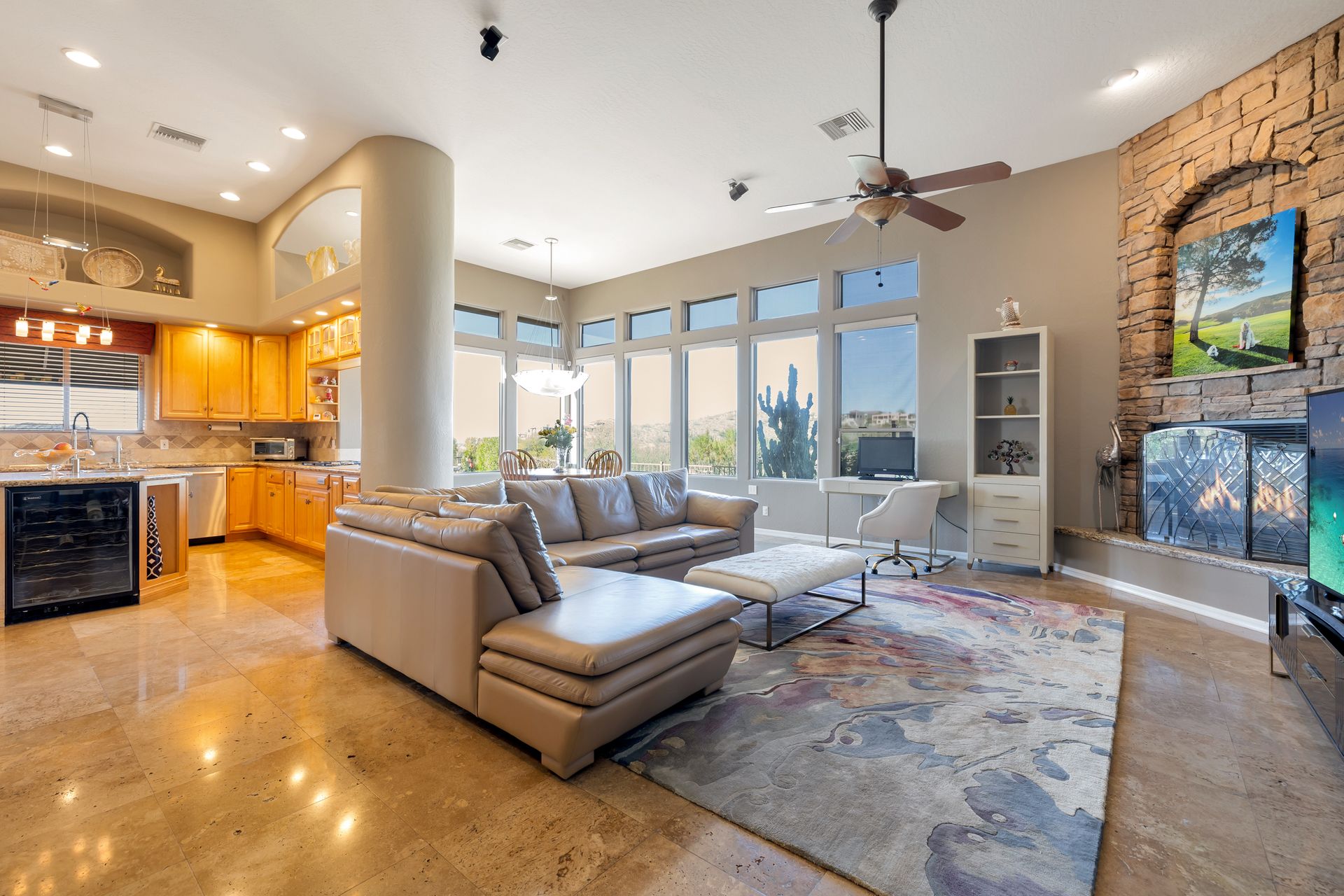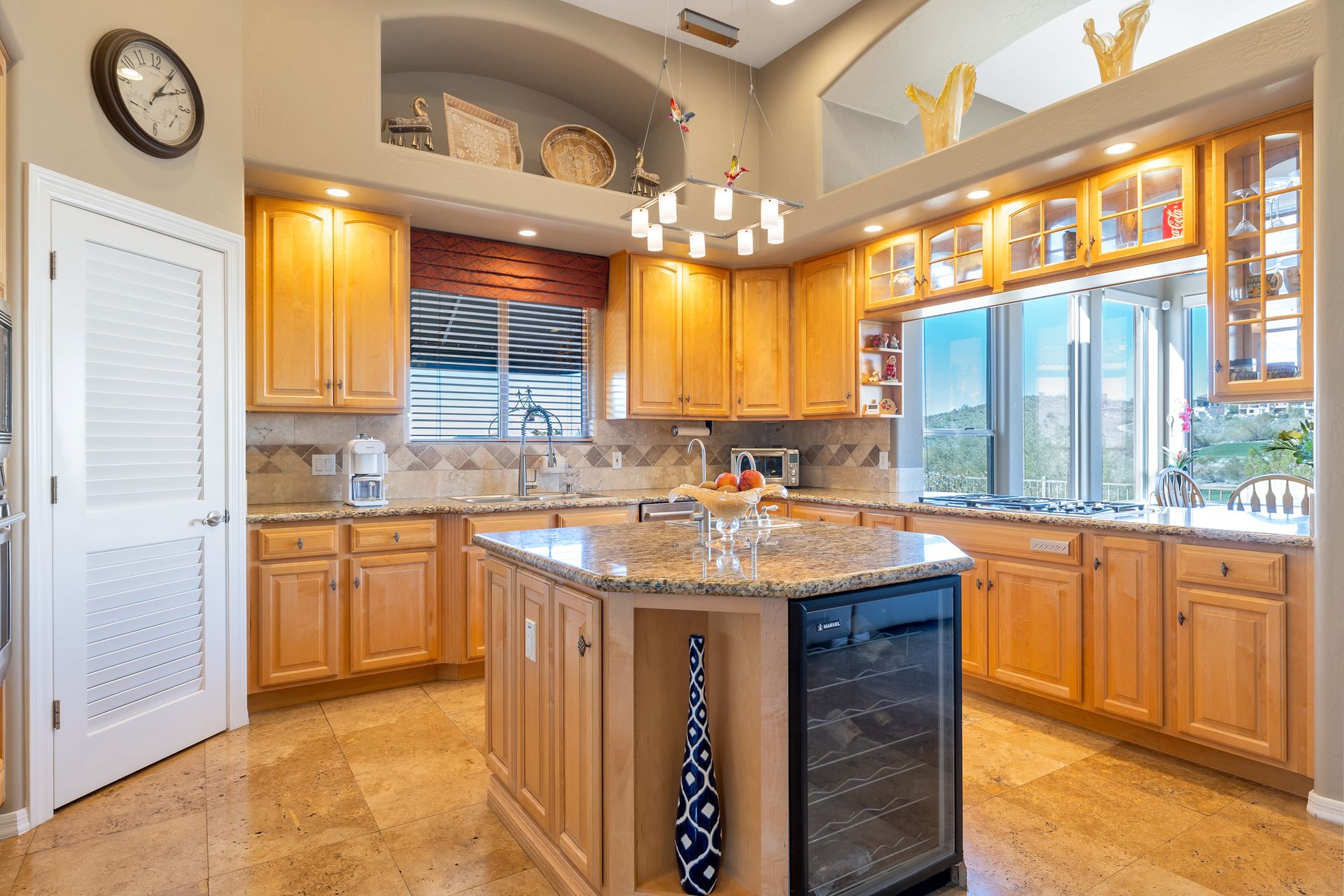 This Ridge at Lookout Mountain property offers a combination of luxurious features and natural beauty. The elevated, hillside location delivers unparalleled sunset, golf and mountain views in a gated community overlooking Lookout Mountain Golf Club. The well-designed floorplan is tailored for entertaining and the kitchen is a standout feature with custom cabinetry and high-end SubZero and Wolf appliances. The owner's suite, separated from other bedrooms, provides a lavish escape with a sitting area, gas fireplace, two walk-in closets, jetted tub and a walk-in shower. The low-maintenance backyard enhances the outdoor living experience with a covered patio, PebbleTec pool, built-in BBQ and artificial turf, creating a perfect retreat. Other features include solar panels, a new roof and a tankless water heater, contributing to energy efficiency. Additional recent improvements are all new smart locks, shutters, invisible screen doors, electronic window screens, both a water softener and reverse osmosis, new insulated garage doors, two pergolas, gutters and a backyard gate. Overall, this residence combines modern elegance with its natural surroundings, offering a luxurious and tranquil lifestyle for those seeking a sophisticated home with breathtaking views and upscale amenities. 4 BD, 3 BA, 3 CG, 3410