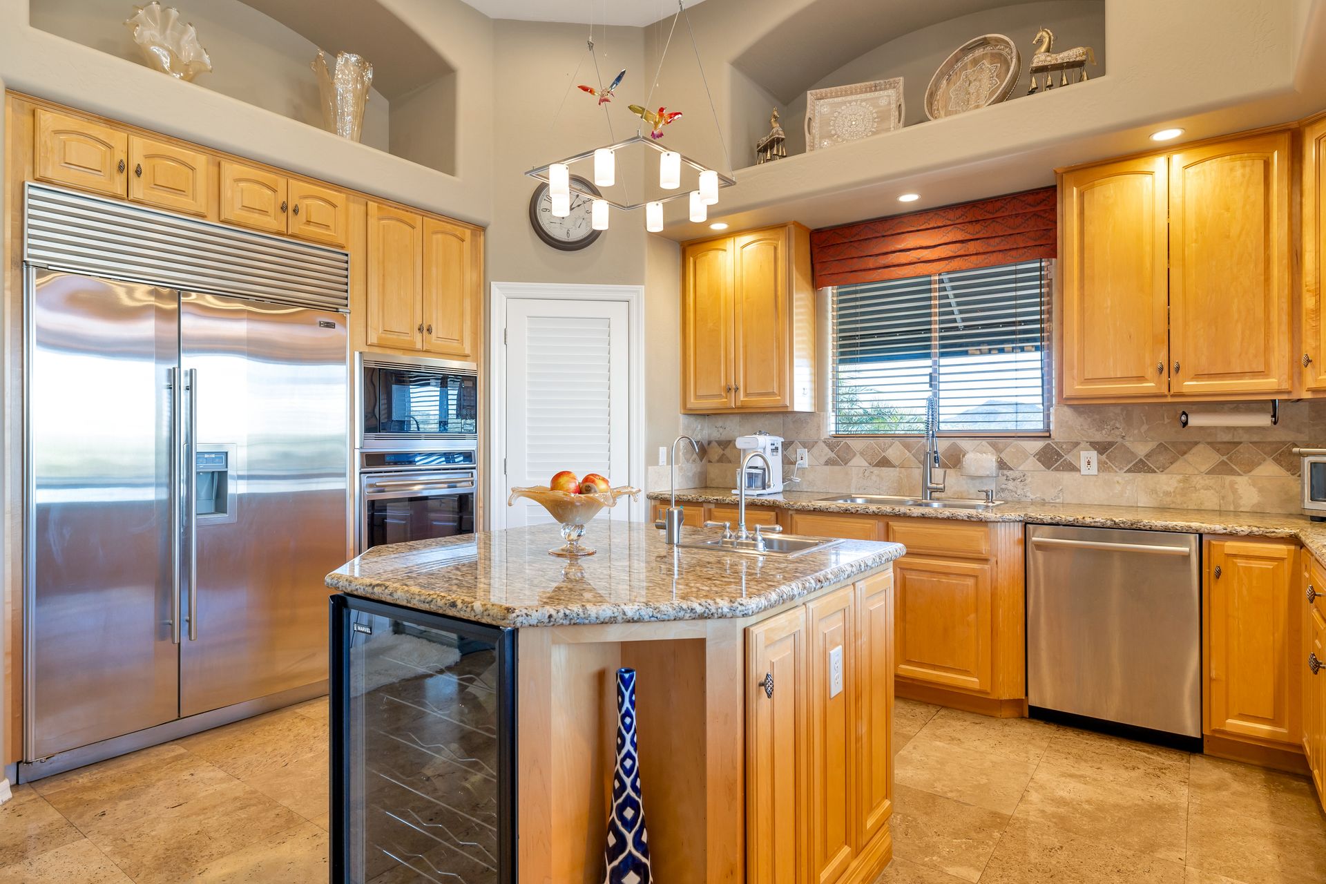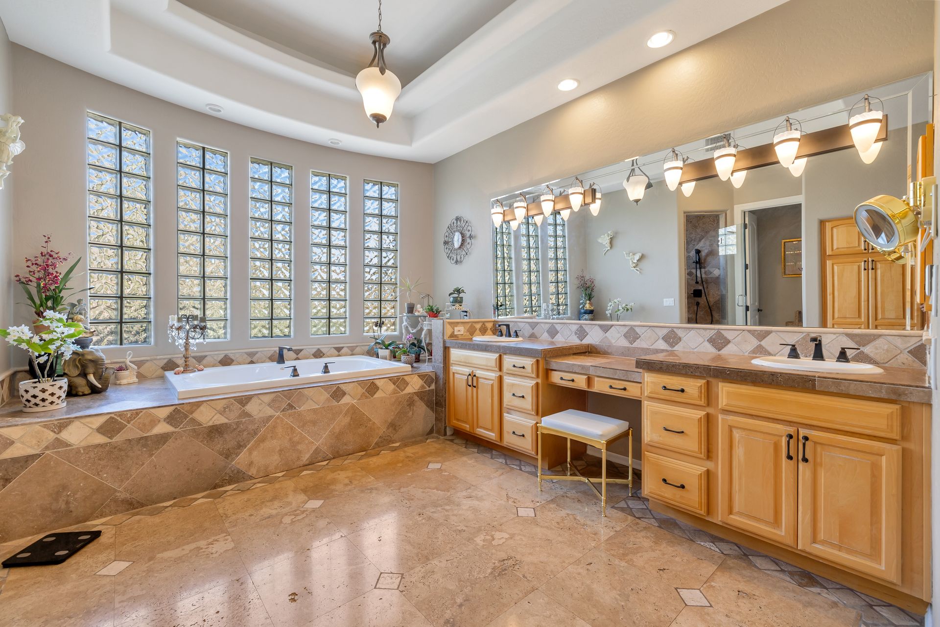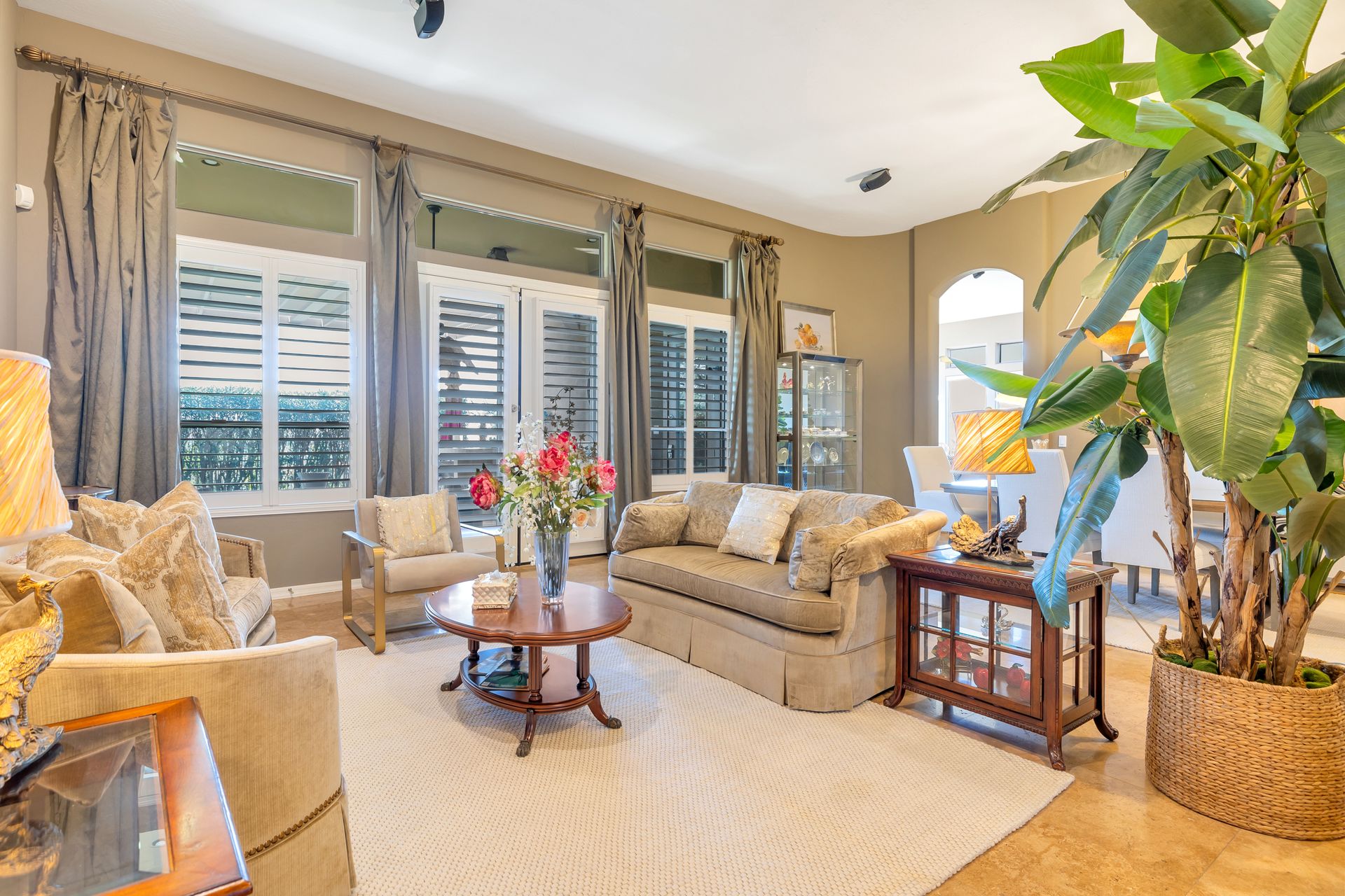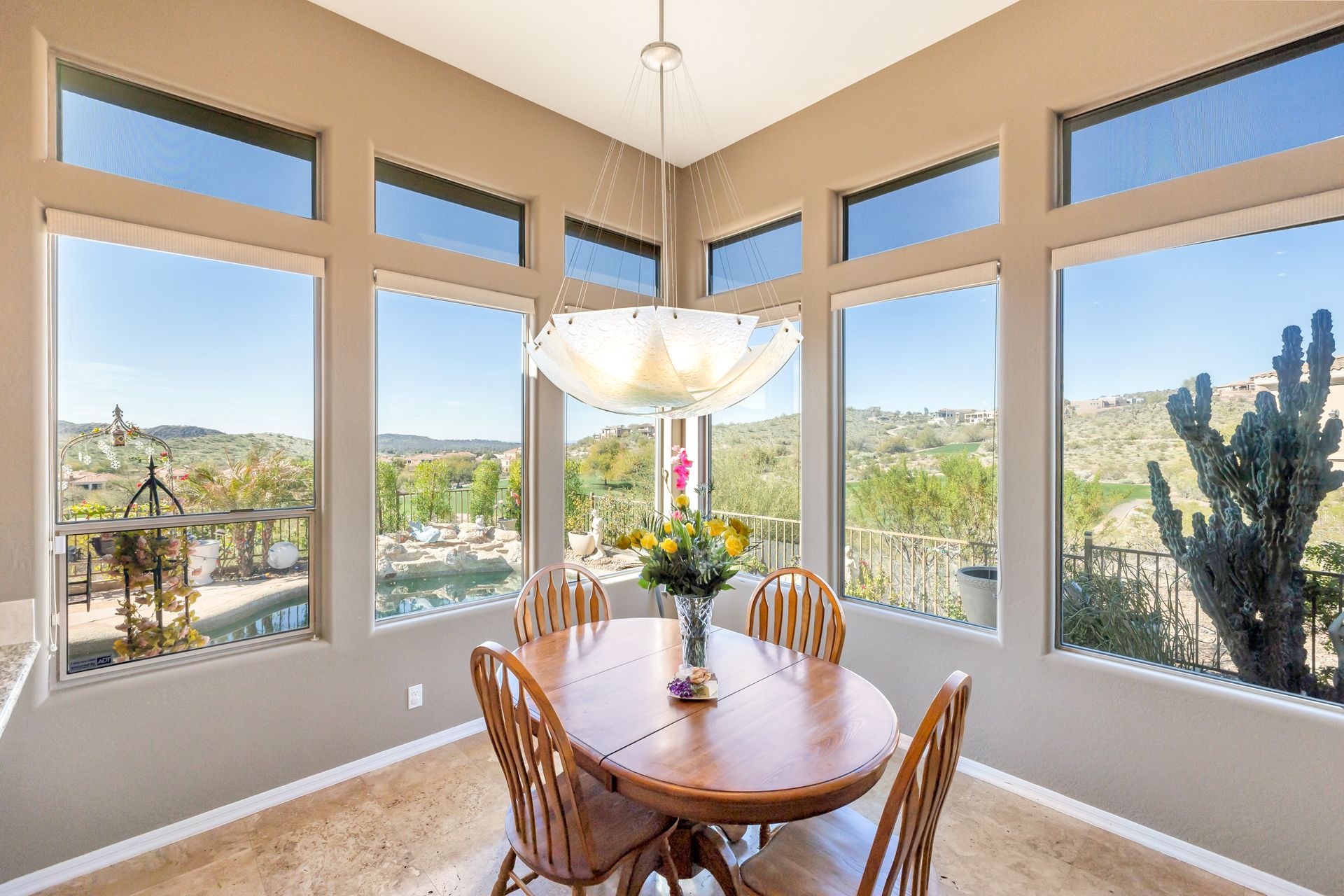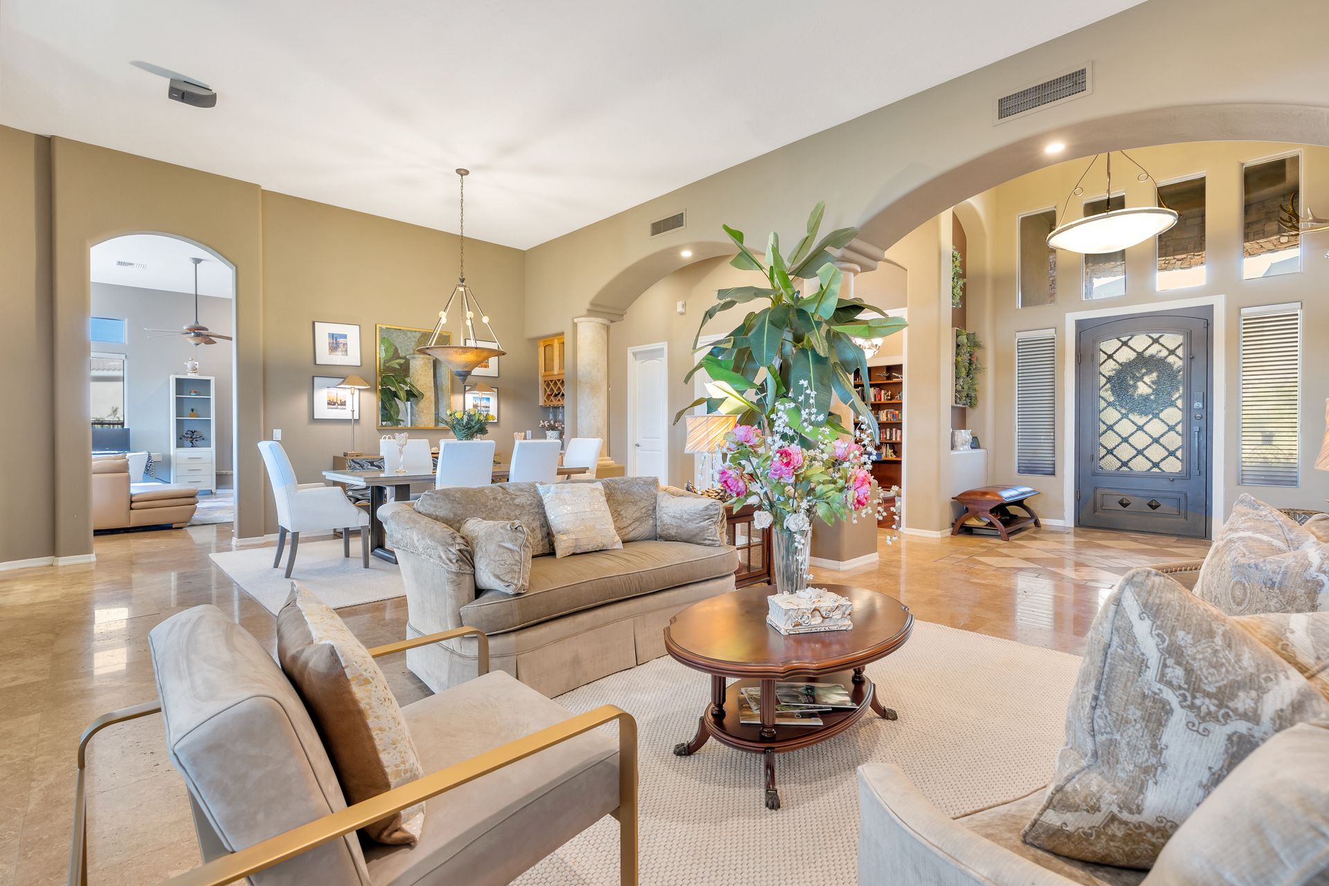 This Ridge at Lookout Mountain property offers a combination of luxurious features and natural beauty. The elevated, hillside location delivers unparalleled sunset, golf and mountain views in a gated community overlooking Lookout Mountain Golf Club. The well-designed floorplan is tailored for entertaining and the kitchen is a standout feature with custom cabinetry and high-end SubZero and Wolf appliances. The owner's suite, separated from other bedrooms, provides a lavish escape with a sitting area, gas fireplace, two walk-in closets, jetted tub and a walk-in shower. The low-maintenance backyard enhances the outdoor living experience with a covered patio, PebbleTec pool, built-in BBQ and artificial turf, creating a perfect retreat. Other features include solar panels, a new roof and a tankless water heater, contributing to energy efficiency. Additional recent improvements are all new smart locks, shutters, invisible screen doors, electronic window screens, both a water softener and reverse osmosis, new insulated garage doors, two pergolas, gutters and a backyard gate. Overall, this residence combines modern elegance with its natural surroundings, offering a luxurious and tranquil lifestyle for those seeking a sophisticated home with breathtaking views and upscale amenities. 4 BD, 3 BA, 3 CG, 3410