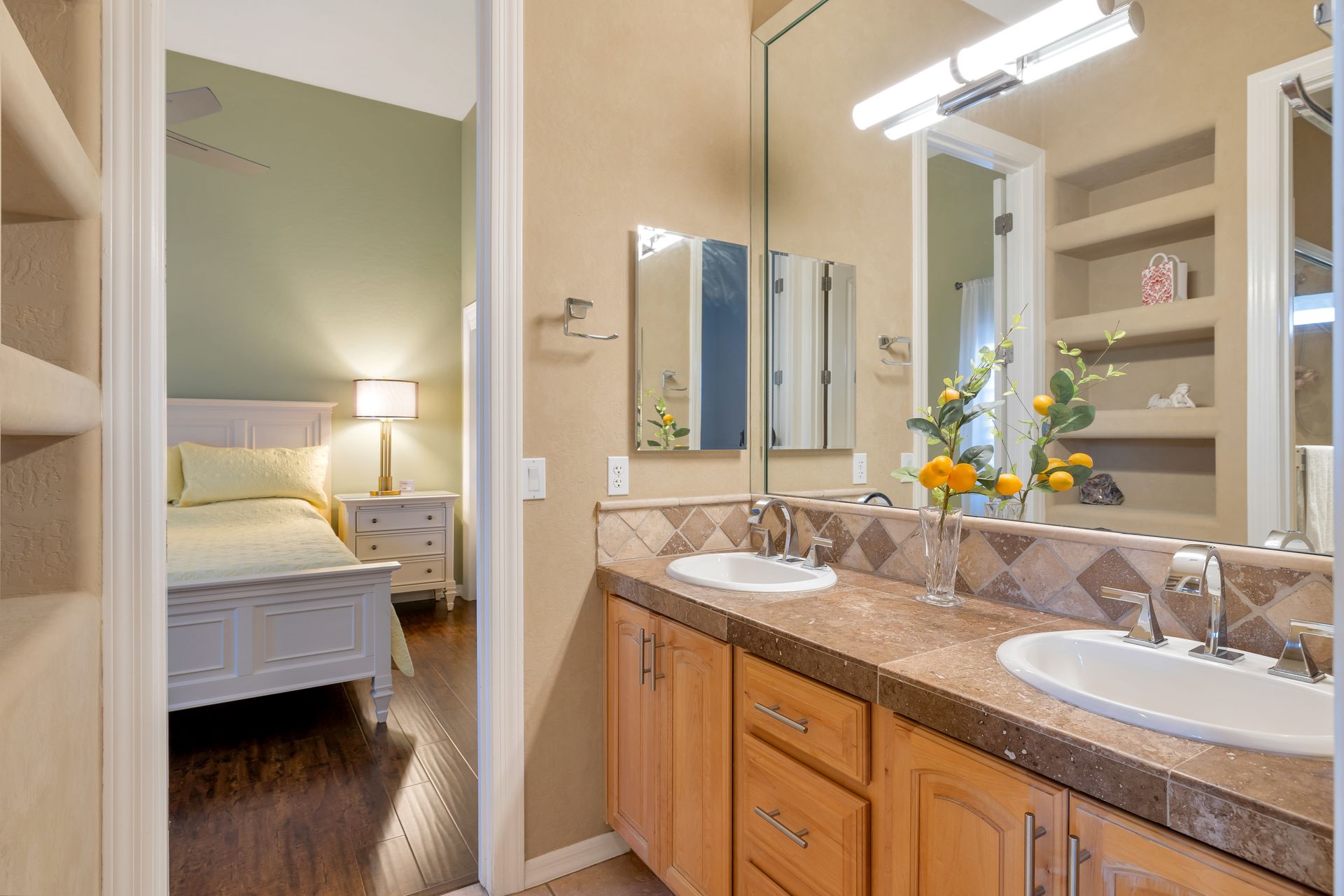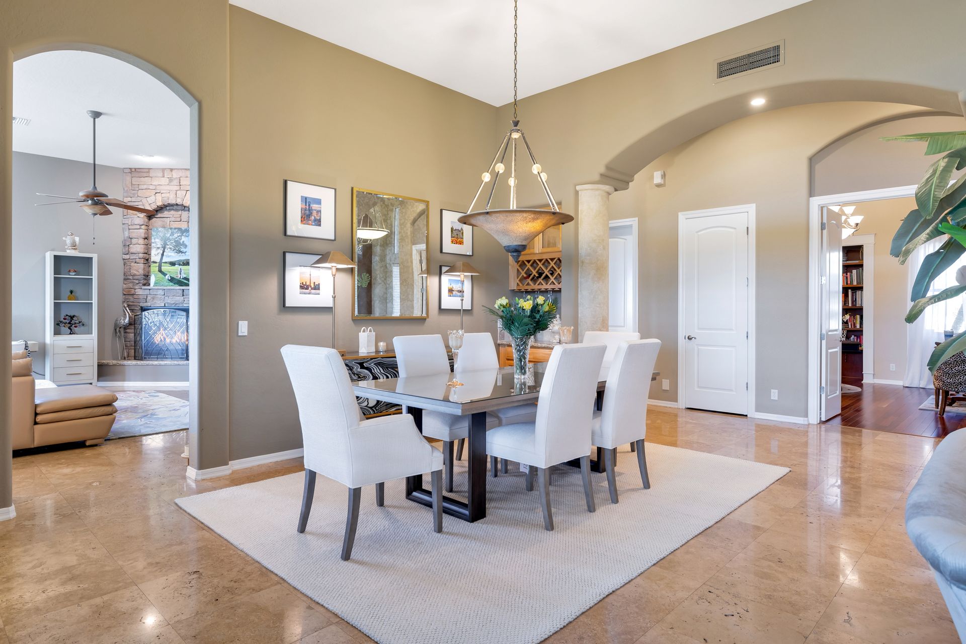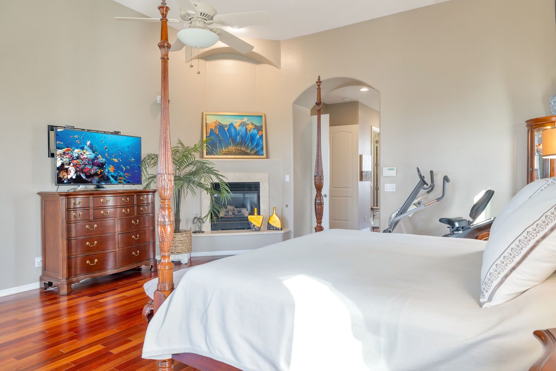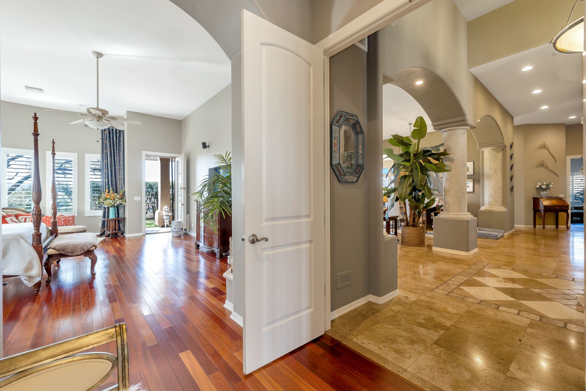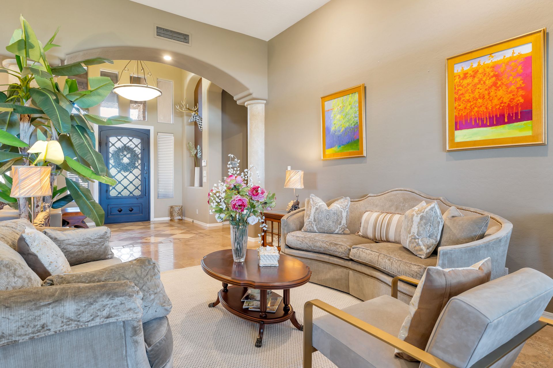 This Ridge at Lookout Mountain property offers a combination of luxurious features and natural beauty. The elevated, hillside location delivers unparalleled sunset, golf and mountain views in a gated community overlooking Lookout Mountain Golf Club. The well-designed floorplan is tailored for entertaining and the kitchen is a standout feature with custom cabinetry and high-end SubZero and Wolf appliances. The owner's suite, separated from other bedrooms, provides a lavish escape with a sitting area, gas fireplace, two walk-in closets, jetted tub and a walk-in shower. The low-maintenance backyard enhances the outdoor living experience with a covered patio, PebbleTec pool, built-in BBQ and artificial turf, creating a perfect retreat. Other features include solar panels, a new roof and a tankless water heater, contributing to energy efficiency. Additional recent improvements are all new smart locks, shutters, invisible screen doors, electronic window screens, both a water softener and reverse osmosis, new insulated garage doors, two pergolas, gutters and a backyard gate. Overall, this residence combines modern elegance with its natural surroundings, offering a luxurious and tranquil lifestyle for those seeking a sophisticated home with breathtaking views and upscale amenities. 4 BD, 3 BA, 3 CG, 3410