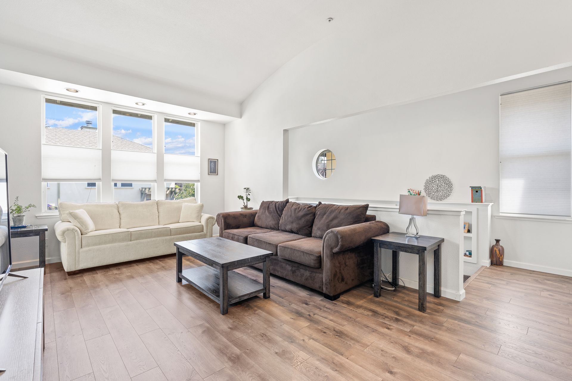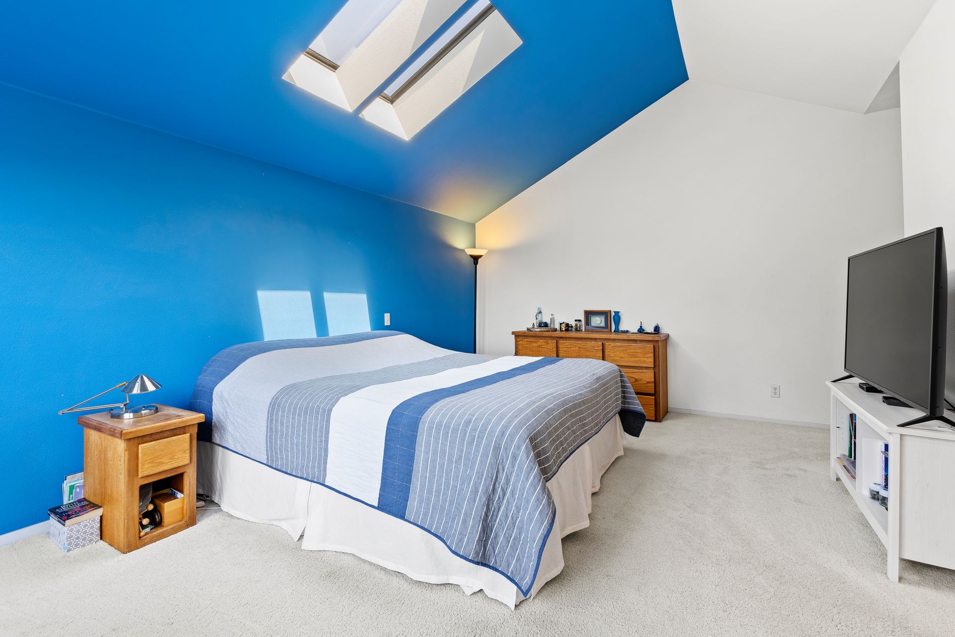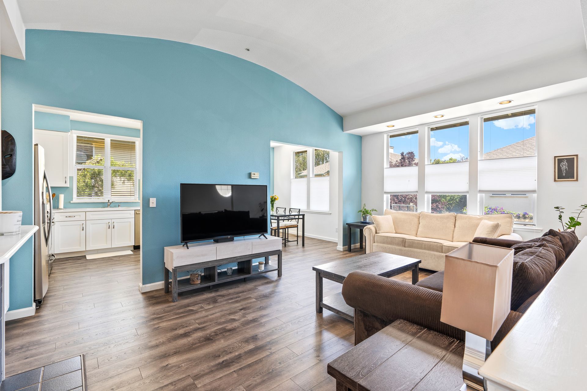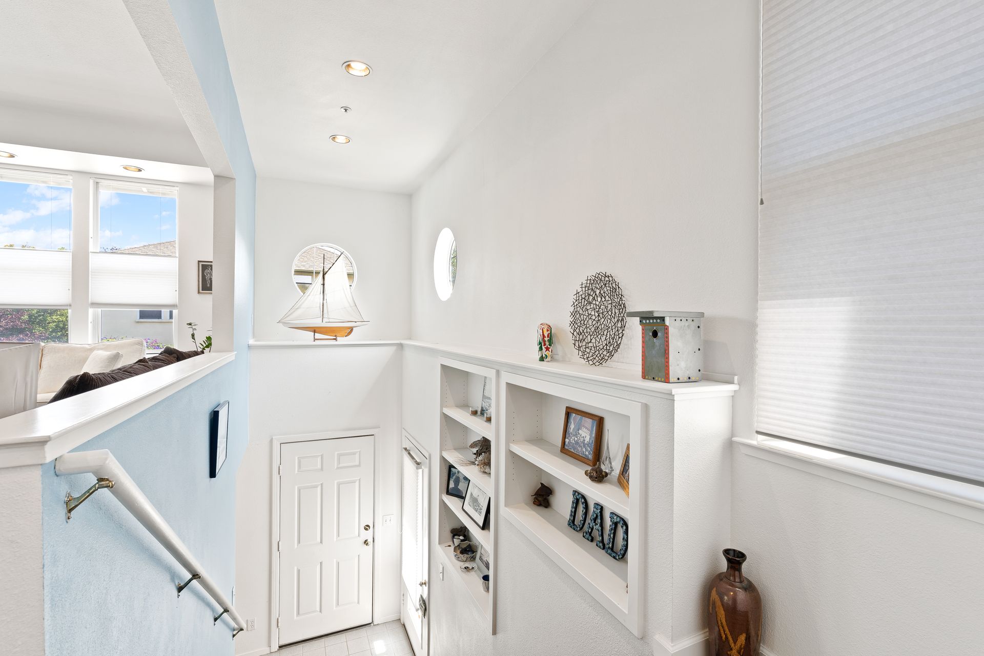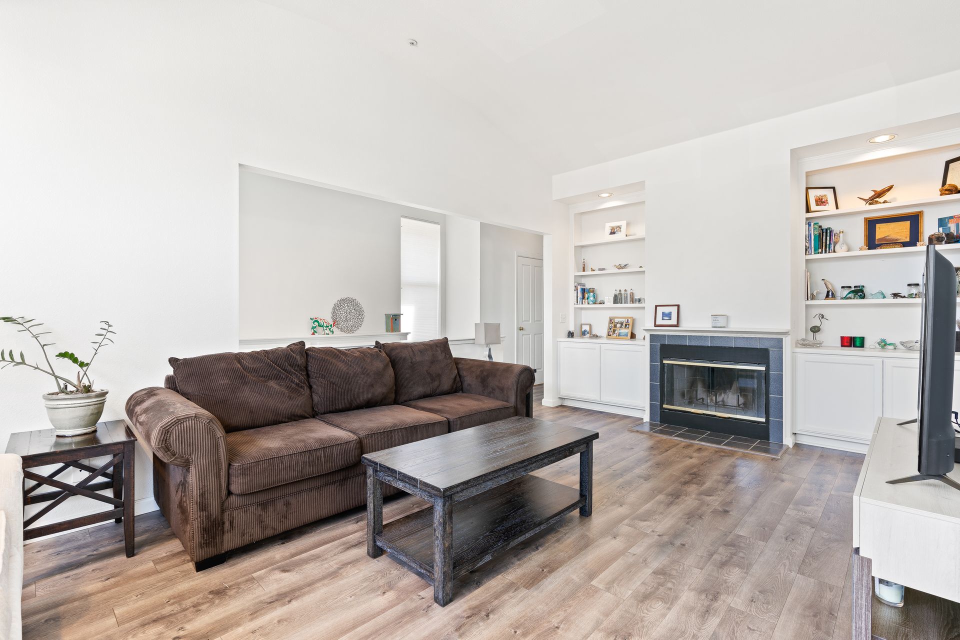 Tall windows, distant-views, high ceilings and practical woodgrain plank flooring enhance the sense of ease and contentment. Easy-care Quartz counters, stainless appliances and newer cabinets make the beautifully updated kitchen a practical and delightful space. Flames might flicker in the fireplace on a foggy eve and many built-in bookcases & cabinets keep treasures at hand. Vaulted ceilings, skylights, a walk-in closet and the evening sun turn a spacious suite into a peaceful retreat. Ground floor conveniences include 2 more bedrooms, a full bath, laundry room, a two-car garage and a sunny, blank-slate yard.