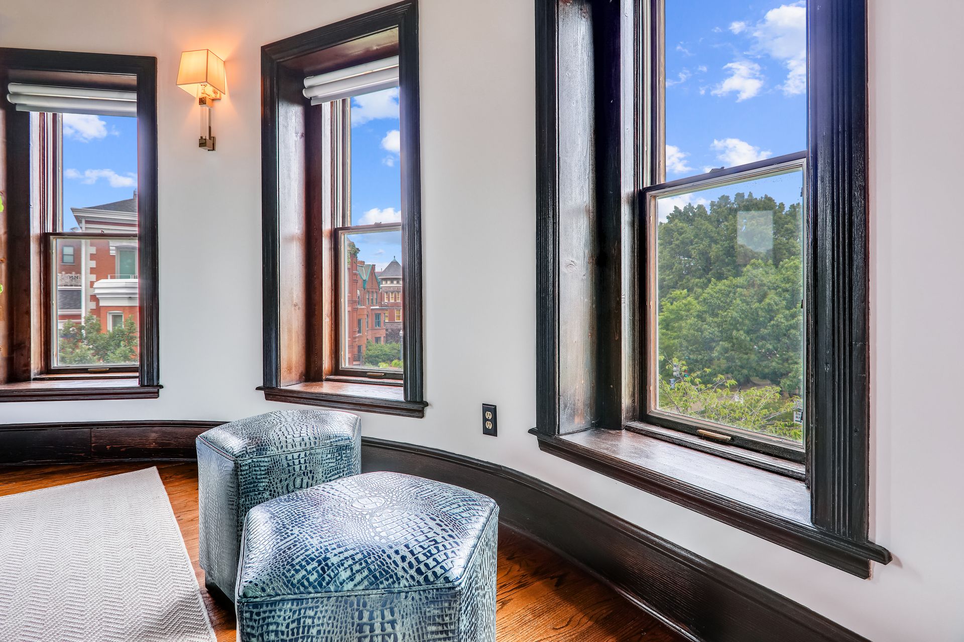 Fabulous Penthouse in The Castle at Logan Circle. This 2 Bed 2 Bath Condo features a huge circular Living Room with a beamed cathedral ceiling and amazing views through the wall of windows overlooking cherry blossom treetops and the colorful brownstones on Logan Circle. The kitchen was recently updated with all new high end SS appliances, custom blue cabinets, white quartz waterfall counters and new plumbing fixtures. The exposed brick wine cellar just off the kitchen offer lots of storage for all your cooking toys. The dining area sits in front of the first woodburning fireplace while the refinished hardwood floors gleam in the sunlight from all directions. The Primary Bedroom suite features a large bedroom with a second custom woodburning fireplace, large owners closet complete with barn doors, a reading alcove overlooking P St. The Primary bath includes a private WC, huge glass enclosed shower, quartz custom dual sink vanity, built-in stone laundry center with high end washer & dryer unit and an herb garden window box overlooking Rhode Island Ave. There is a bright second full bath with custom vanity and separate WC that functions as a powder room as well. The custom open staircase leads to the second bedroom loft space with a skylight, perfect for overnight guests or work-from-home flex space. The Lutron motorized shades throughout are timed to wake you with the morning sun and the HVAC was recently replaced. The Penthouse is one of only four units in the building and fills the entire top floor of the Castle, a historical home originally built in 1886 with sweeping views of Logan Circle Park. A short walk to the Metro, Whole Foods, and all the creative cocktail bars, Michelin-approved restaurants, funky galleries, unique boutiques, trendy coffee shops, and rockin' music venues of the 14th Street NW scene.