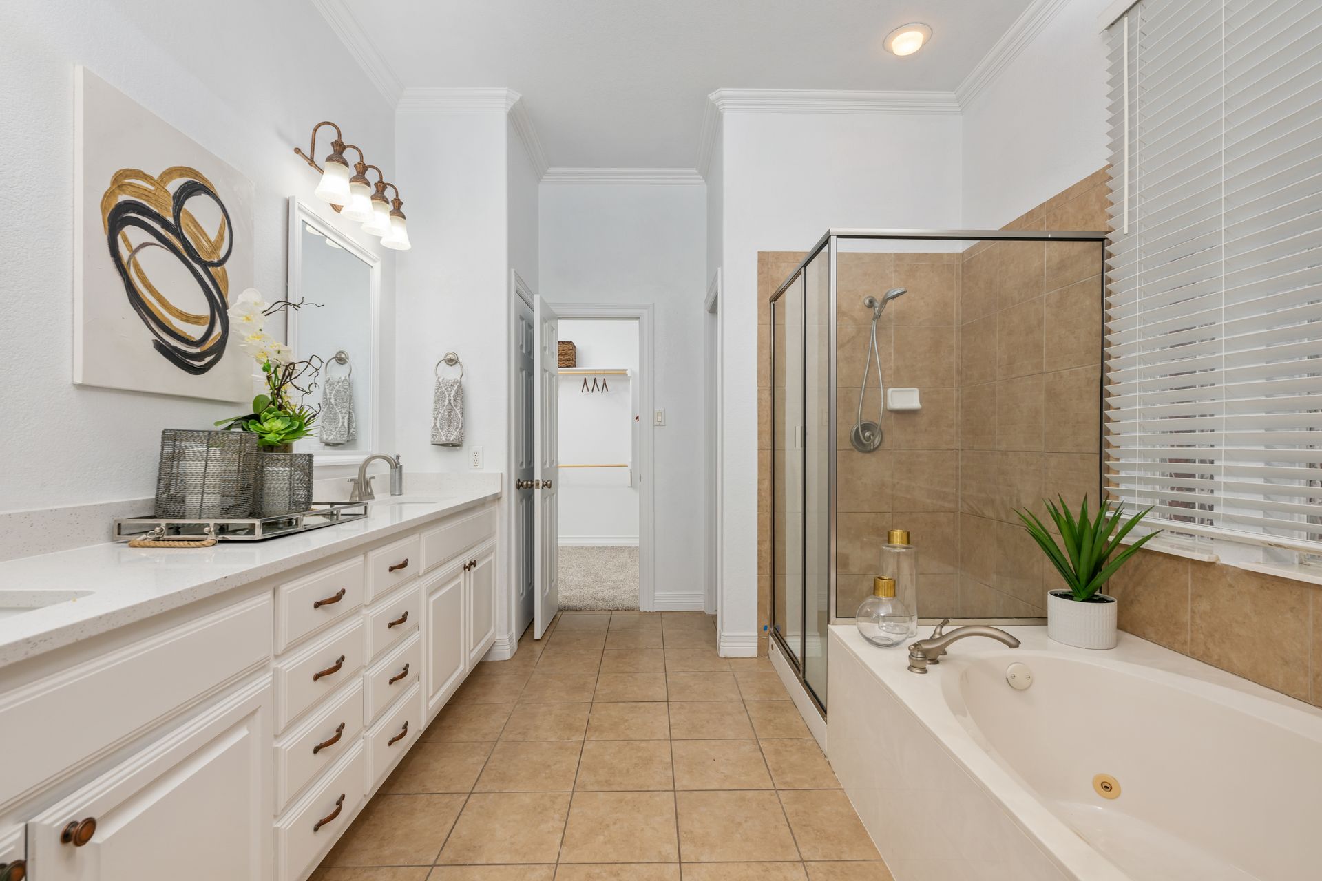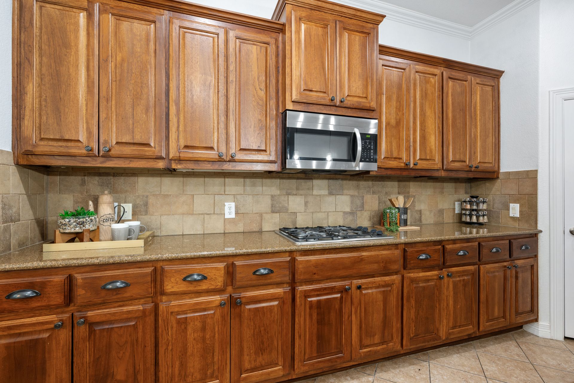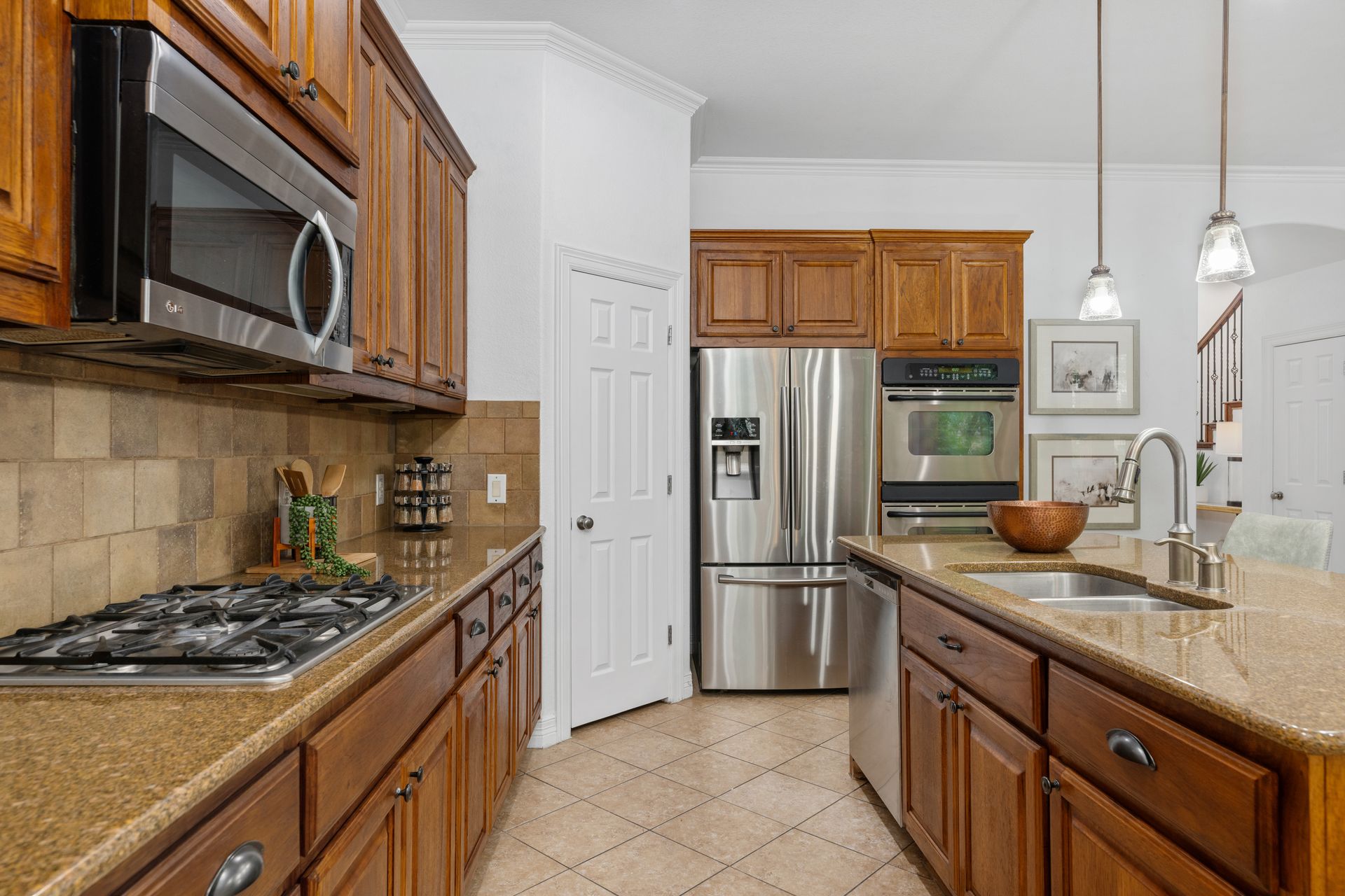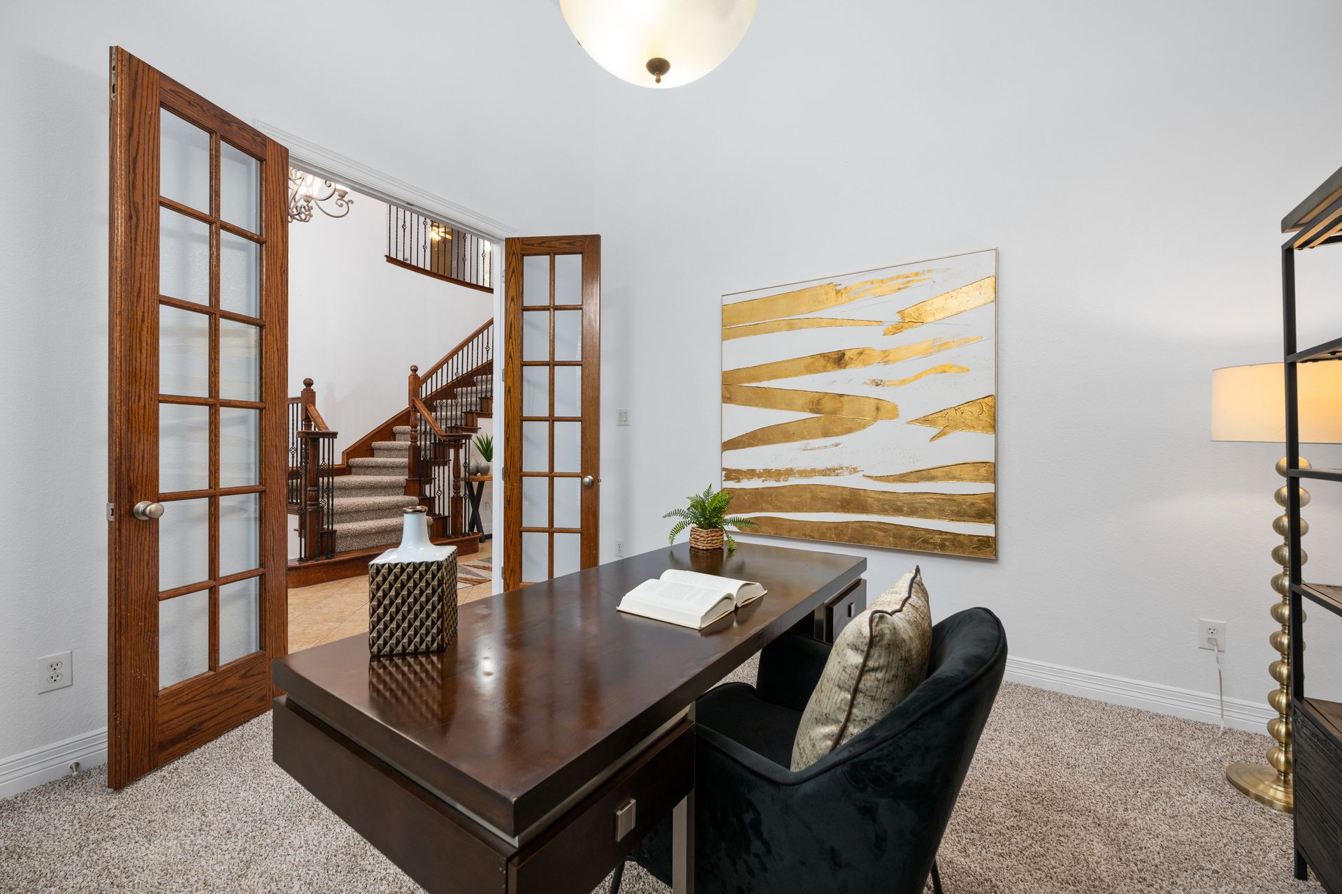 Grand foyer entry with soaring ceilings, flooding the space with natural light. Dedicated front office, formal dining area, and an open-concept main living area, with a stone fireplace that serves as the focal point. The adjacent kitchen is equipped with stainless steel appliances, a gas cooktop, built-in ovens, microwave, granite countertops, a sizable island with bar seating, and a generously sized walk-in pantry. Multiple dining options with both a breakfast area and a formal dining room. Primary bedroom retreat on the main level offers an en-suite bath complete with a dual sink vanity, garden tub, separate shower, and an expansive walk-in closet room. Secondary large bedroom also on main level, provides versatility as a guest suite, nursery, or workout space, with access to its own full bathroom.