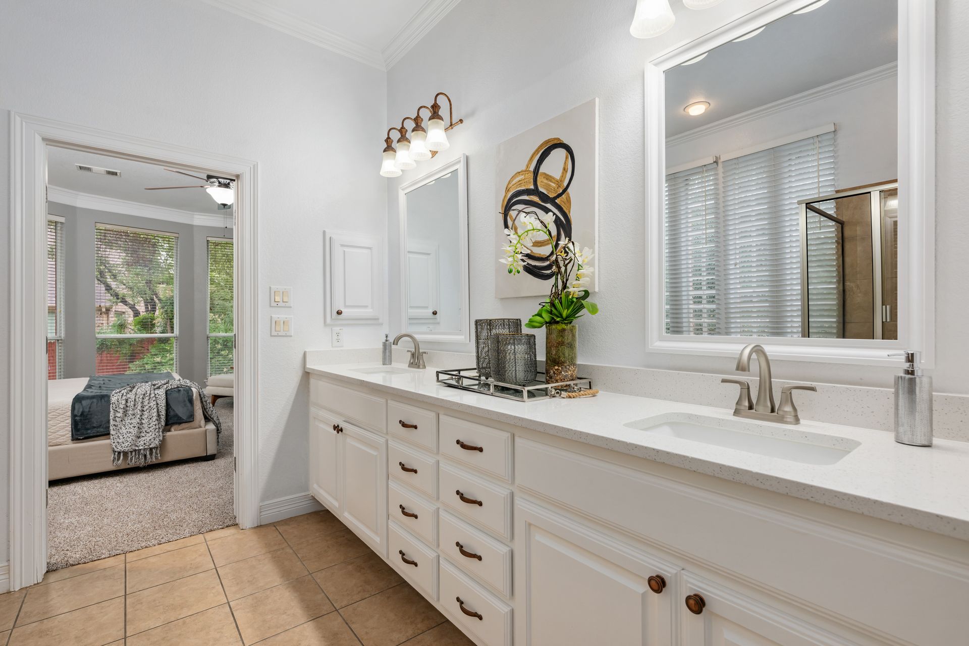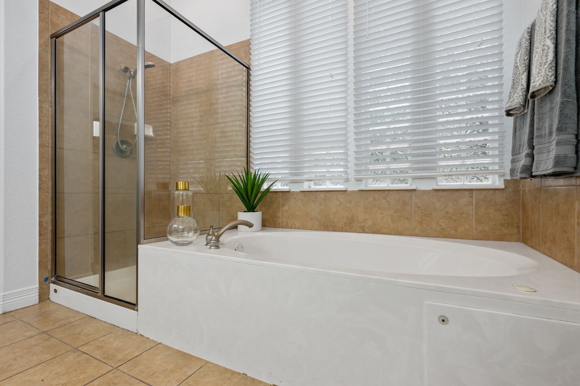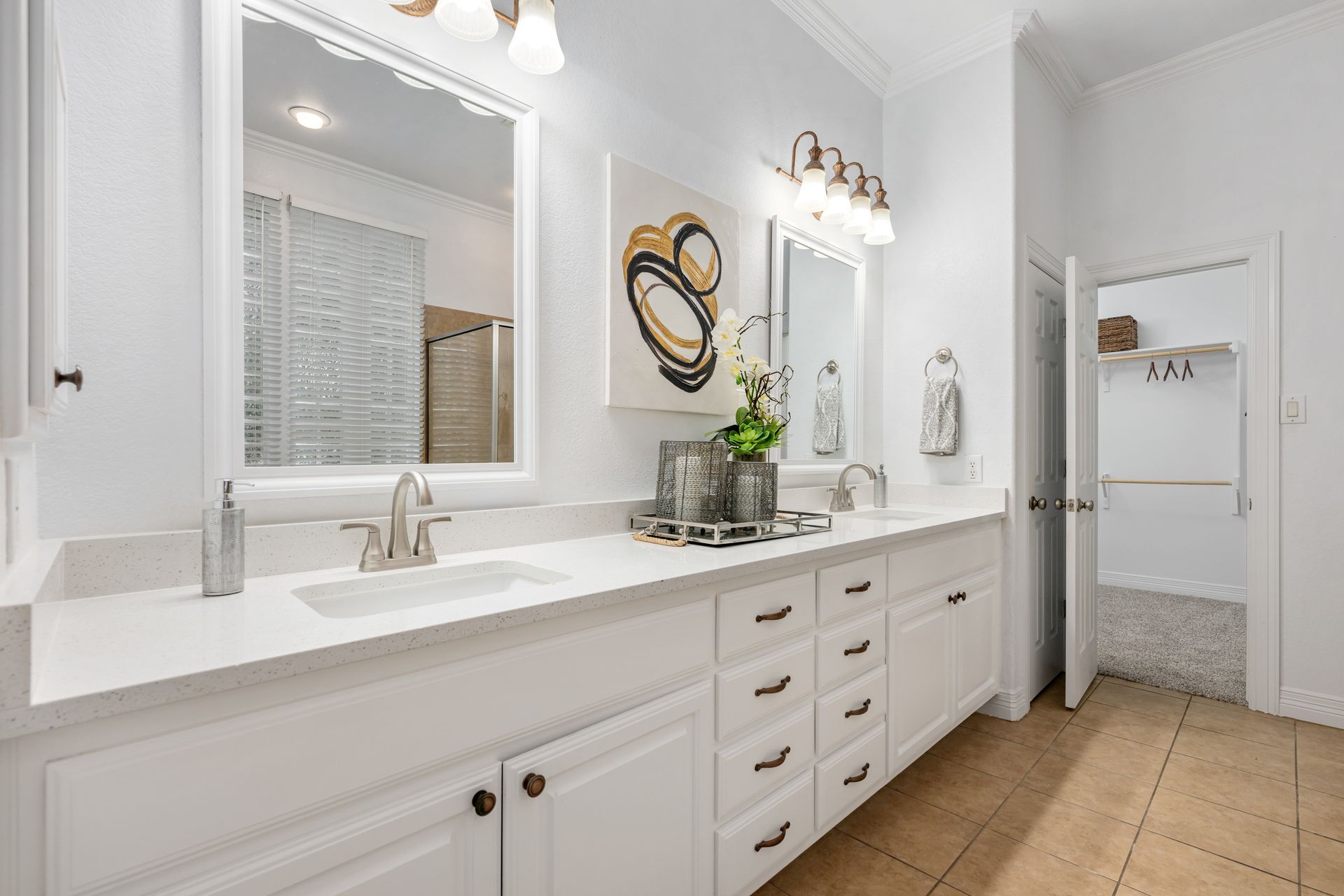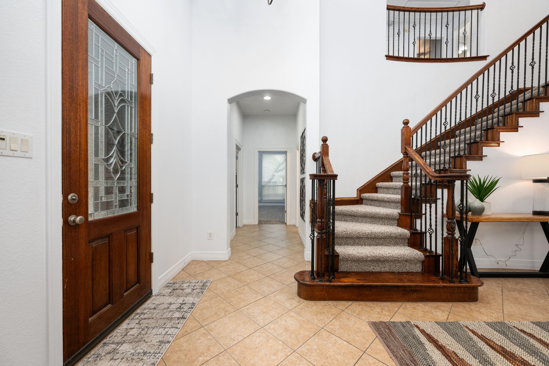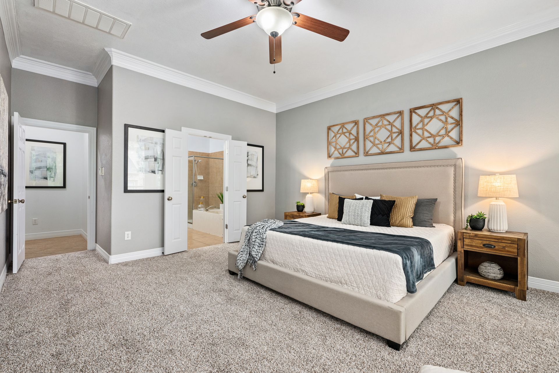 Grand foyer entry with soaring ceilings, flooding the space with natural light. Dedicated front office, formal dining area, and an open-concept main living area, with a stone fireplace that serves as the focal point. The adjacent kitchen is equipped with stainless steel appliances, a gas cooktop, built-in ovens, microwave, granite countertops, a sizable island with bar seating, and a generously sized walk-in pantry. Multiple dining options with both a breakfast area and a formal dining room. Primary bedroom retreat on the main level offers an en-suite bath complete with a dual sink vanity, garden tub, separate shower, and an expansive walk-in closet room. Secondary large bedroom also on main level, provides versatility as a guest suite, nursery, or workout space, with access to its own full bathroom.