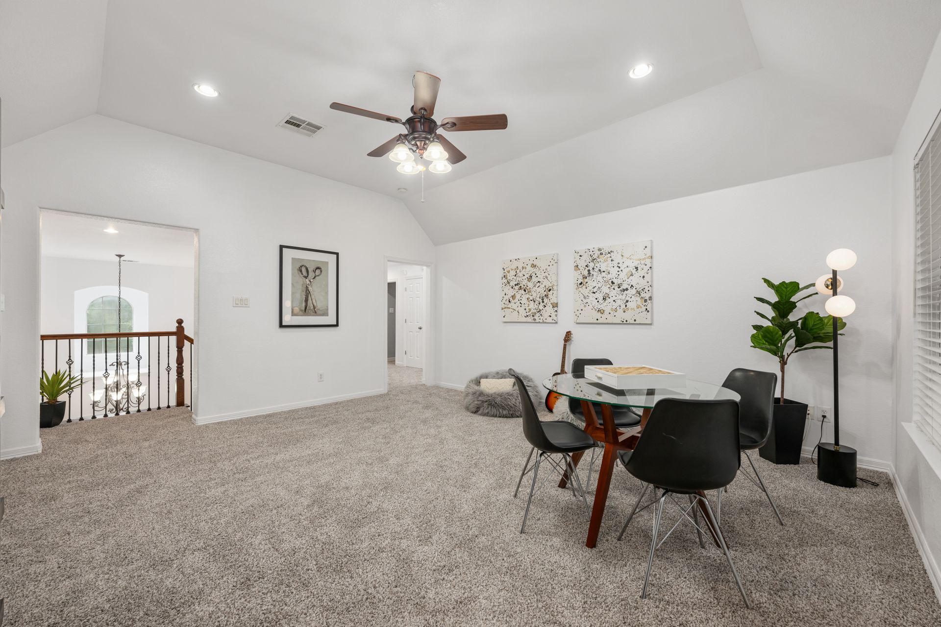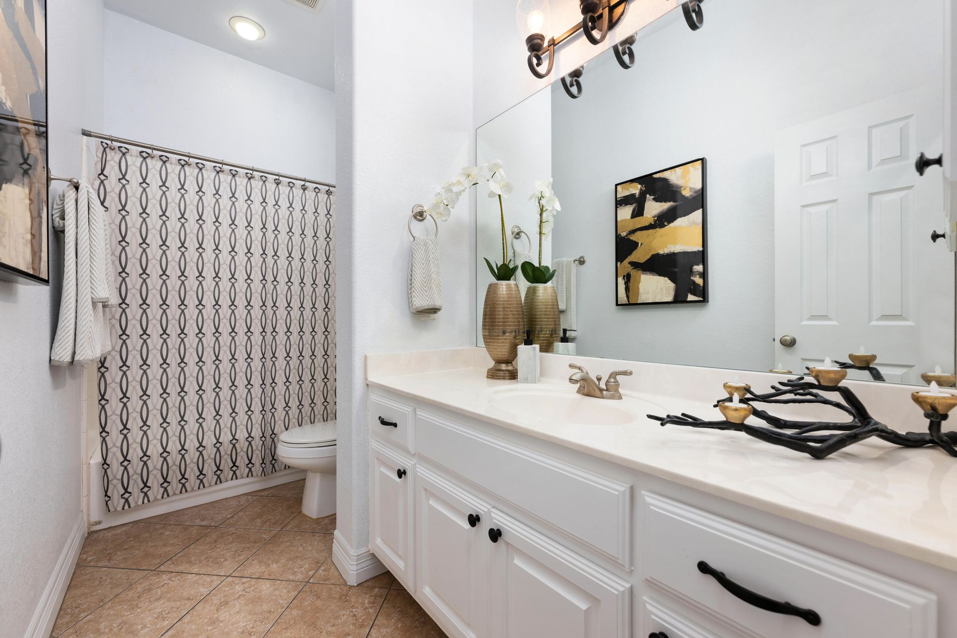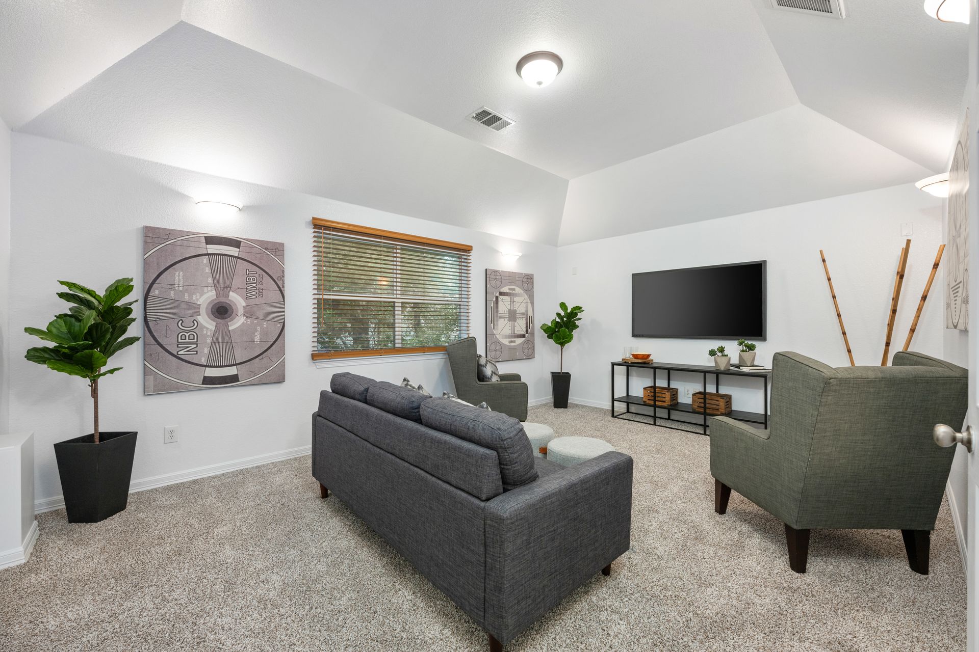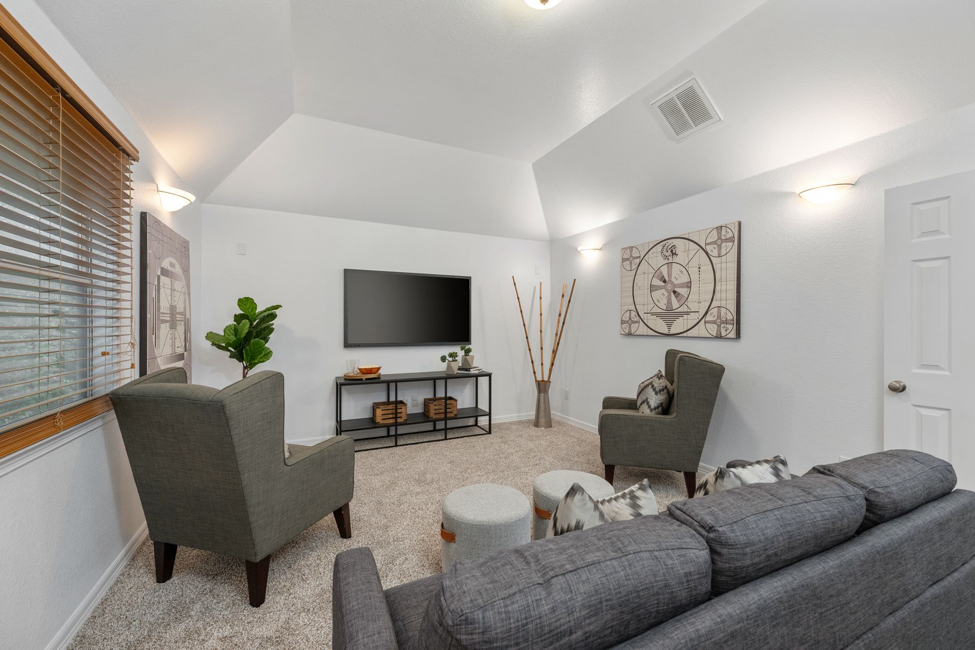 Upstairs - Expansive second living area/game room/flex space opens onto a walk-out balcony, ideal for entertaining. A large media room, pre-wired and plumbed for a future bar, completes the upper level, providing ample space for relaxation and leisure. Three additional bedrooms, ensuite full bath for one and the other two share a Jack and Jill bathroom with their own sink vanity area. Each has a walk-in closet.
