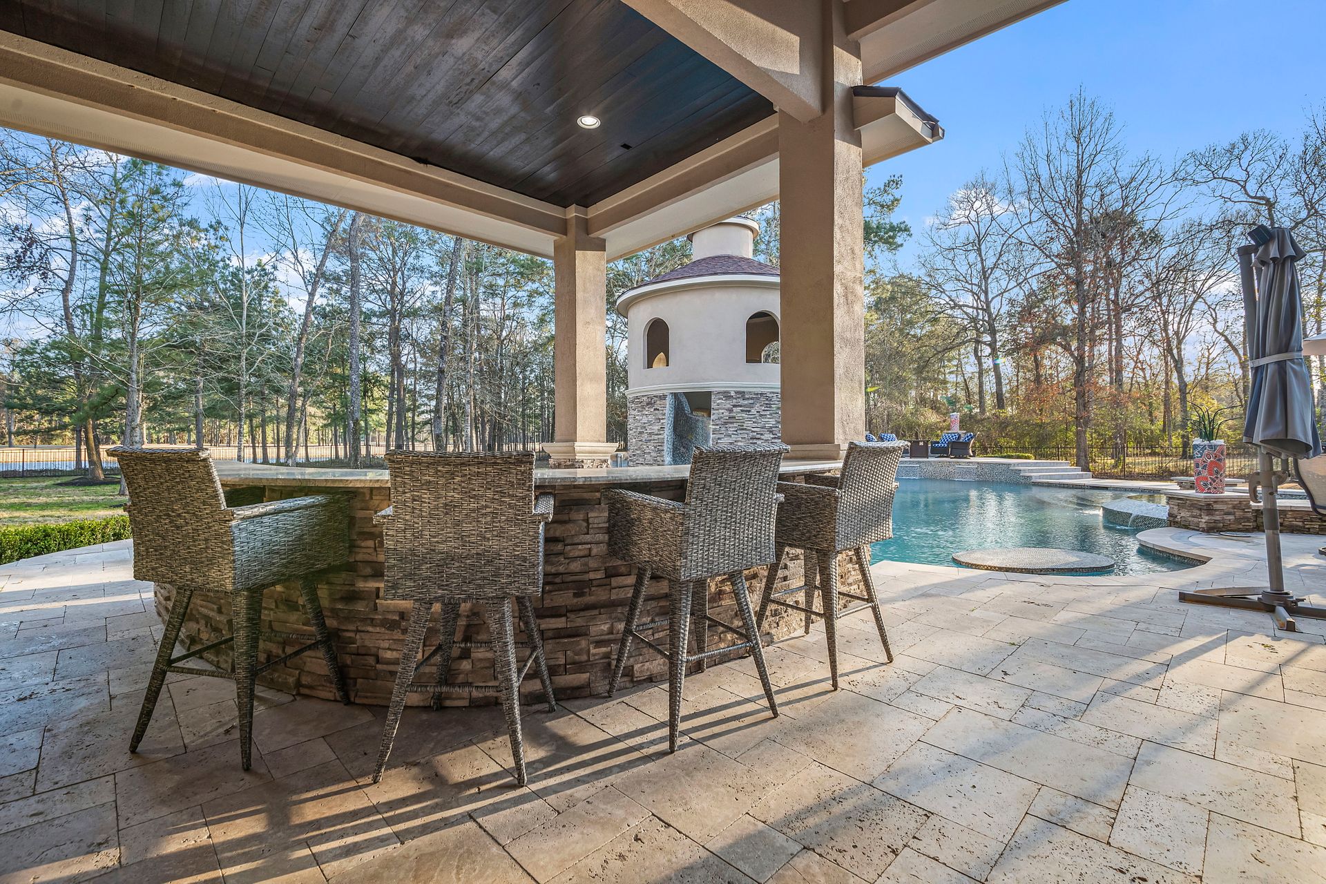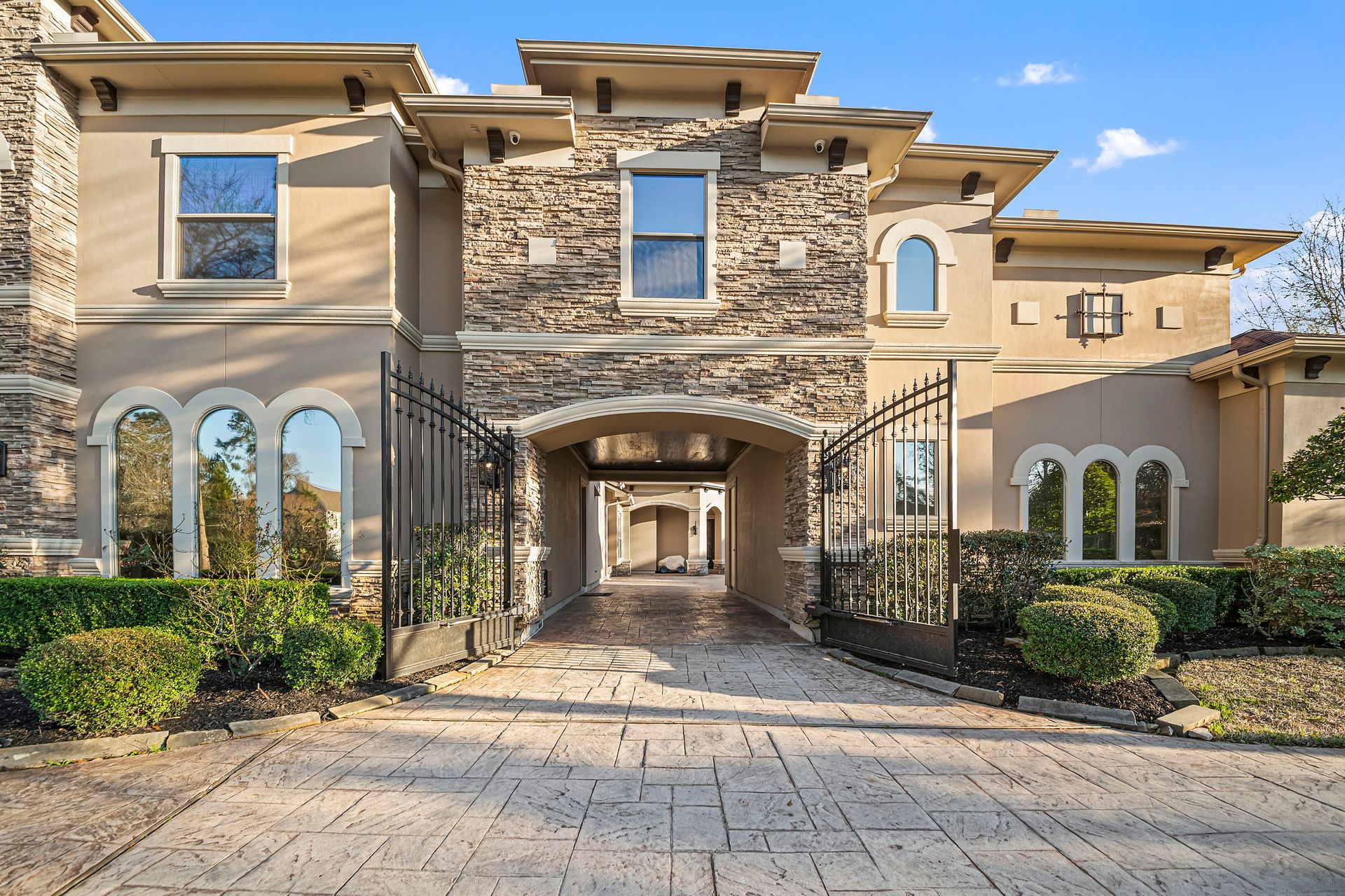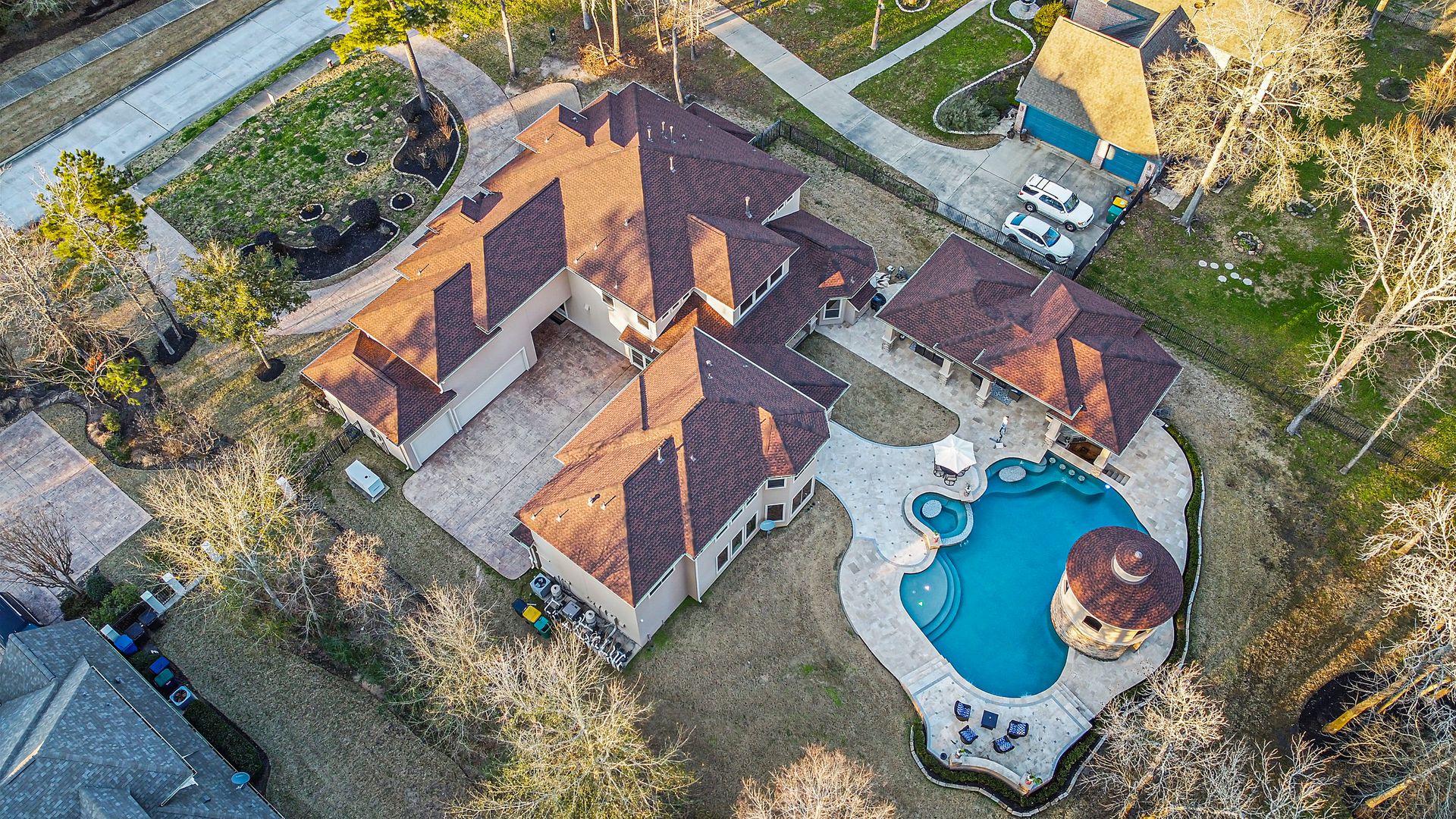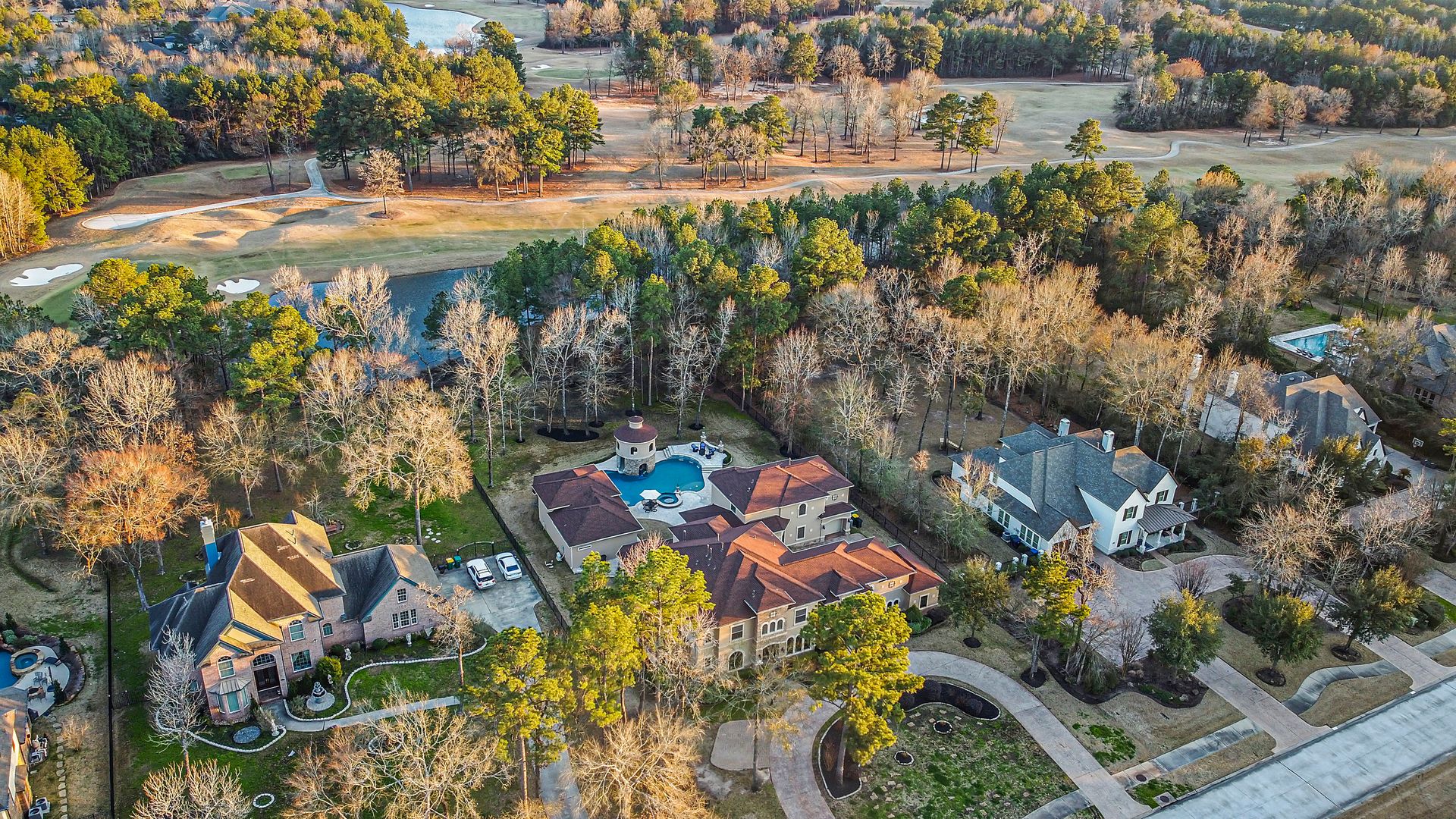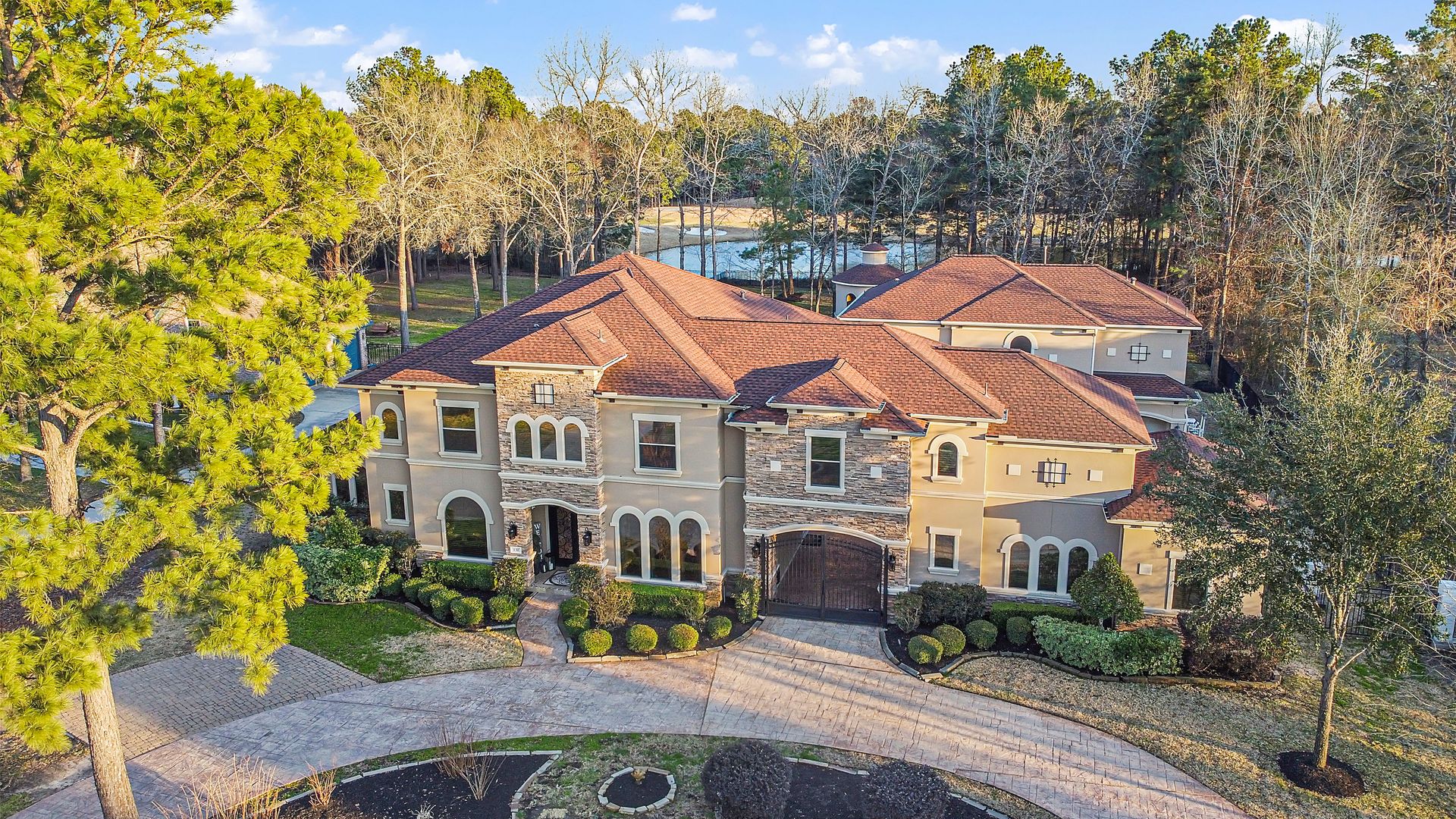 The Ultimate in luxurious Golf Course estates! Situated on 1.02 acres overlooking hole number three of private Woodforest golf course. Opulent amenities await, from designer finishes to ornate double French doors, stunning curved staircase & extensive trim details. Floor-to-ceiling windows in the great room bathe the home in natural light offering endless golf course views. A chef's kitchen with Viking appliances and custom cabinetry will never disappoint. The primary suite features detailed tray ceilings with an adjoining sitting area with a fireplace. Spa-like bathroom includes a multi-jetted shower, private laundry room, and THREE custom walk-in closets. Full home remote A/V Crestron system enables control of your at-home technology from anywhere! Enjoy popcorn and a movie in the media room with a cold beverage from your custom wet bar or skip the movie and play cards in the adjoining game room. Estate grounds include a private gated motor coach and Carriage house for your luxury automobiles. The resort style outdoor pool features a grotto, sunken/swim-up kitchen, infrared sauna & separate pool bath, covered BBQ patio & full home mosquito system. Attached 1,800 sqft Casita for guests includes 2 bedrooms, 2.5 baths, full kitchen & private laundry. Your gateway to resort-style living awaits!