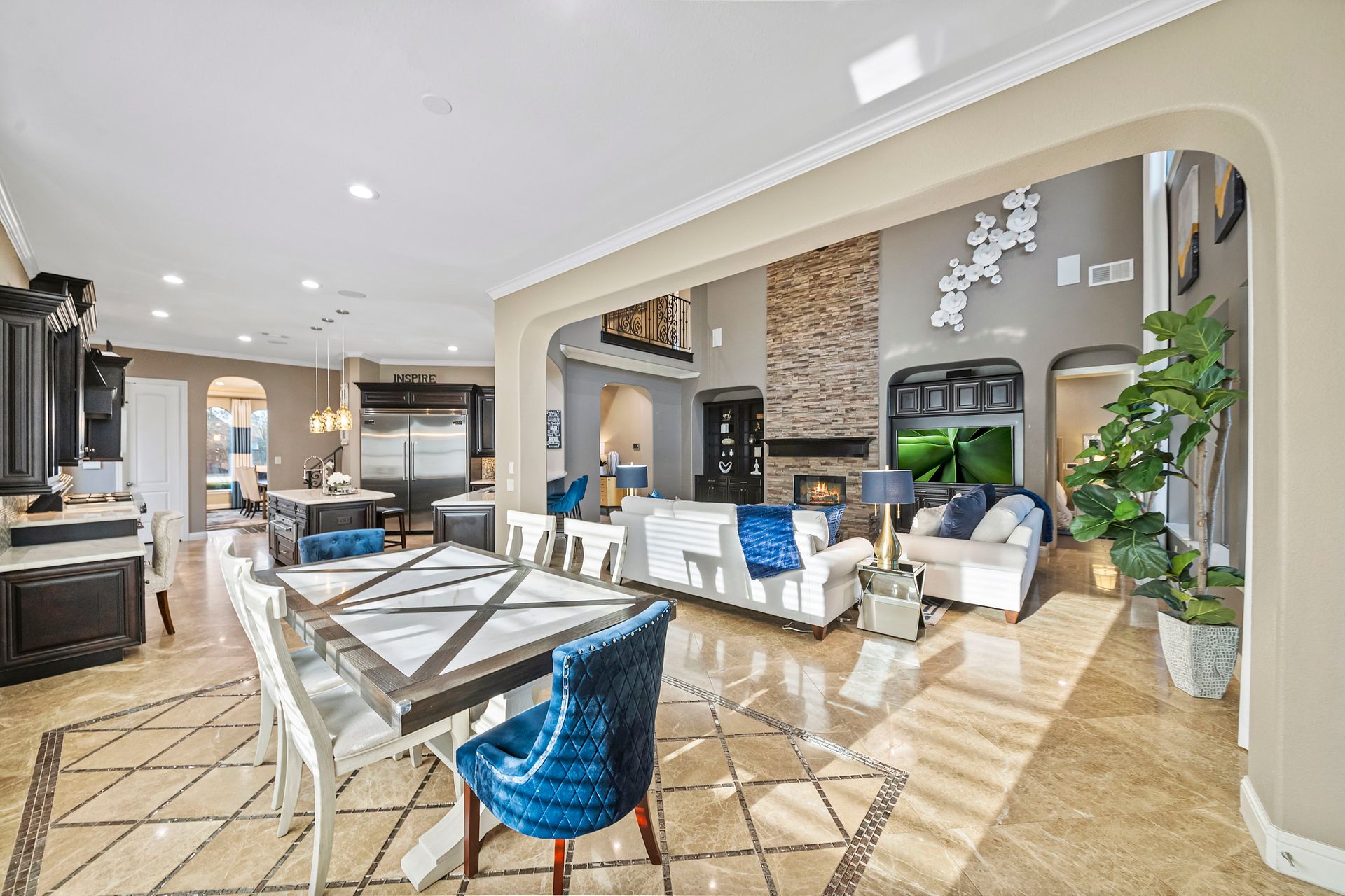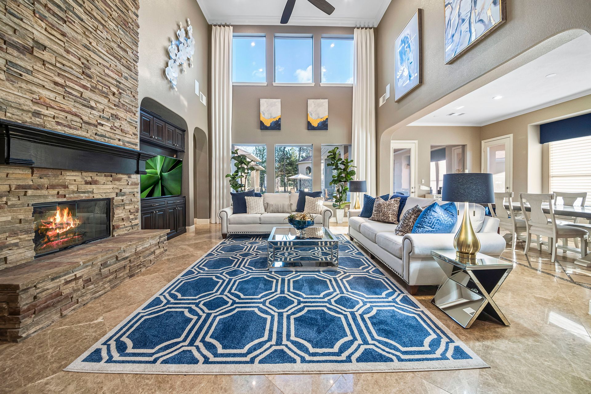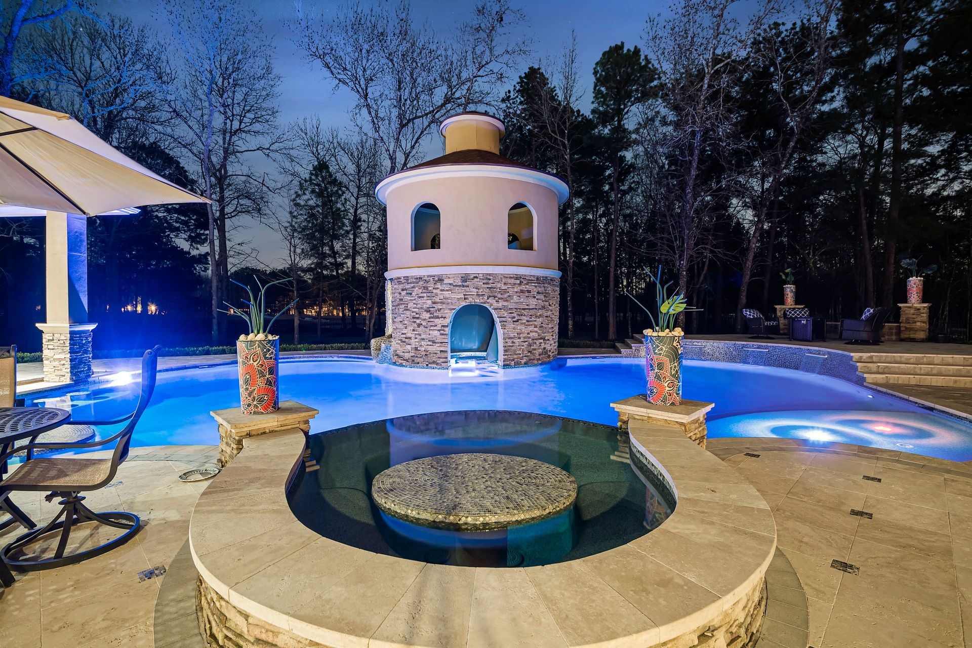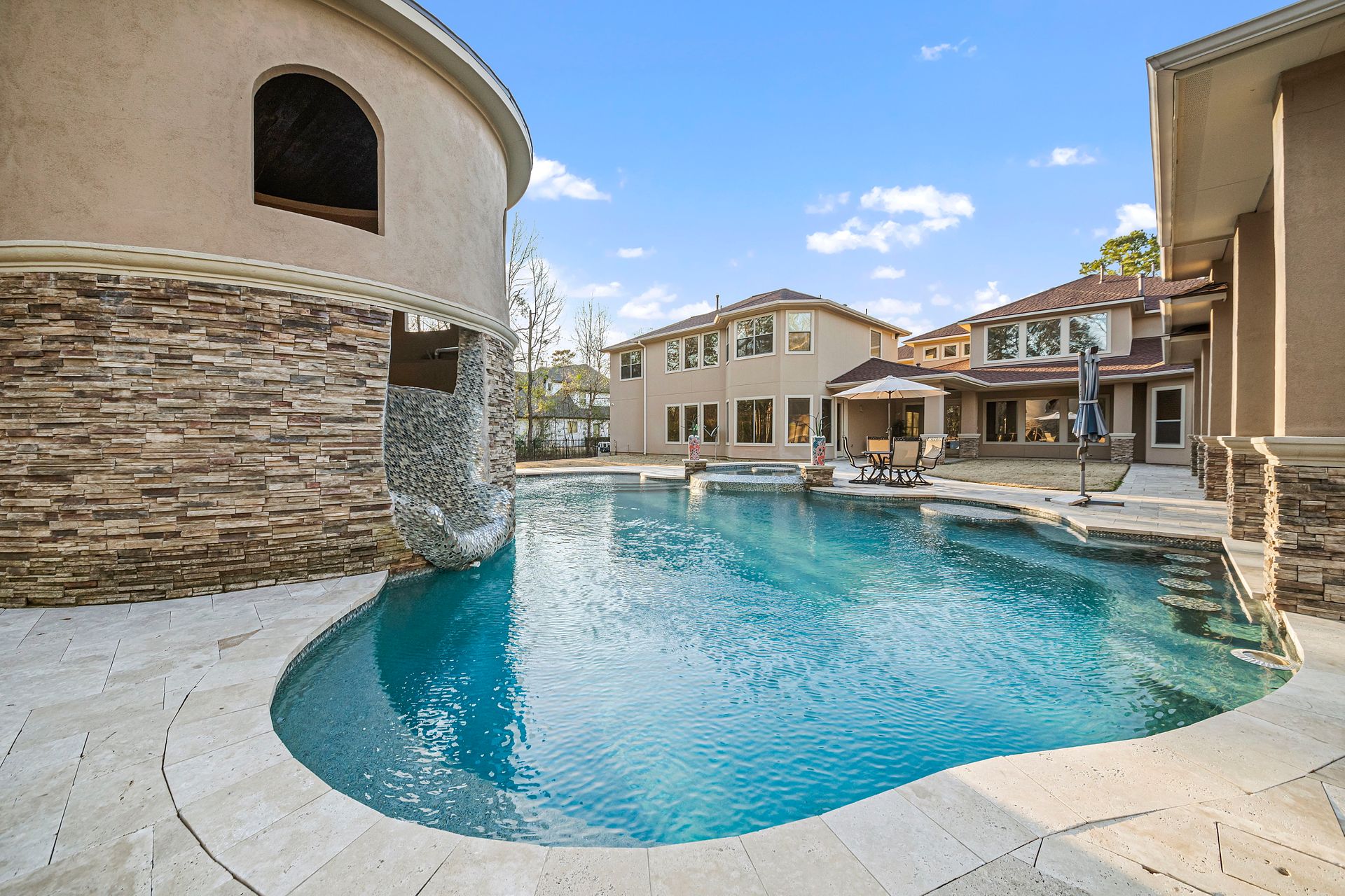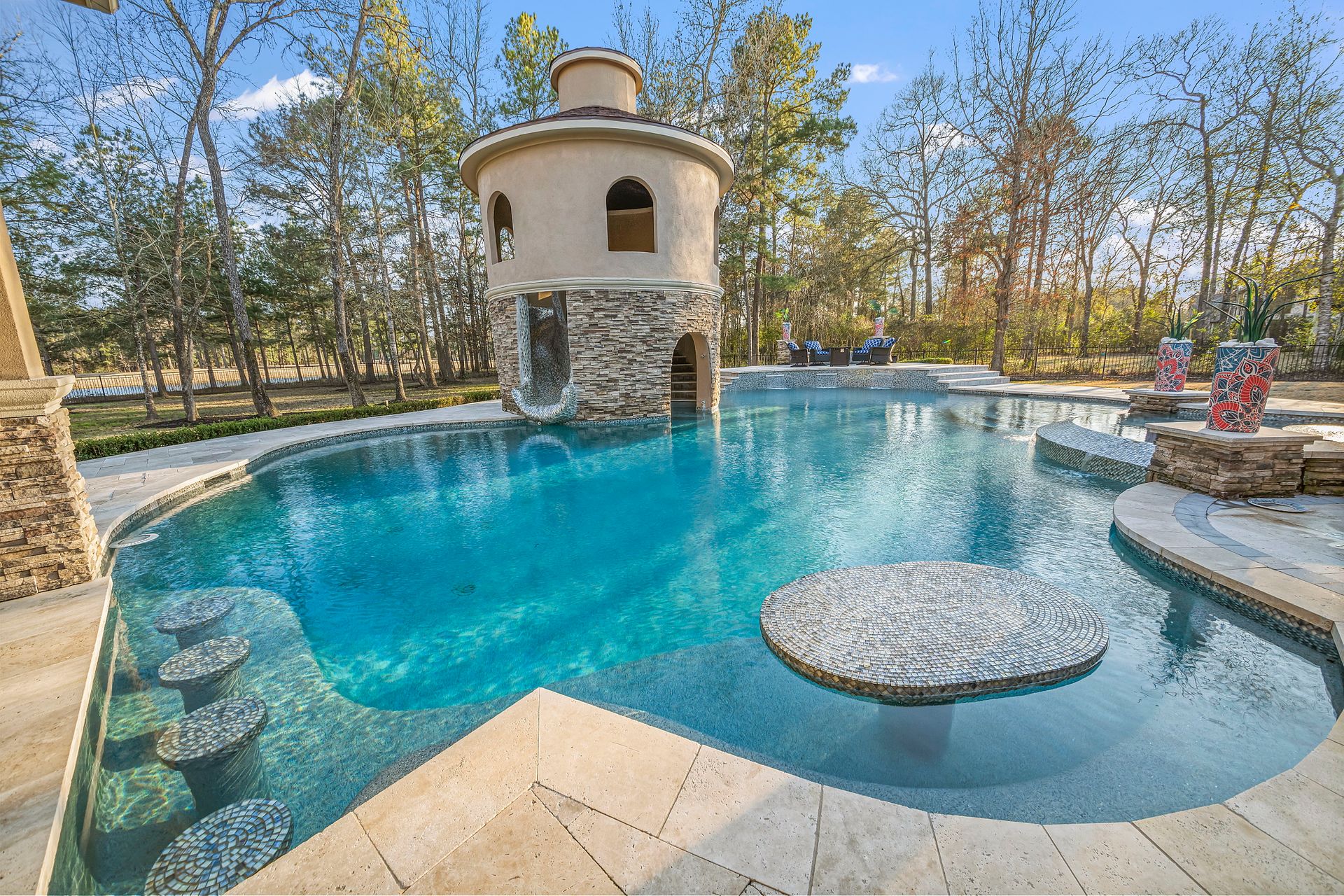 The Ultimate in luxurious Golf Course estates! Situated on 1.02 acres overlooking hole number three of private Woodforest golf course. Opulent amenities await, from designer finishes to ornate double French doors, stunning curved staircase & extensive trim details. Floor-to-ceiling windows in the great room bathe the home in natural light offering endless golf course views. A chef's kitchen with Viking appliances and custom cabinetry will never disappoint. The primary suite features detailed tray ceilings with an adjoining sitting area with a fireplace. Spa-like bathroom includes a multi-jetted shower, private laundry room, and THREE custom walk-in closets. Full home remote A/V Crestron system enables control of your at-home technology from anywhere! Enjoy popcorn and a movie in the media room with a cold beverage from your custom wet bar or skip the movie and play cards in the adjoining game room. Estate grounds include a private gated motor coach and Carriage house for your luxury automobiles. The resort style outdoor pool features a grotto, sunken/swim-up kitchen, infrared sauna & separate pool bath, covered BBQ patio & full home mosquito system. Attached 1,800 sqft Casita for guests includes 2 bedrooms, 2.5 baths, full kitchen & private laundry. Your gateway to resort-style living awaits!