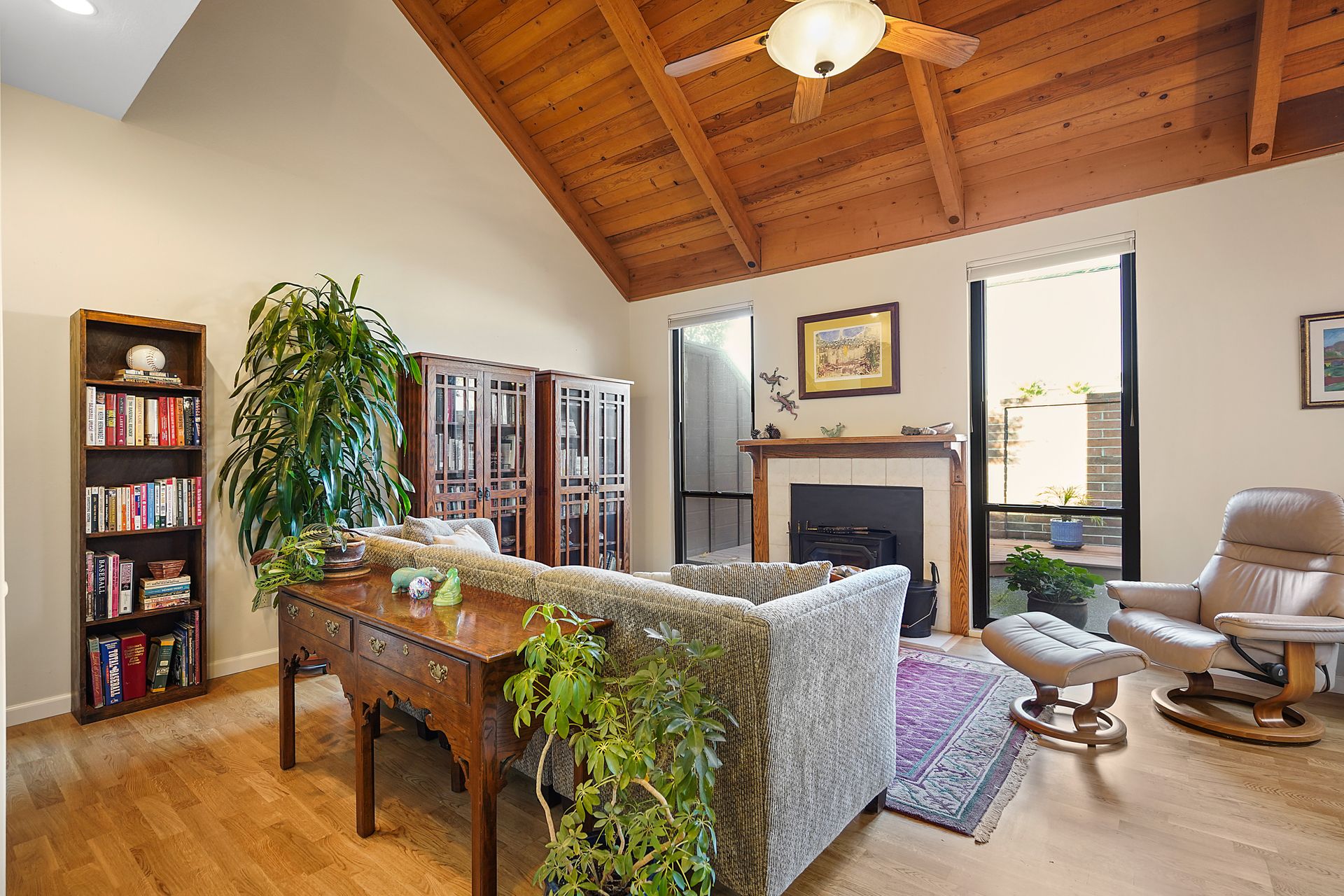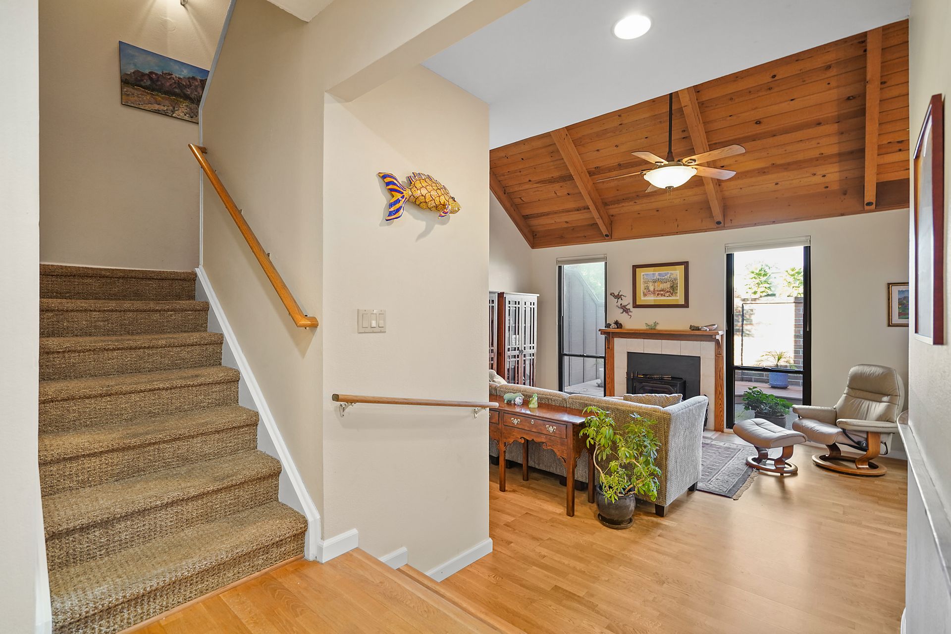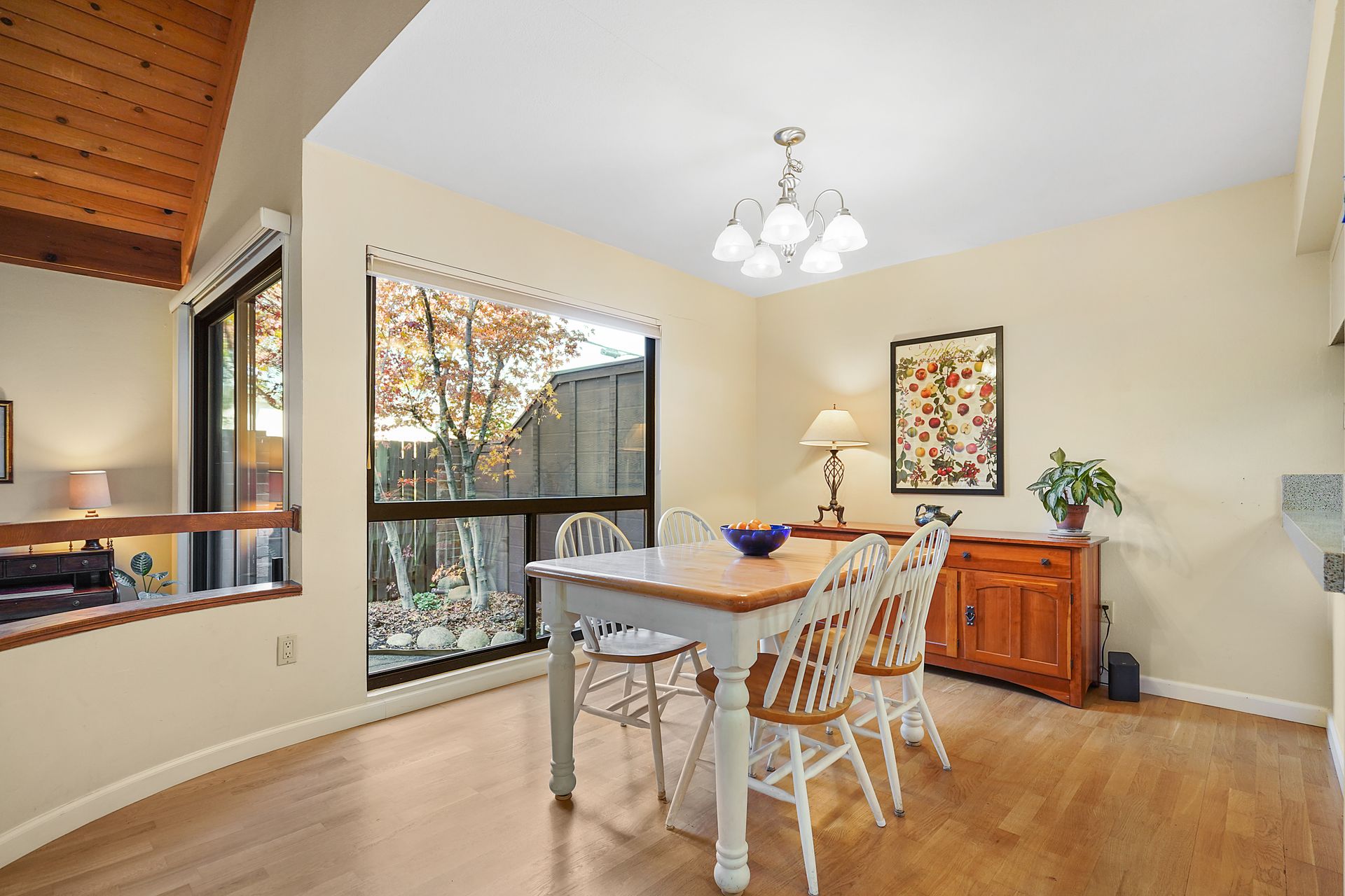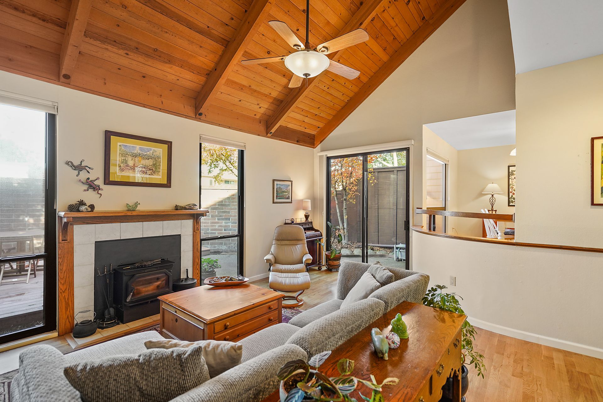 Live in the coveted Pacific North complex, nestled in Santa Rosa's McDonald/Junior College neighborhood, in the center of town and convenient to amenities. This two bedroom, two bath home is architecturally interesting: the living room has dramatic vaulted ceilings accented in wood; the formal dining area has a gracefully curved balcony rail, open to the kitchen and overlooking the step-down living room; and the spacious upstairs bedroom suite has a pitched wood ceiling and a private balcony. Beautiful natural hardwood floors can be found in the living room, dining room, bedrooms and kitchen. An indoor laundry, Hunter Douglas window shades, a two-car garage, a private backyard with deck and central heat and air complete this comfortable home. The complex features tennis and pickleball courts and a swimming pool with a spa.