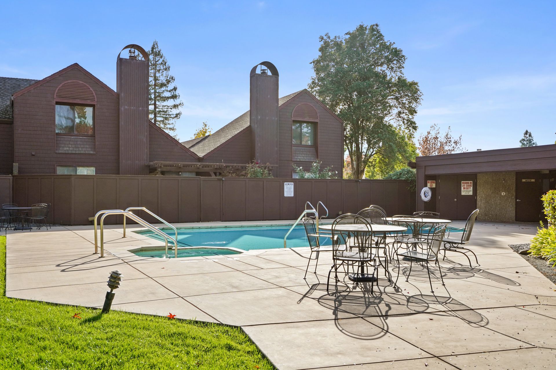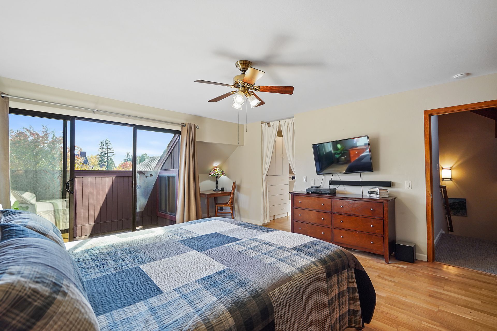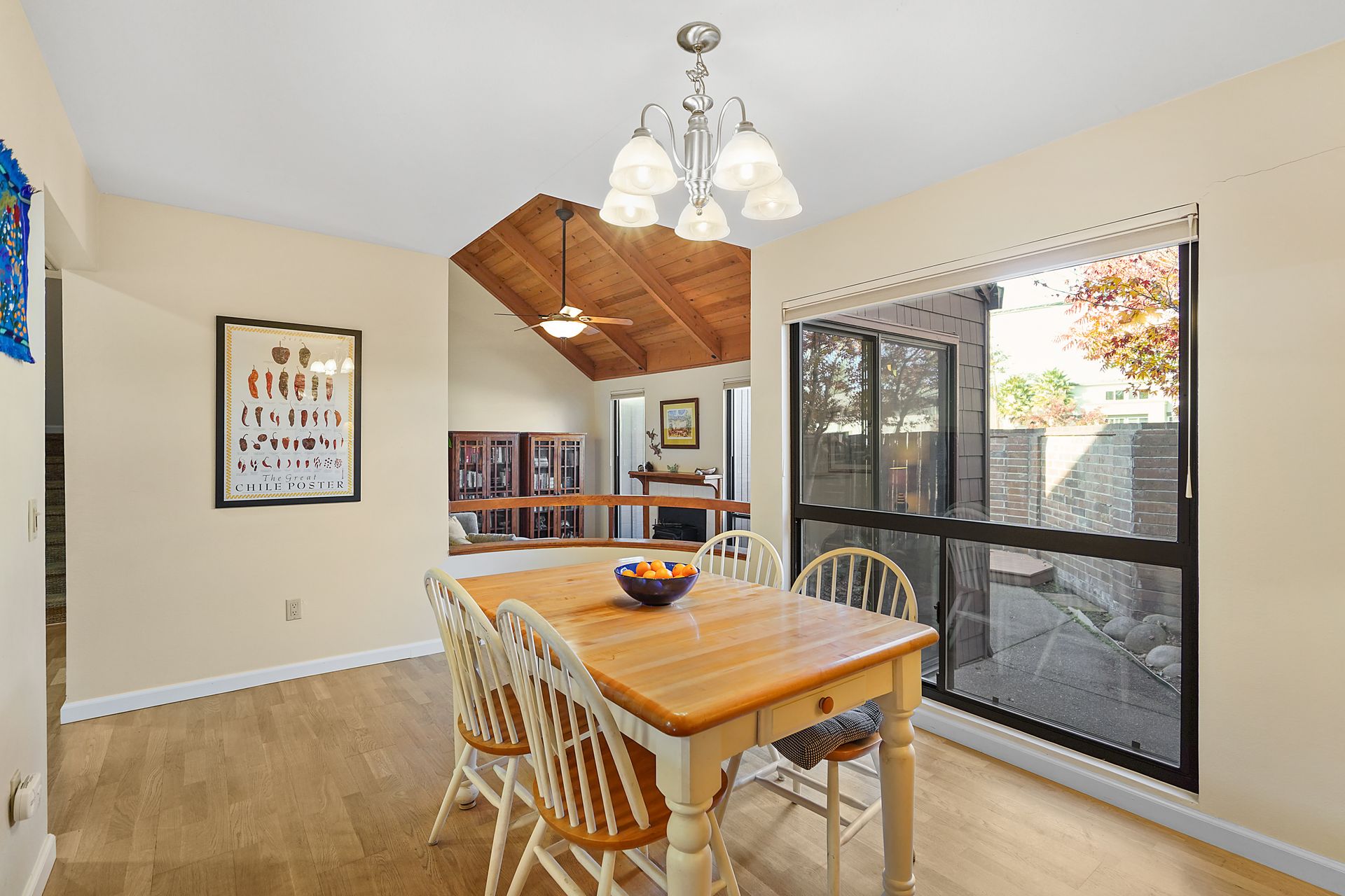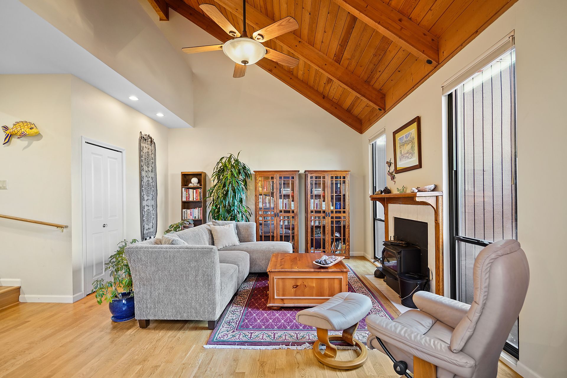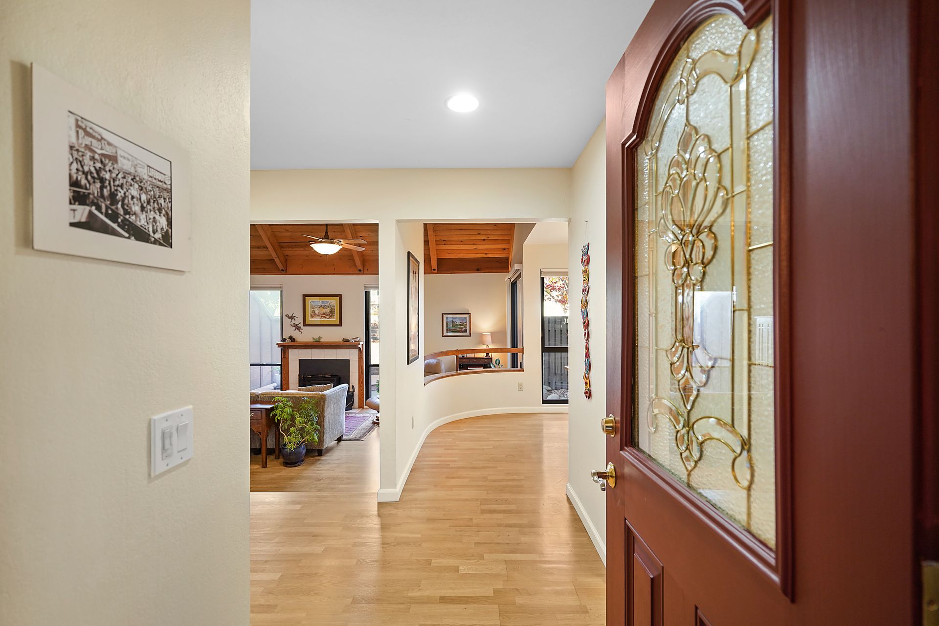 Live in the coveted Pacific North complex, nestled in Santa Rosa's McDonald/Junior College neighborhood, in the center of town and convenient to amenities. This two bedroom, two bath home is architecturally interesting: the living room has dramatic vaulted ceilings accented in wood; the formal dining area has a gracefully curved balcony rail, open to the kitchen and overlooking the step-down living room; and the spacious upstairs bedroom suite has a pitched wood ceiling and a private balcony. Beautiful natural hardwood floors can be found in the living room, dining room, bedrooms and kitchen. An indoor laundry, Hunter Douglas window shades, a two-car garage, a private backyard with deck and central heat and air complete this comfortable home. The complex features tennis and pickleball courts and a swimming pool with a spa.