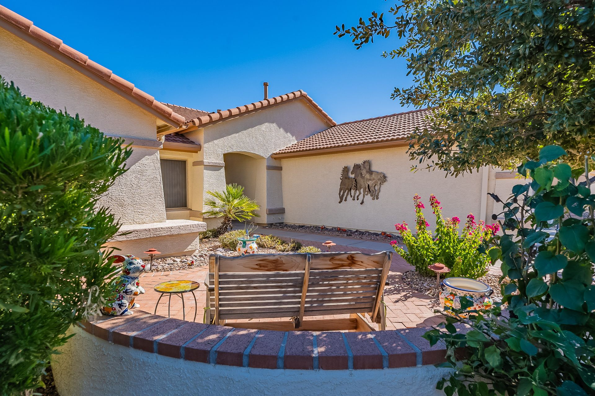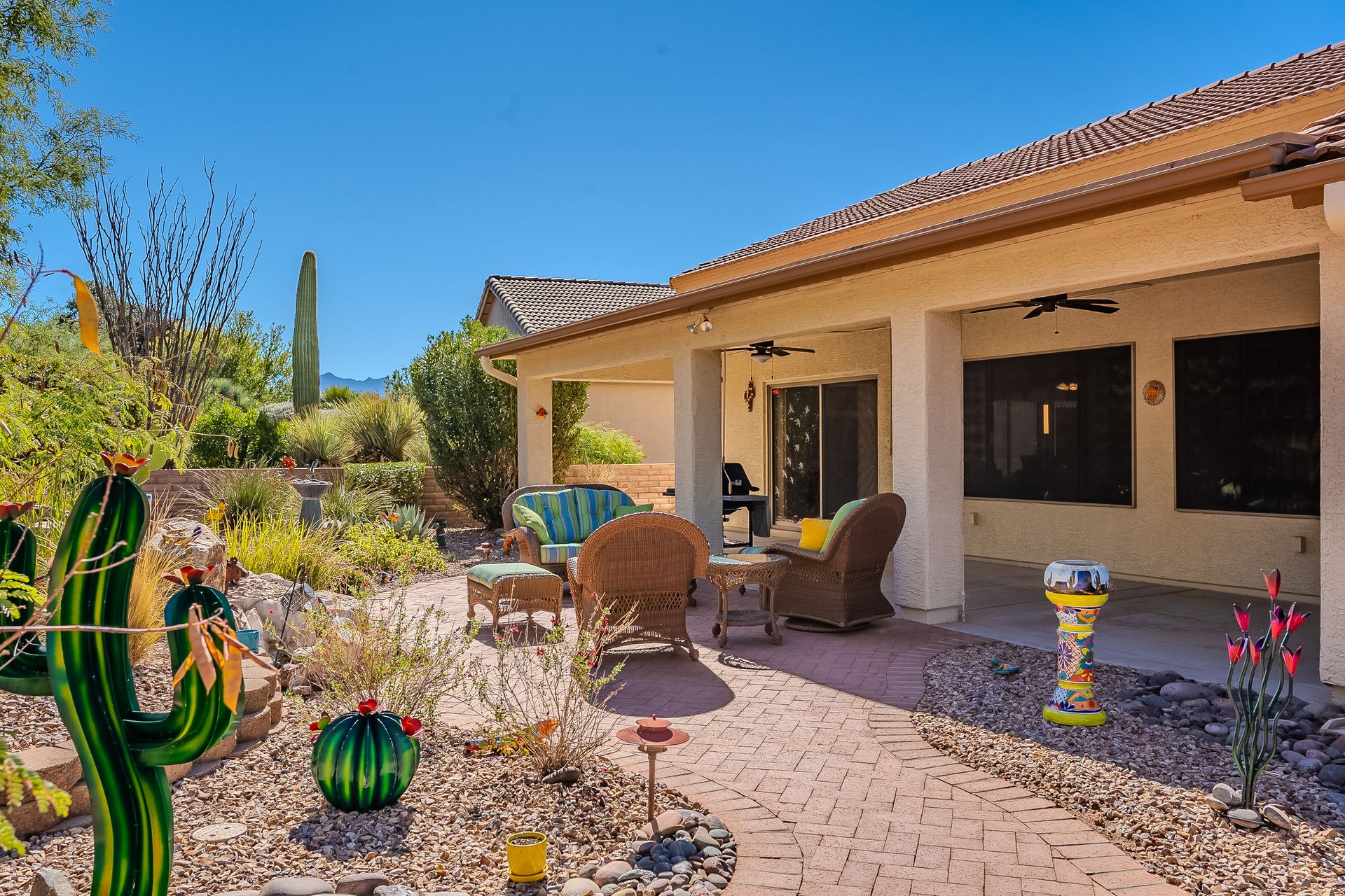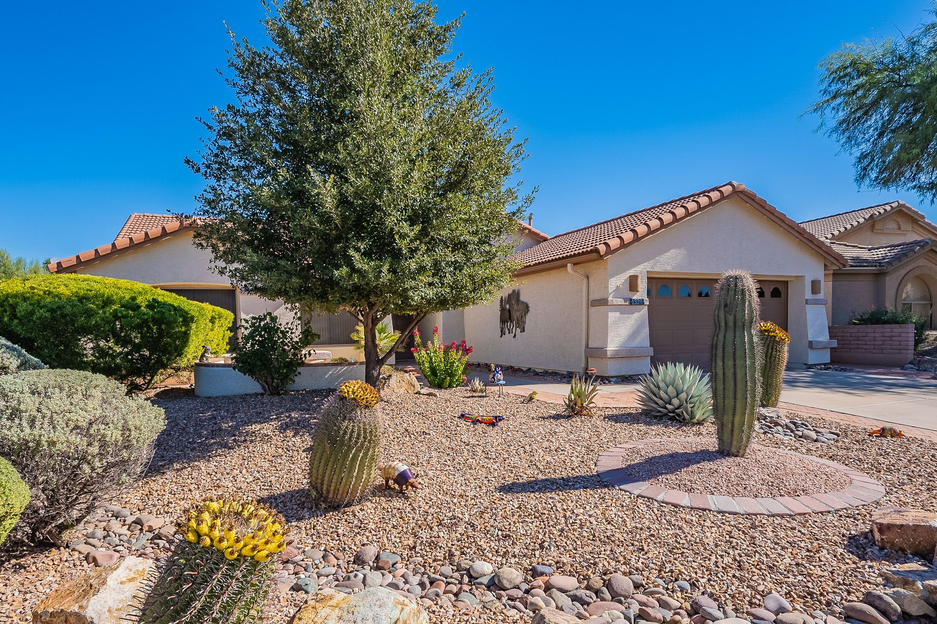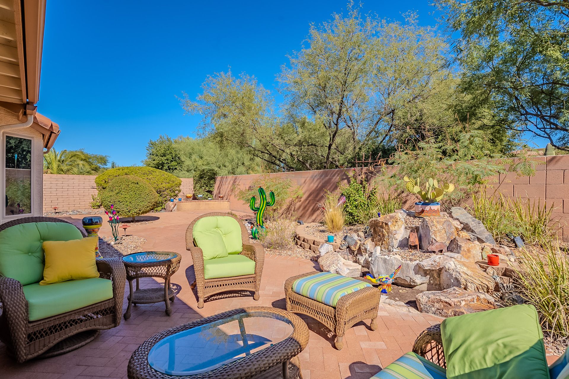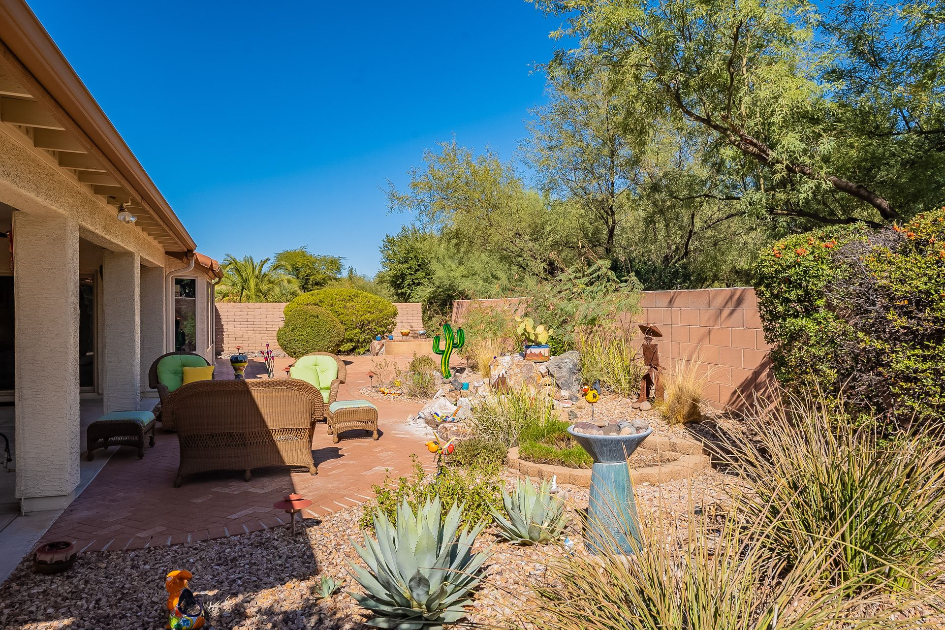 Discover this charming two-bedroom home, plus den, nestled in the renowned Robson Retirement Community of Quail Creek. Spanning approximately 2,195 square feet, this beautifully furnished residence features vibrant Southwestern décor. The backyard is a serene oasis with lush landscaping and a private, covered patio. The great room floor plan includes a cozy TV area and a separate living area with a gas fireplace. Enjoy abundant natural light from the many large windows and the high ceilings. The spacious kitchen boasts stainless steel appliances, ample cabinets with pull-outs, generous counter space and a large island with a farmhouse sink. The sizeable laundry room is equipped with a washer, dryer, sink and countertops. The garage offers storage cabinets and a workbench area.