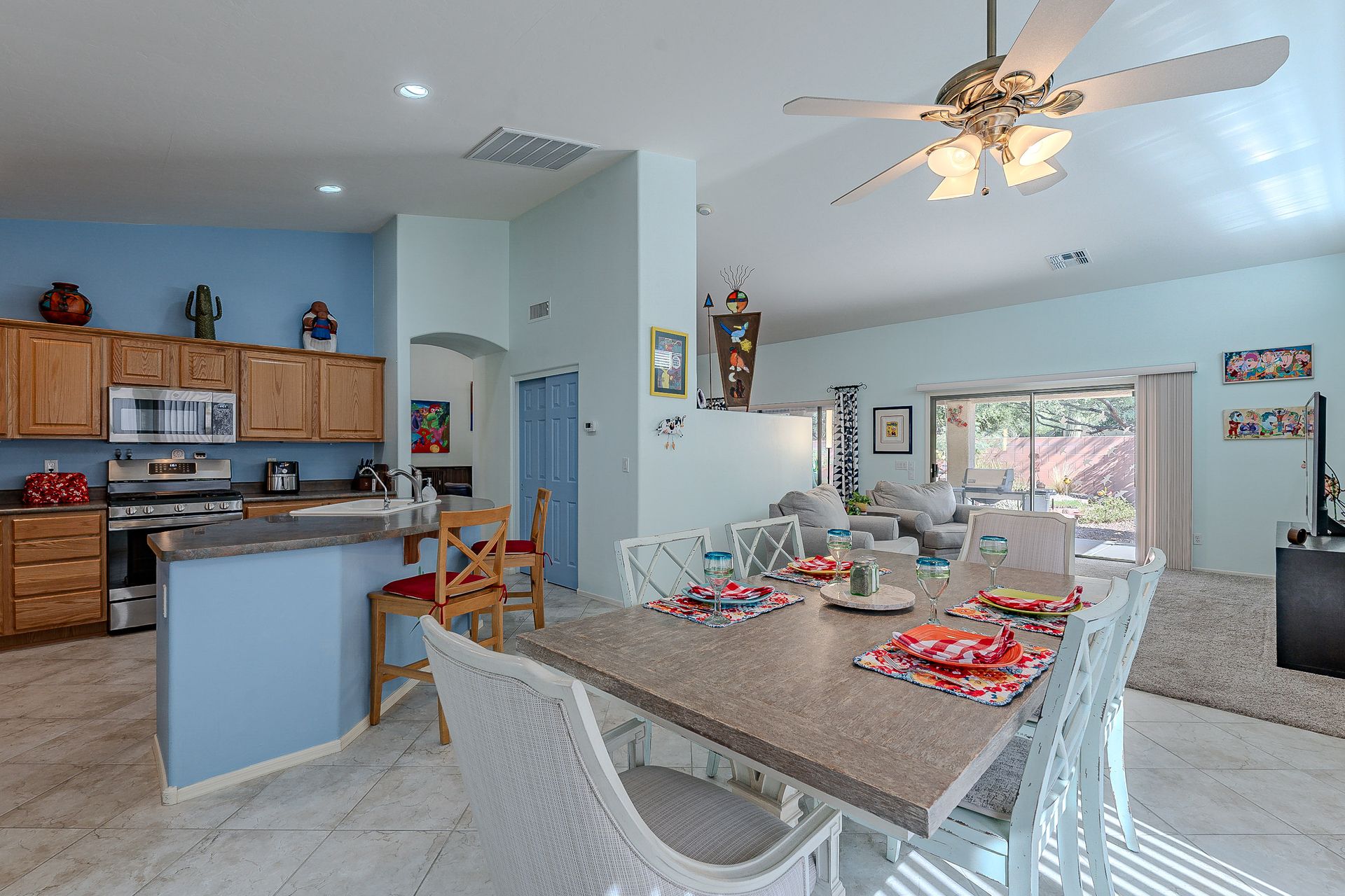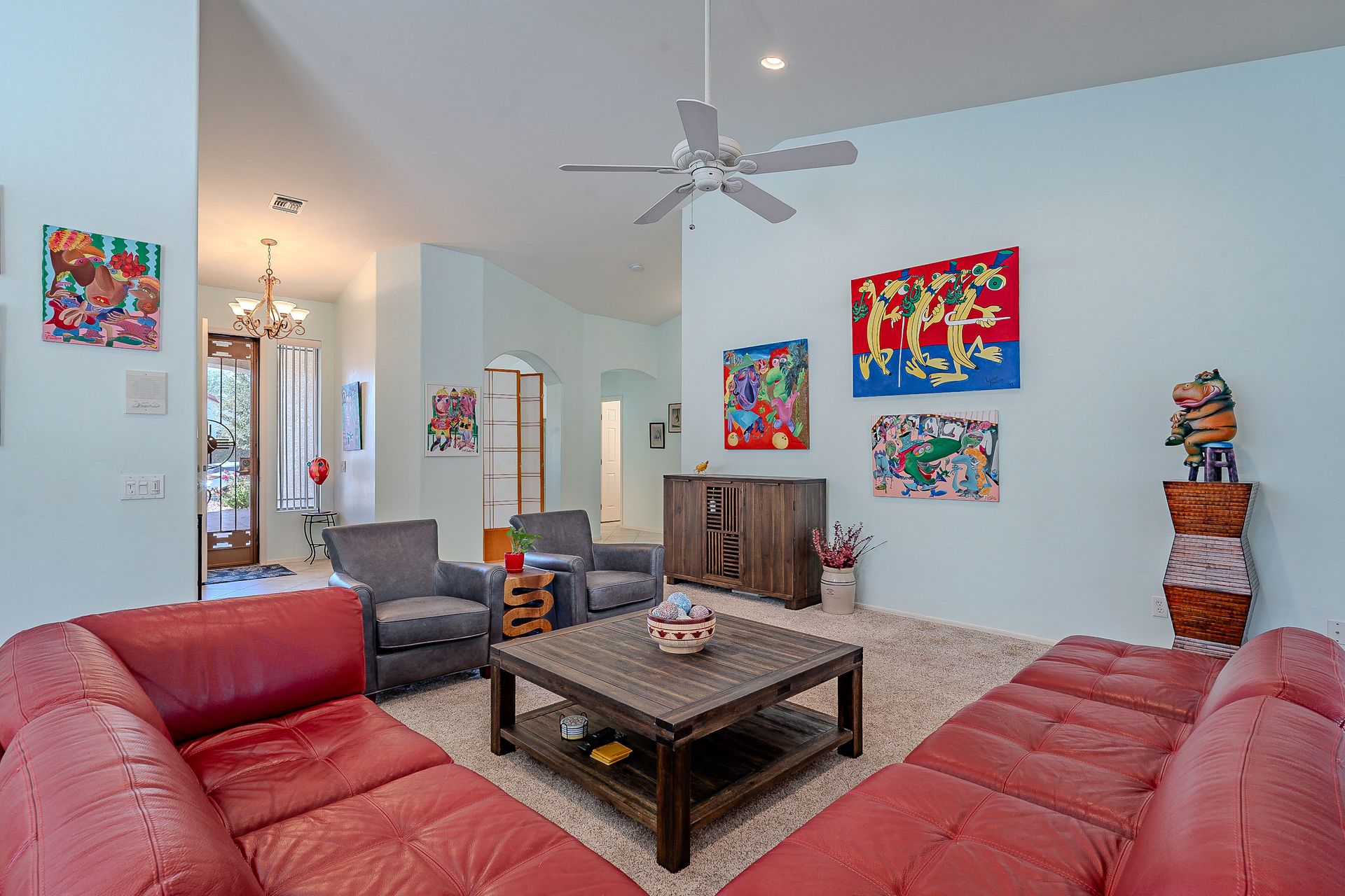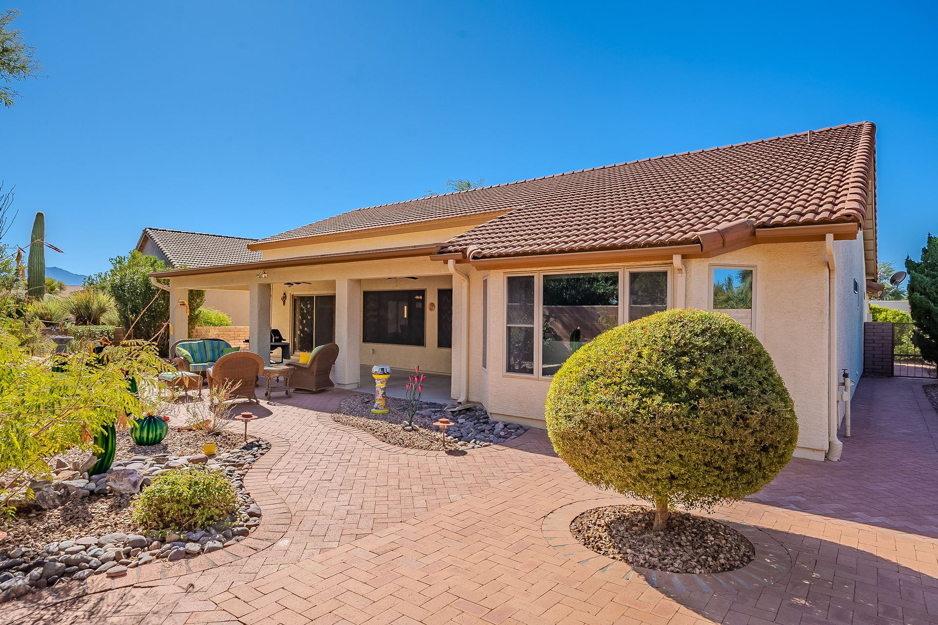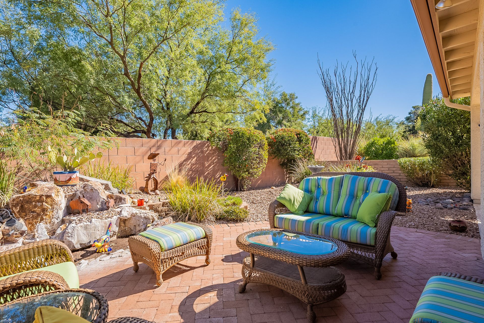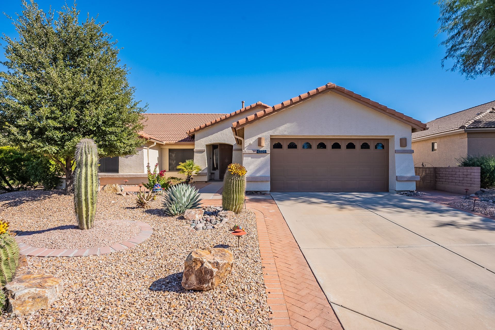 Discover this charming two-bedroom home, plus den, nestled in the renowned Robson Retirement Community of Quail Creek. Spanning approximately 2,195 square feet, this beautifully furnished residence features vibrant Southwestern décor. The backyard is a serene oasis with lush landscaping and a private, covered patio. The great room floor plan includes a cozy TV area and a separate living area with a gas fireplace. Enjoy abundant natural light from the many large windows and the high ceilings. The spacious kitchen boasts stainless steel appliances, ample cabinets with pull-outs, generous counter space and a large island with a farmhouse sink. The sizeable laundry room is equipped with a washer, dryer, sink and countertops. The garage offers storage cabinets and a workbench area.