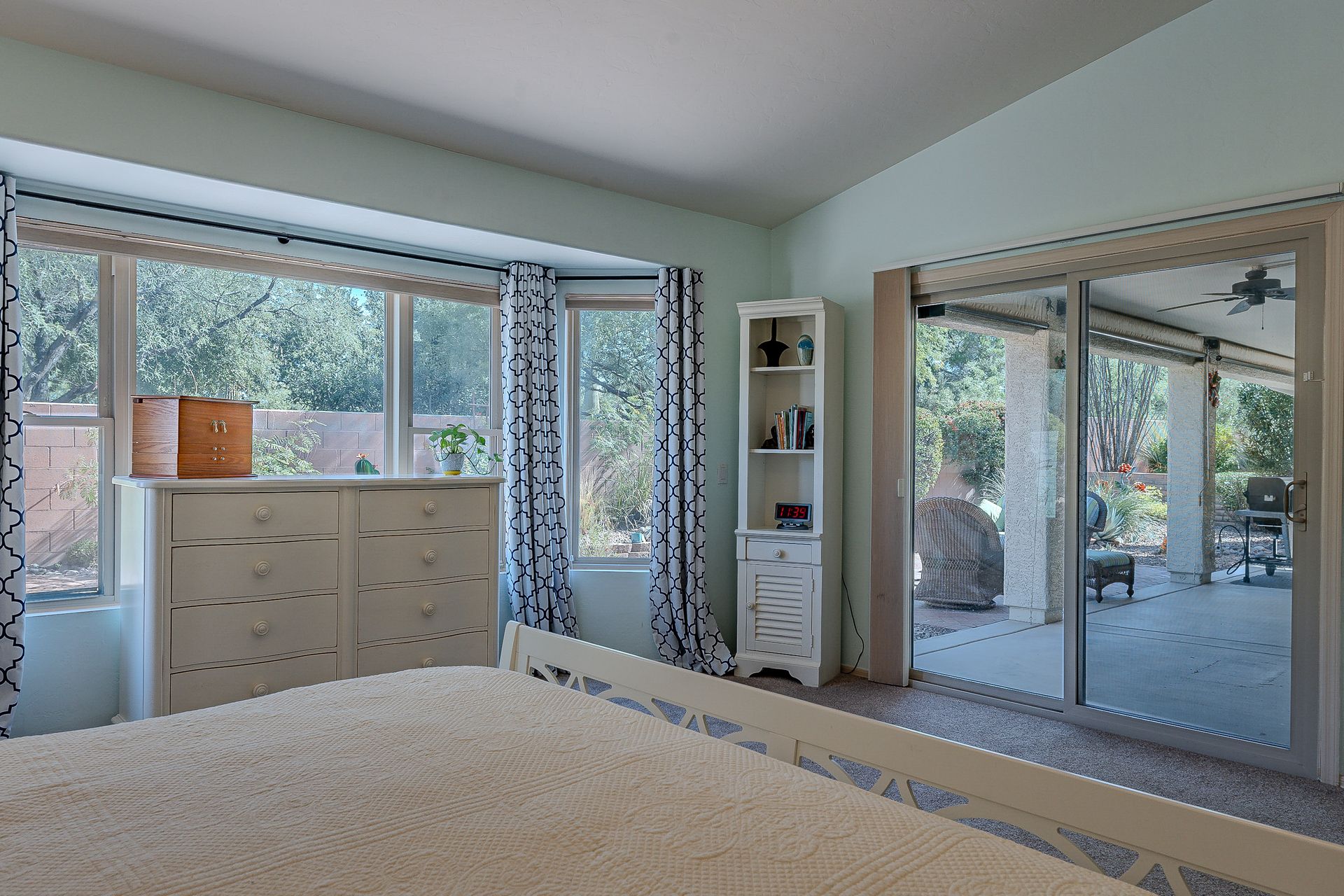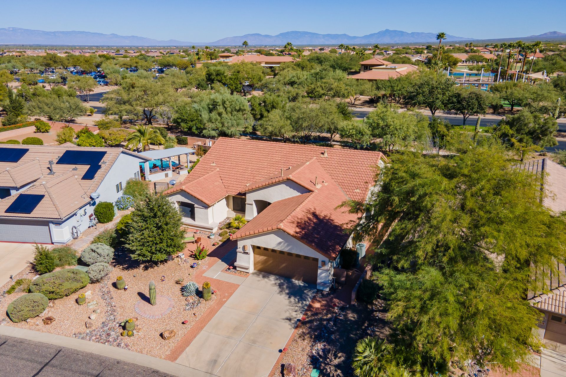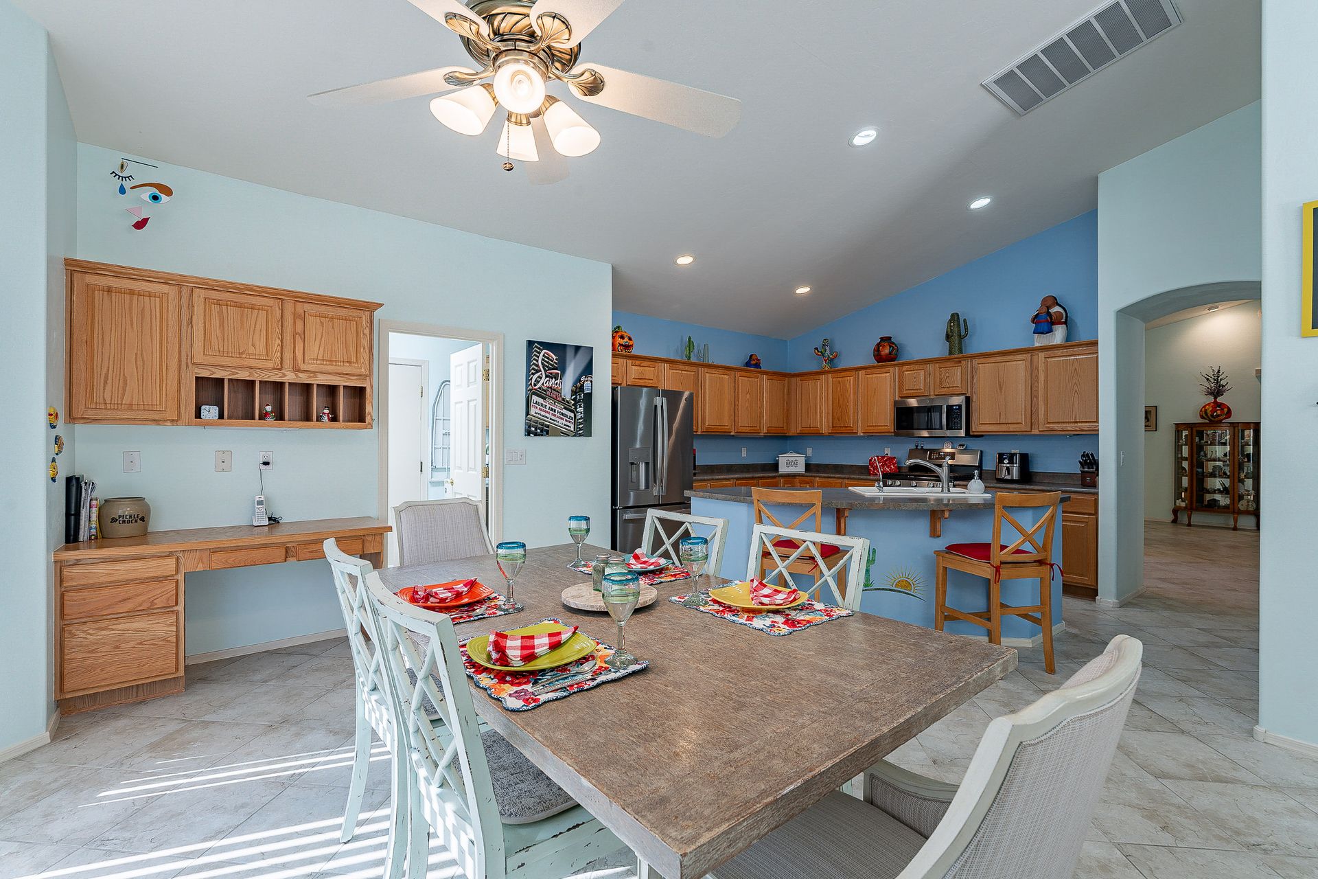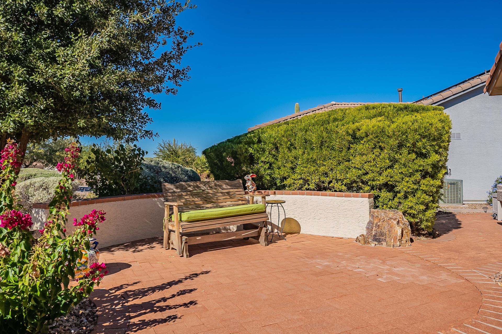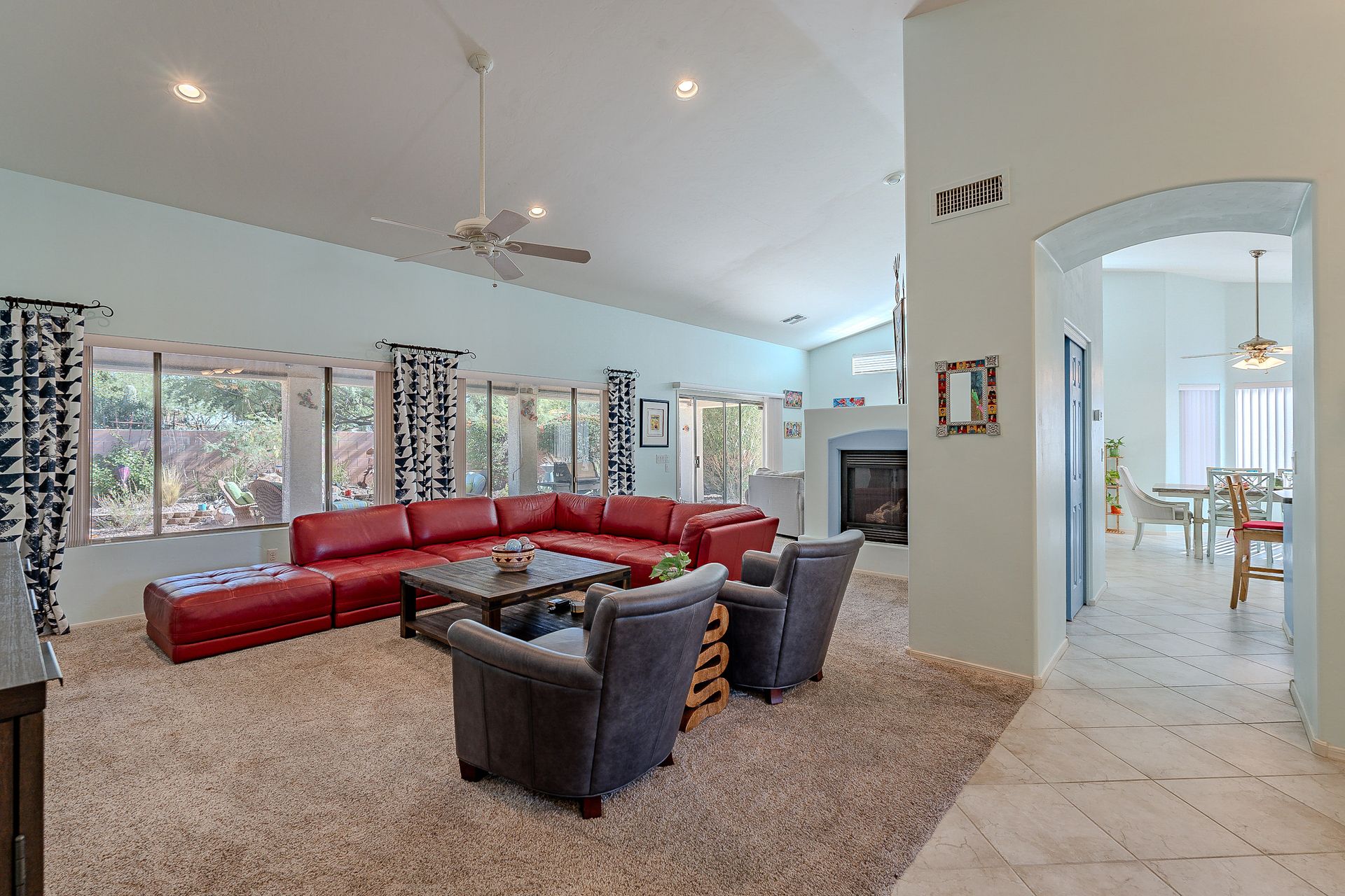 Discover this charming two-bedroom home, plus den, nestled in the renowned Robson Retirement Community of Quail Creek. Spanning approximately 2,195 square feet, this beautifully furnished residence features vibrant Southwestern décor. The backyard is a serene oasis with lush landscaping and a private, covered patio. The great room floor plan includes a cozy TV area and a separate living area with a gas fireplace. Enjoy abundant natural light from the many large windows and the high ceilings. The spacious kitchen boasts stainless steel appliances, ample cabinets with pull-outs, generous counter space and a large island with a farmhouse sink. The sizeable laundry room is equipped with a washer, dryer, sink and countertops. The garage offers storage cabinets and a workbench area.