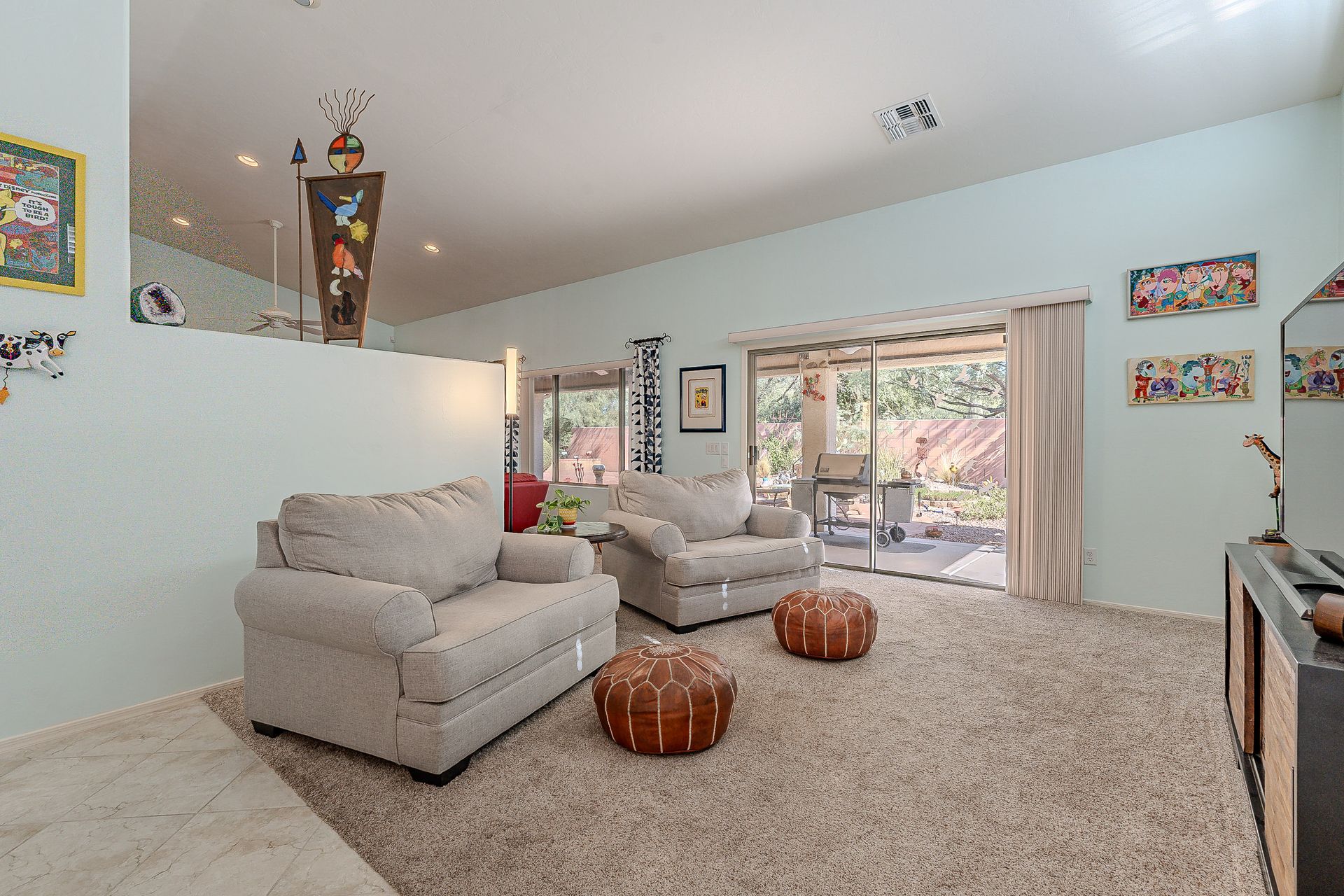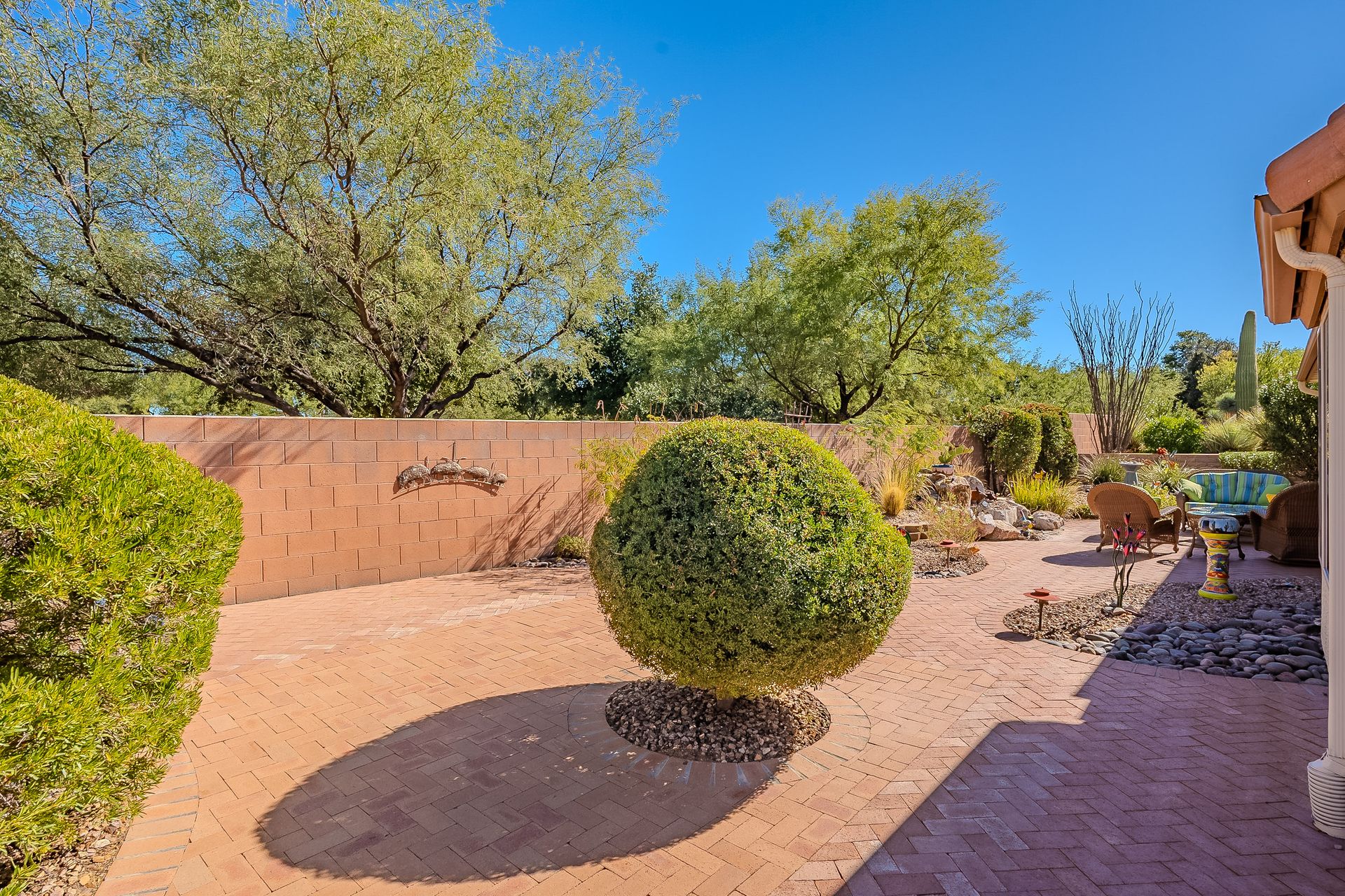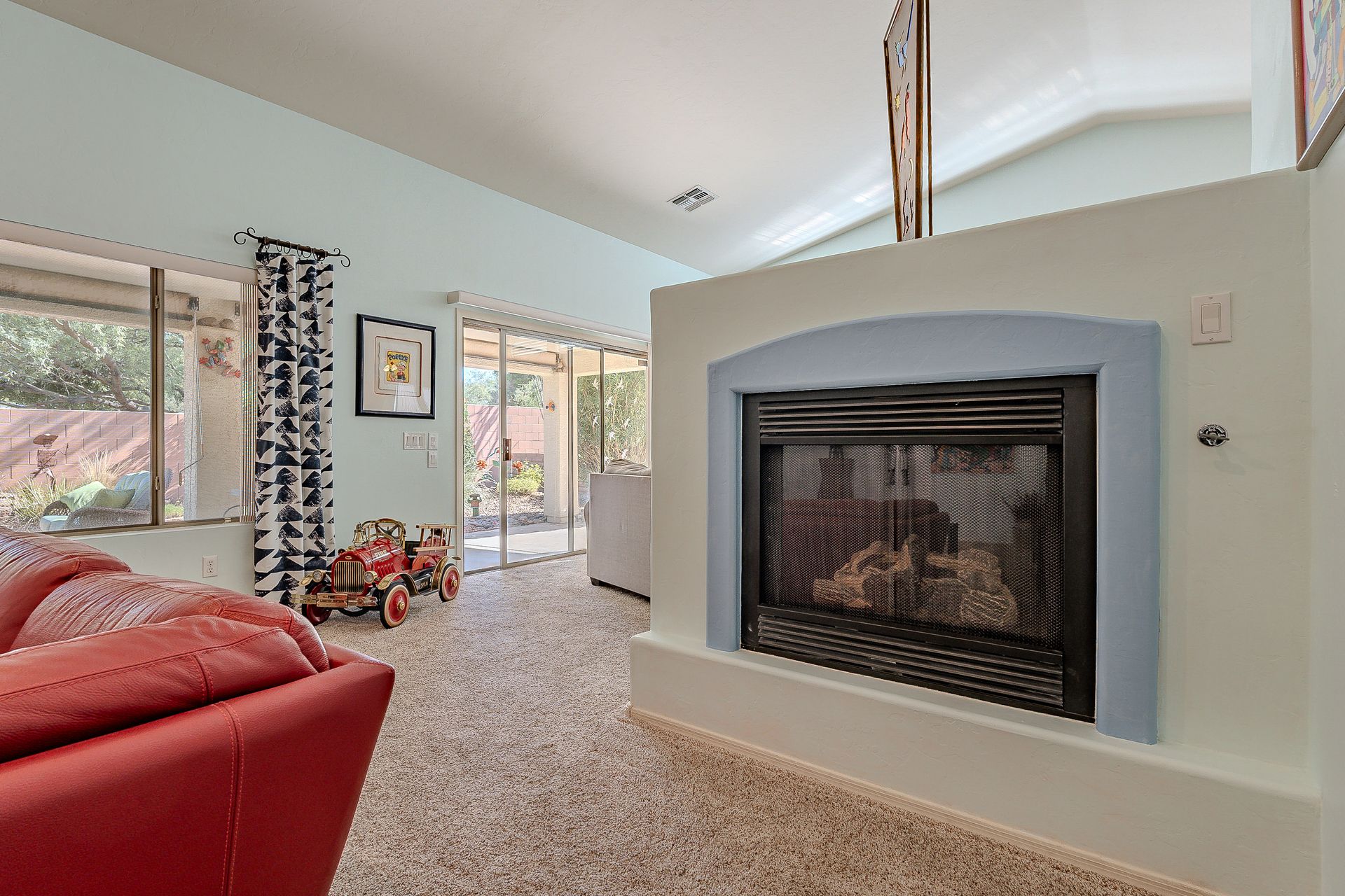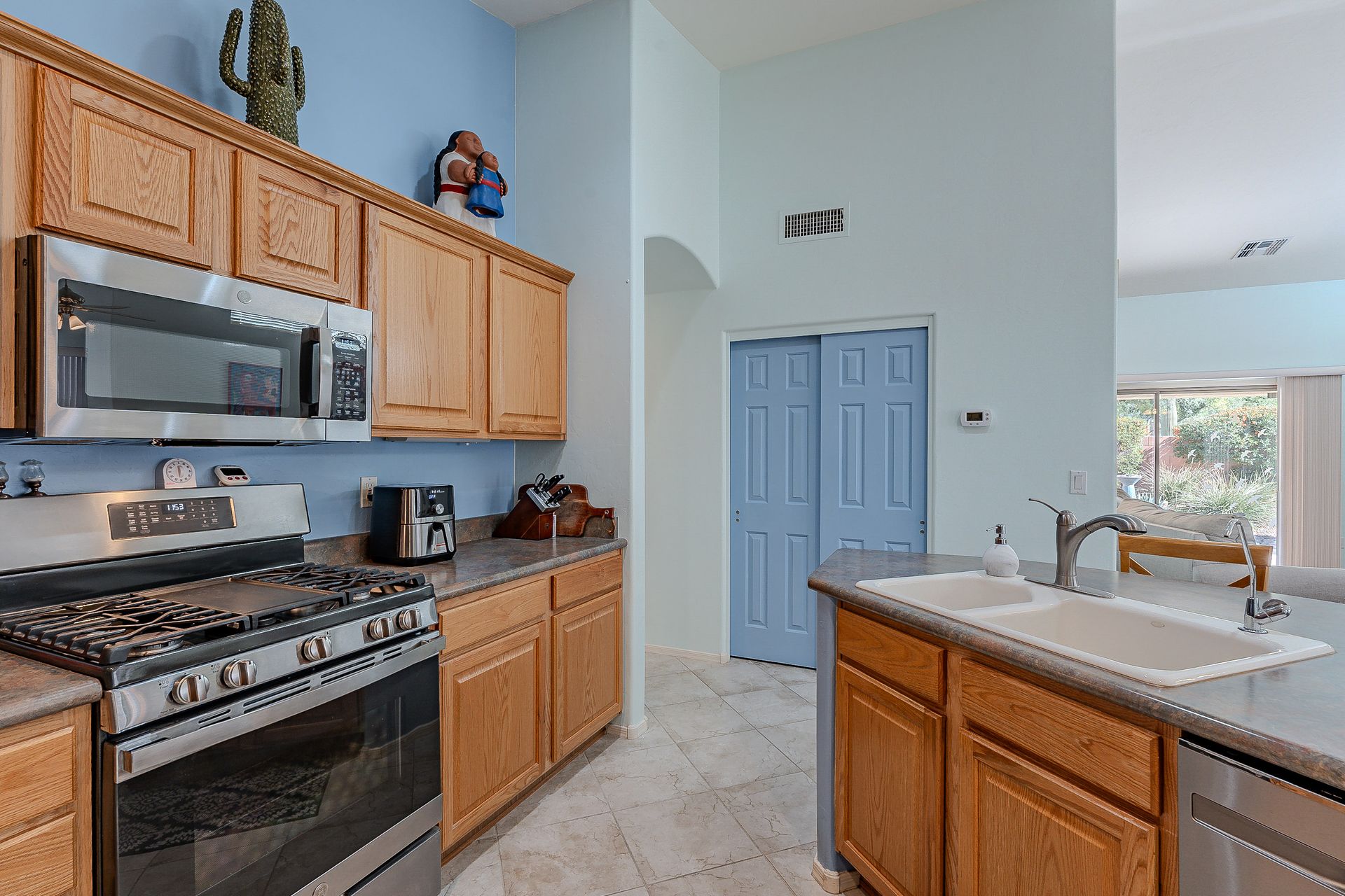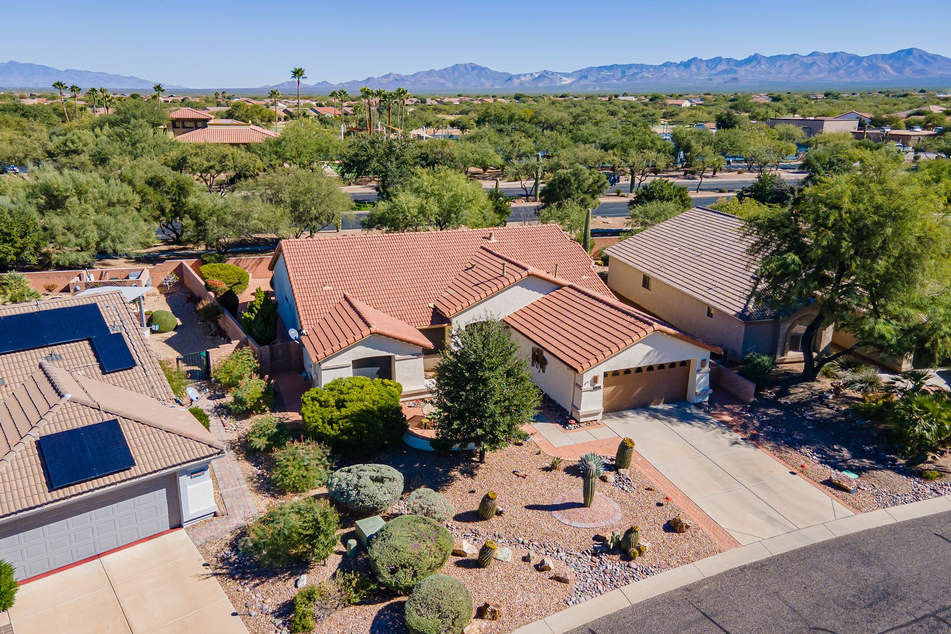 Discover this charming two-bedroom home, plus den, nestled in the renowned Robson Retirement Community of Quail Creek. Spanning approximately 2,195 square feet, this beautifully furnished residence features vibrant Southwestern décor. The backyard is a serene oasis with lush landscaping and a private, covered patio. The great room floor plan includes a cozy TV area and a separate living area with a gas fireplace. Enjoy abundant natural light from the many large windows and the high ceilings. The spacious kitchen boasts stainless steel appliances, ample cabinets with pull-outs, generous counter space and a large island with a farmhouse sink. The sizeable laundry room is equipped with a washer, dryer, sink and countertops. The garage offers storage cabinets and a workbench area.