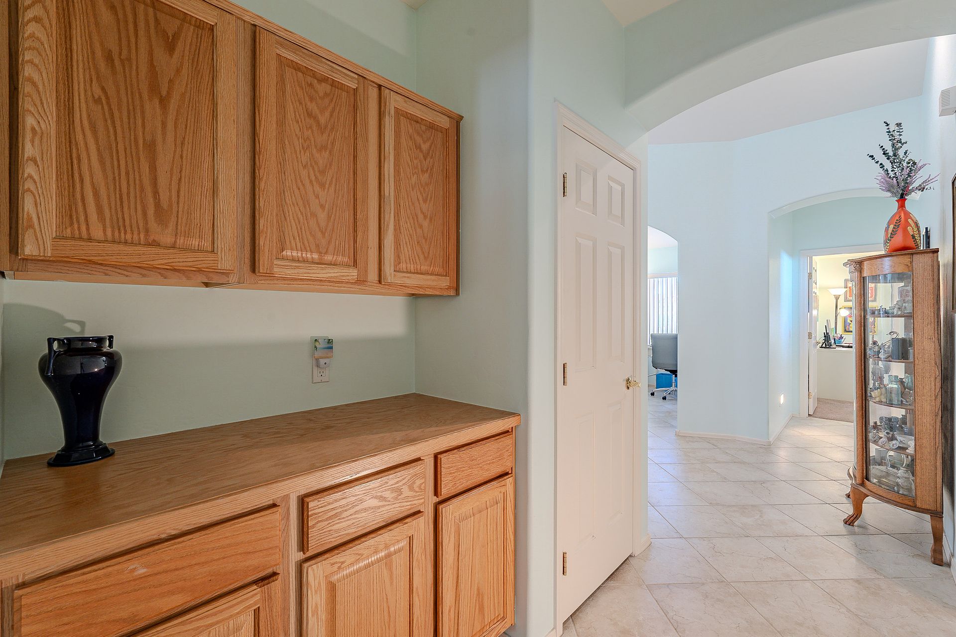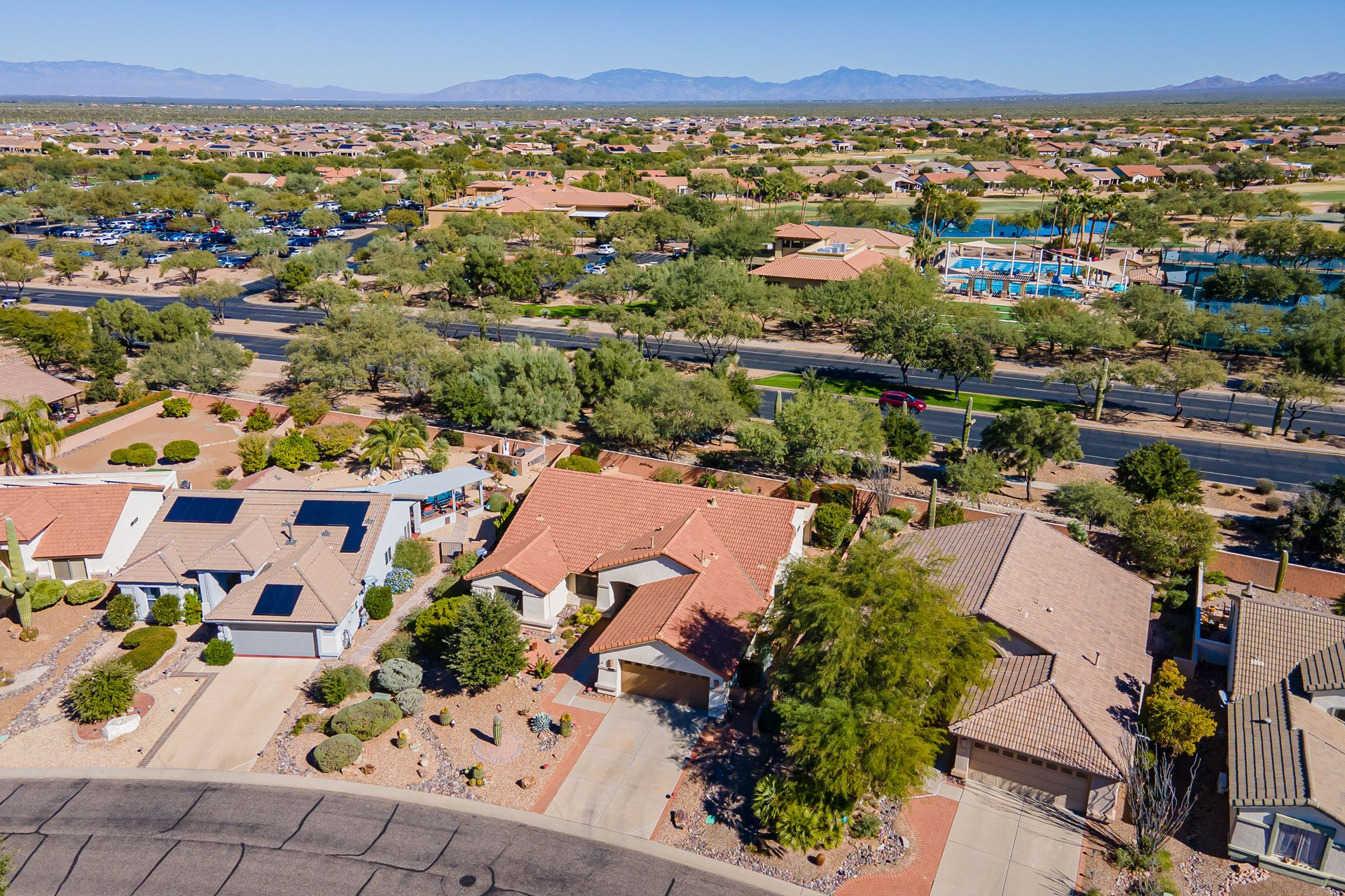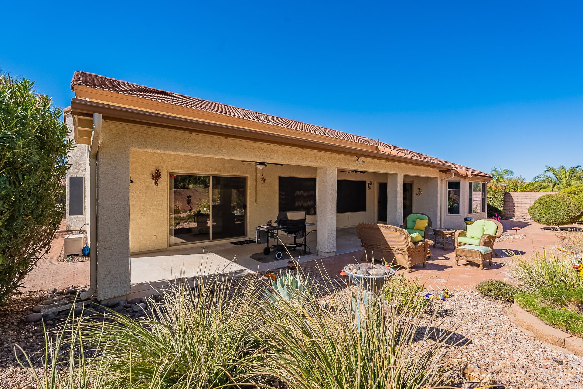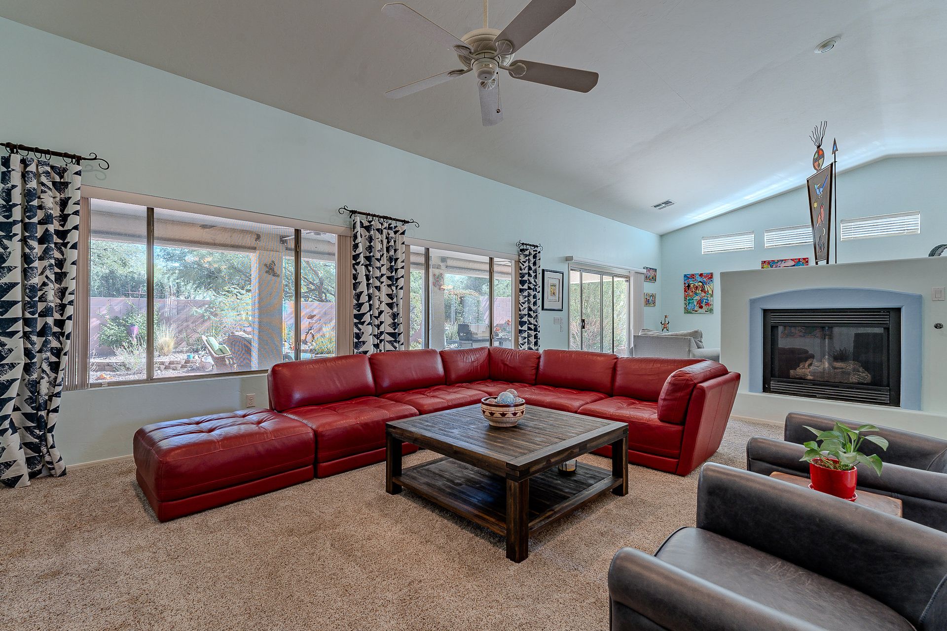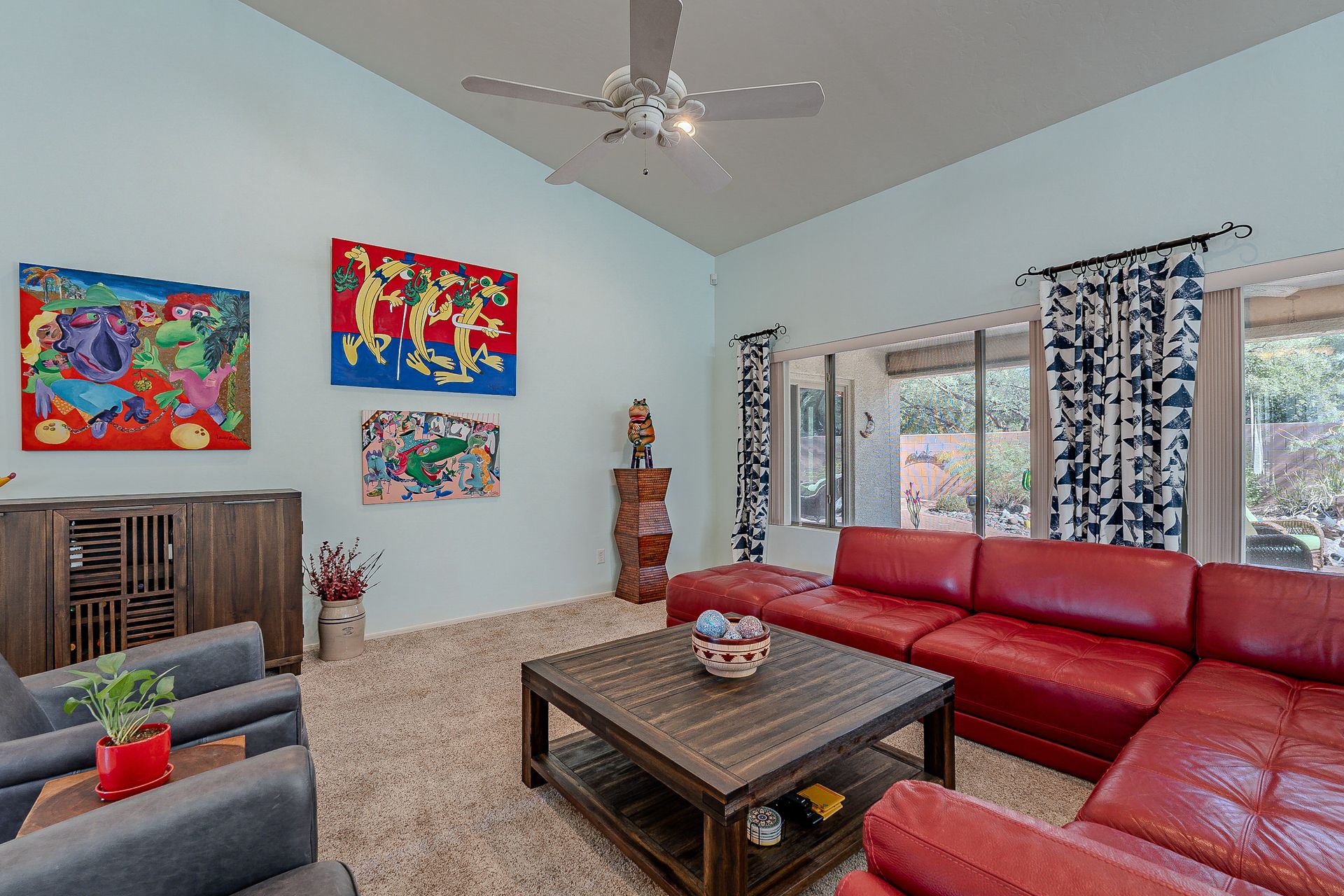 Discover this charming two-bedroom home, plus den, nestled in the renowned Robson Retirement Community of Quail Creek. Spanning approximately 2,195 square feet, this beautifully furnished residence features vibrant Southwestern décor. The backyard is a serene oasis with lush landscaping and a private, covered patio. The great room floor plan includes a cozy TV area and a separate living area with a gas fireplace. Enjoy abundant natural light from the many large windows and the high ceilings. The spacious kitchen boasts stainless steel appliances, ample cabinets with pull-outs, generous counter space and a large island with a farmhouse sink. The sizeable laundry room is equipped with a washer, dryer, sink and countertops. The garage offers storage cabinets and a workbench area.